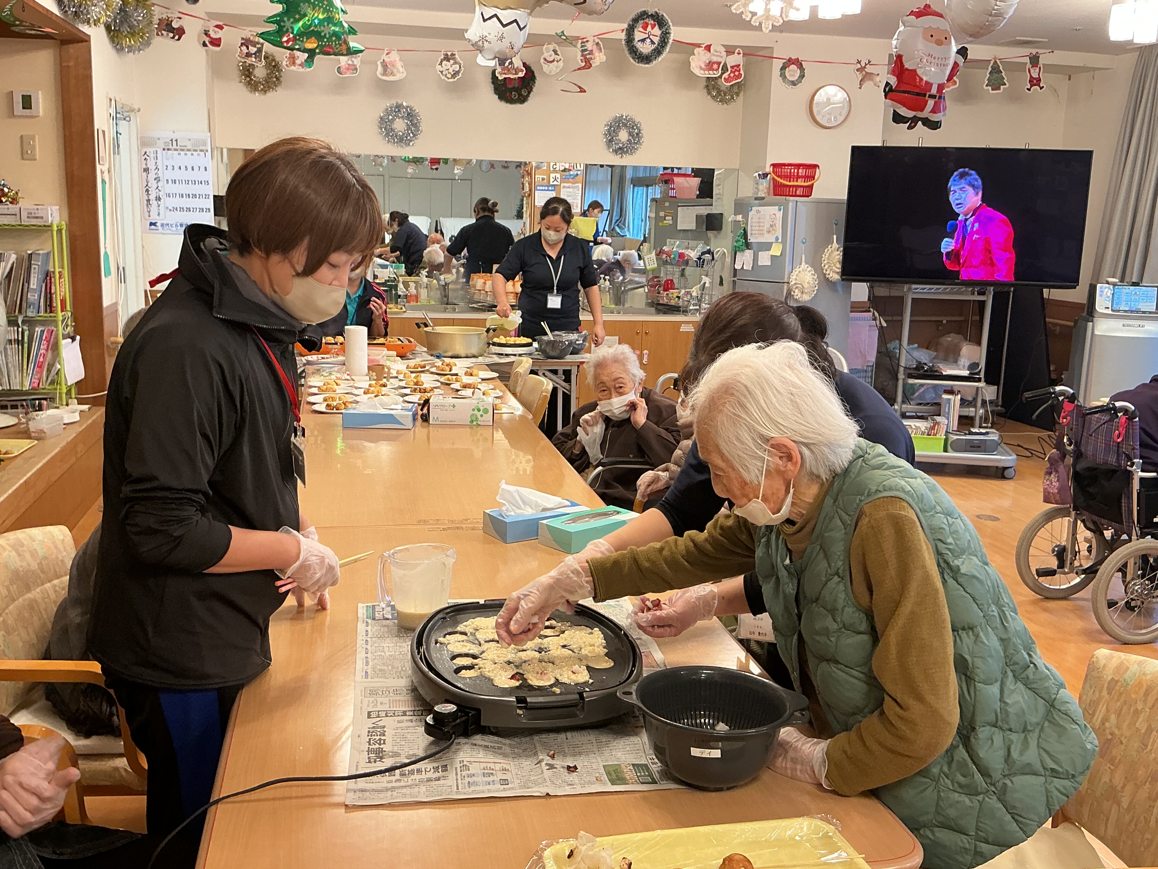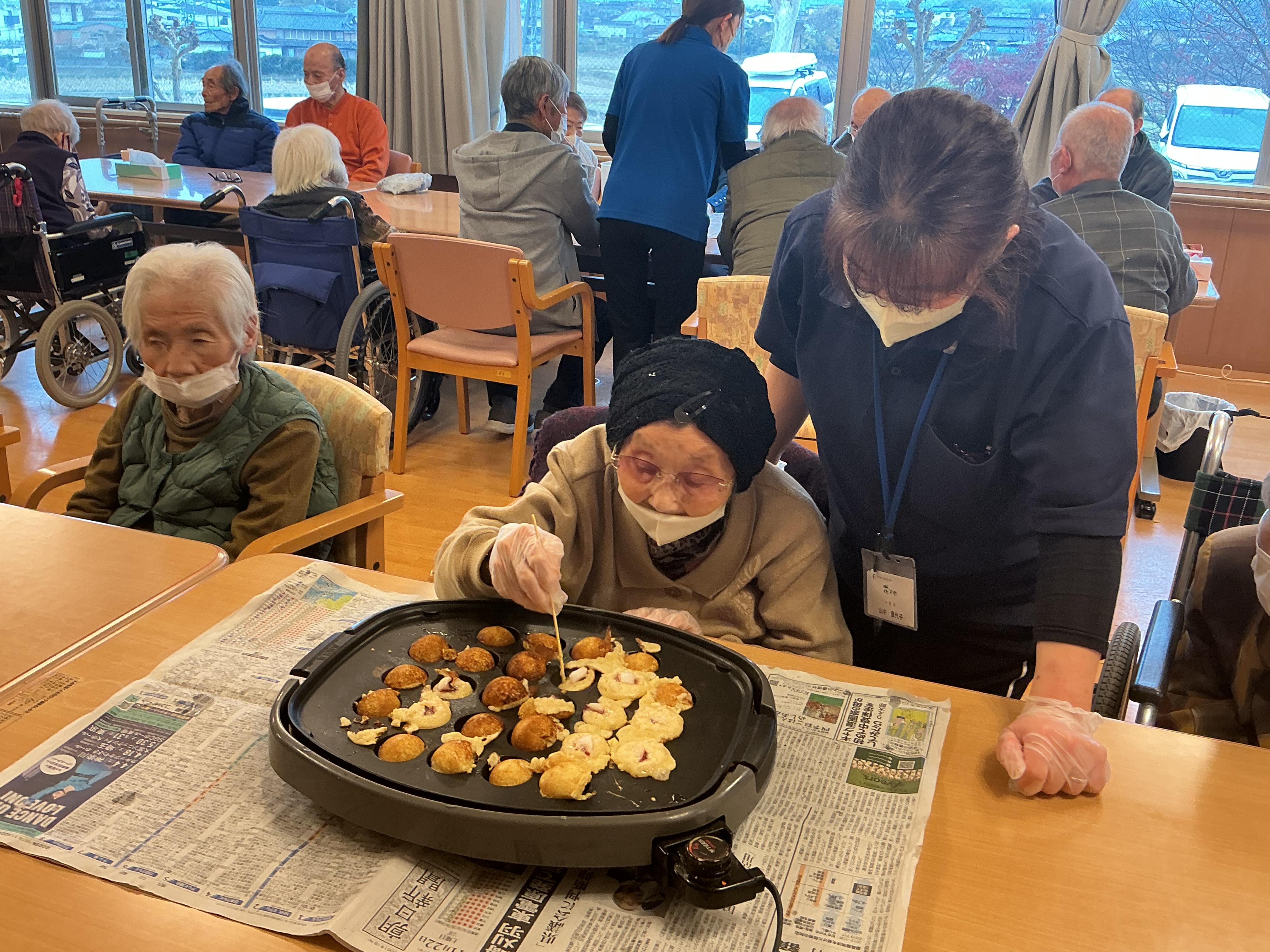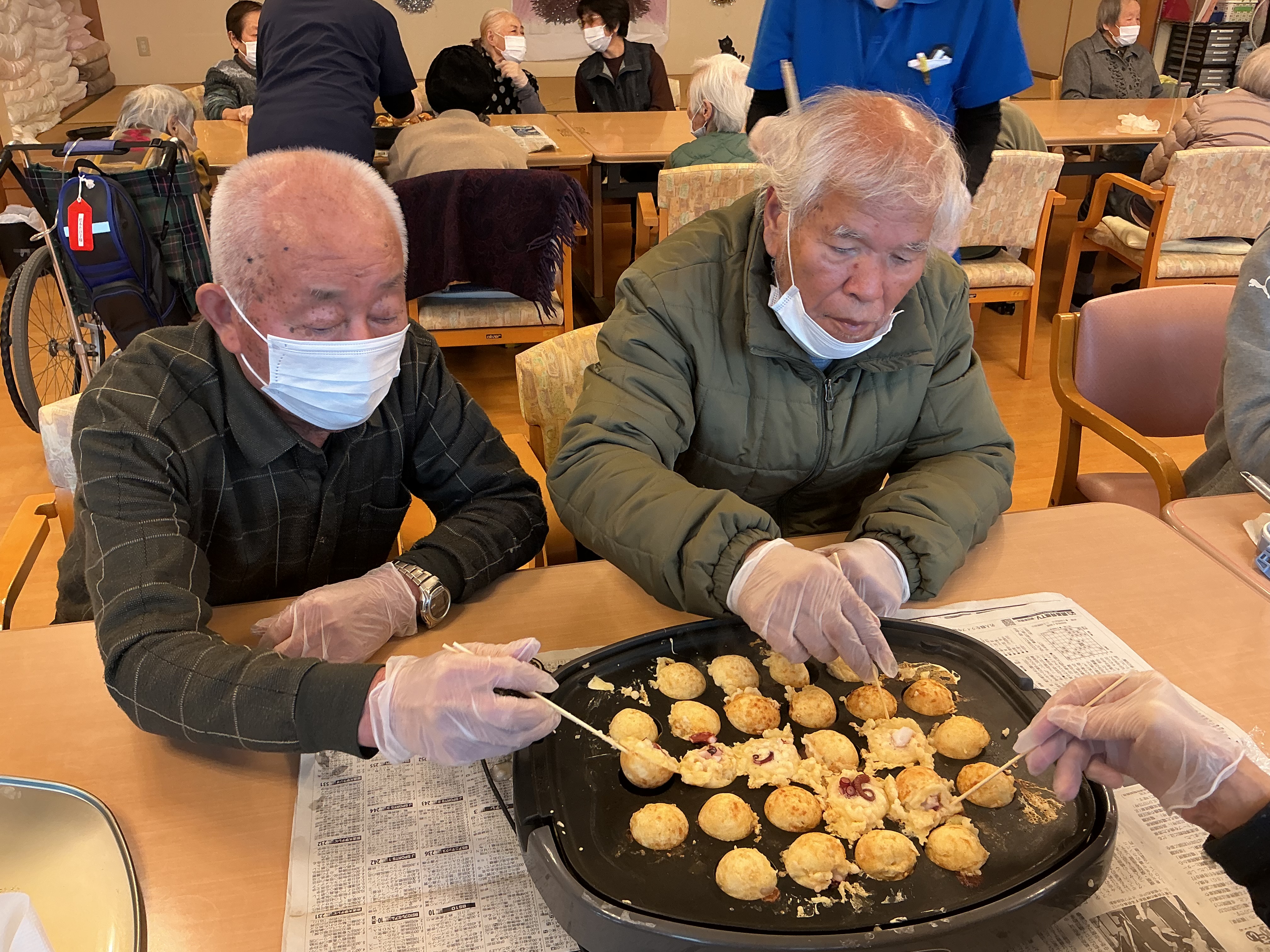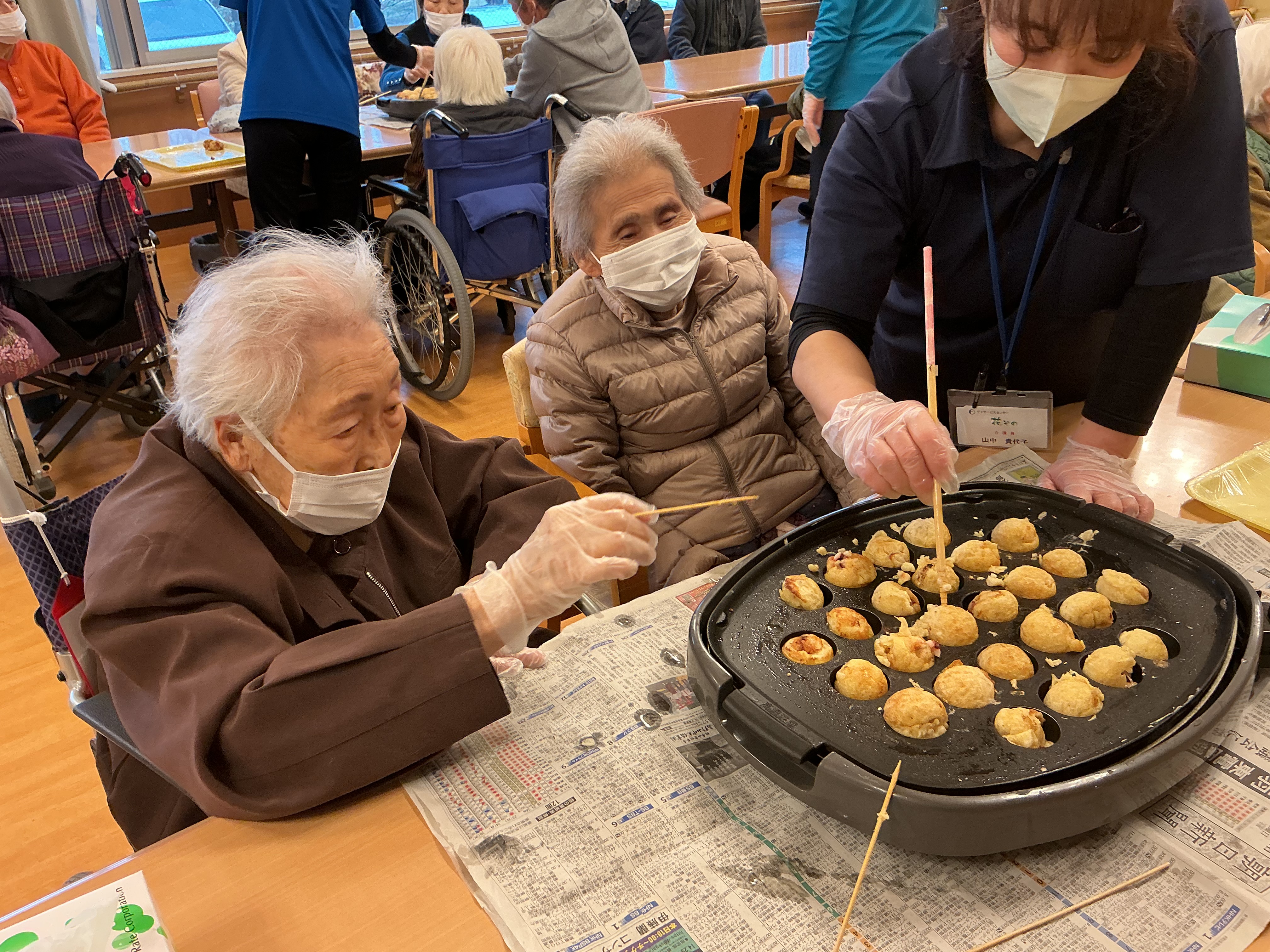 おやつレクでたこ焼きを作りました(^^)/ くるくるっと回しながら上手に焼いて頂けました♪