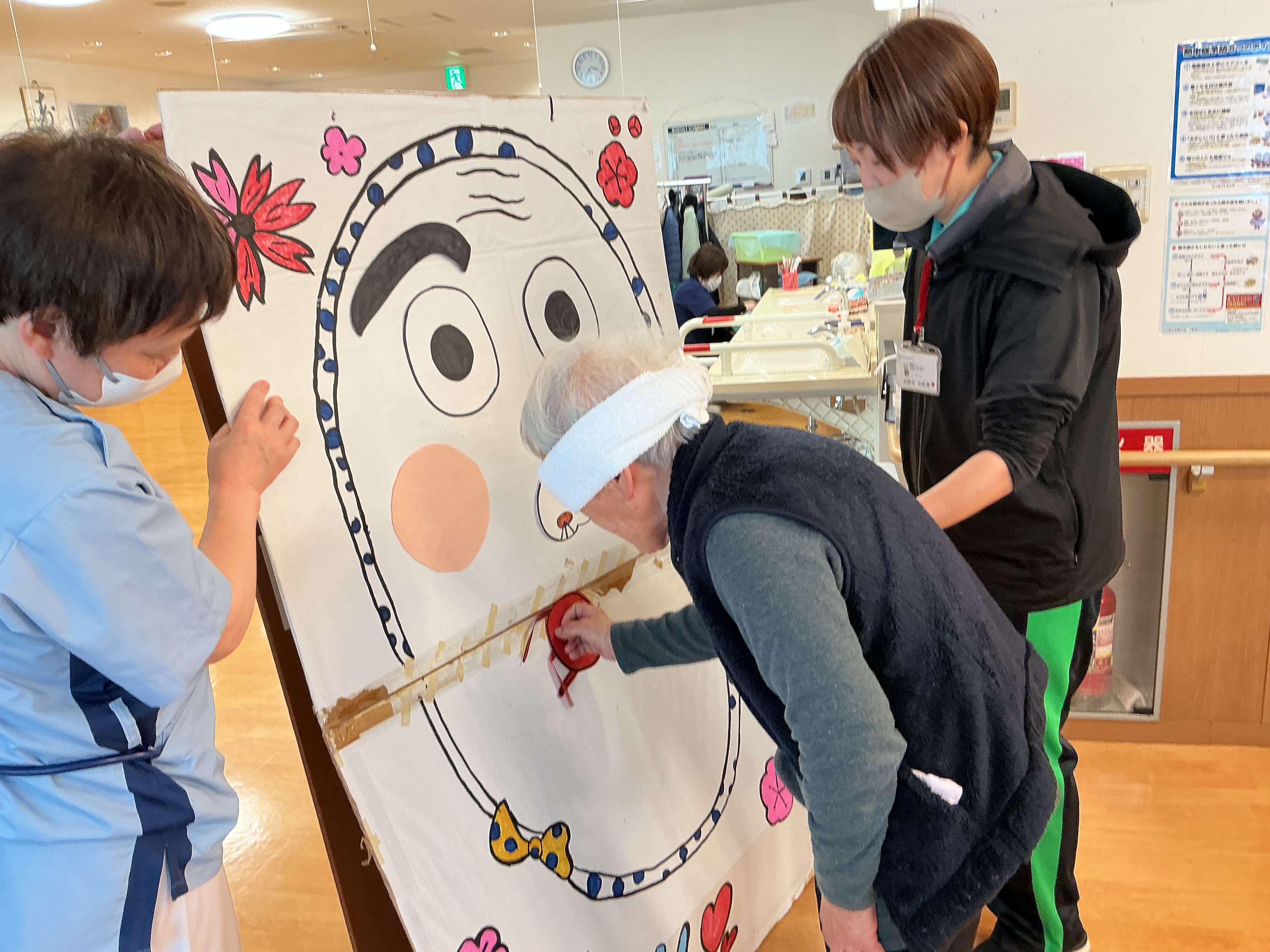 お正月のレクで福笑いを楽しんで頂いています(*^-^*)みんなで大笑いしながら出来上がったひょっとこさん!いい顔になりました♪笑