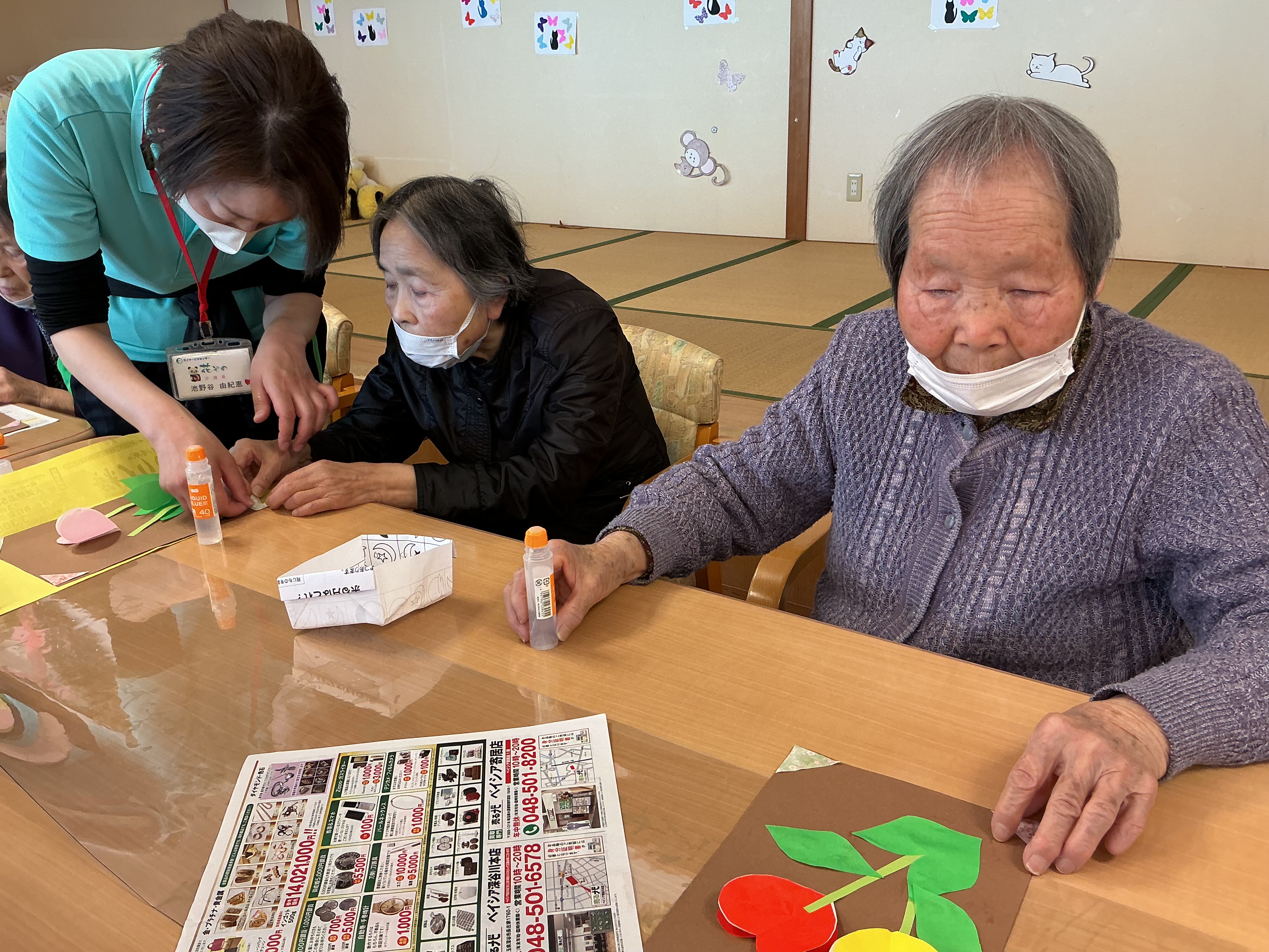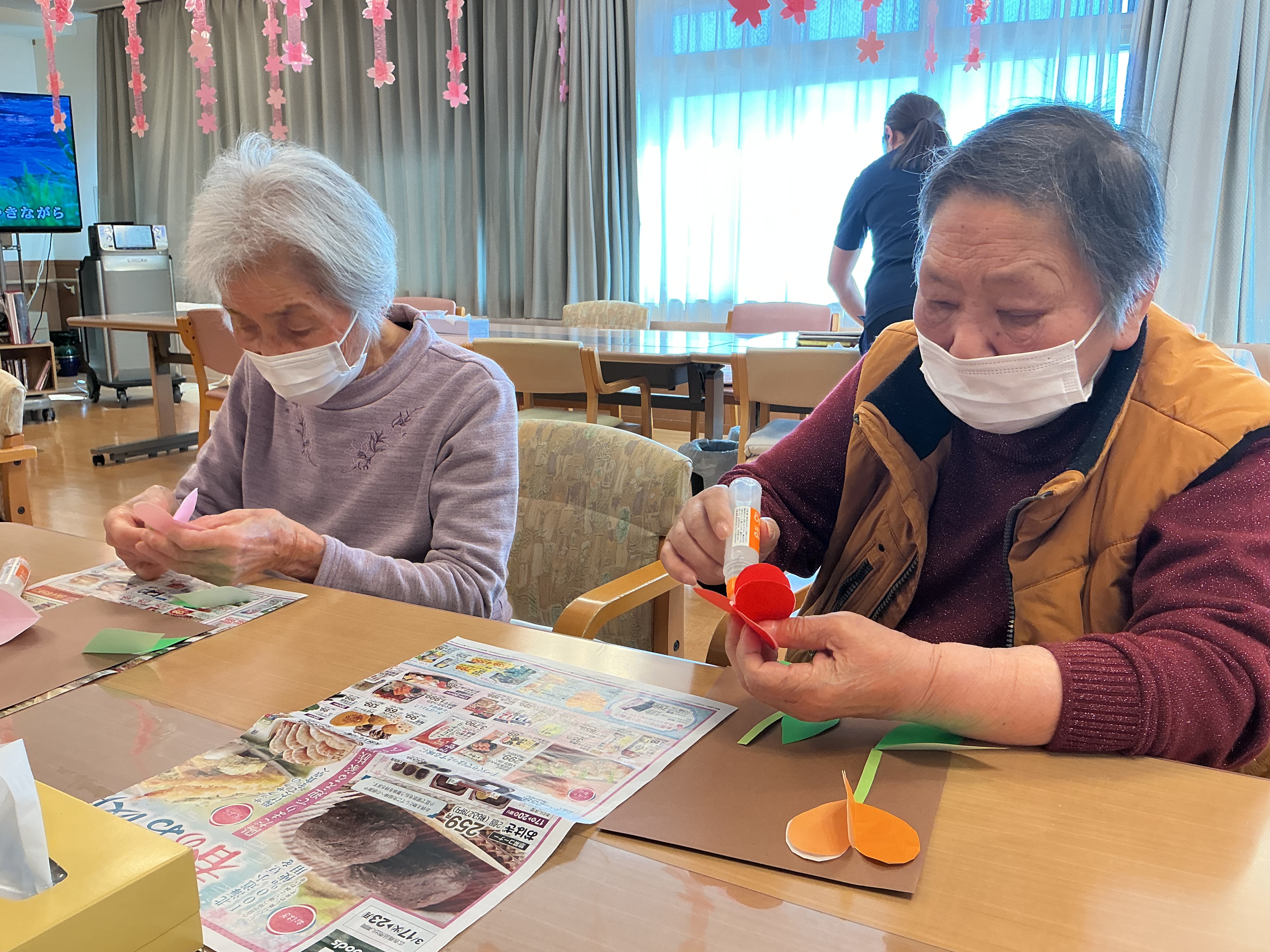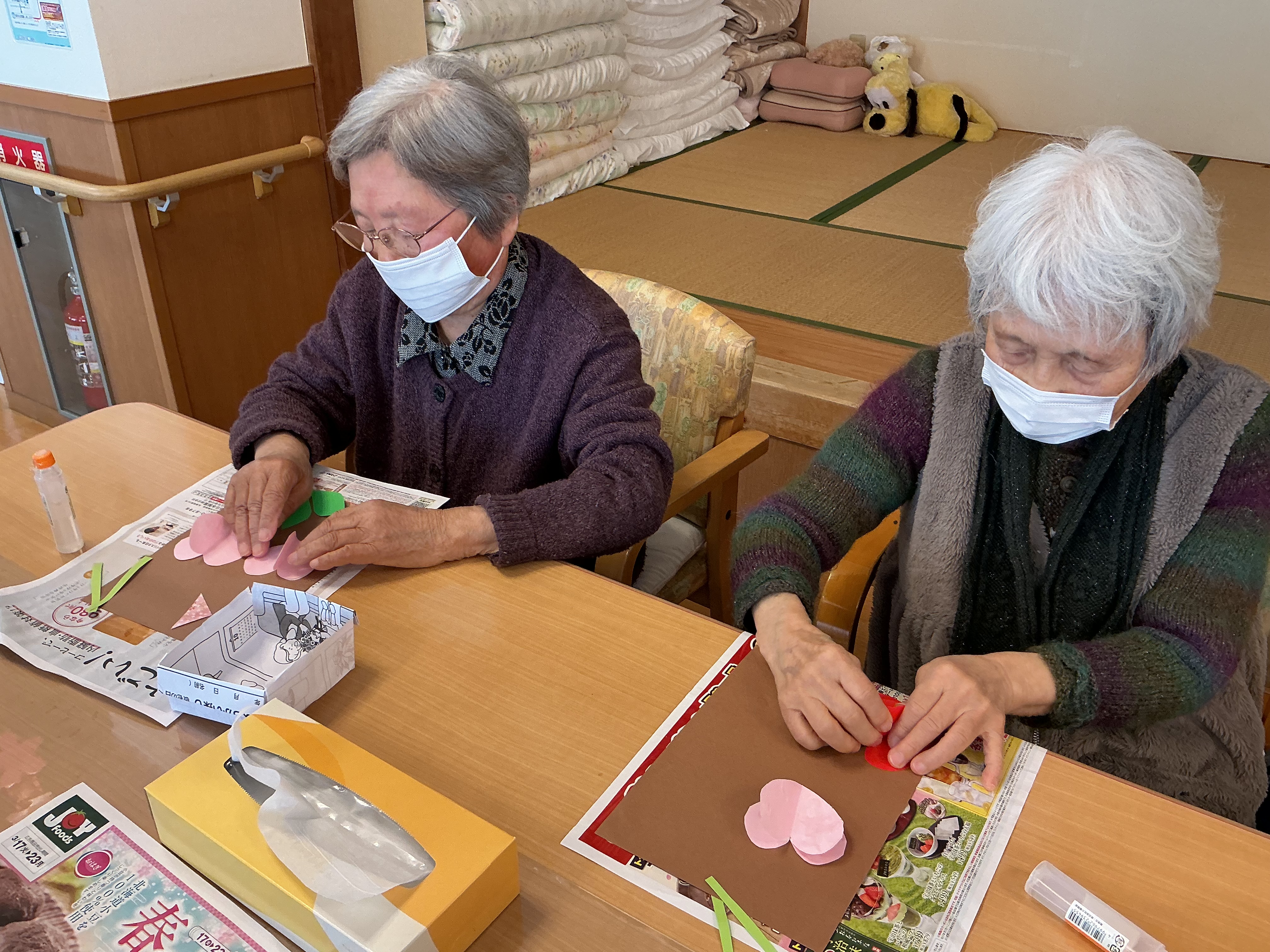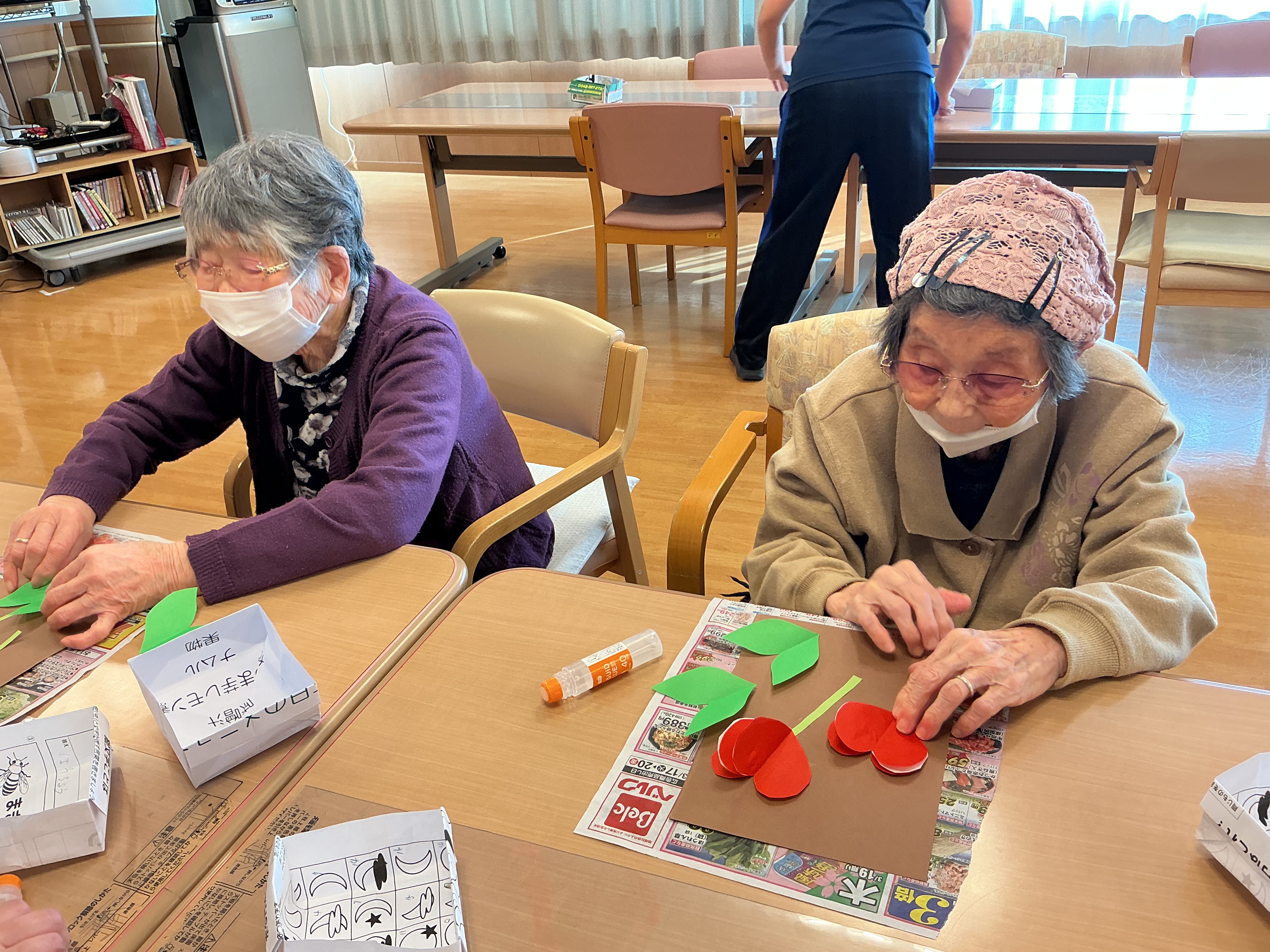 脳トレーニングの時間に工作を行いました!(^^)! ノリや画用紙、折り紙を使って皆様真剣です(*^-^*)