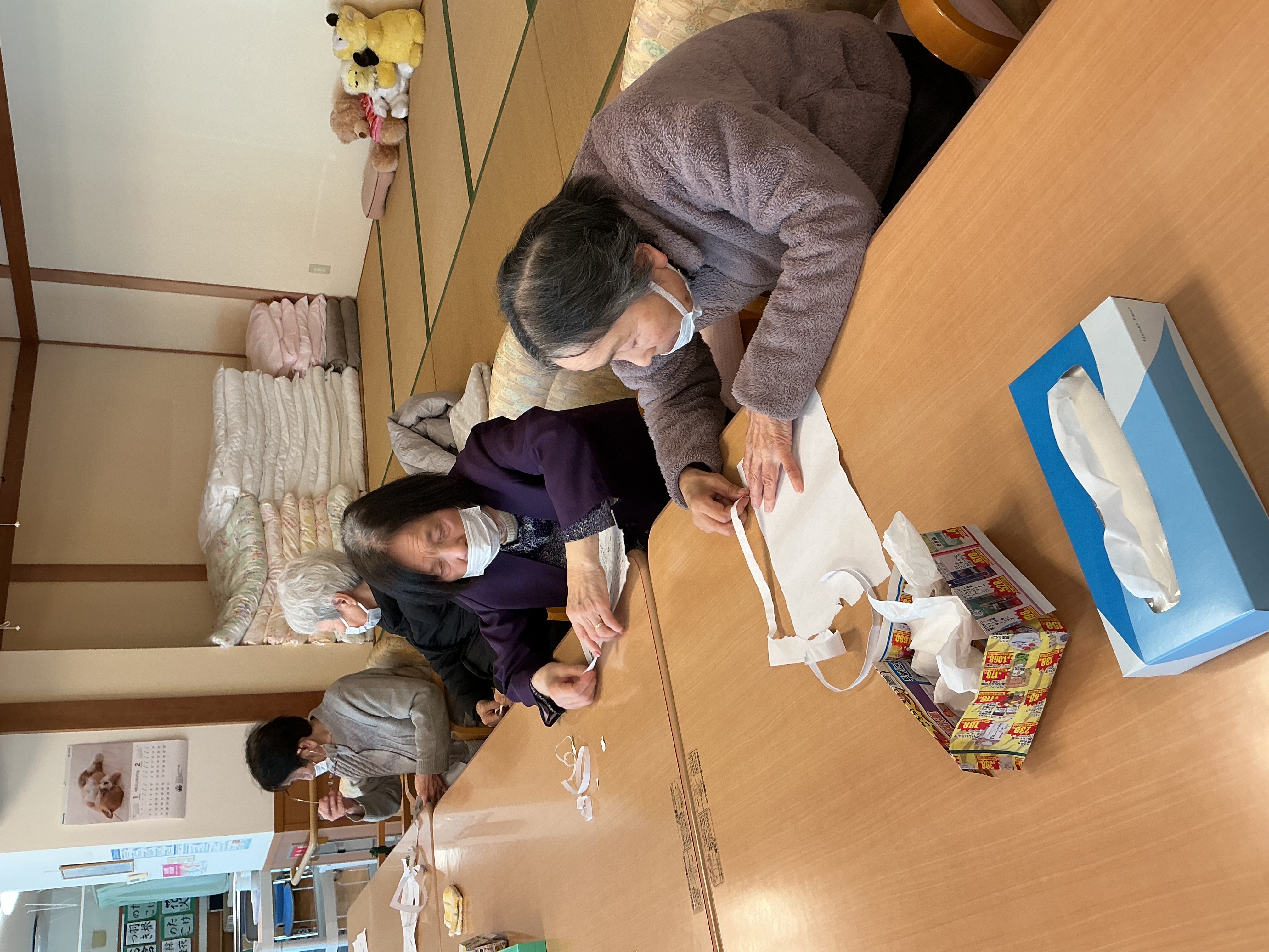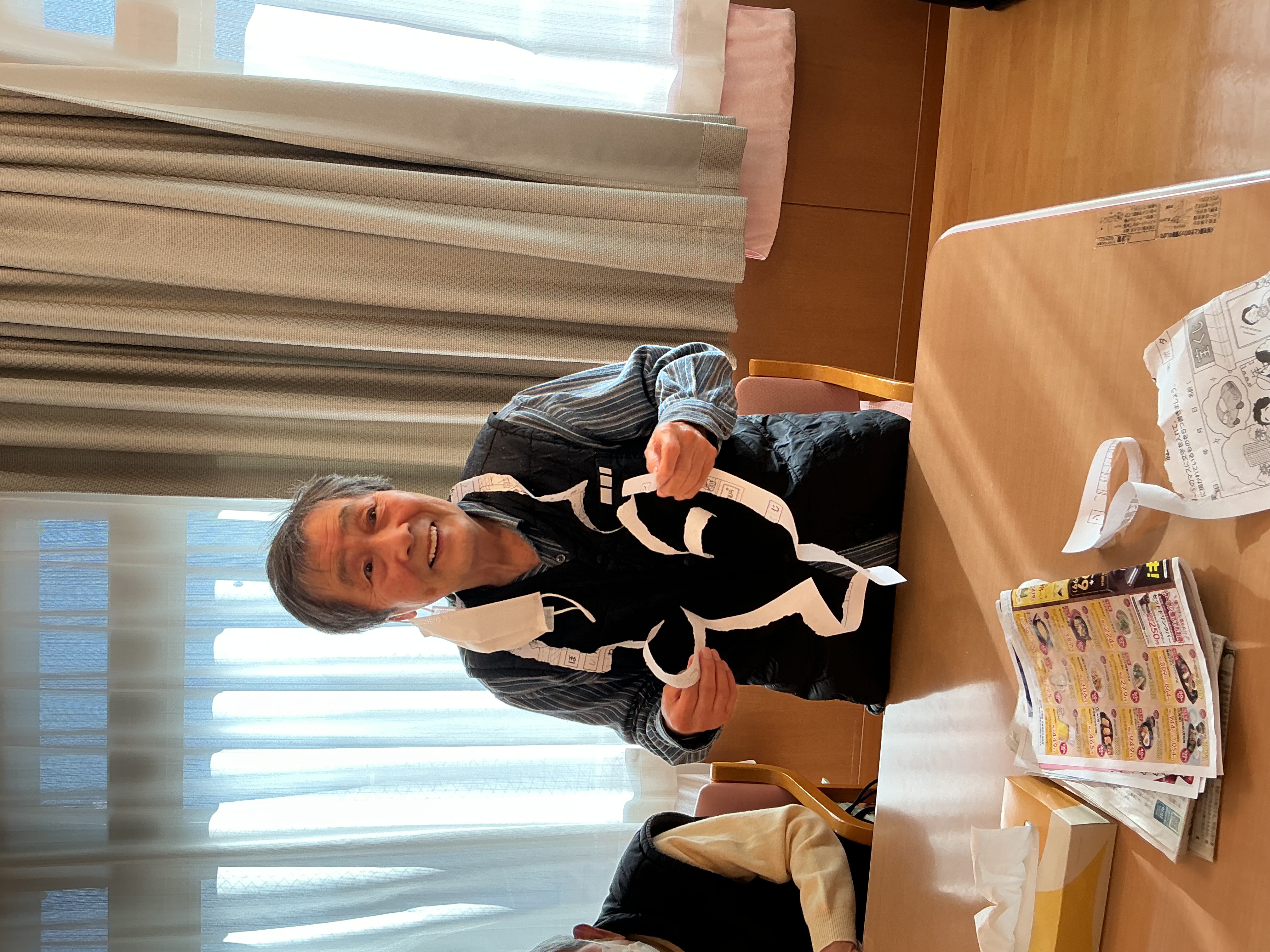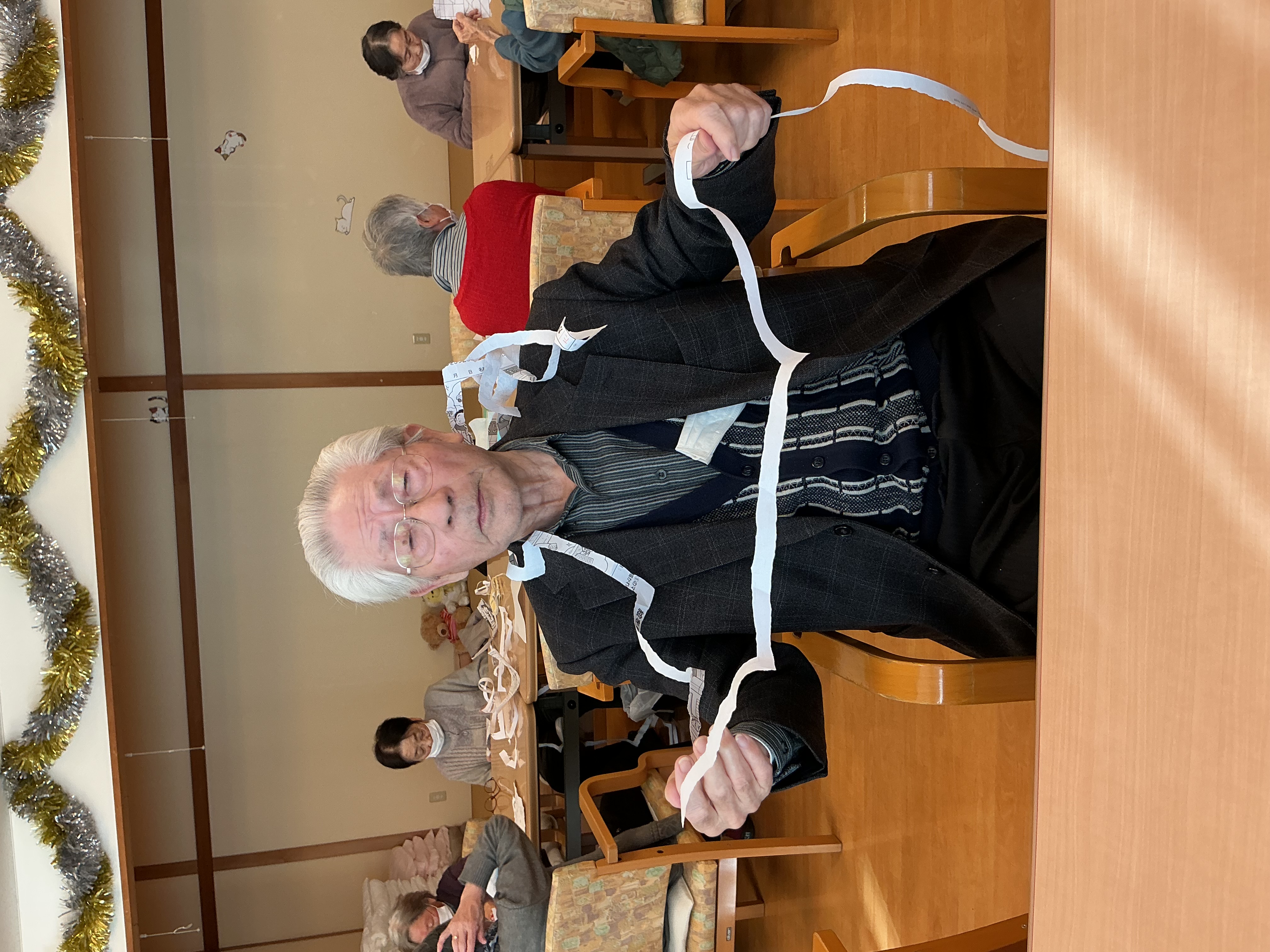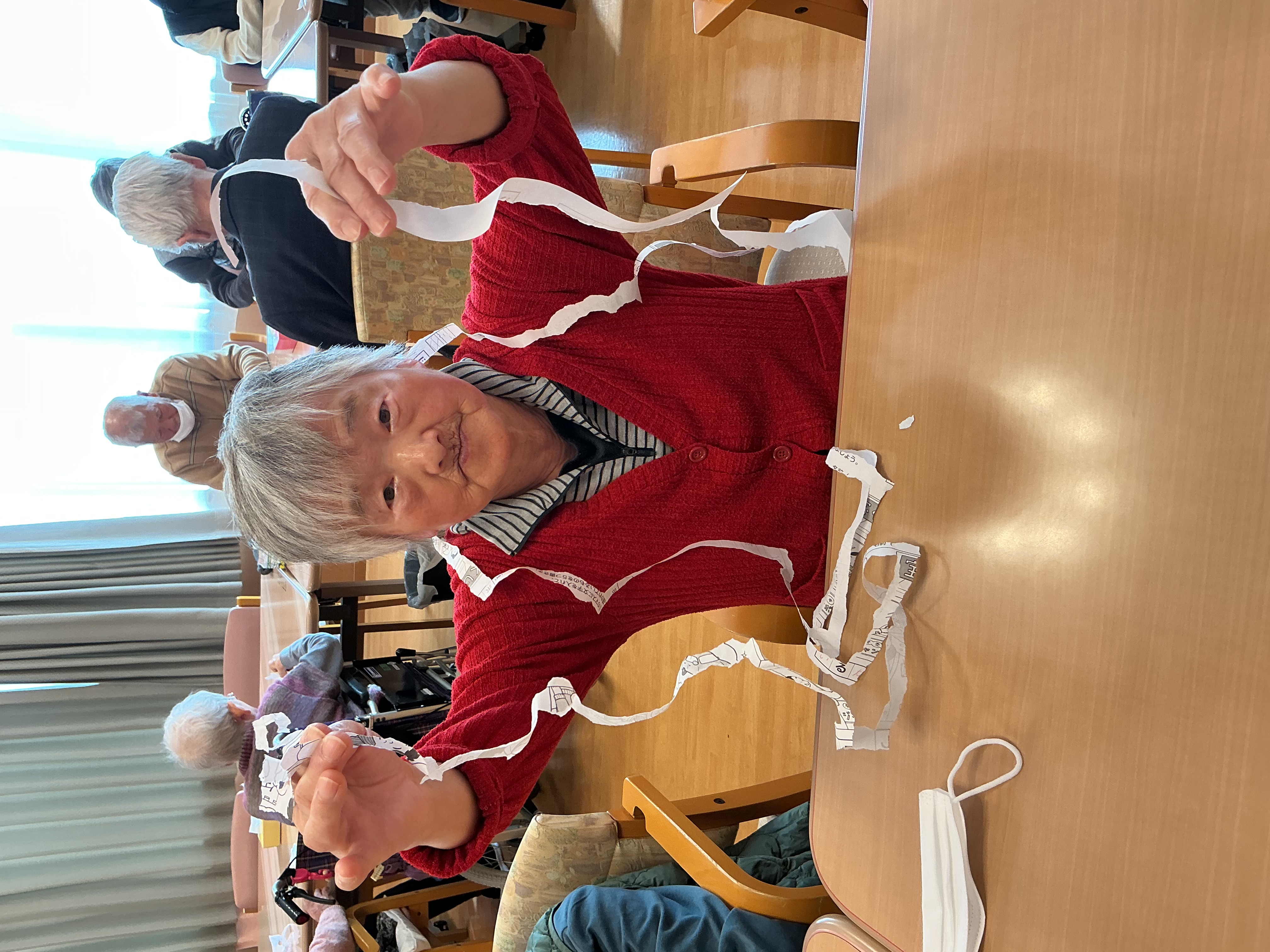 使用済みのプリントを使ったレクリエーションを行いました。紙を長く繋いで切れるかな?皆様とってもお上手です(*^▽^*)