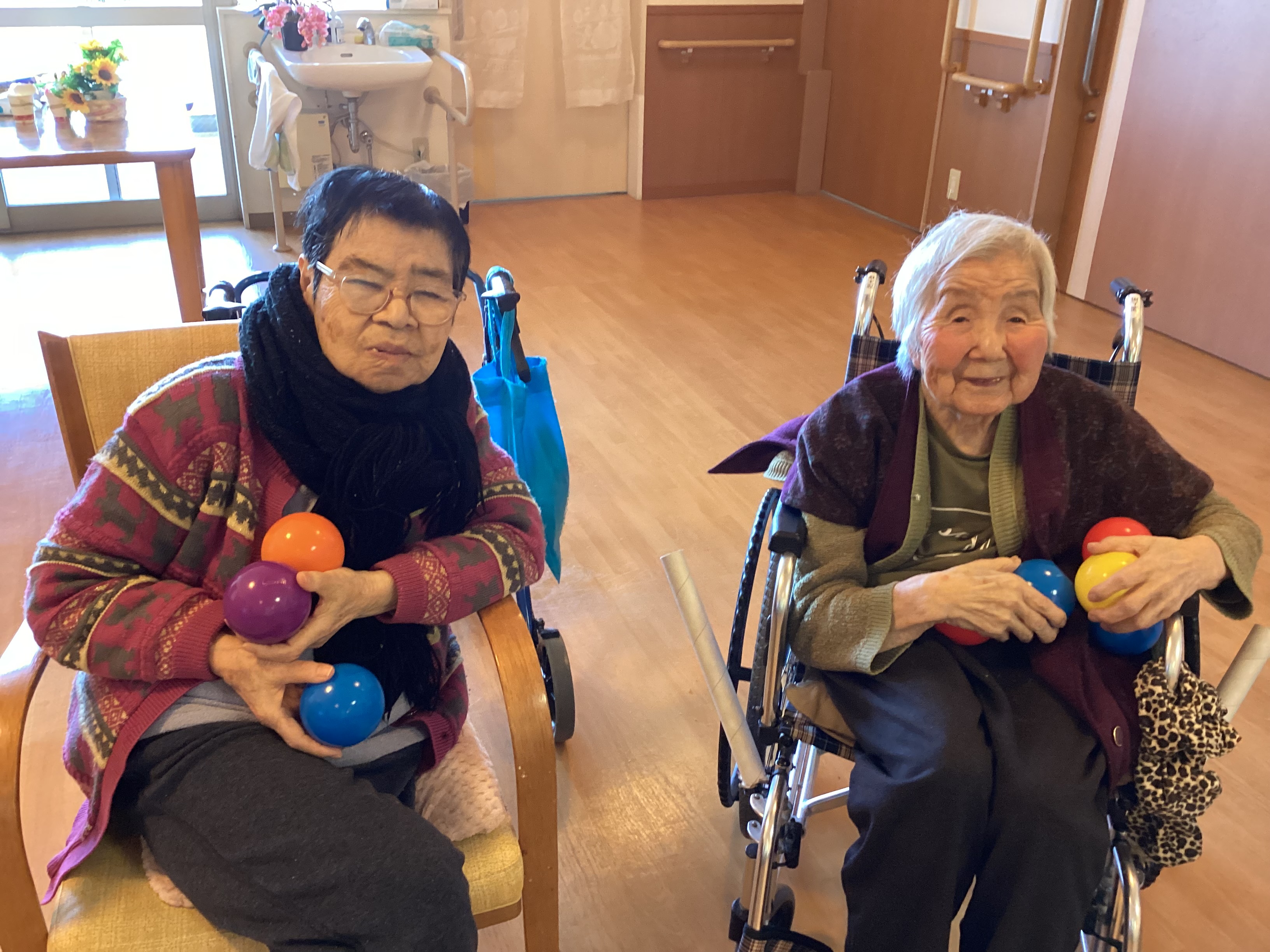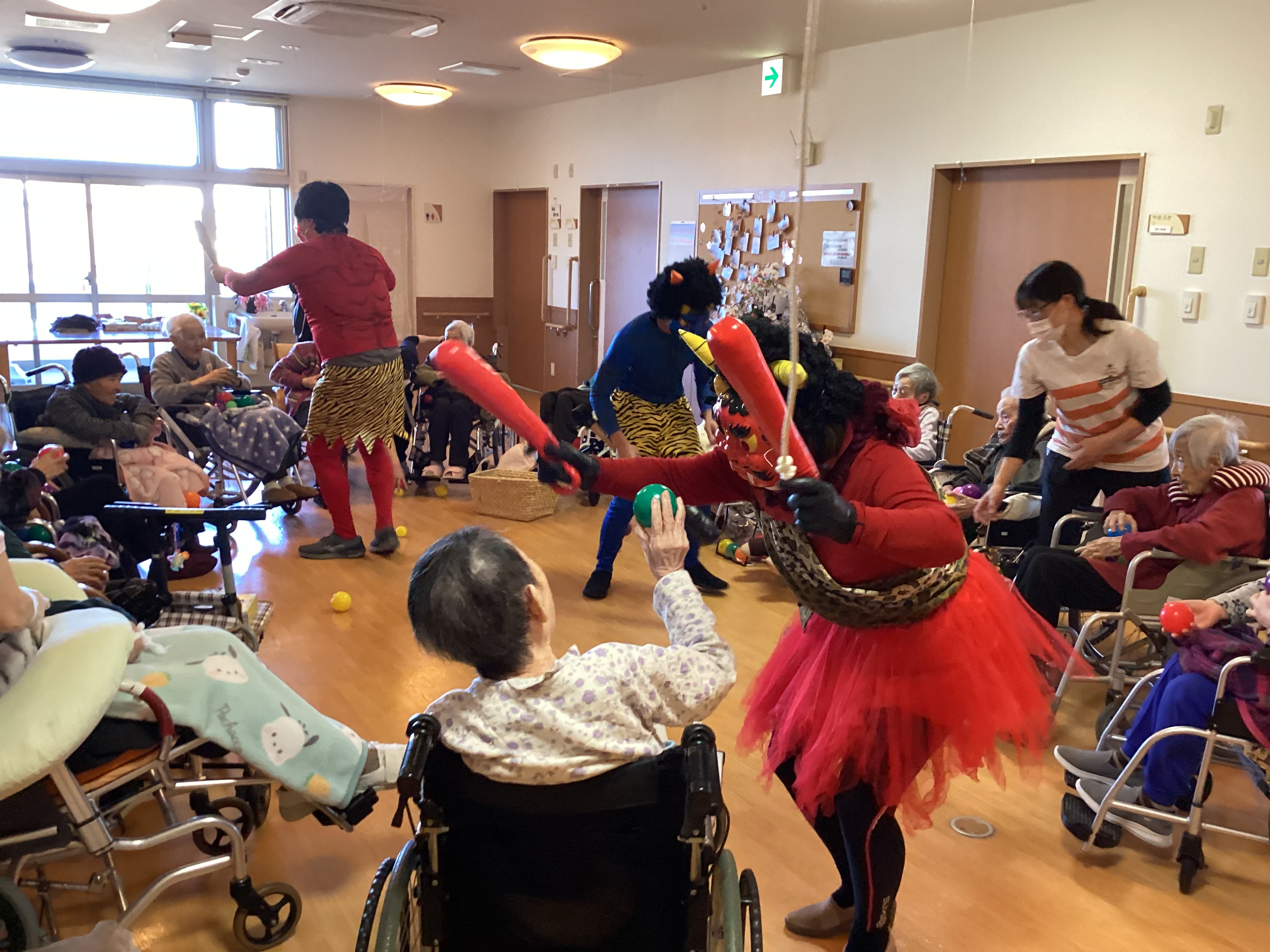 「鬼は外~福は内~」とかけ声! 豆にみたてたボールを鬼に扮した職員に投げつけて退治しました! 最後は心をいれかえた鬼と記念撮影です('ω')ノ 今年も一年皆様が健康で過ごせますように☆