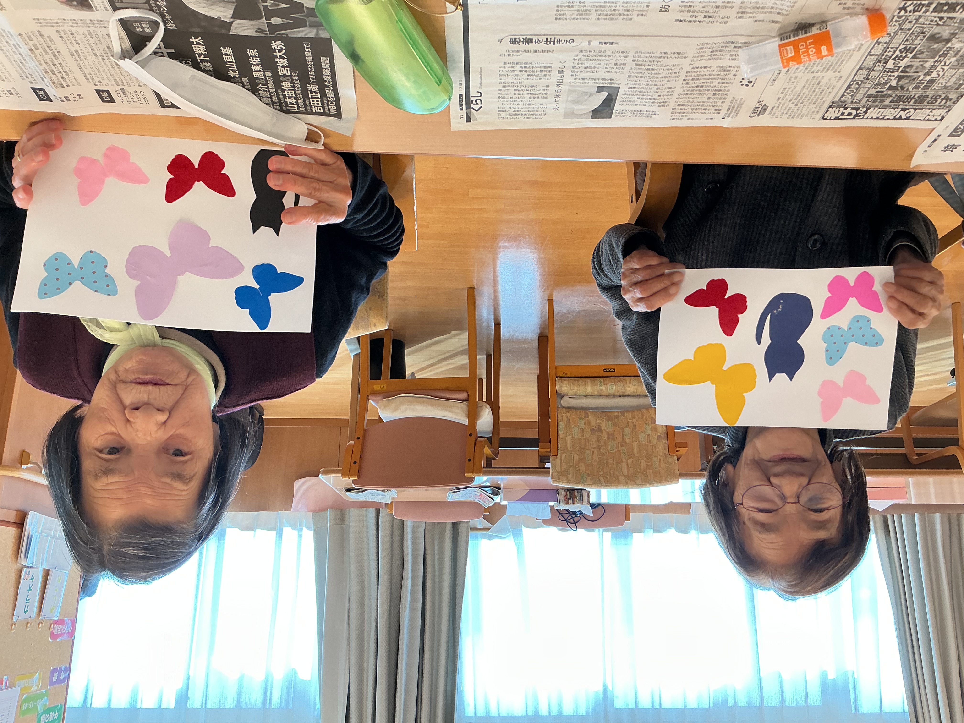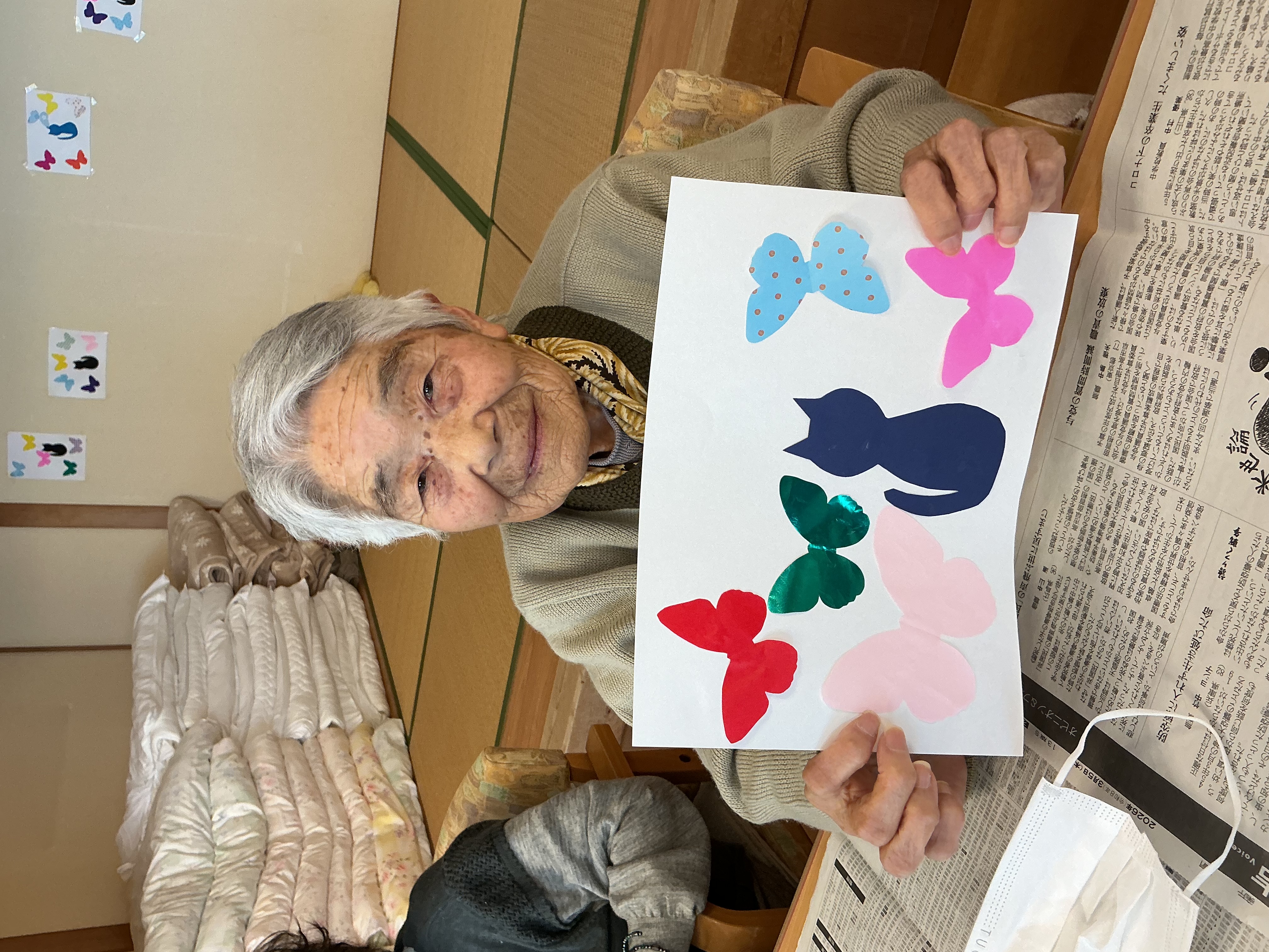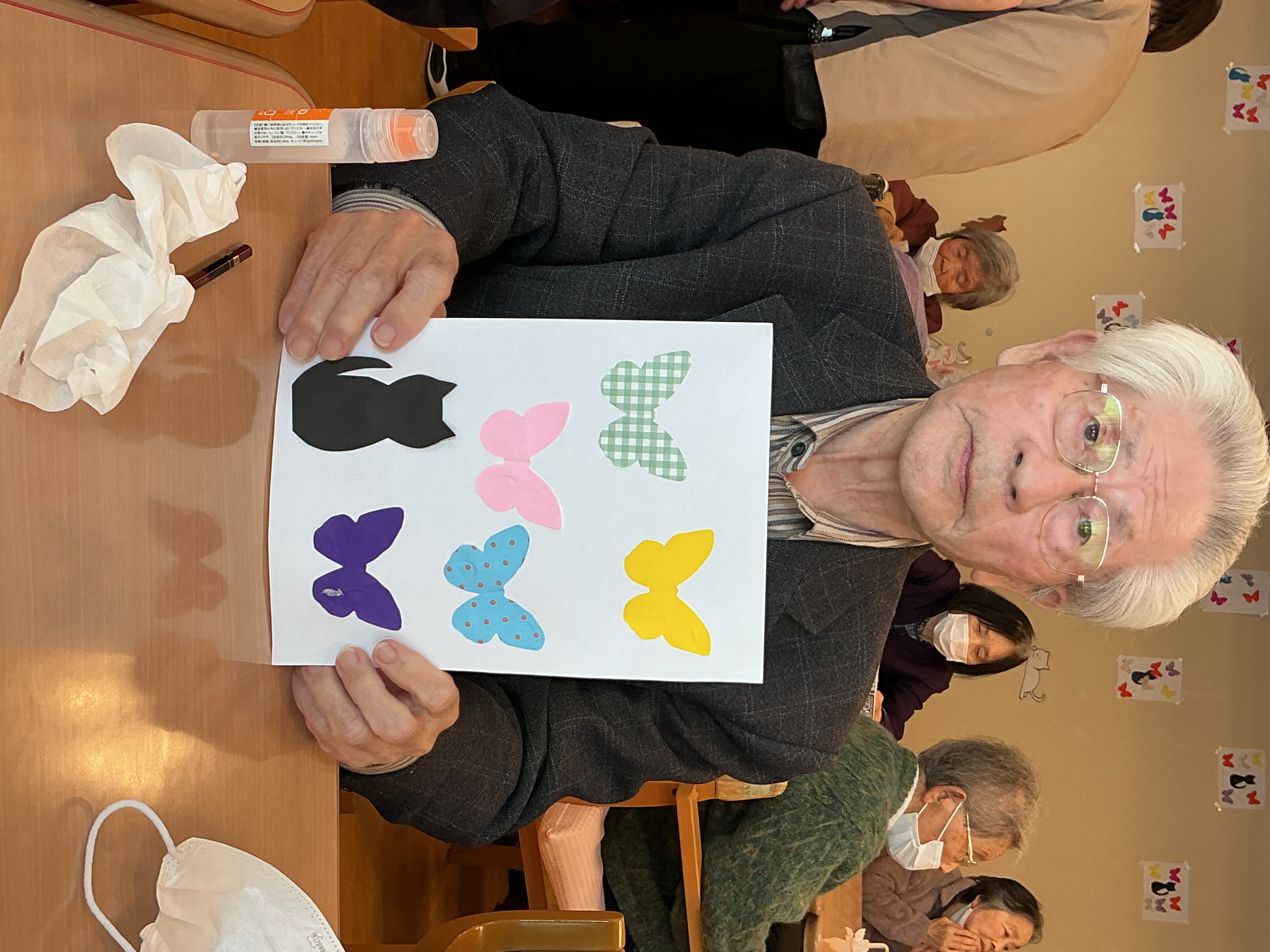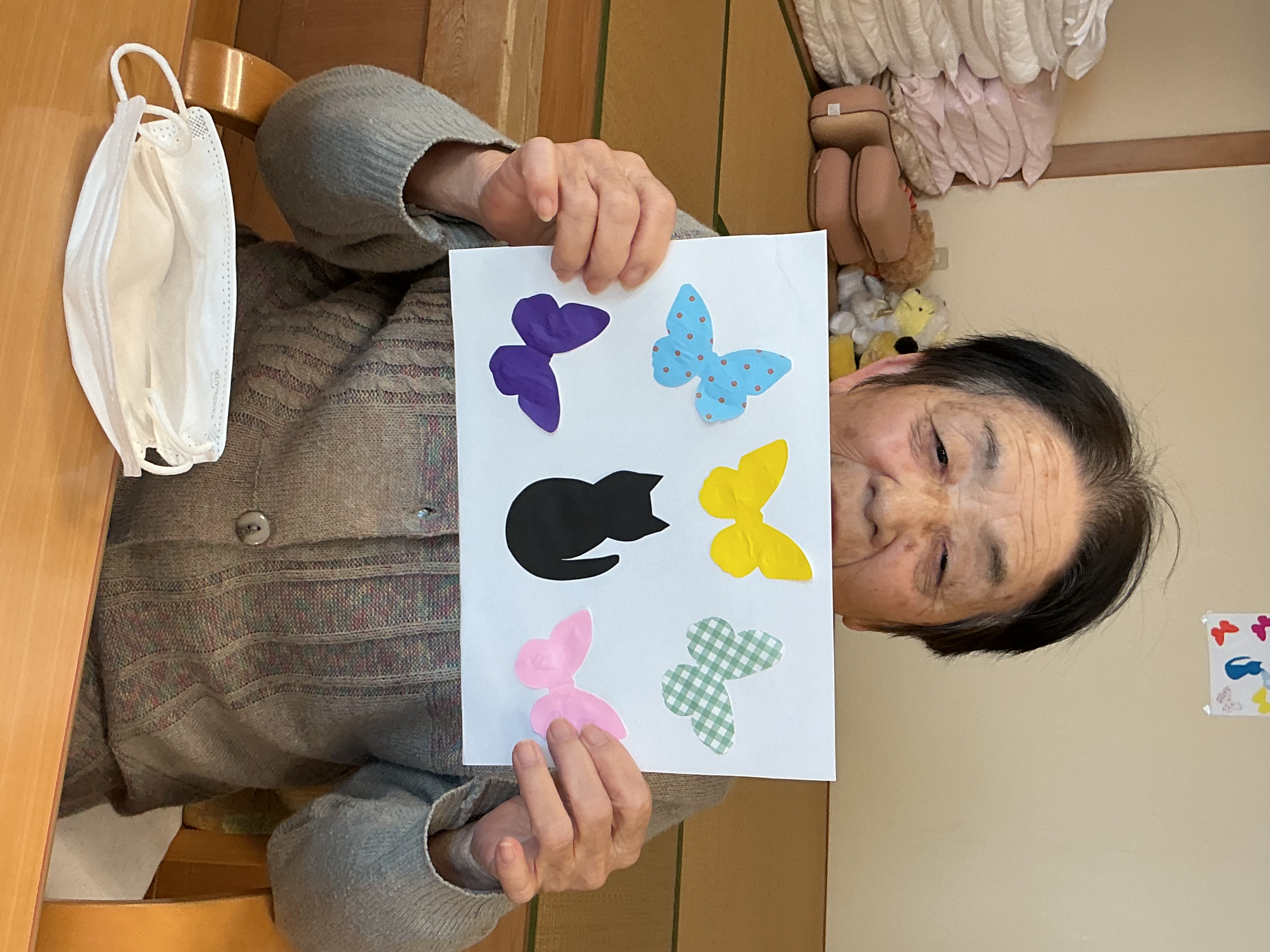 色様々なちょうちょと可愛らしい猫の春の壁飾りが完成しました!(^^)! デイルーム内に展示してあります♪