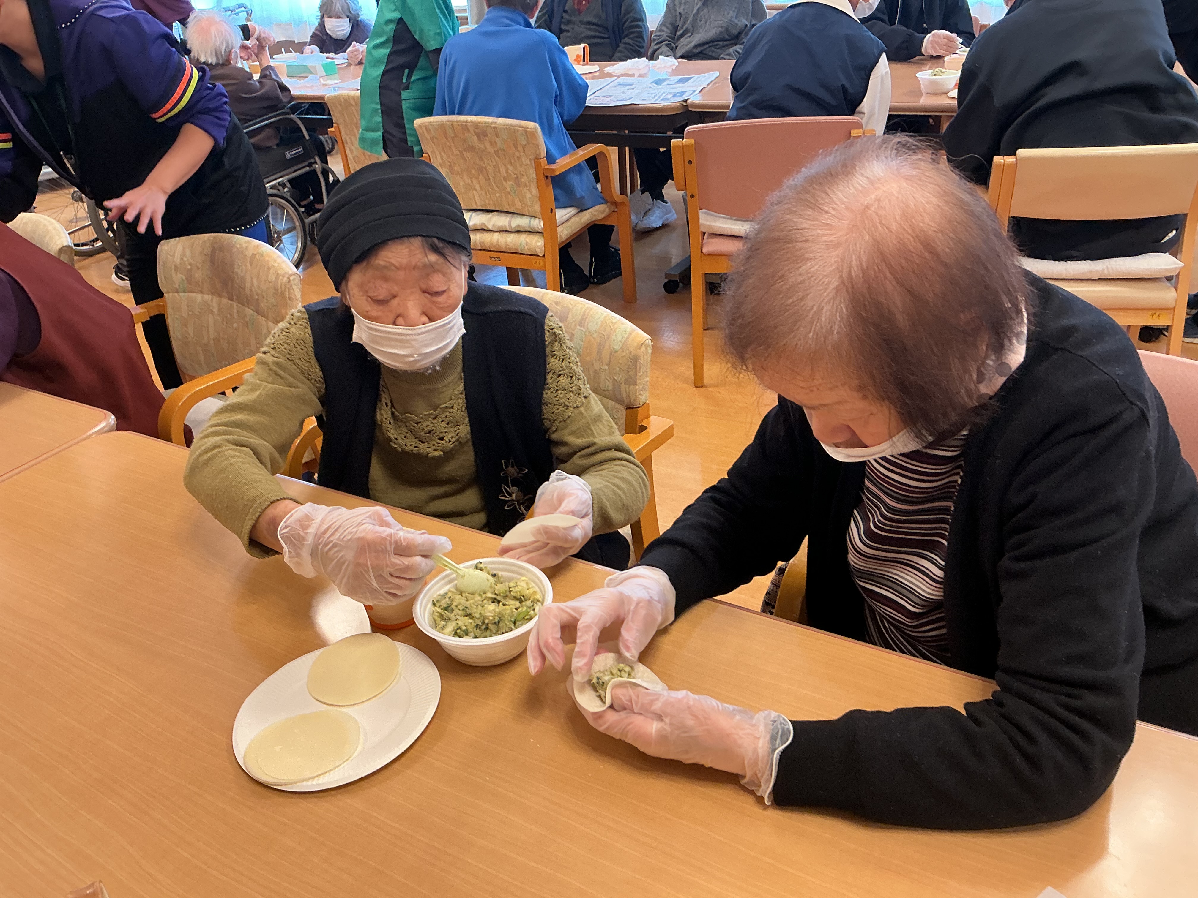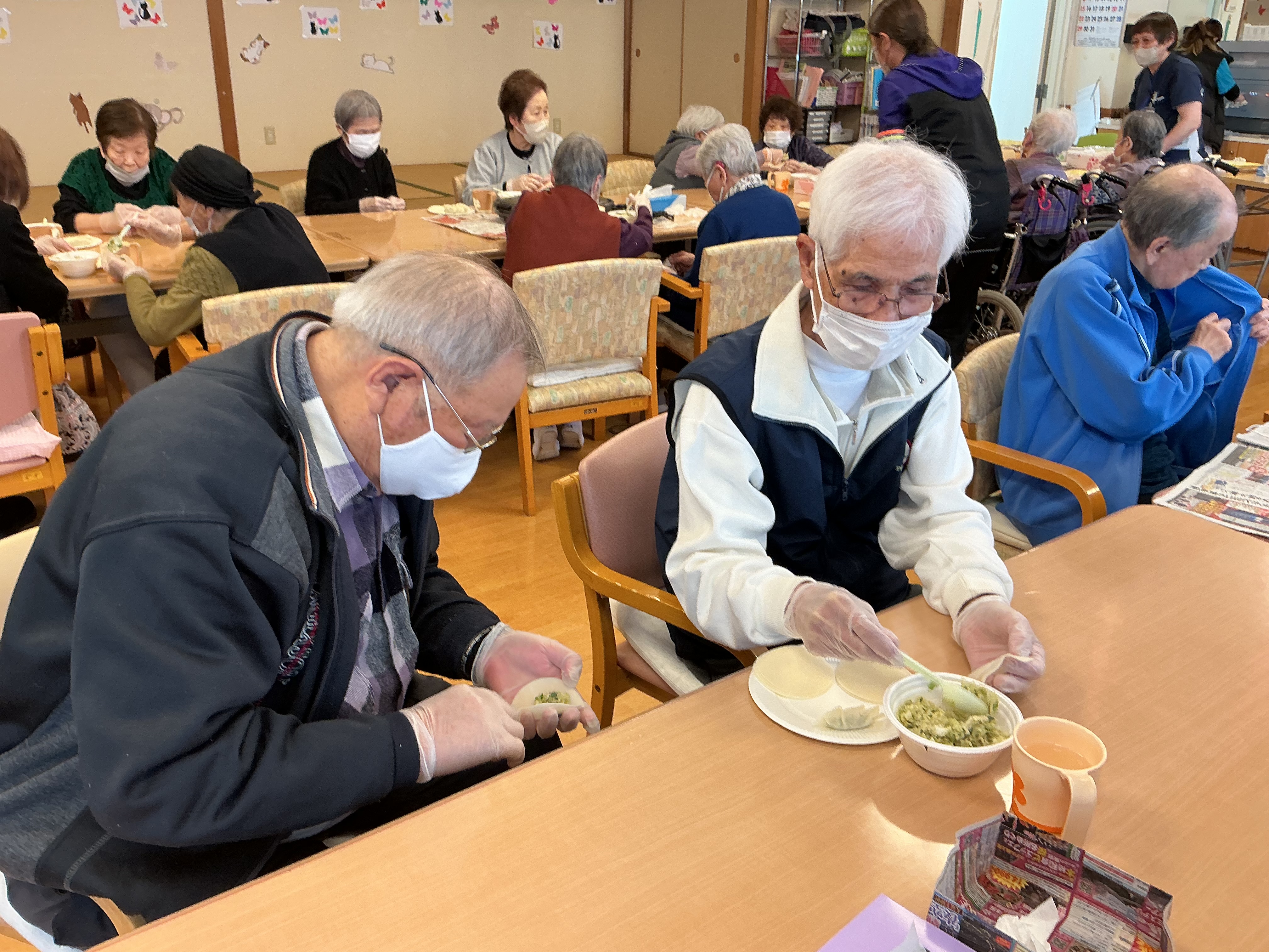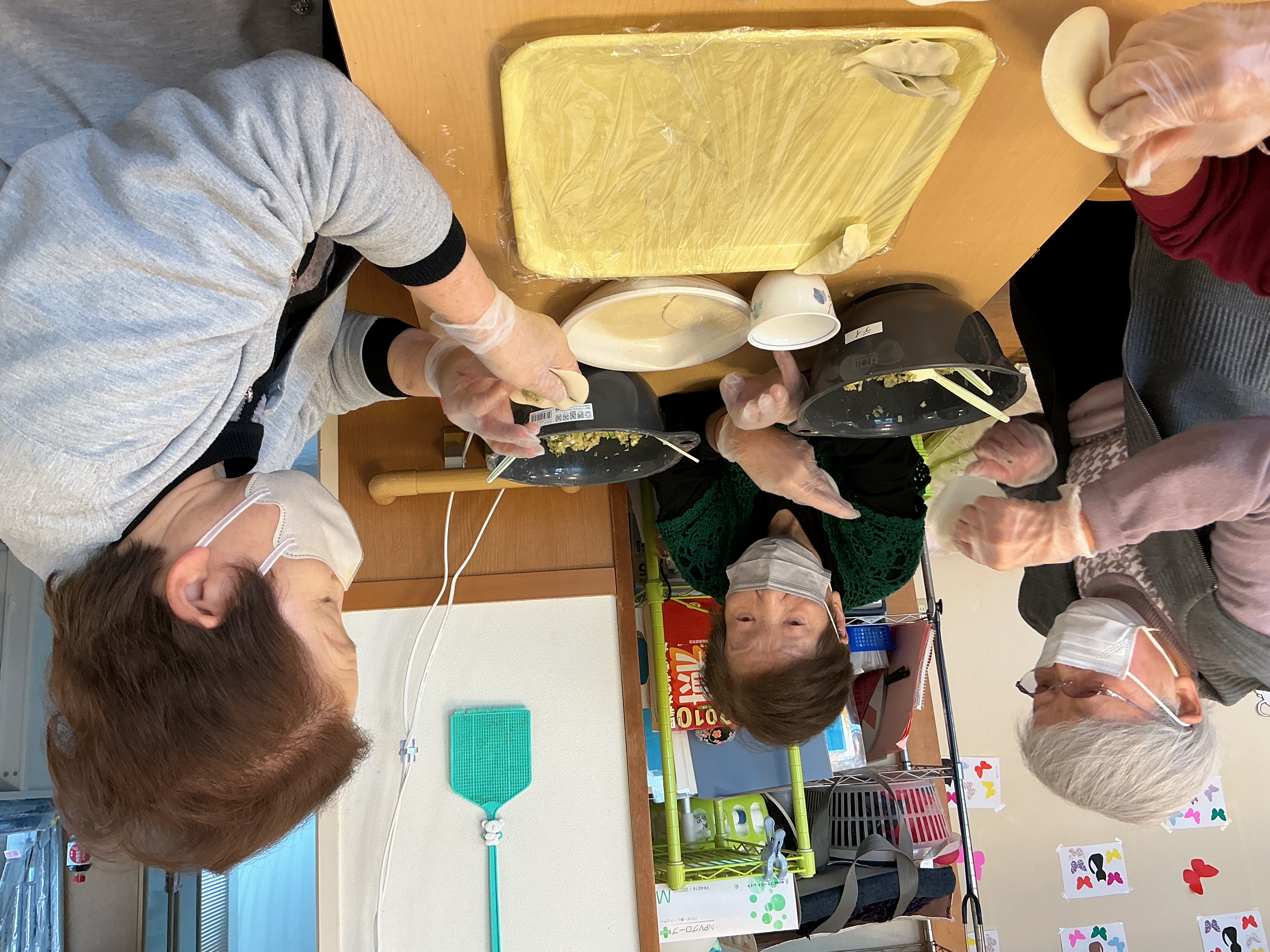 3/13におやつレクで餃子作りを行いました。野菜がたくさん入った餡を皆様、器用に包んで下さいました(^^)/ 全員で協力し沢山の餃子が出来上がりました♪