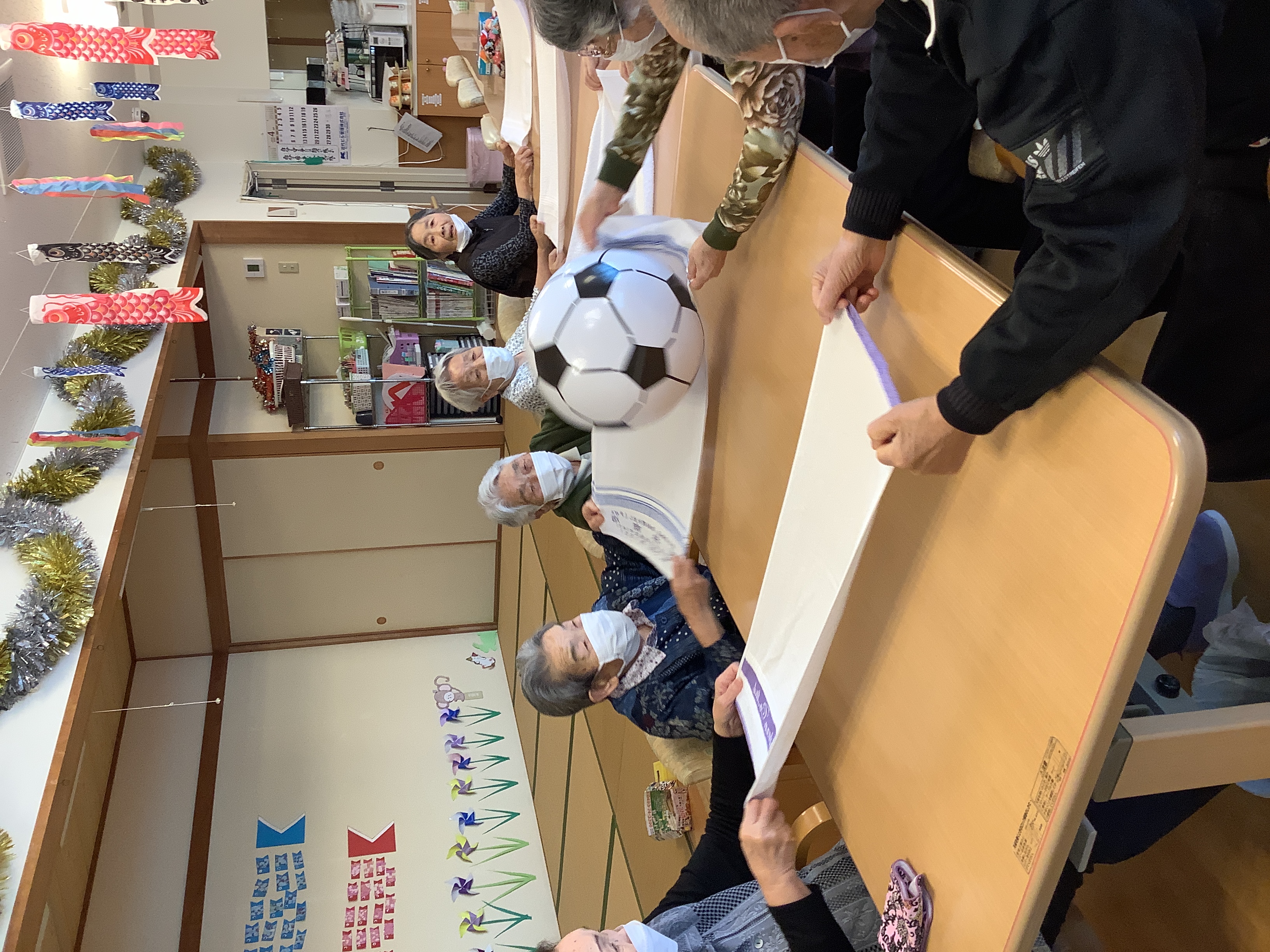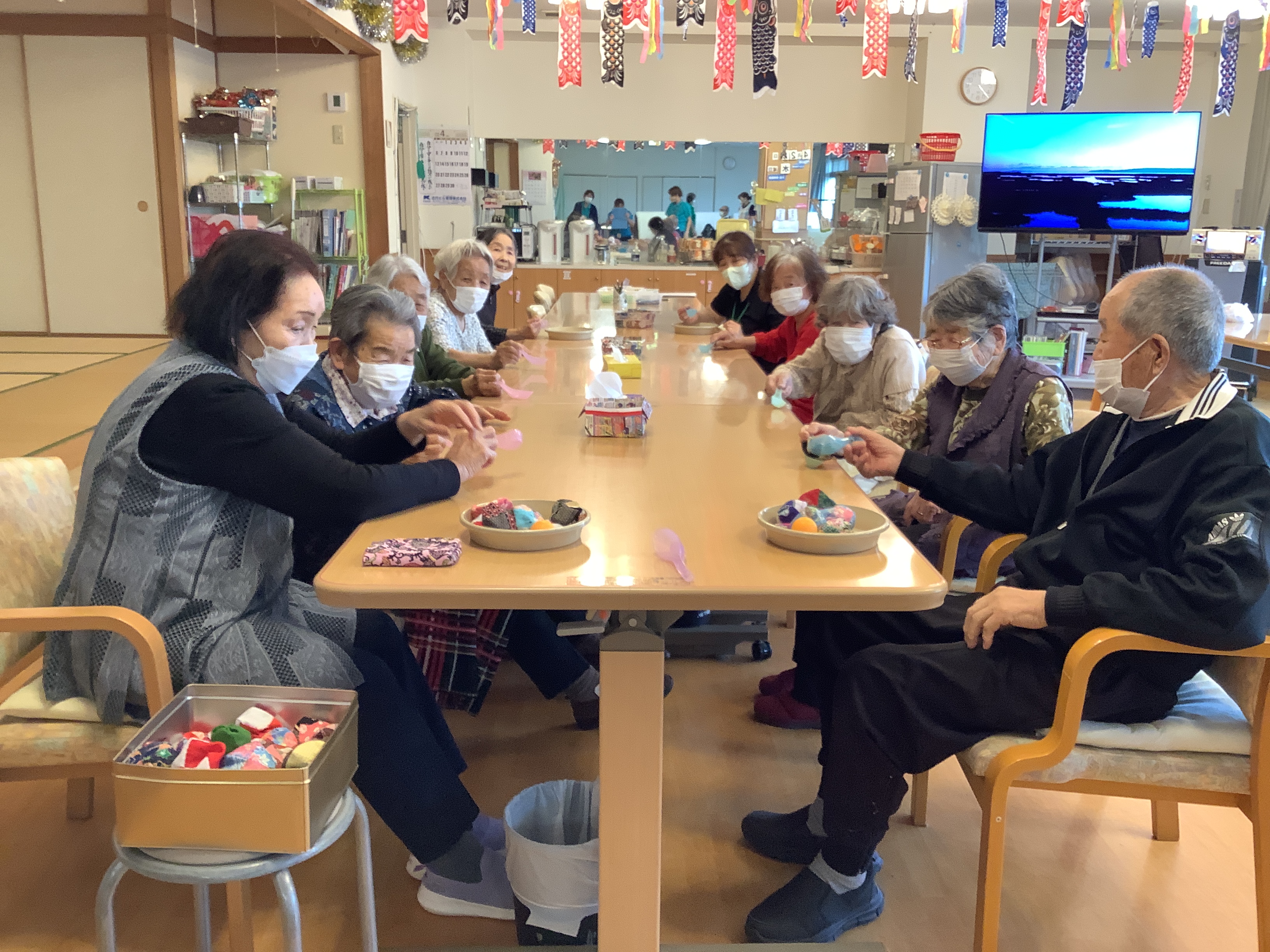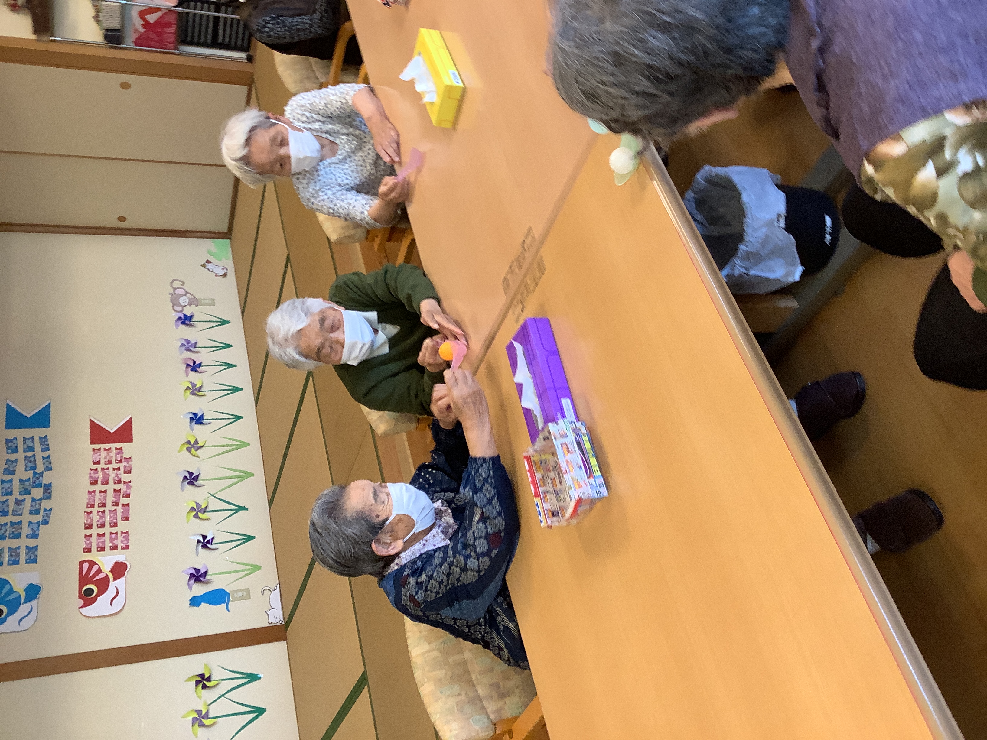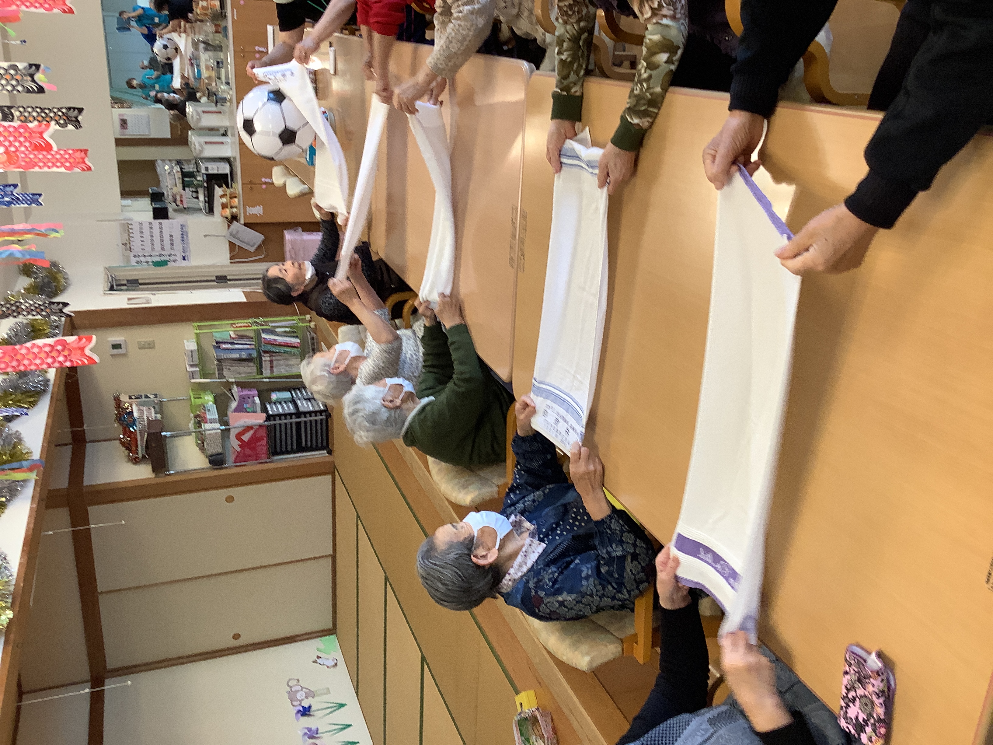 機能訓練の時間にボール回し競争を行いました(^^)/ 最初はレンゲを使いピンポン玉やお手玉を回し、最後はタオルを使って二人組で大きなボールを運びました(*^▽^*) 皆様大笑いしながら楽しまれていました♪