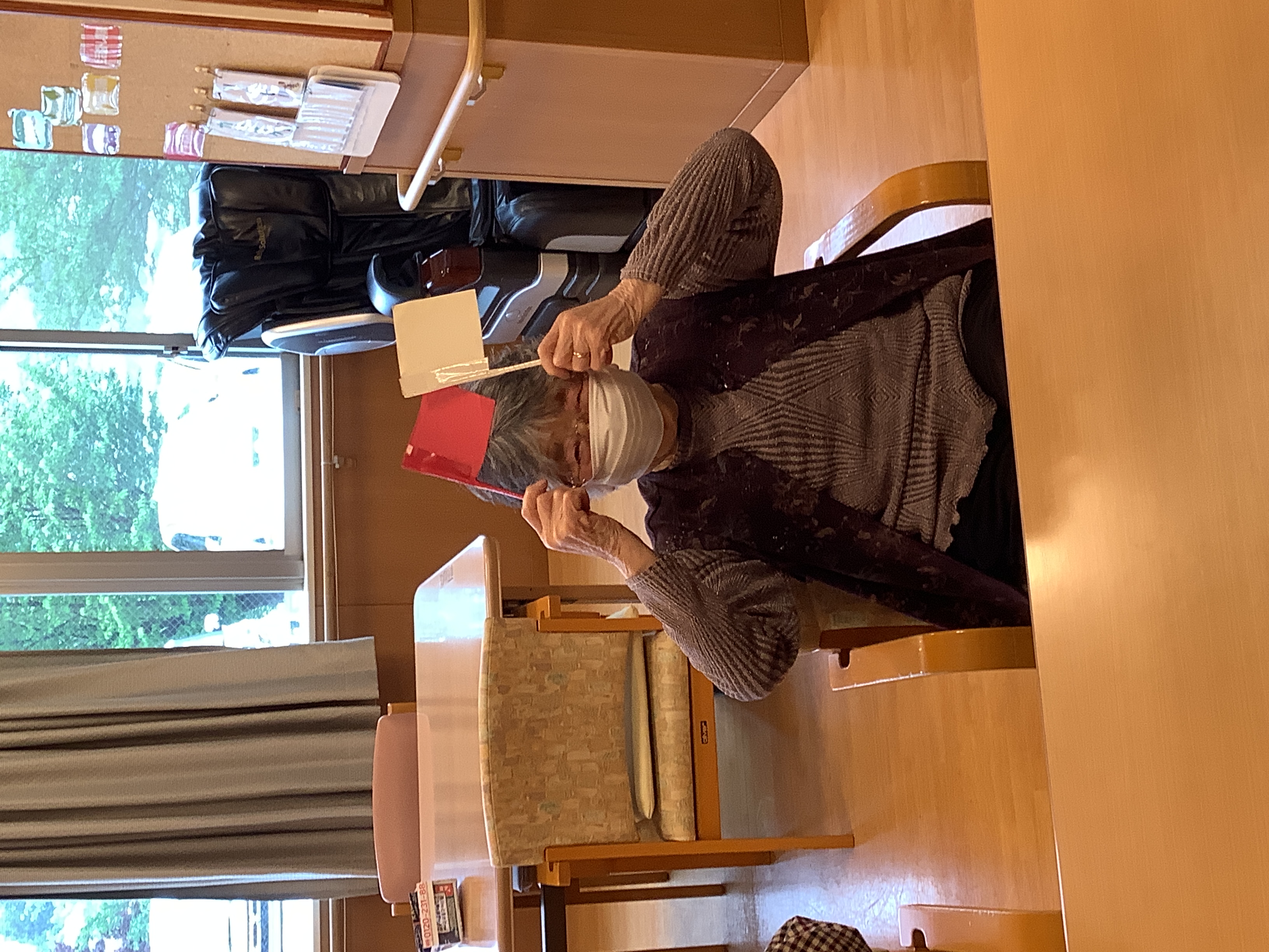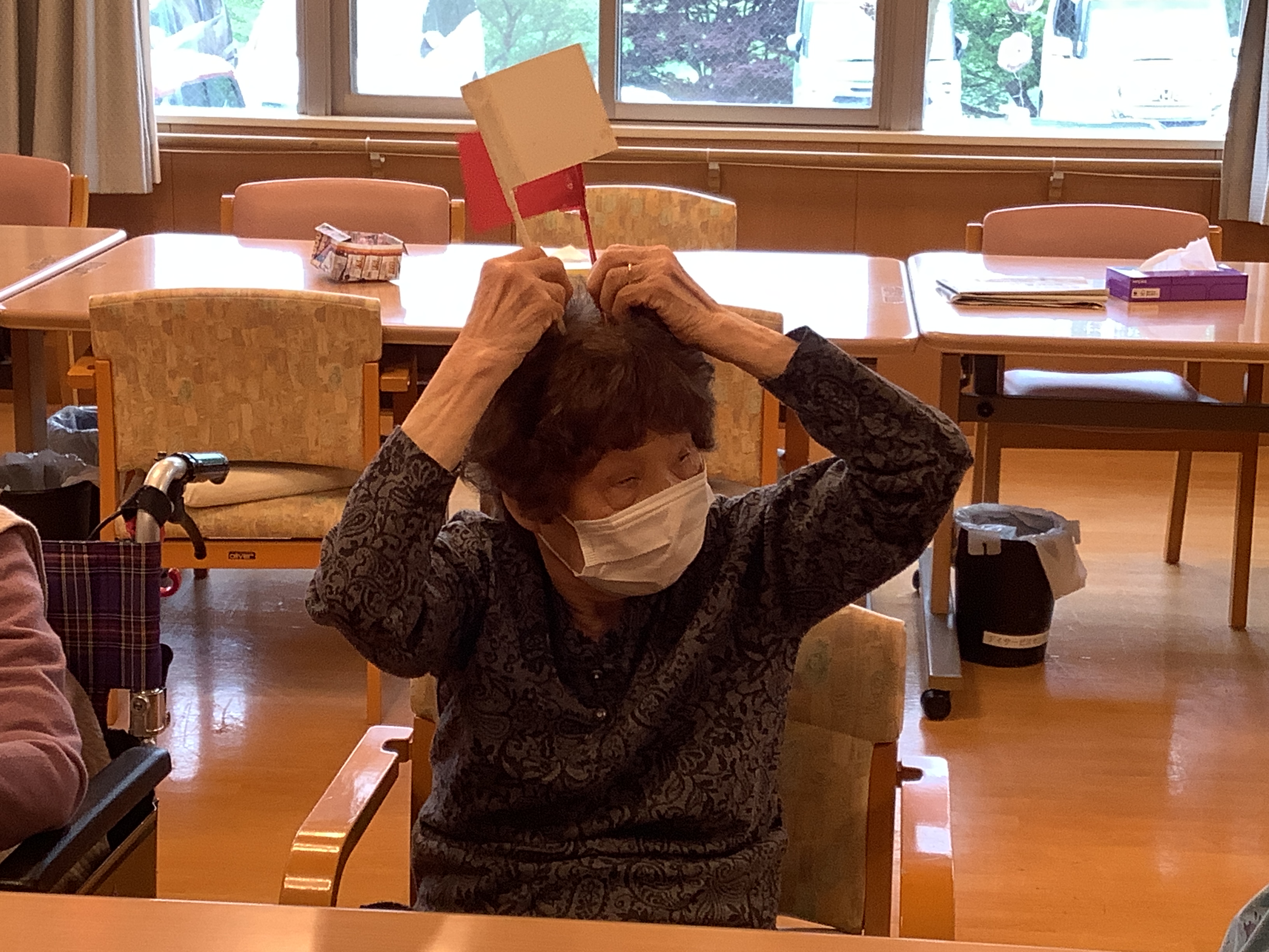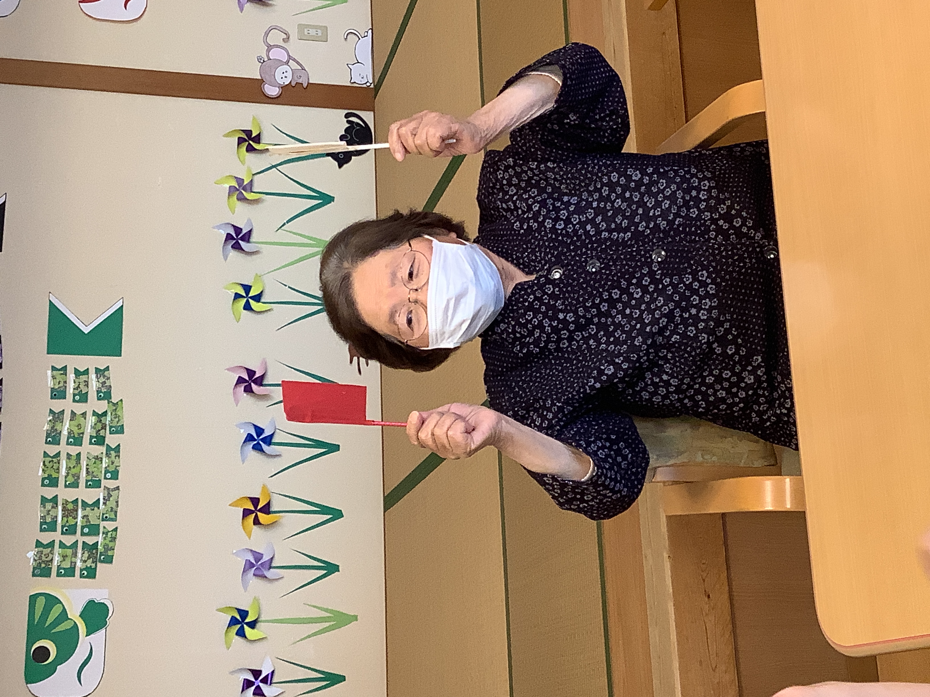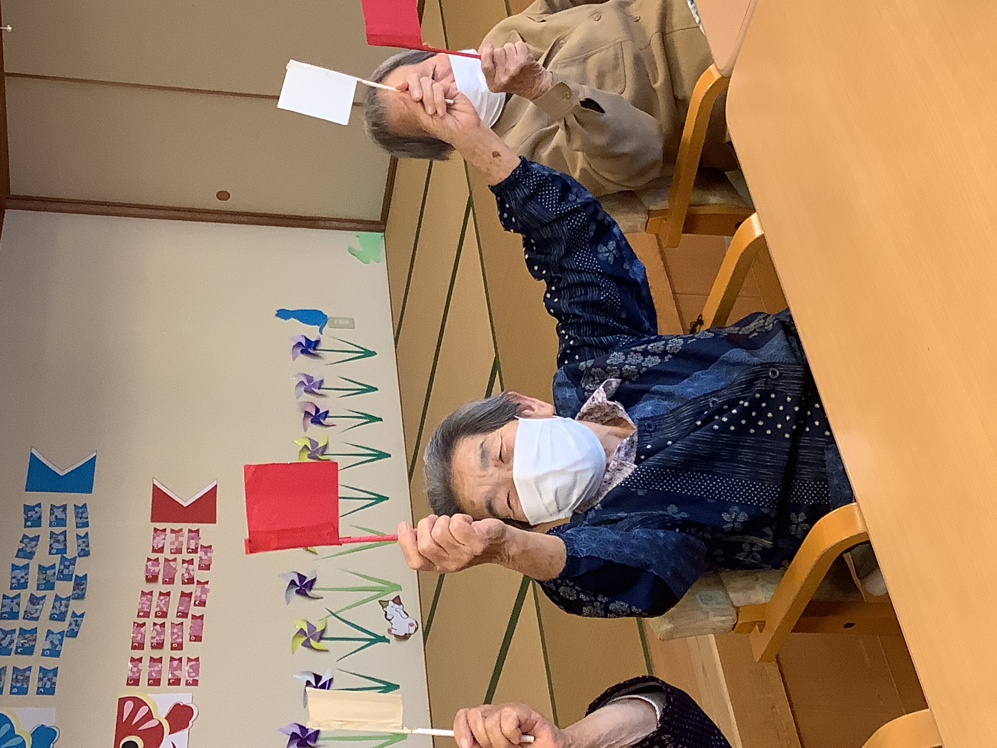 「赤あげて、白あげて」皆様、旗上げゲームで大盛り上がり(^^)/ 頭も手も使ったレクリエーションは笑顔も増えますね♪