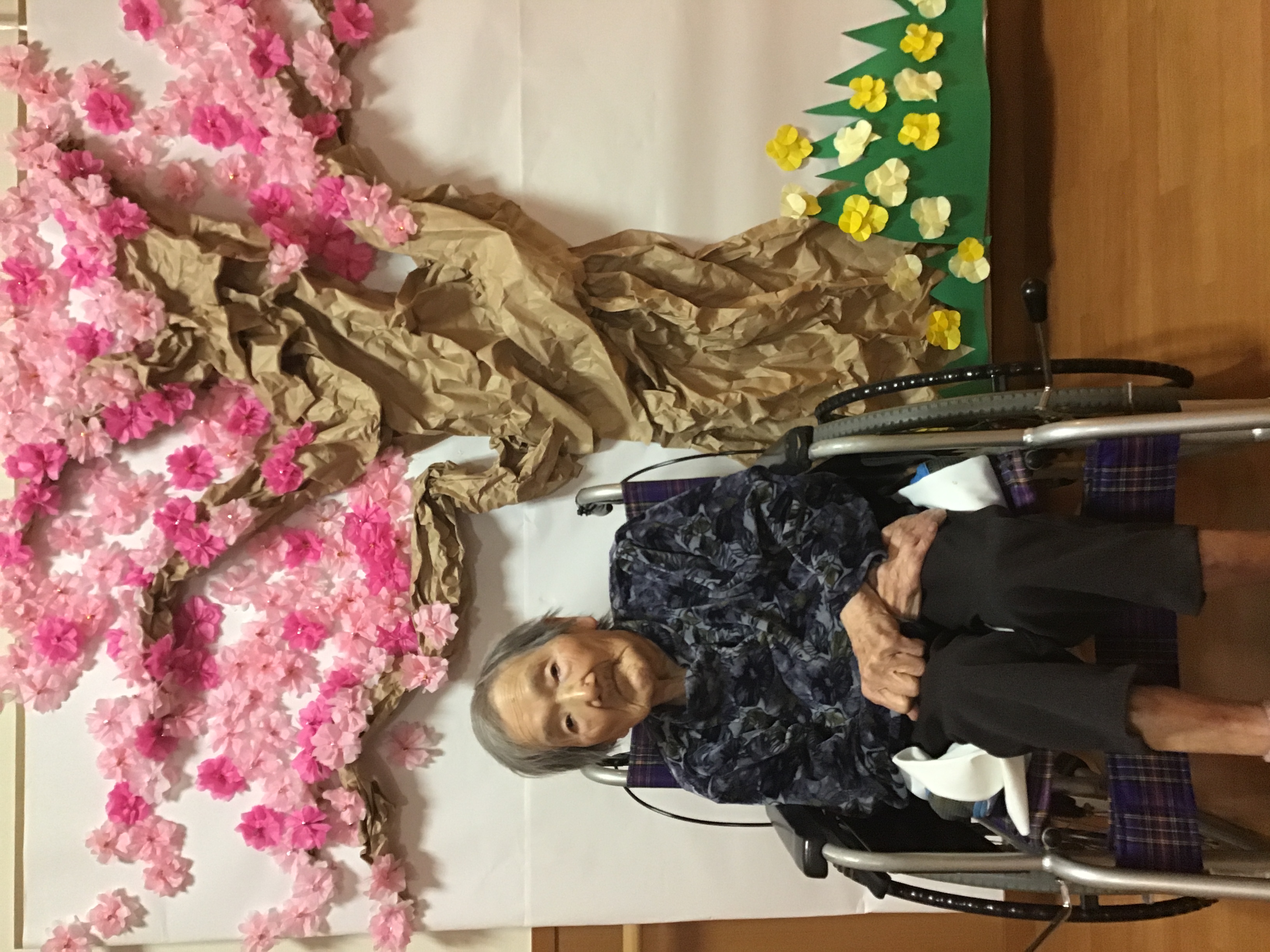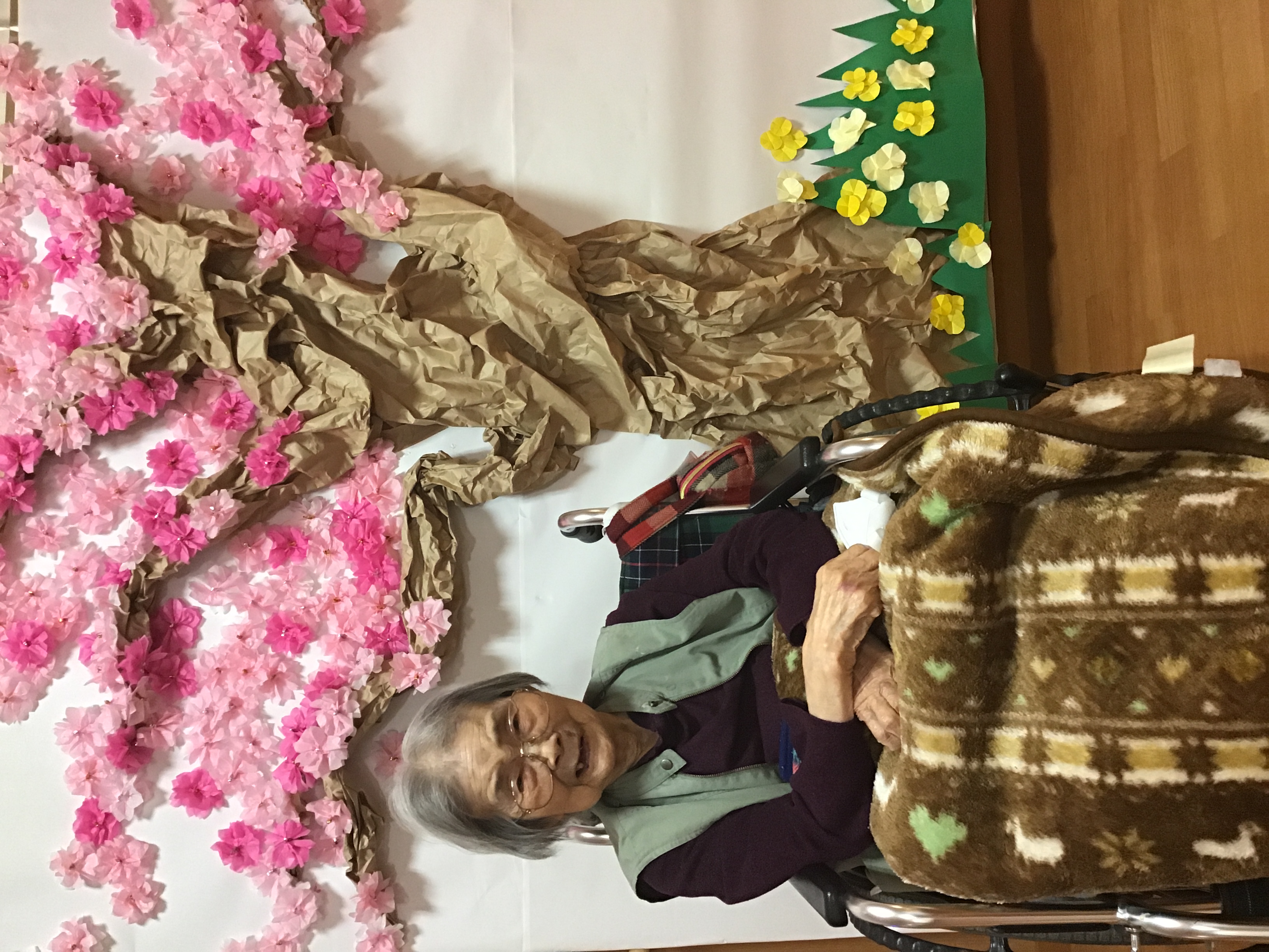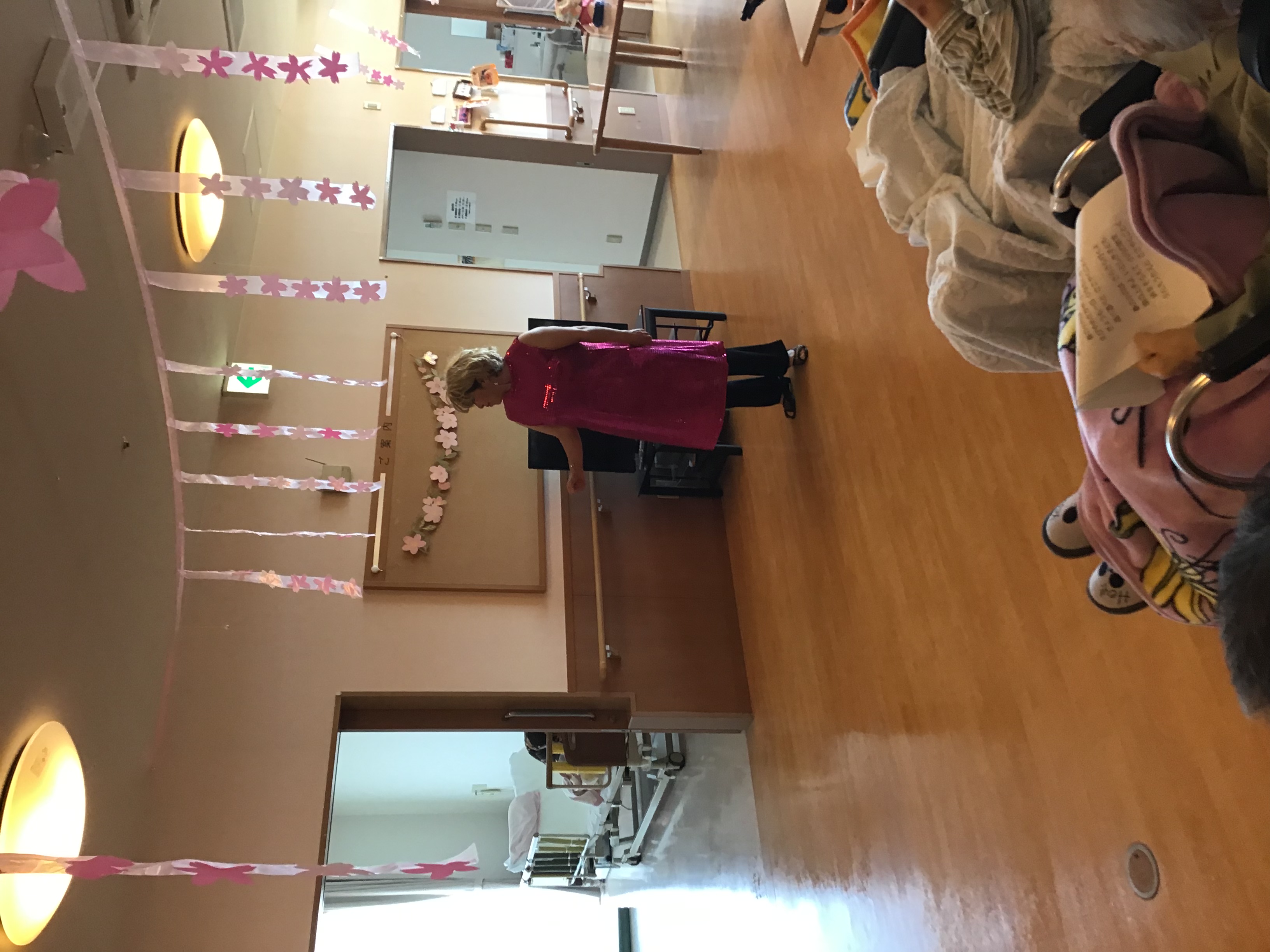お花見に外出できないので、室内花見を実施しました。利用者様に楽しんで頂く為に職員の余興を用意しました。皆さんととても喜ばれていました。