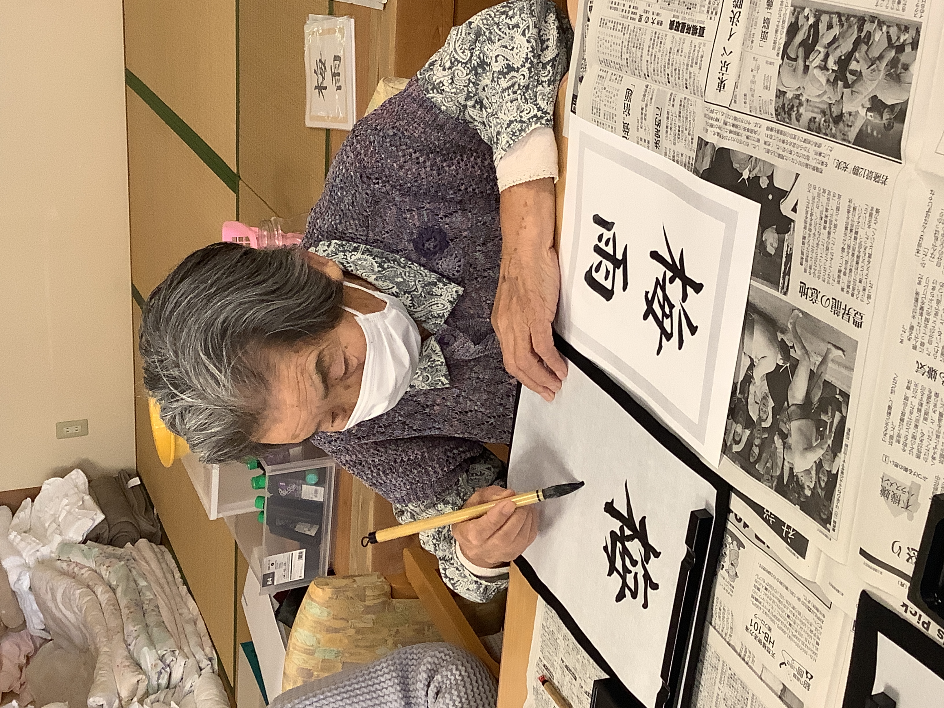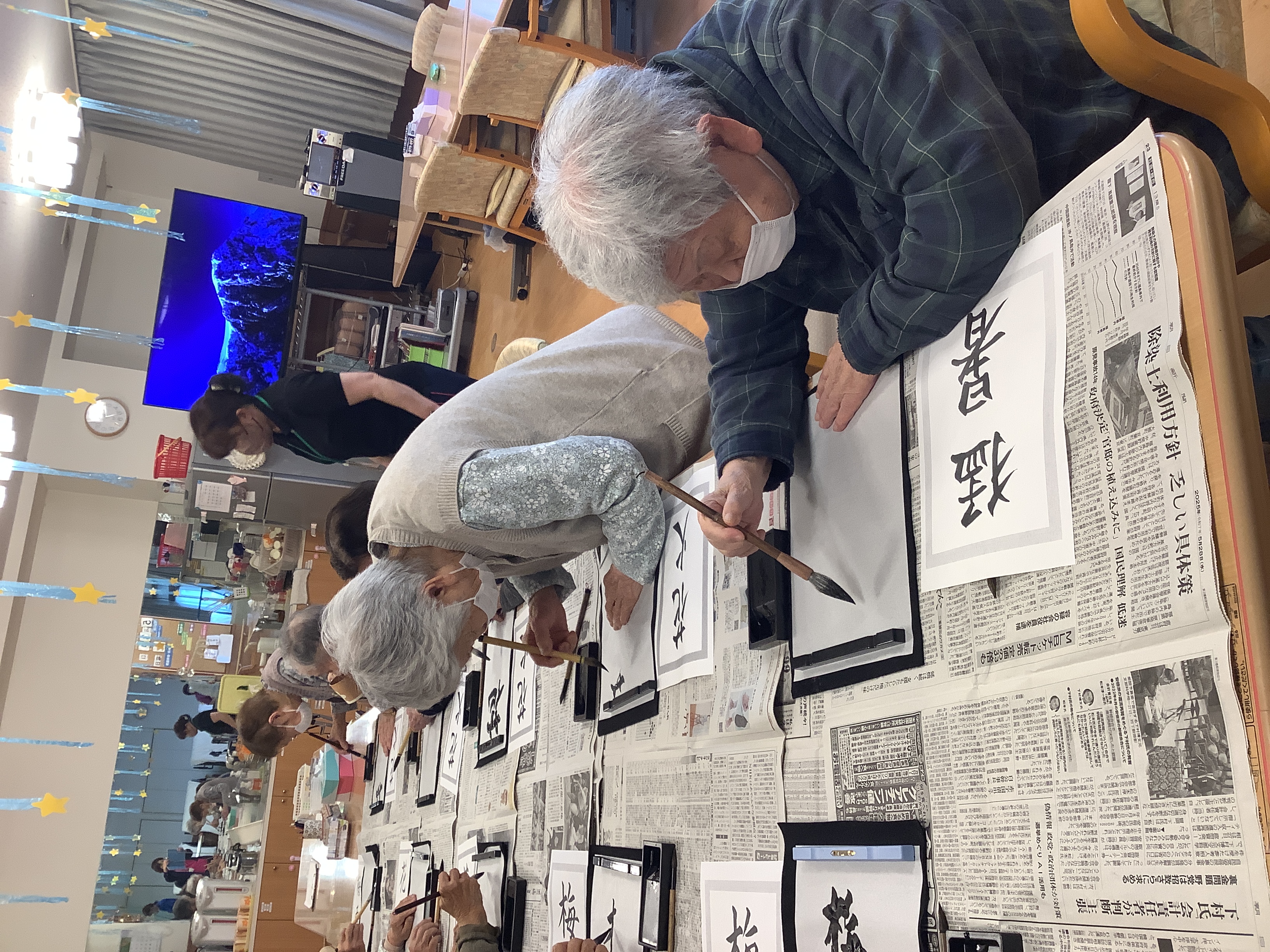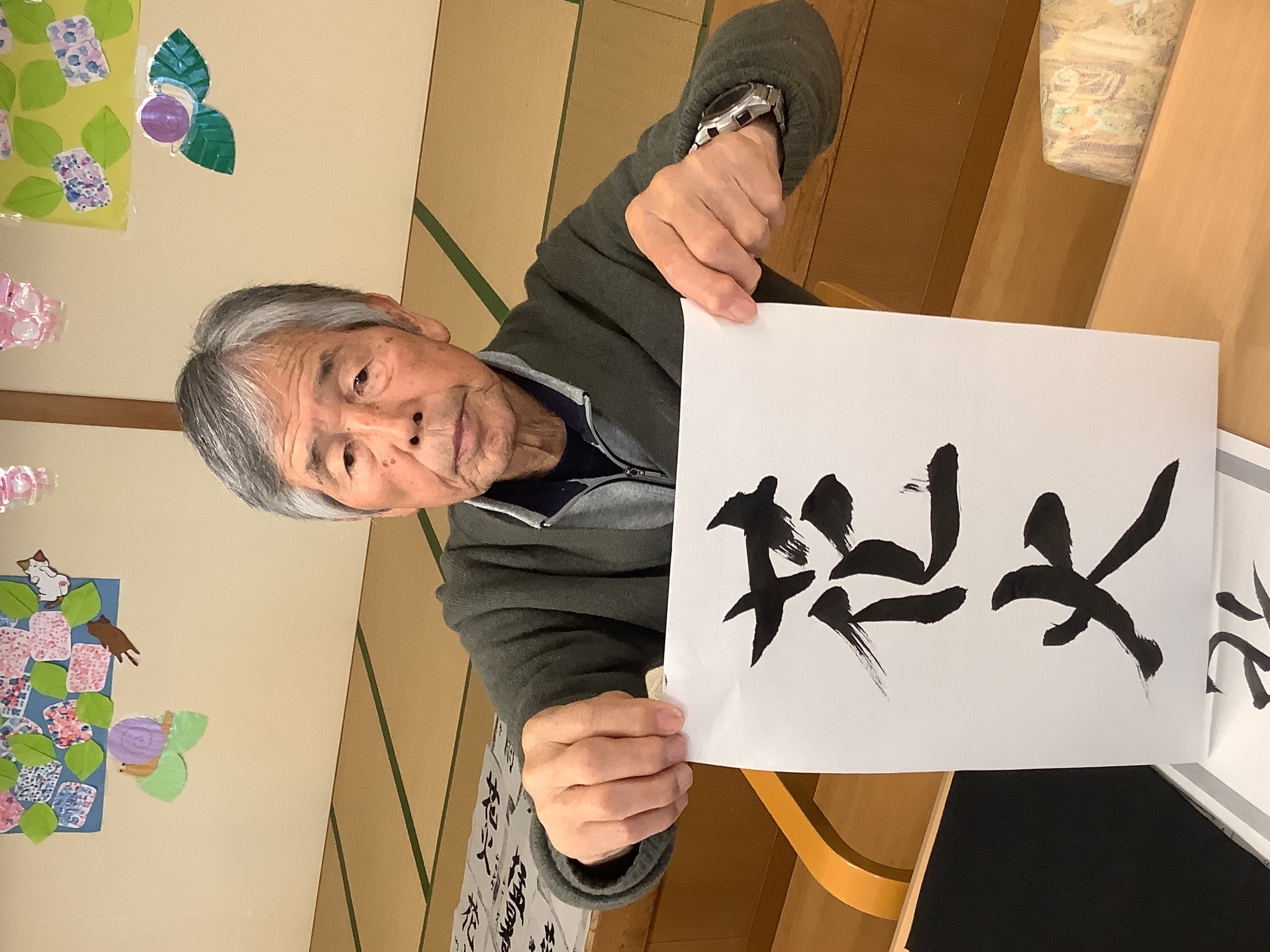 書道は利用者様からも人気のレクです。皆さんに書いて頂いた作品はデイサービス入り口に飾らせていただいていますヾ(*´∀`*)ノ