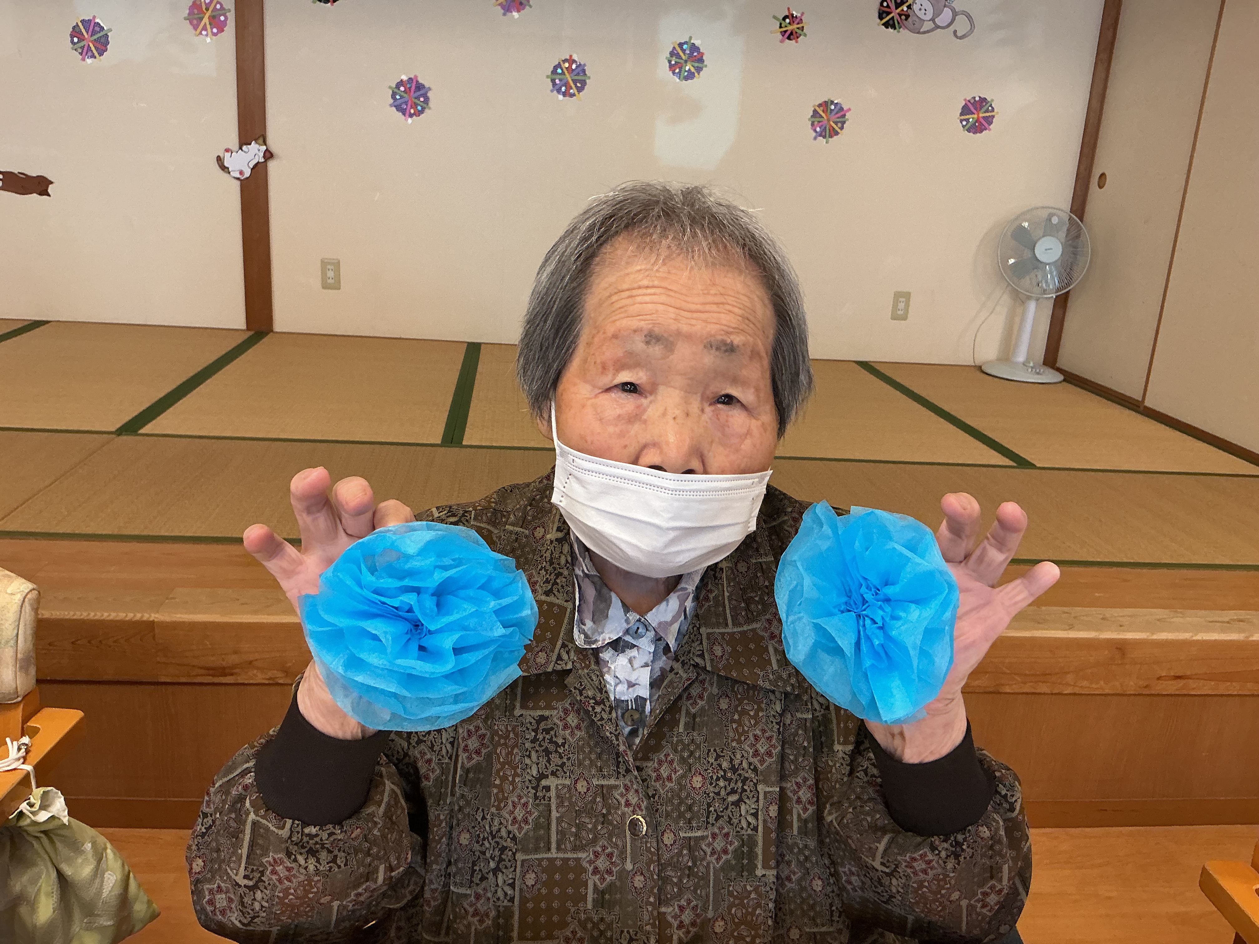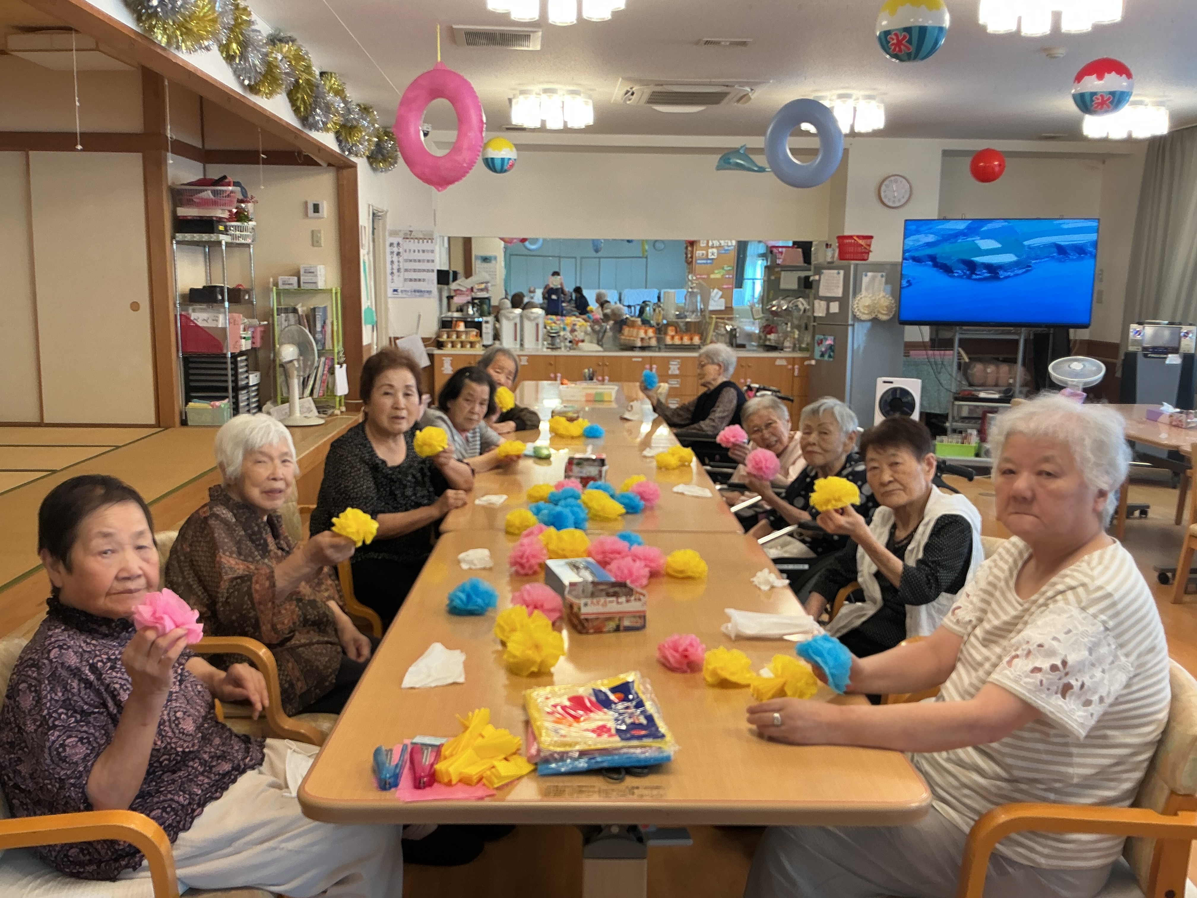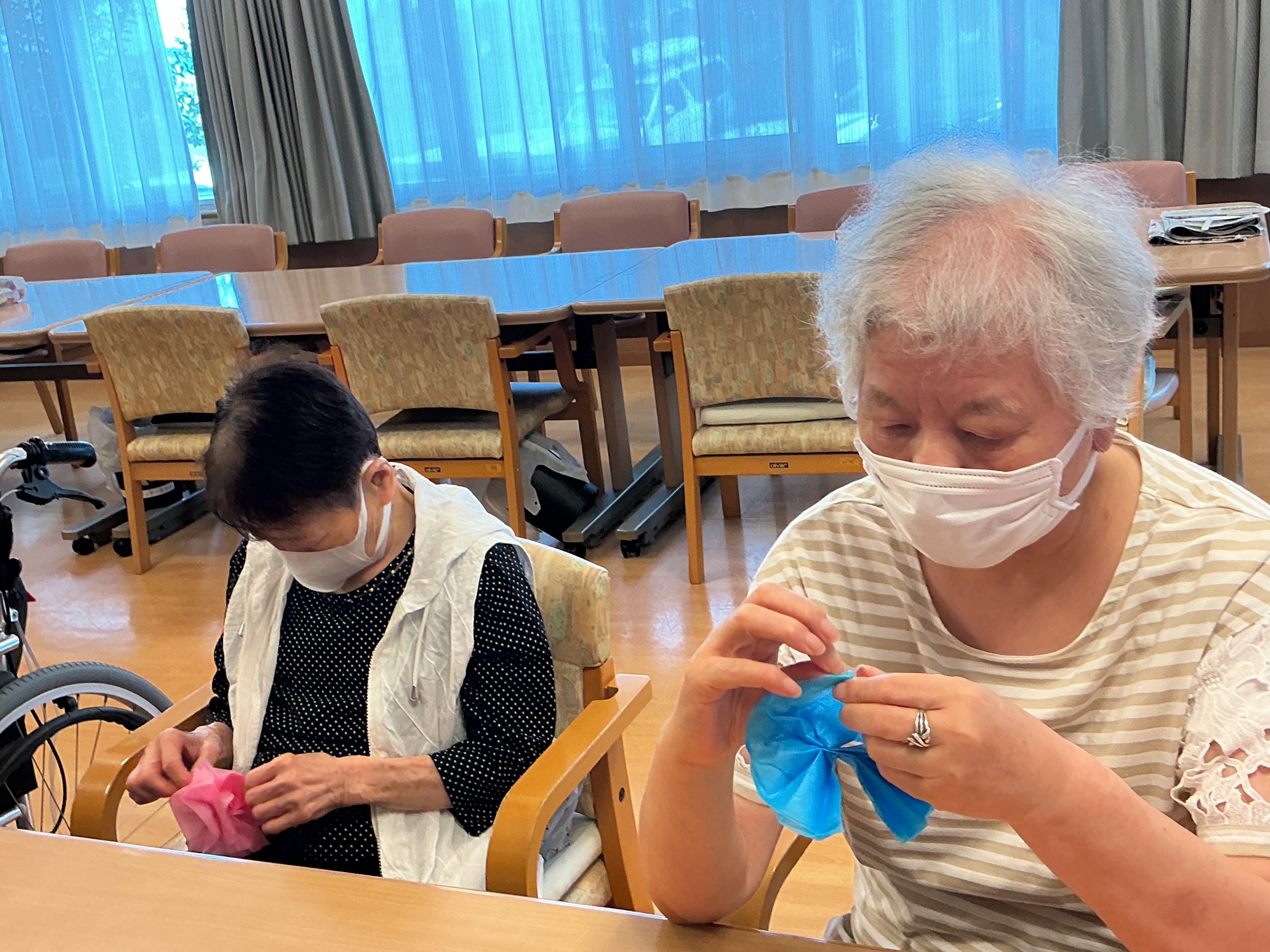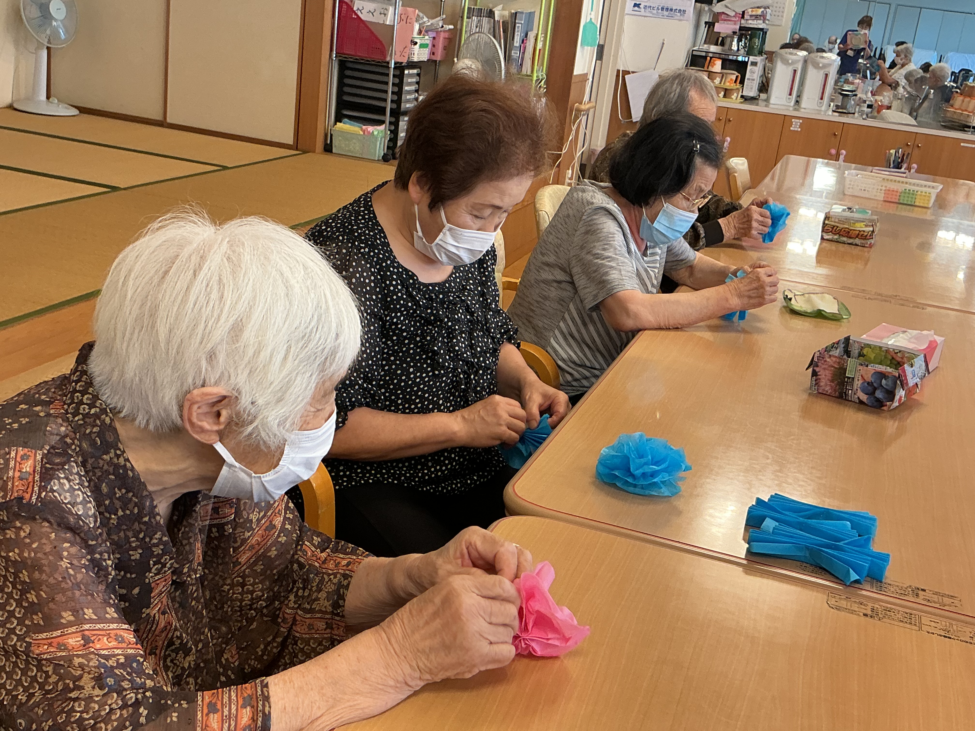 8月のイベントに向けてお花作りを行いました('ω')ノ 皆様「婦人会を思い出すよ」と懐かしいお話をされながら作って下さいました♪