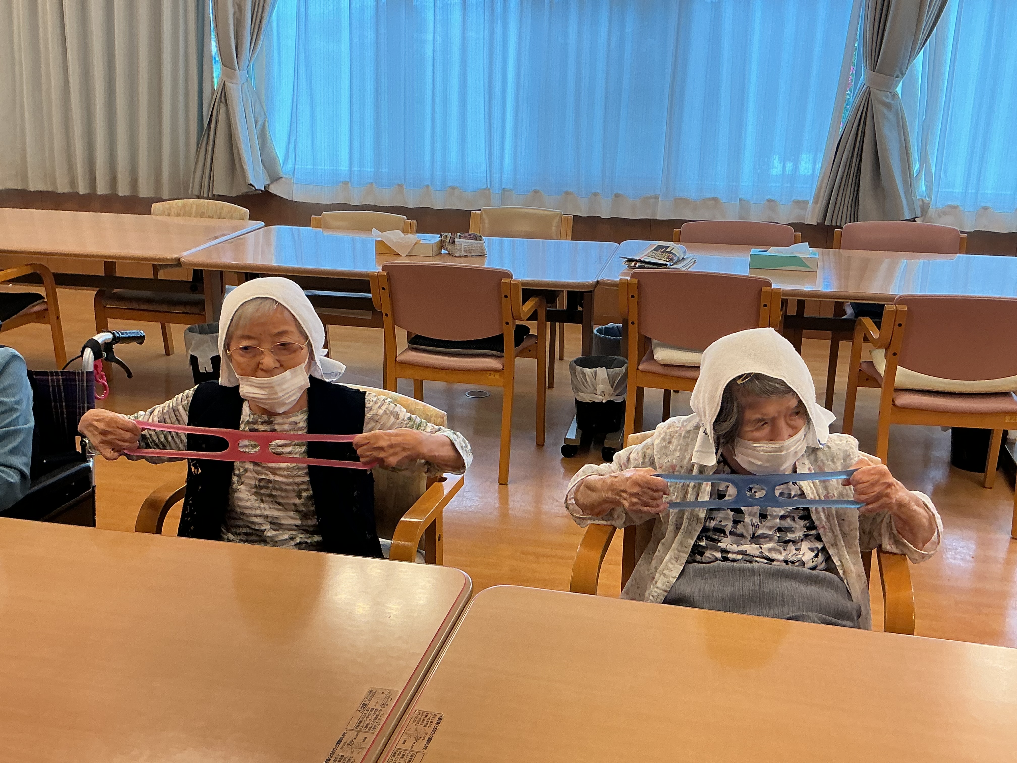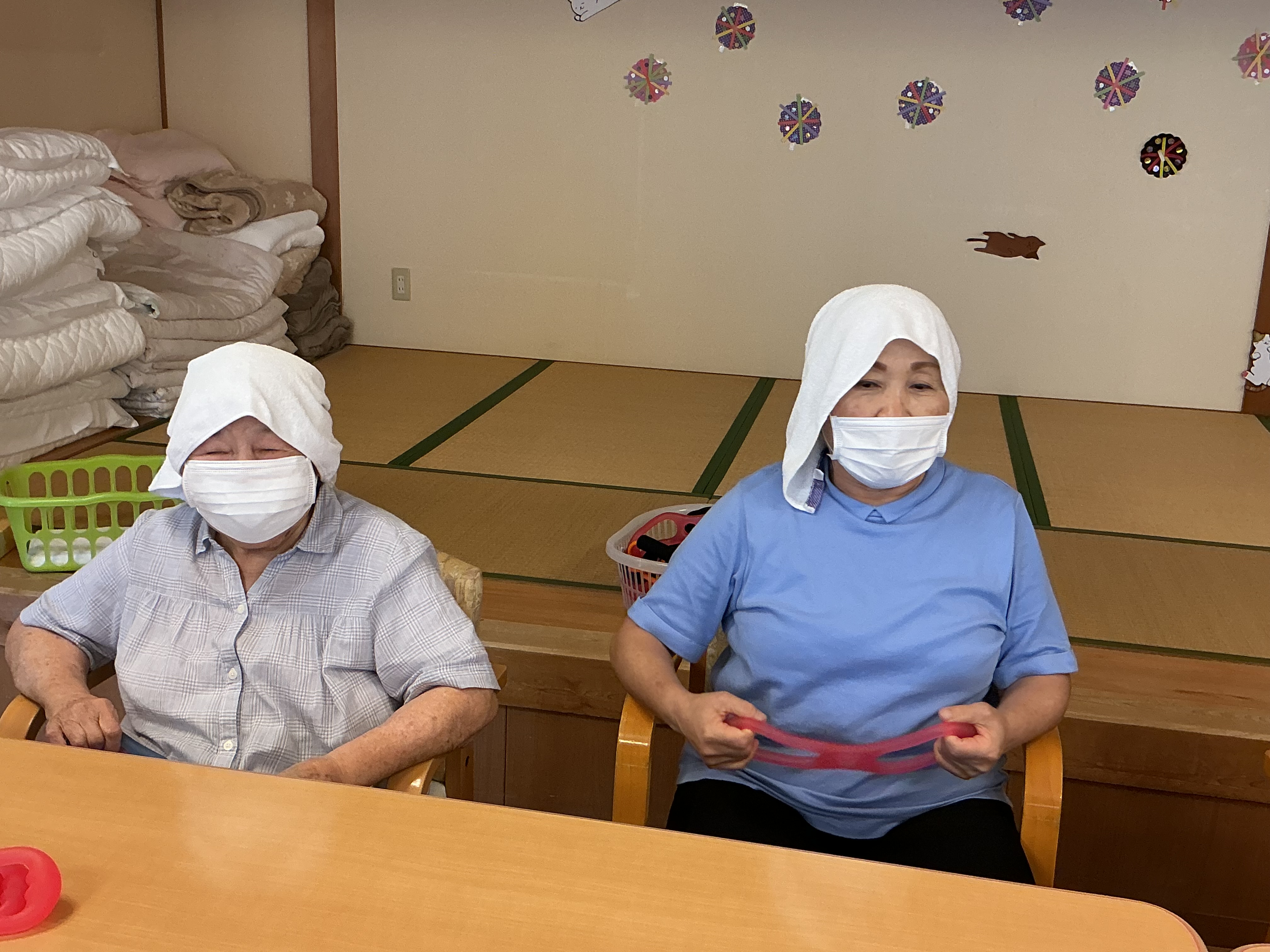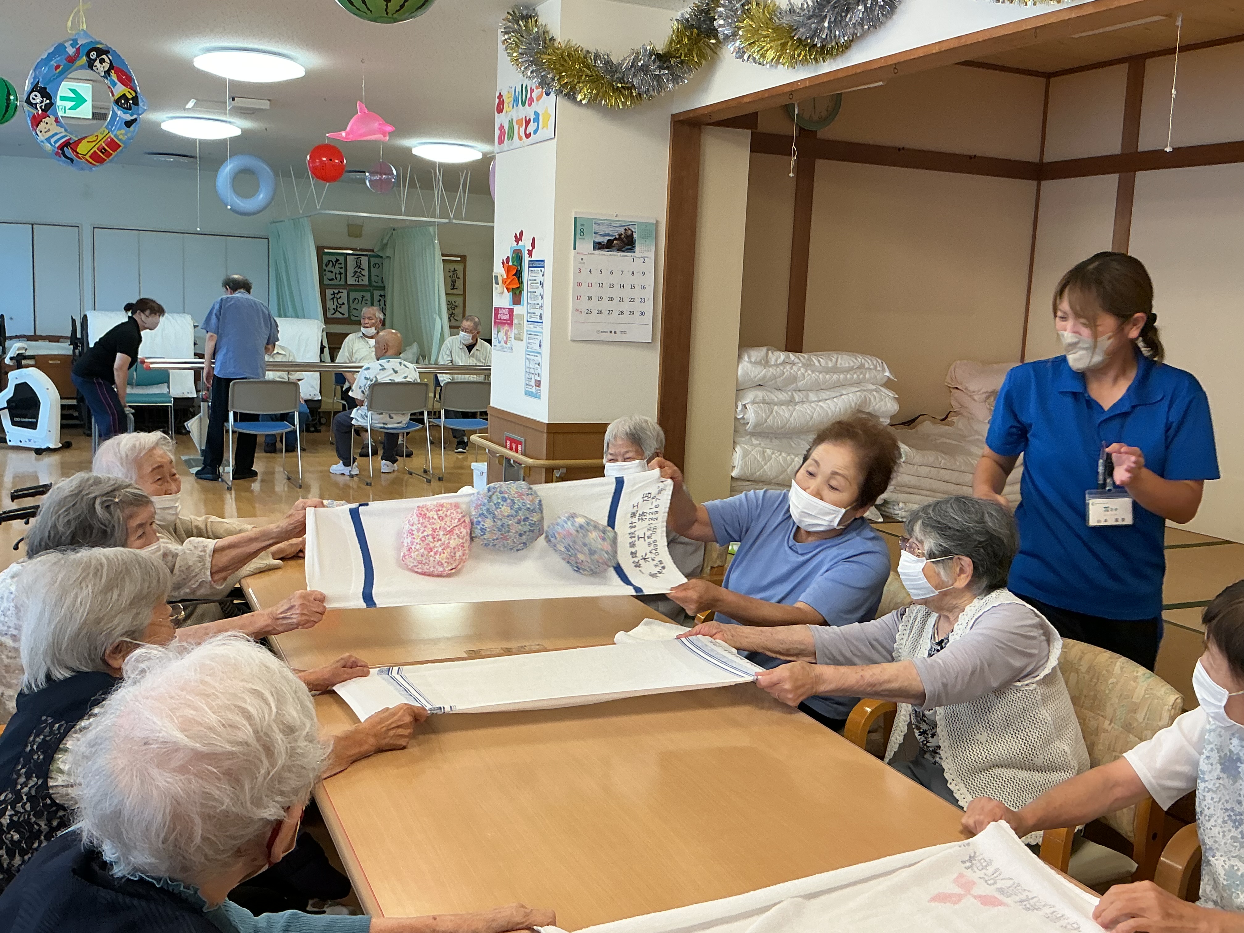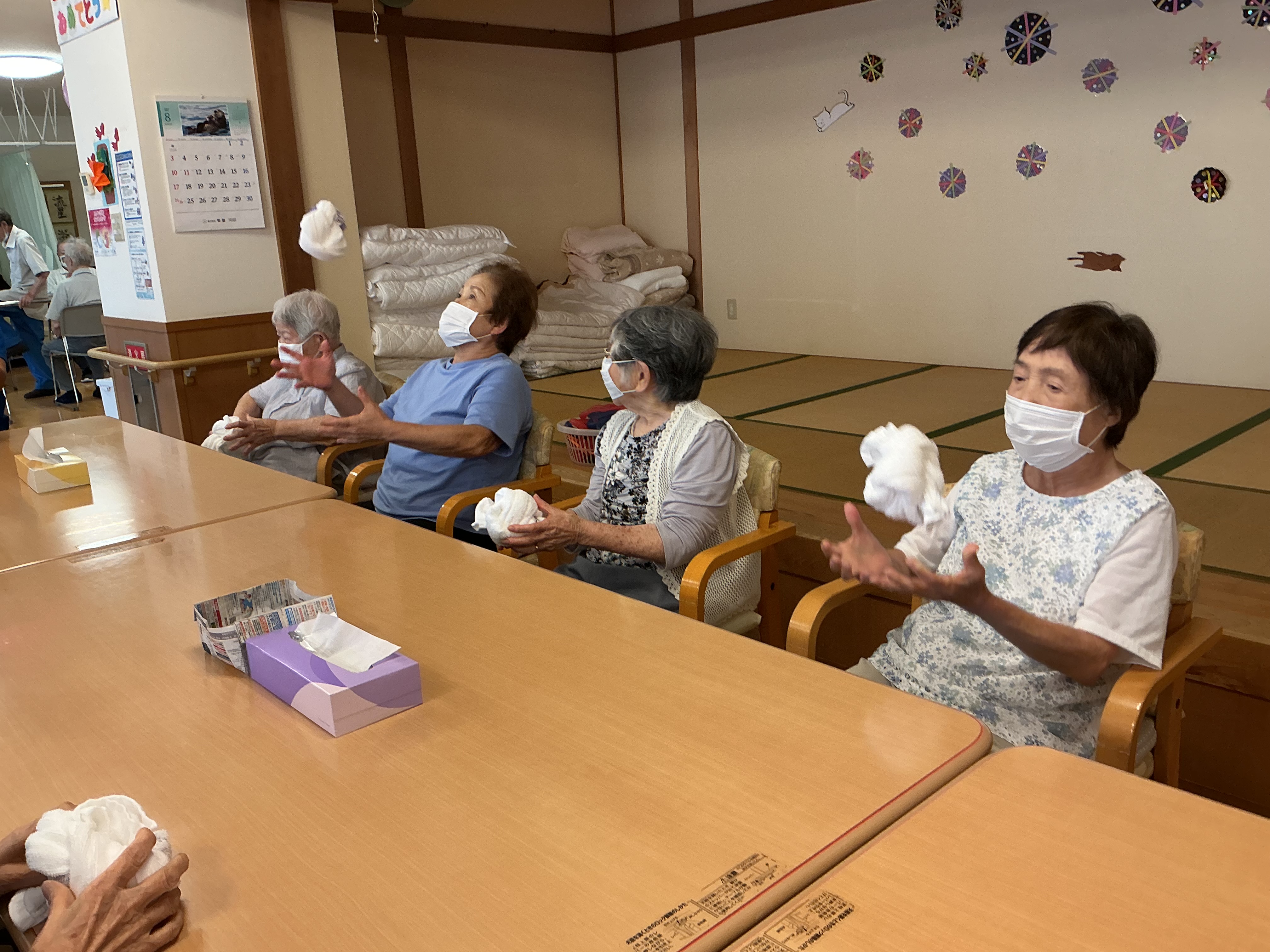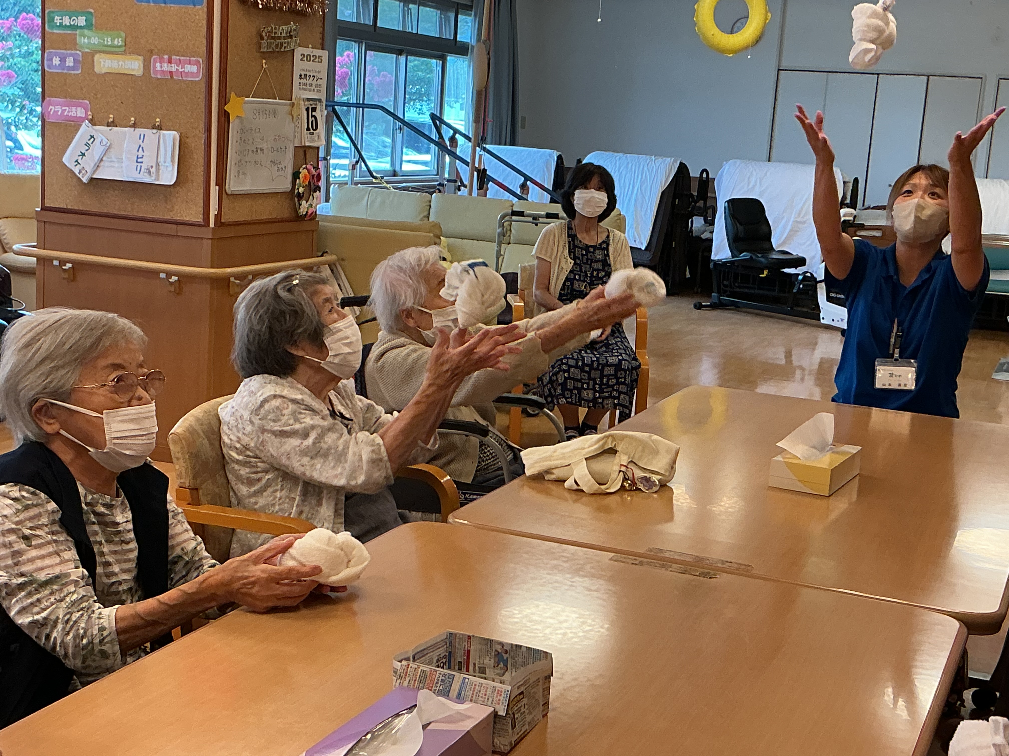 タオルを使って様々なレクを行いました(^^)/ じゃんけんでタオルを引っ張りっこしたり、頭にかぶったり、ボールにして投げたりと様々な活用が出来ました♪
