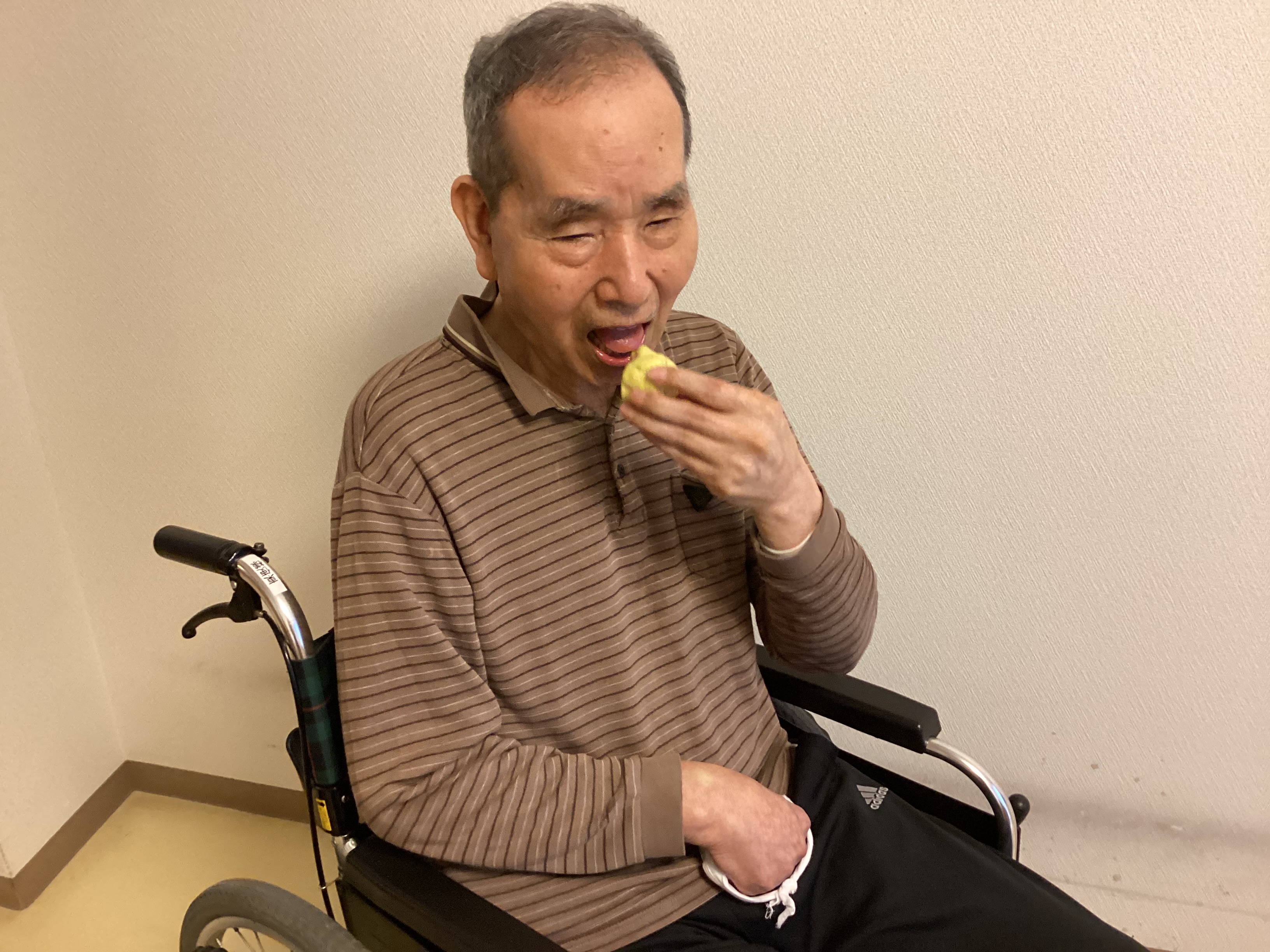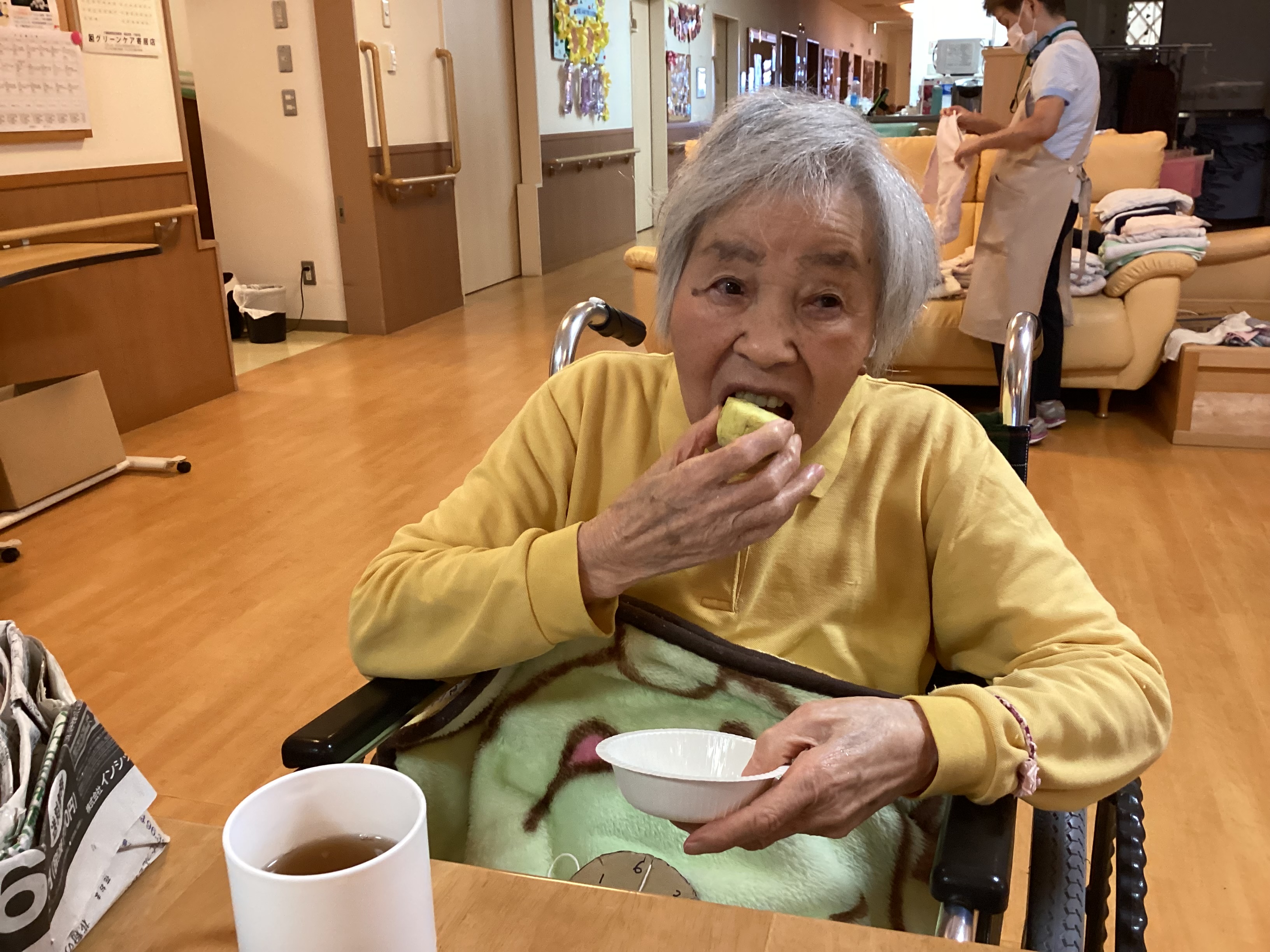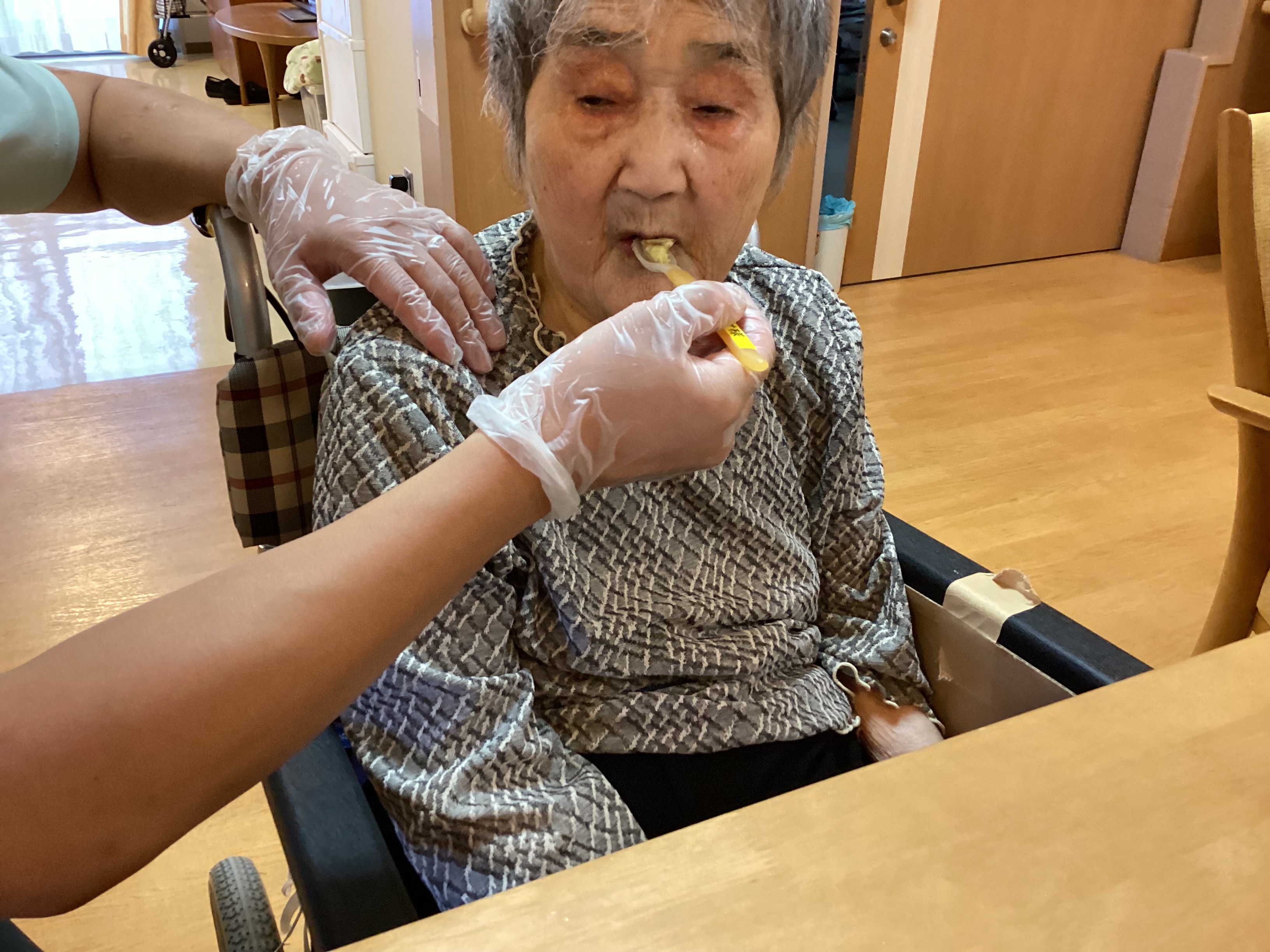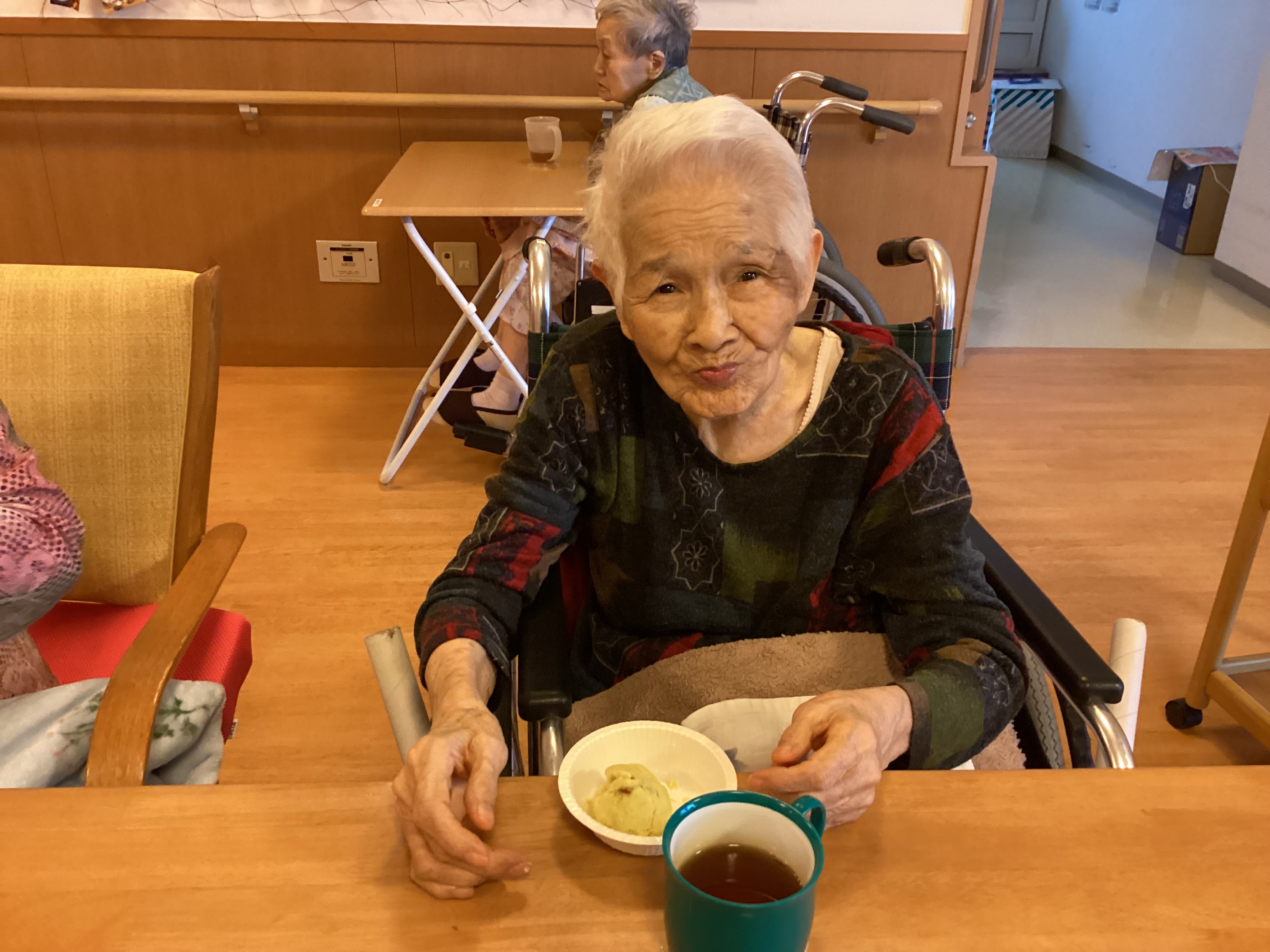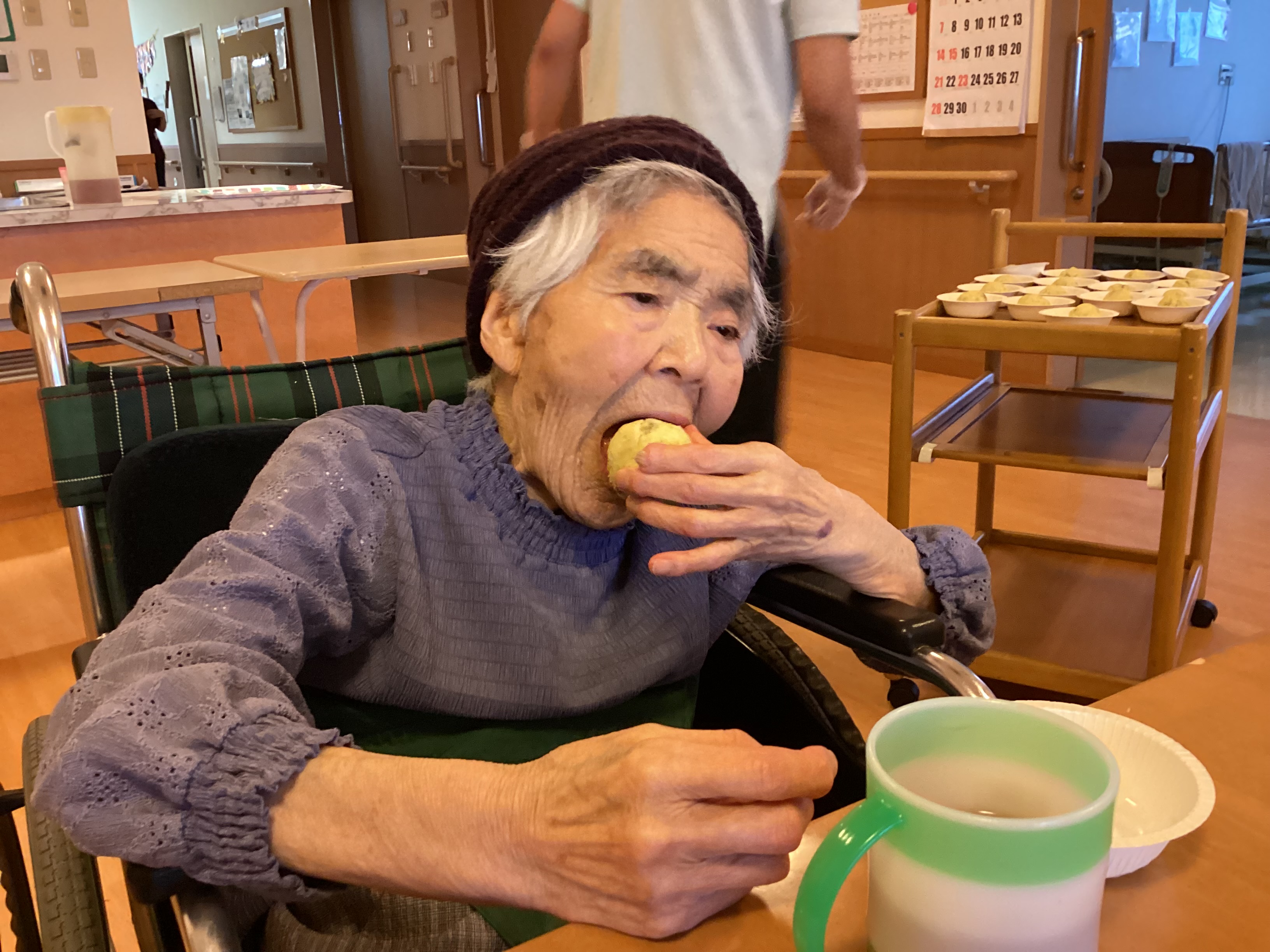 利用者の皆様「サツマイモかい!」と笑顔で「甘くて美味しいよ♡」と、あっ!という間にペロッと食べていました。