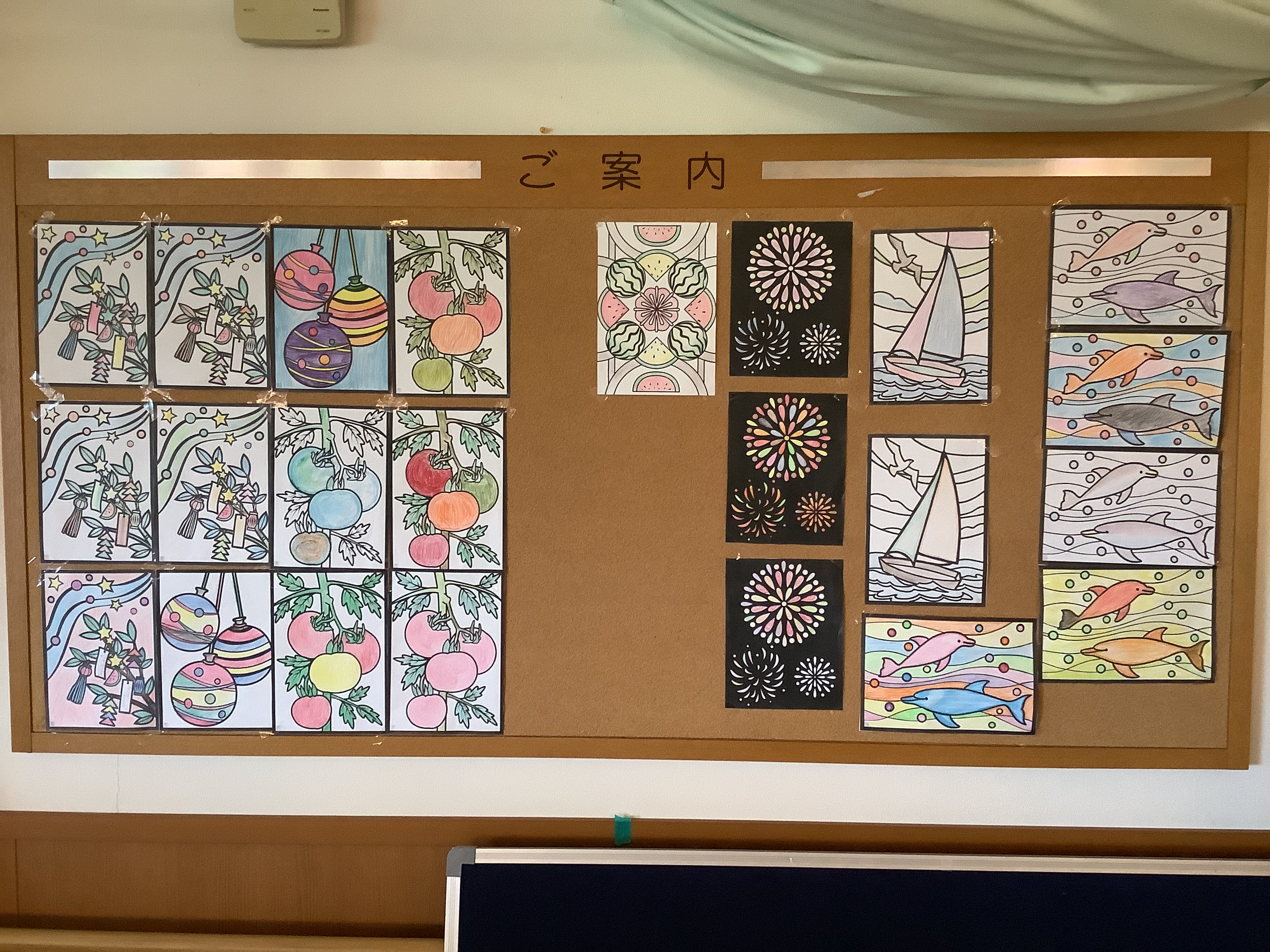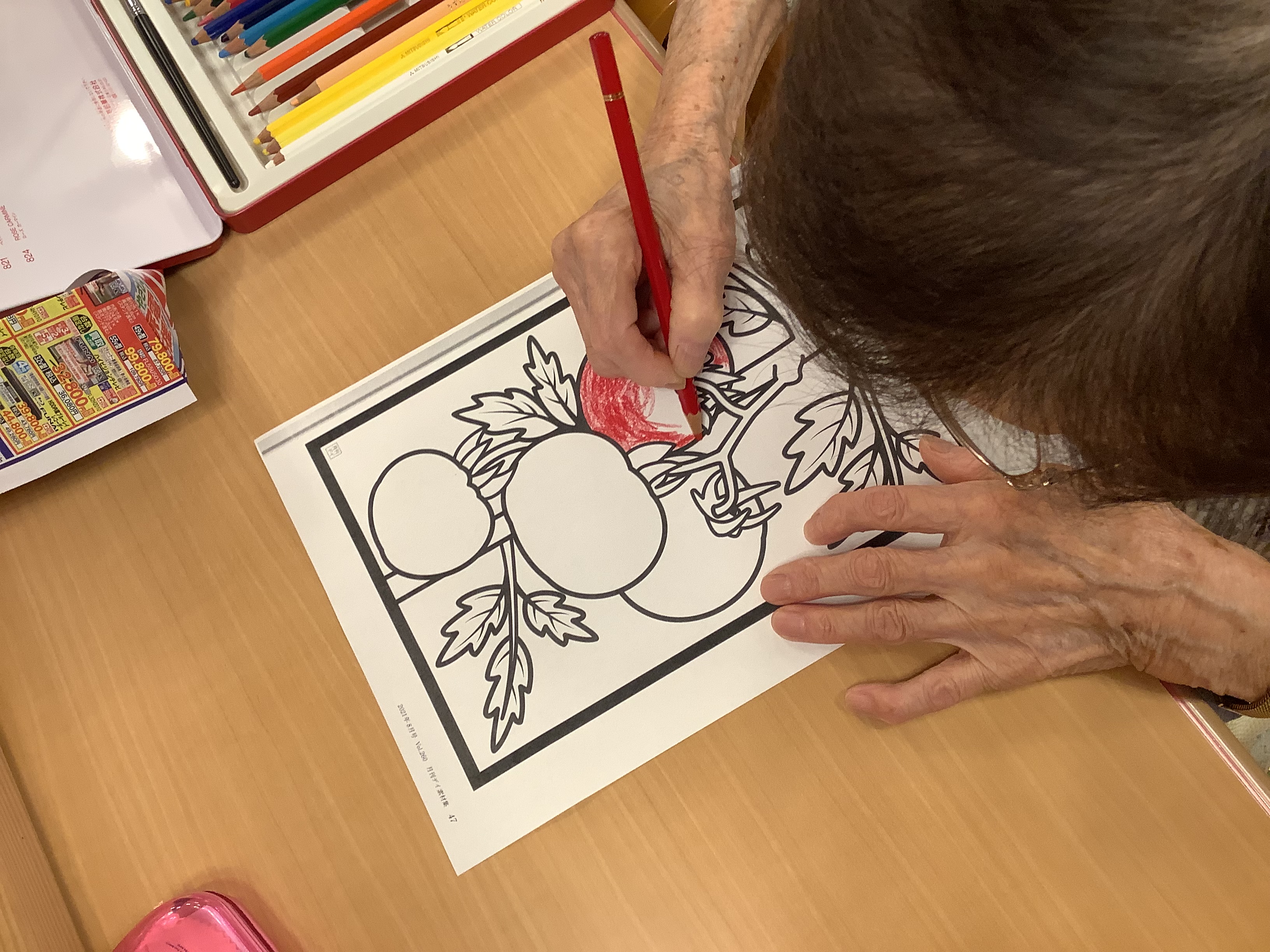 夏らしい絵柄の塗り絵を楽しまれています(^^♪ 花火やヨーヨー、トマトなど好きな絵を選び真剣に塗って頂きました(^^)/