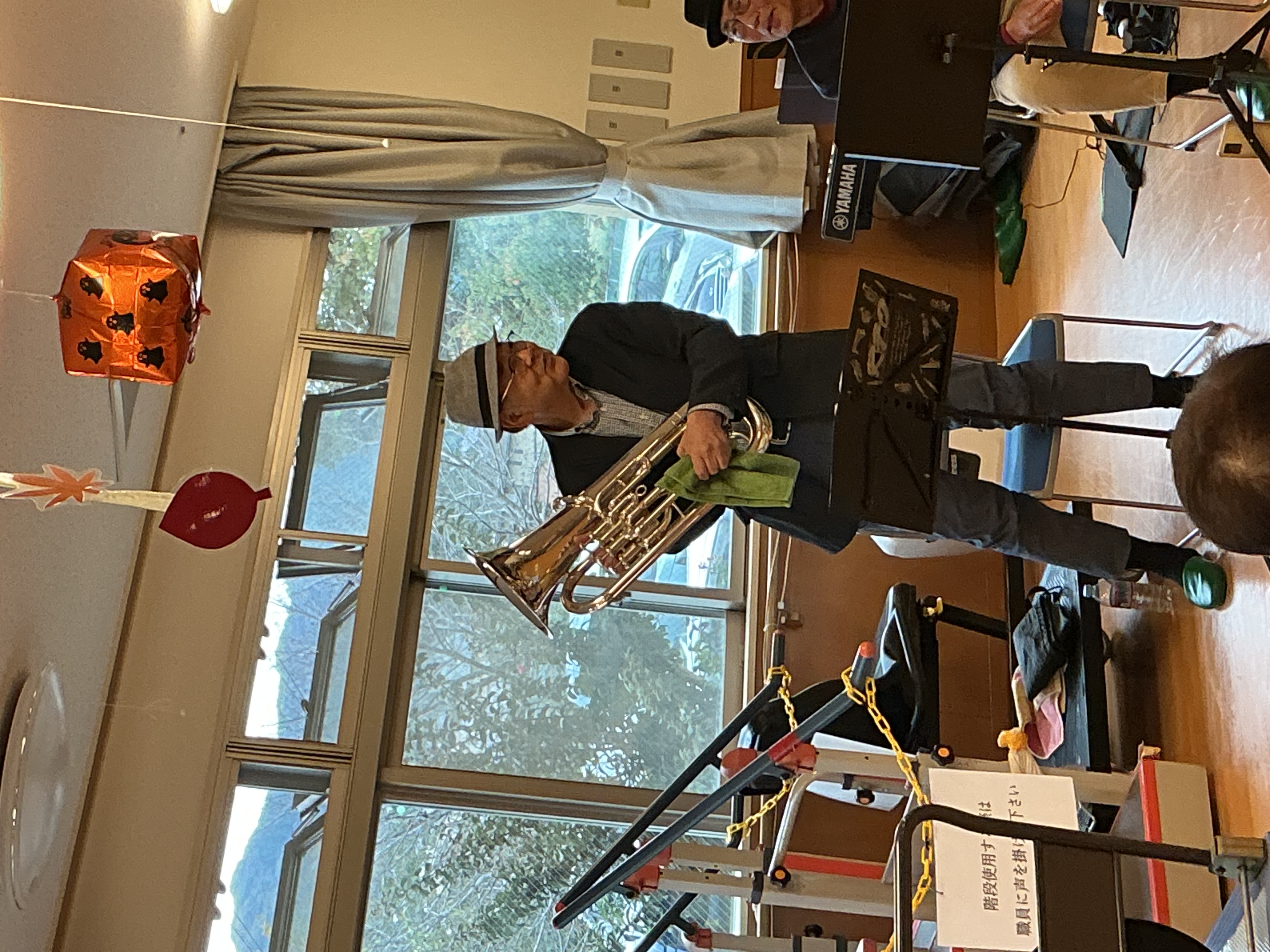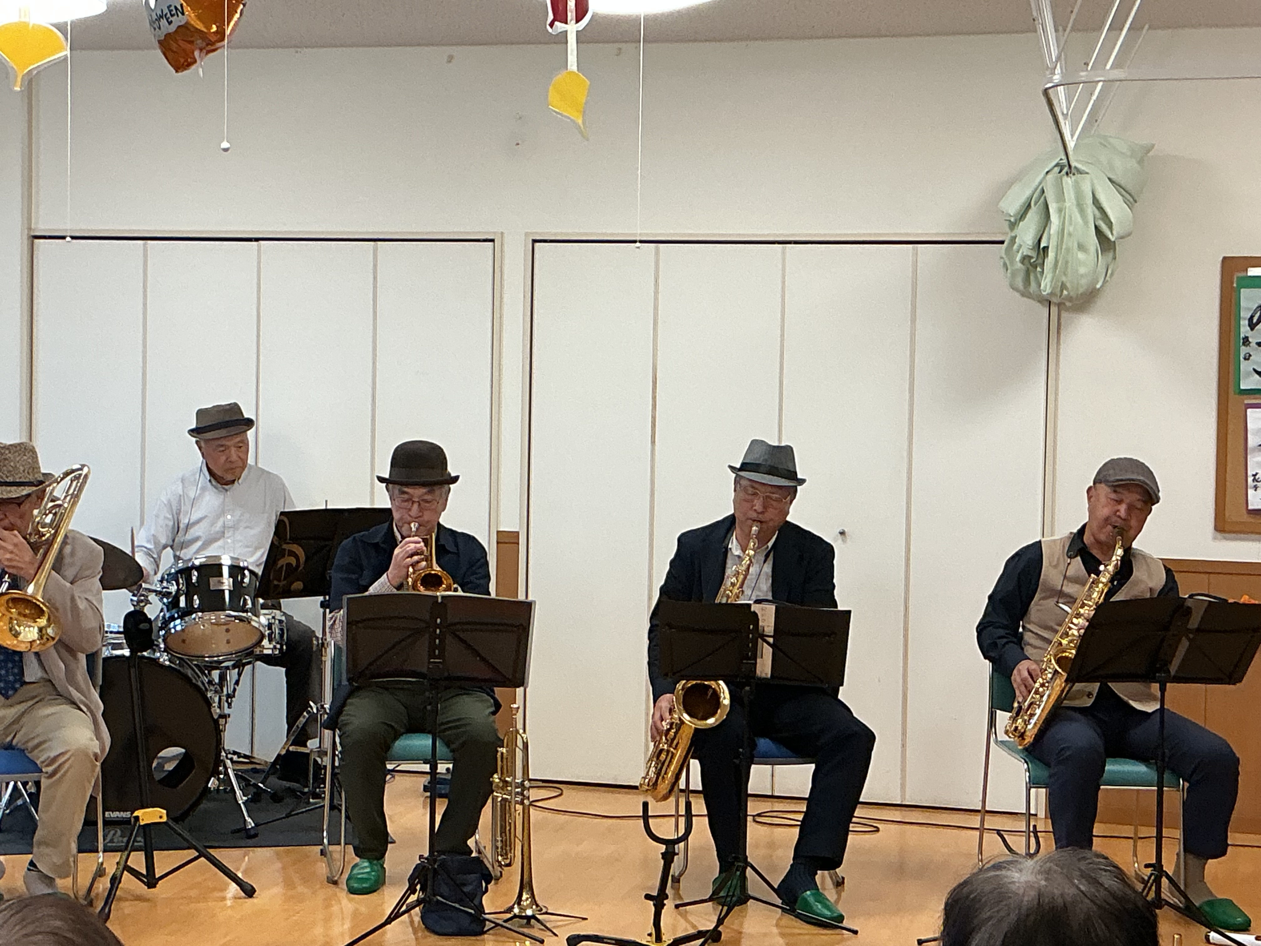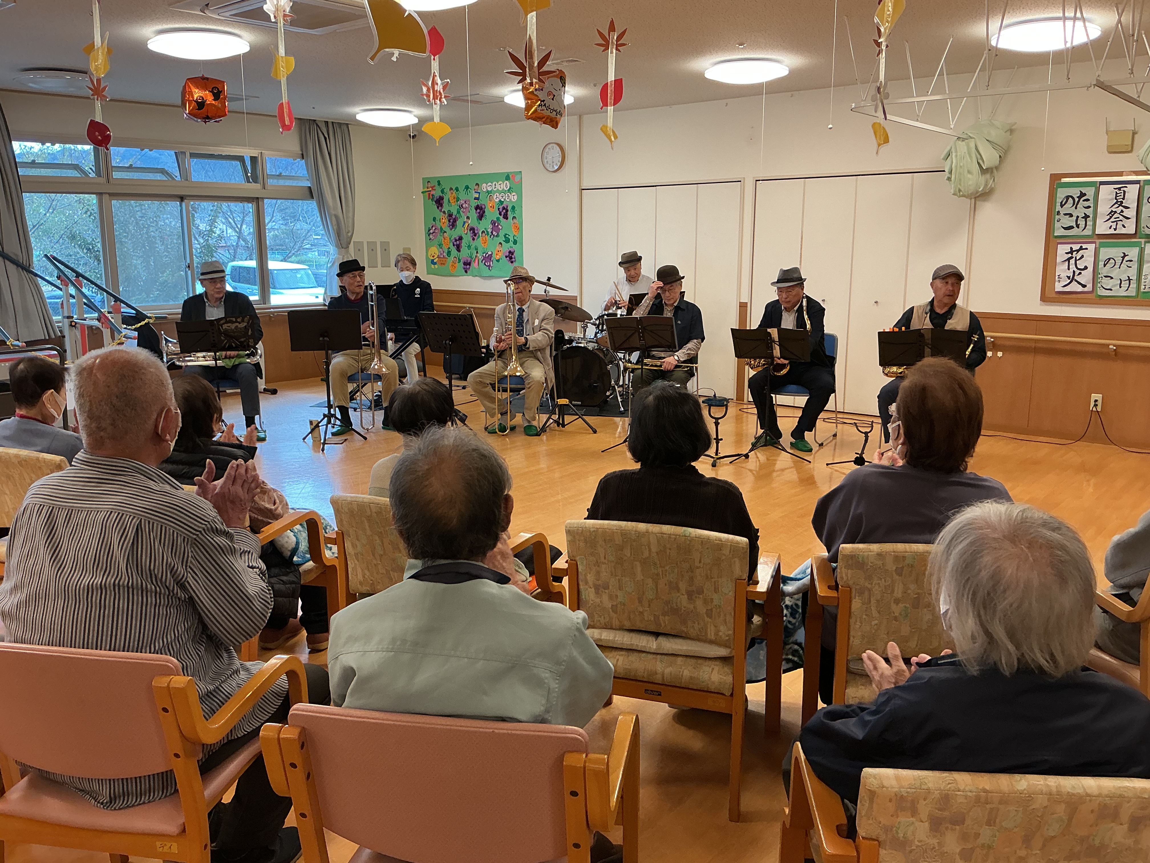 慰問にレインボーFCオーケストラの皆様が来てくださいました。サックスやドラム、キーボードで迫力ある演奏を聴かせてくださいました(^^)/利用者様の皆様もとっても喜んでくださいました(^^)/ レインボーFCオーケストラの皆さま、お忙しい中ありがとうございました。