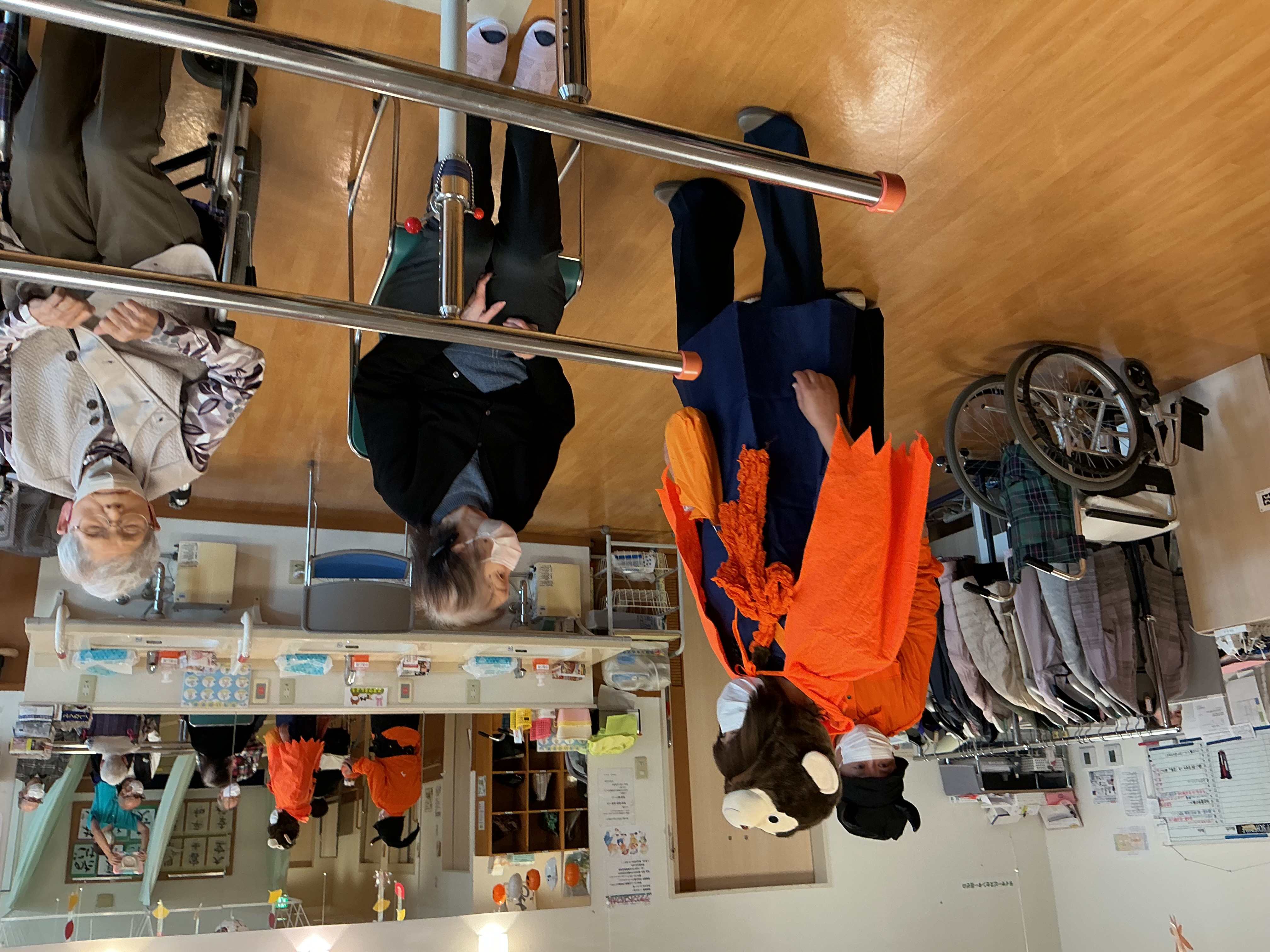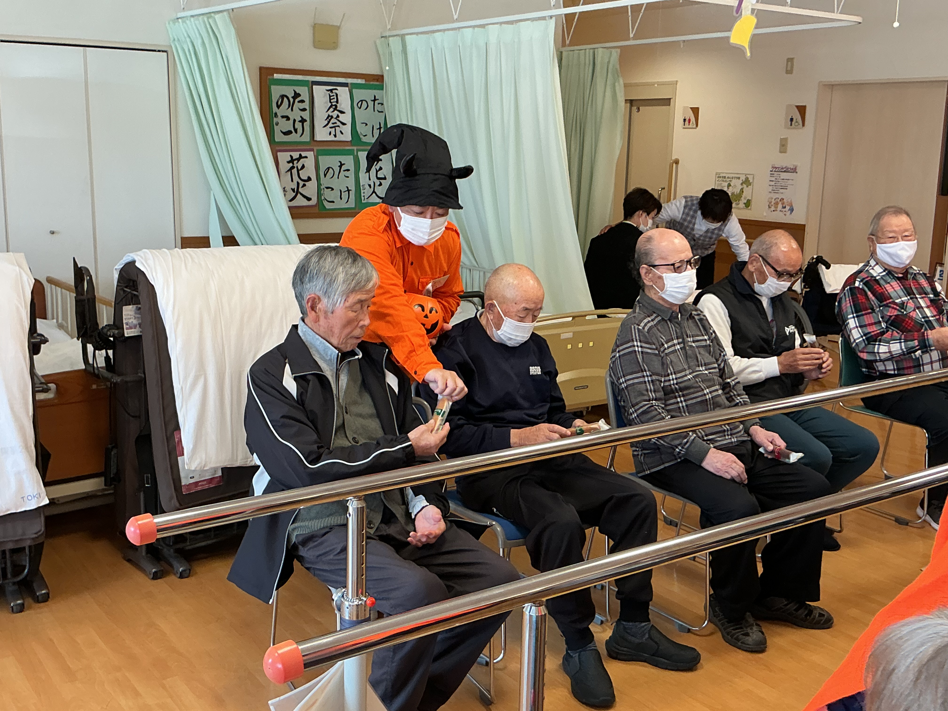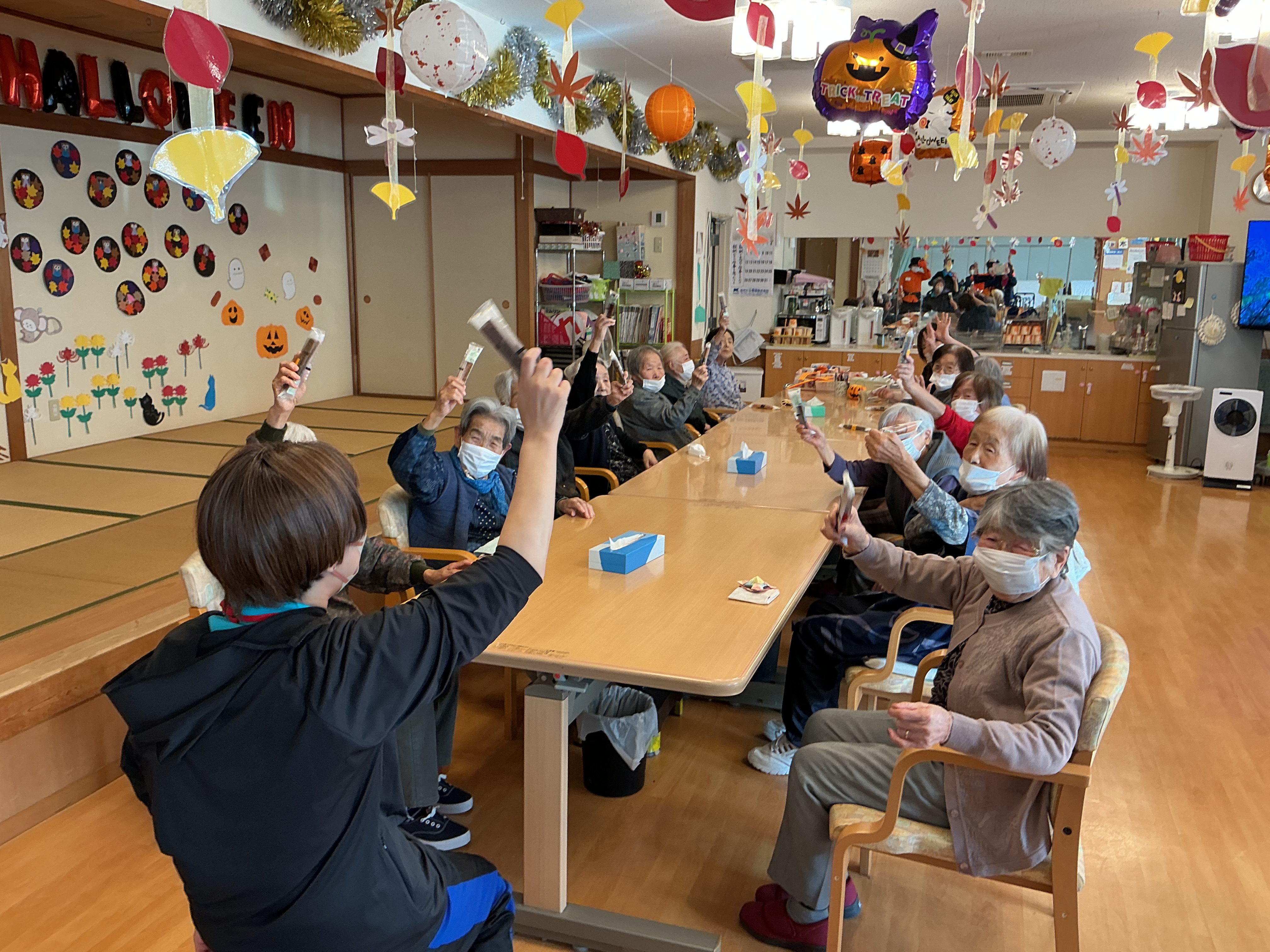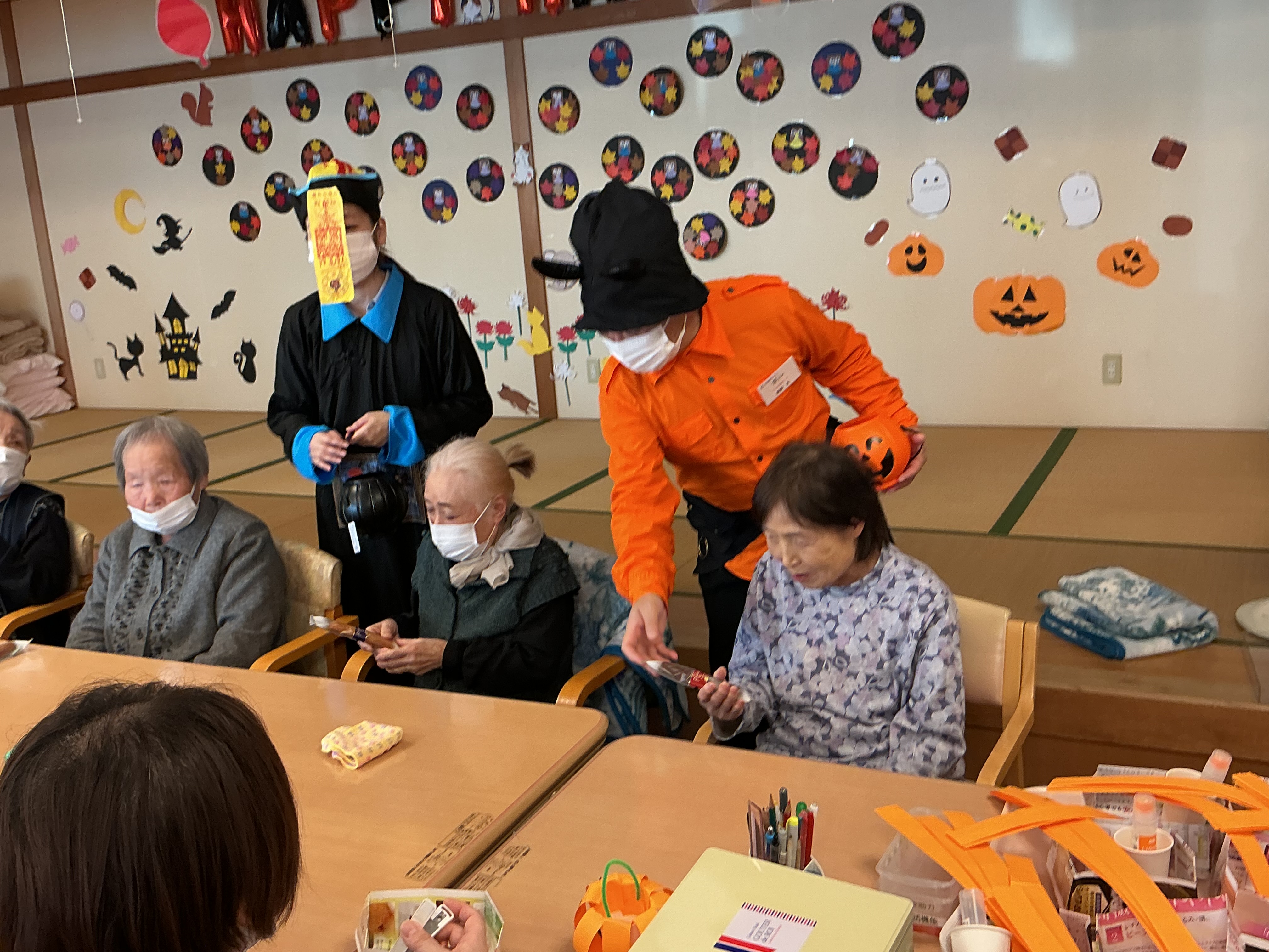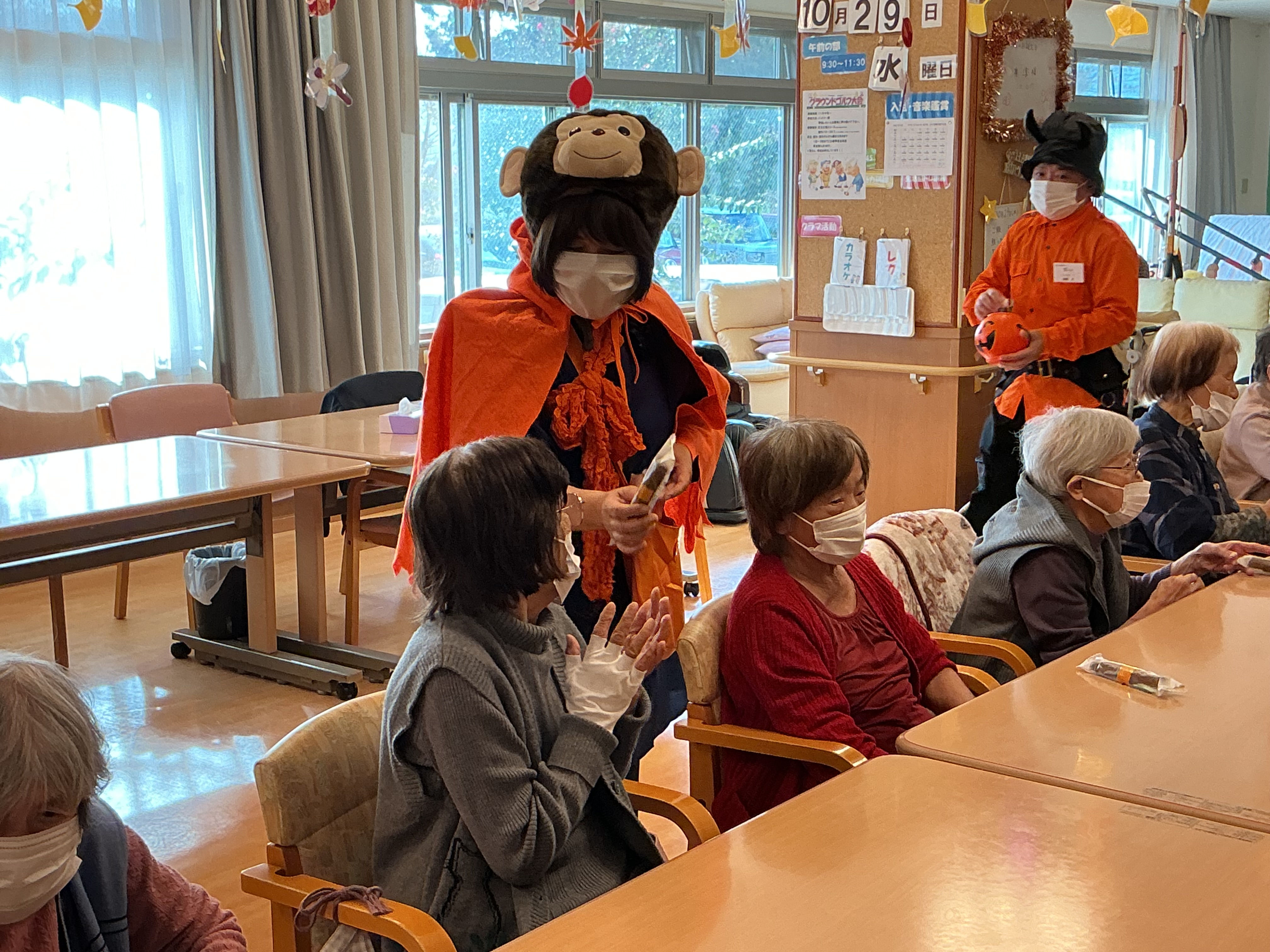 午後の時間、施設長と事務所メンバーの方々が仮装をしてハロウィンのお菓子を配りに来てくださいました!(^^)! 突然のサプライズに利用者様方も大喜び(*^-^*) 美味しいお菓子はおやつの時間にみんなで頂きました☆彡
