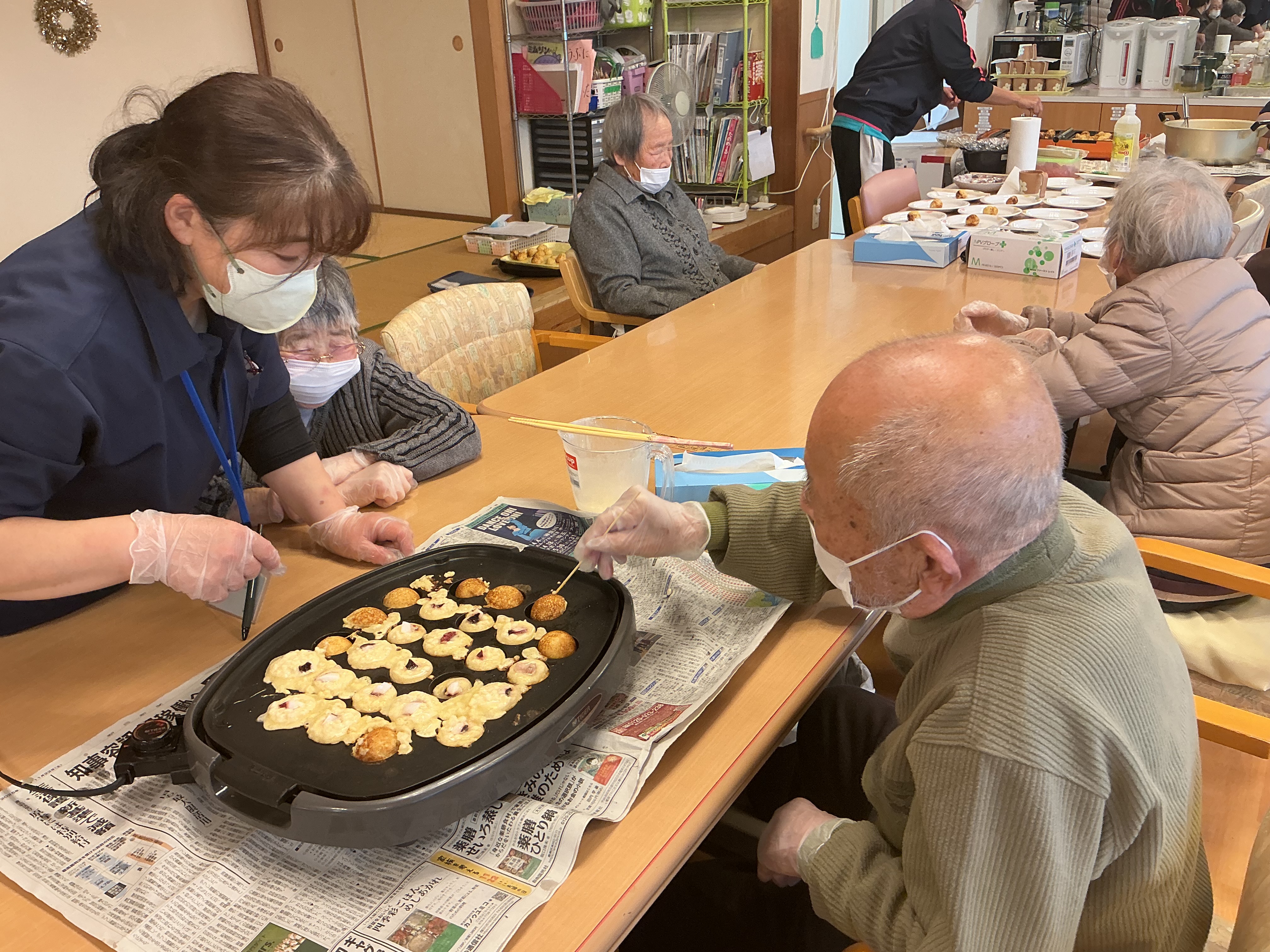 おやつレクでたこ焼きを作りました(^^)/ くるくるっと回しながら上手に焼いて頂けました♪