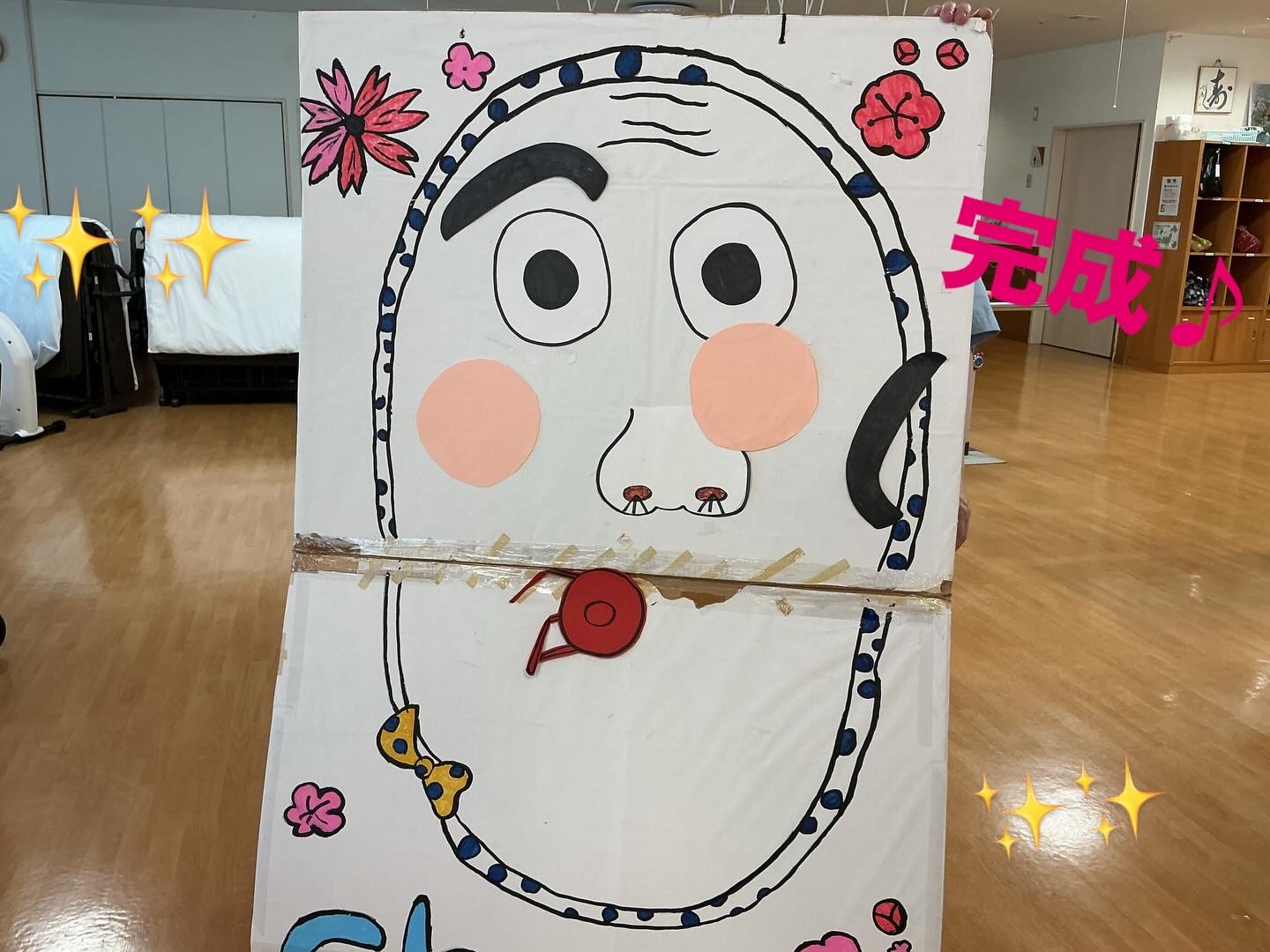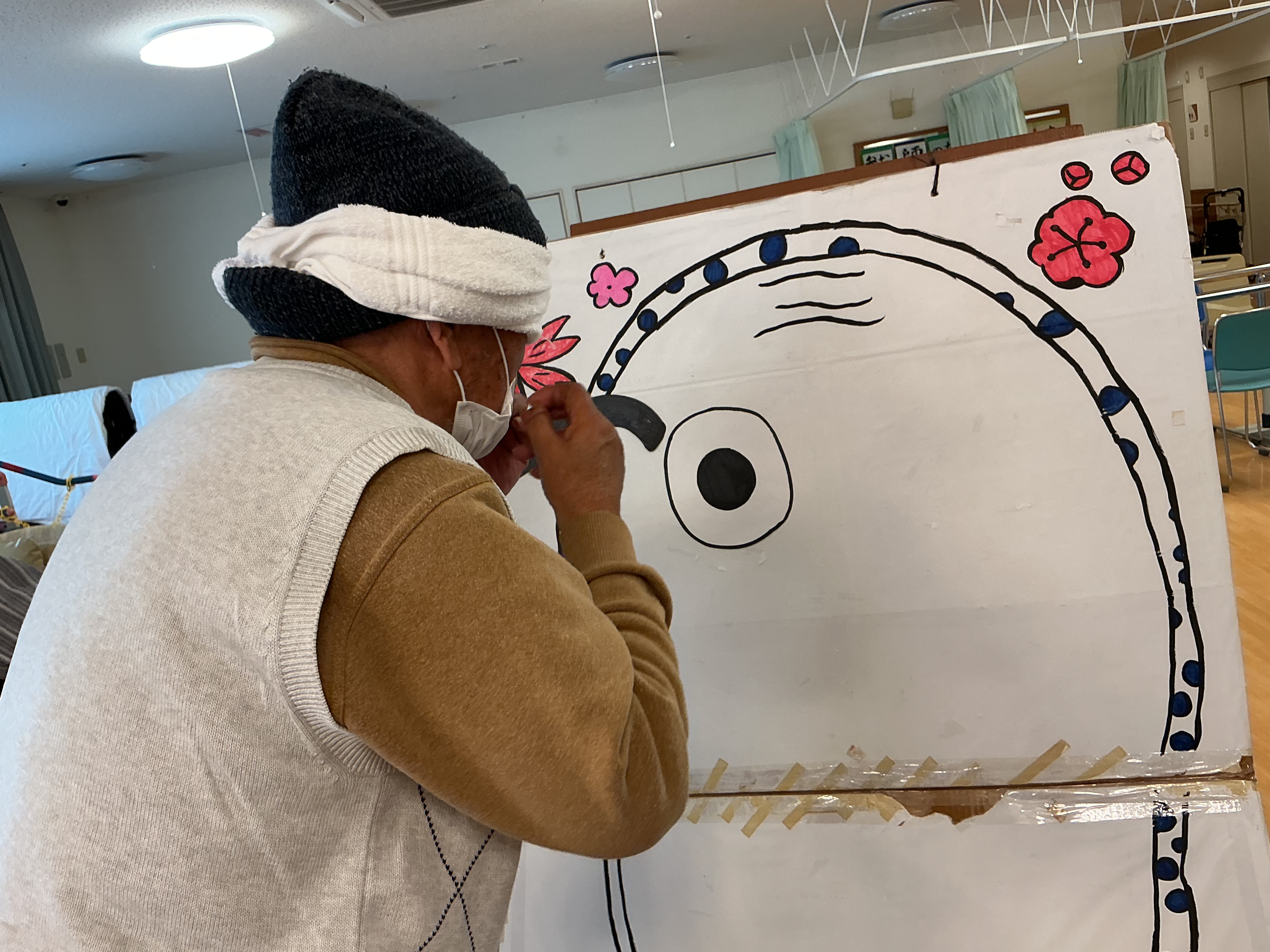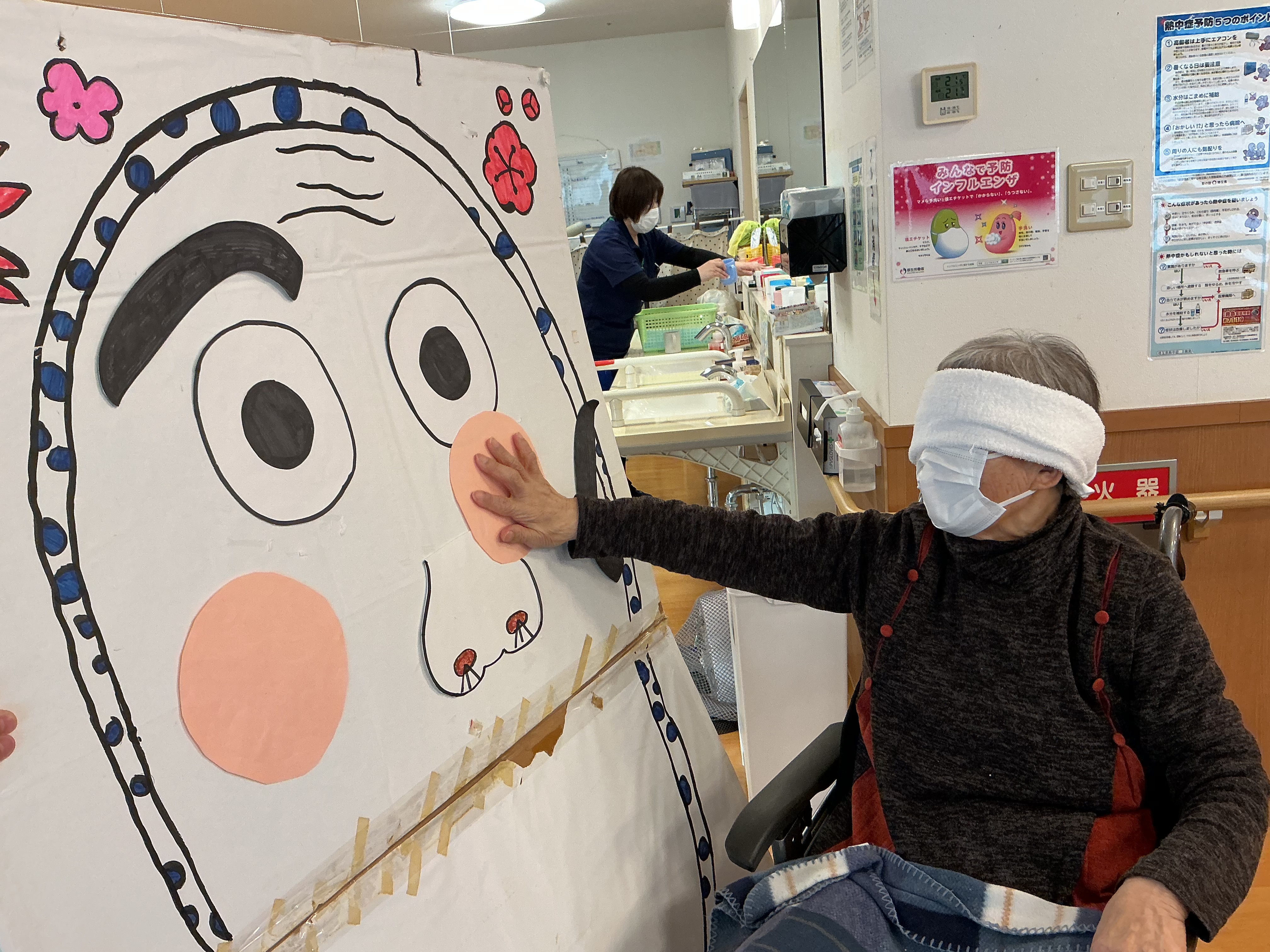 お正月のレクで福笑いを楽しんで頂いています(*^-^*)みんなで大笑いしながら出来上がったひょっとこさん!いい顔になりました♪笑