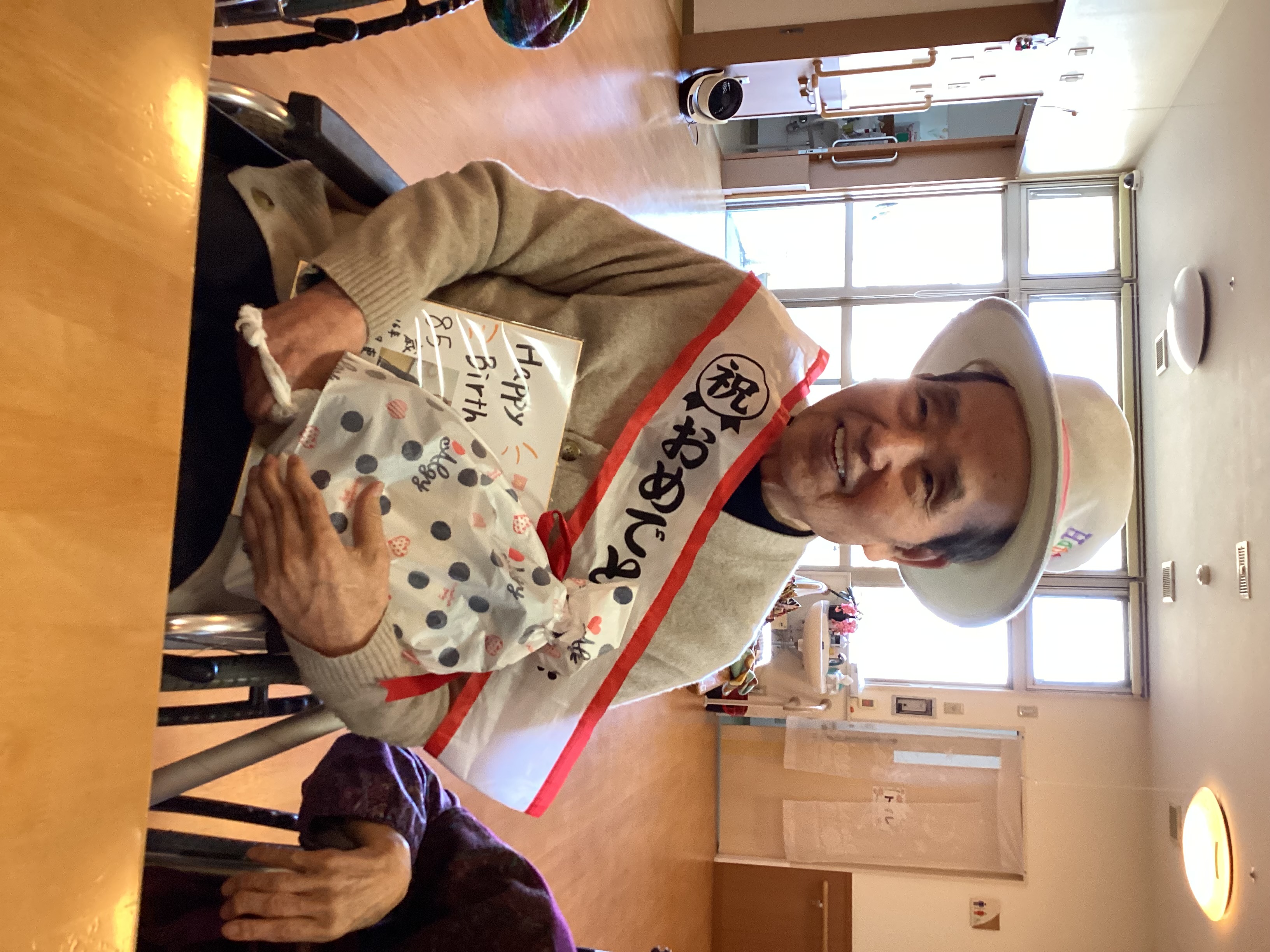 本日お誕生日を迎えられた方のお祝いをしました! プレゼントは靴下と好物の和菓子でした(*'ω'*) 少し恥ずかしくて照れながらもにこやかな笑顔♪喜んで頂けたようで良かったです。