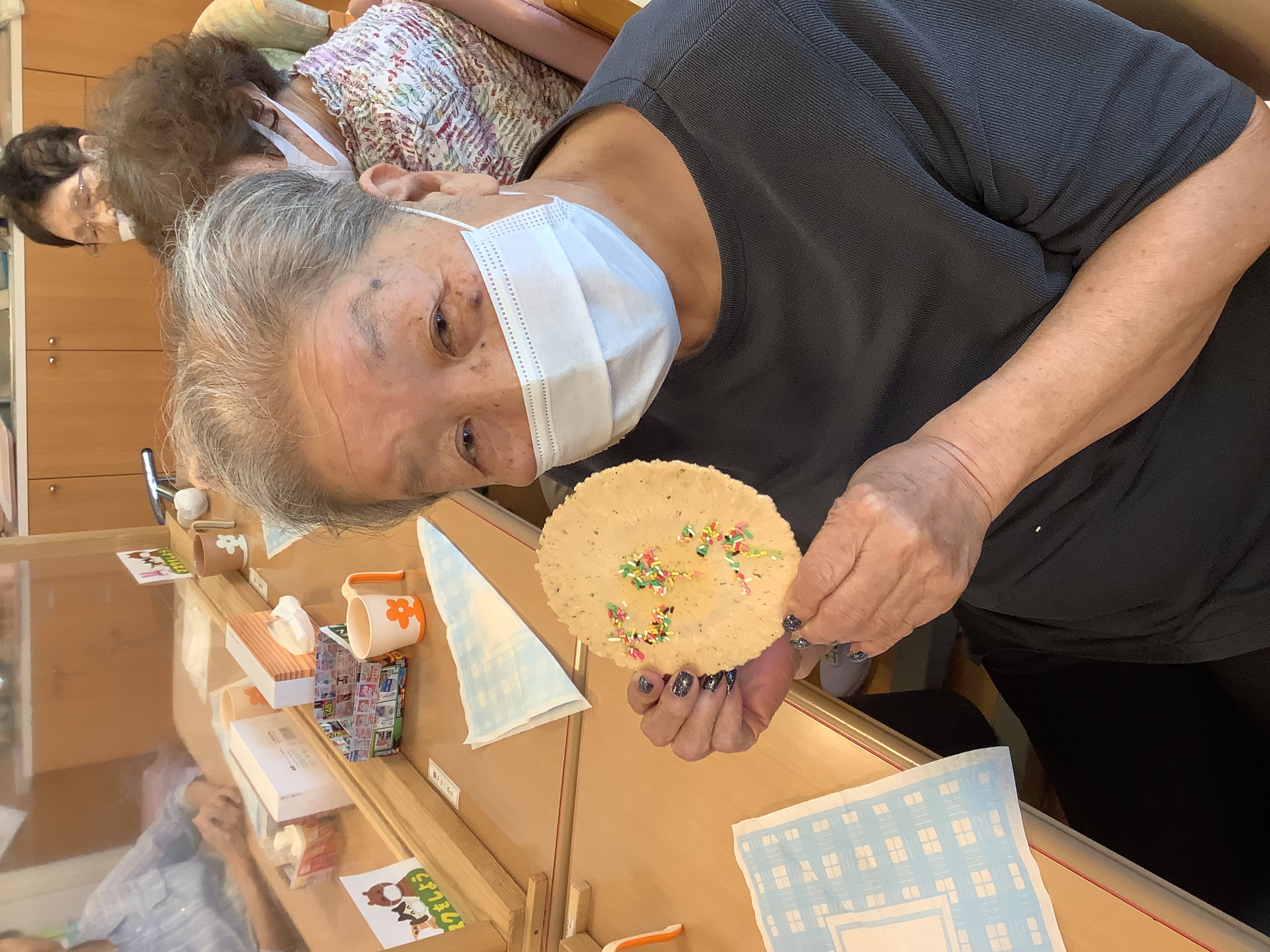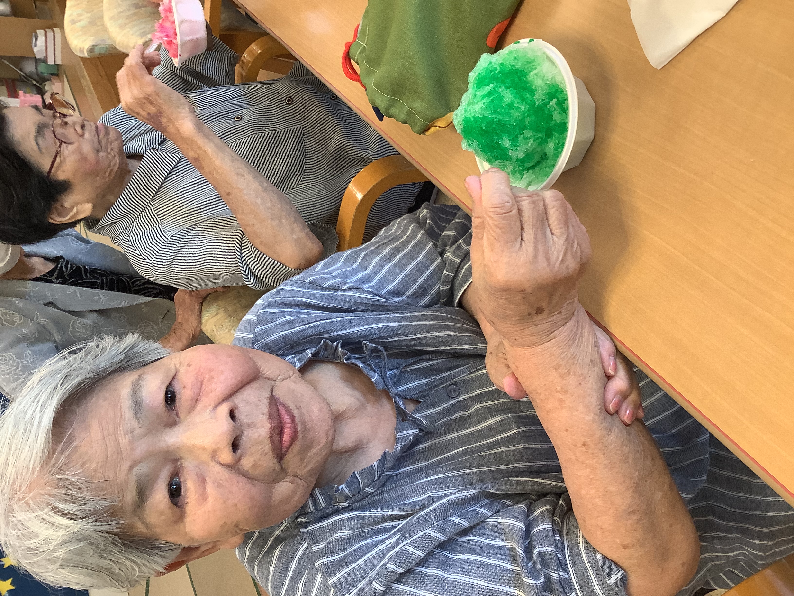 夏祭りの日の昼食は縁日メニューでした!(^^)!・焼きそば・タコ焼き・唐揚げ・チョコバナナなど美味しいご飯に皆様嬉しそうでした( *´艸`)おやつは・かき氷・落書せんべい♪ 「久しぶりにかき氷食べたよ(*'▽')」「落書せんべいは初めてだけど美味しい」と大好評でした(^^♪