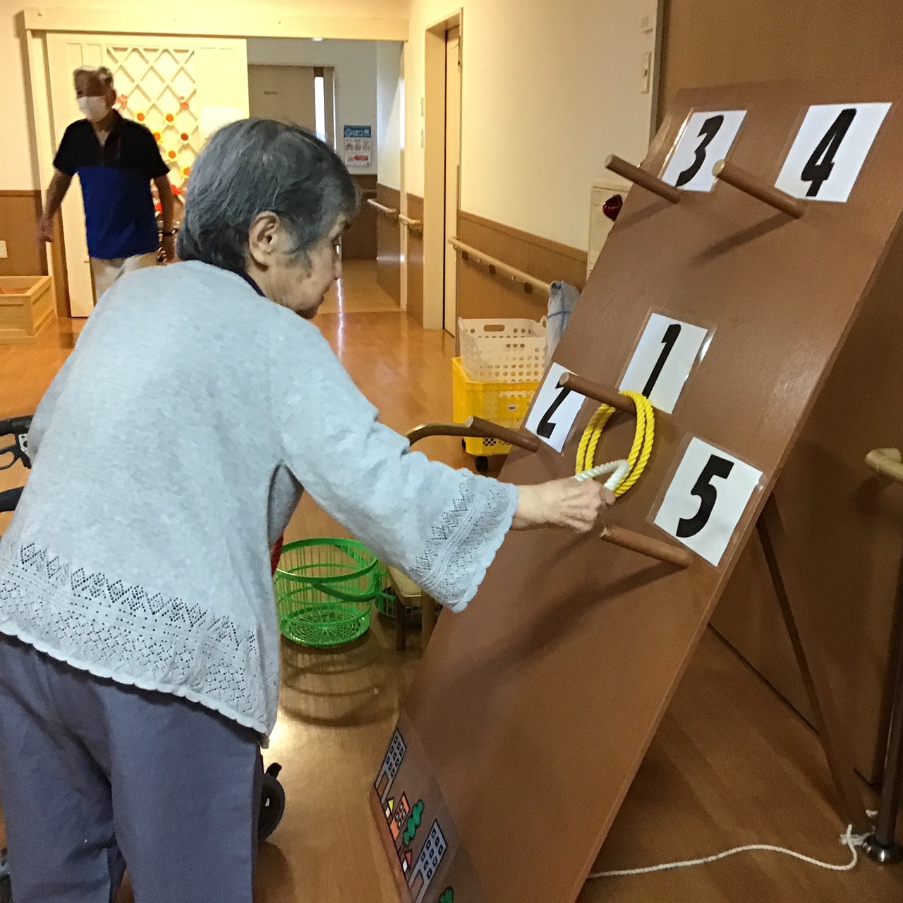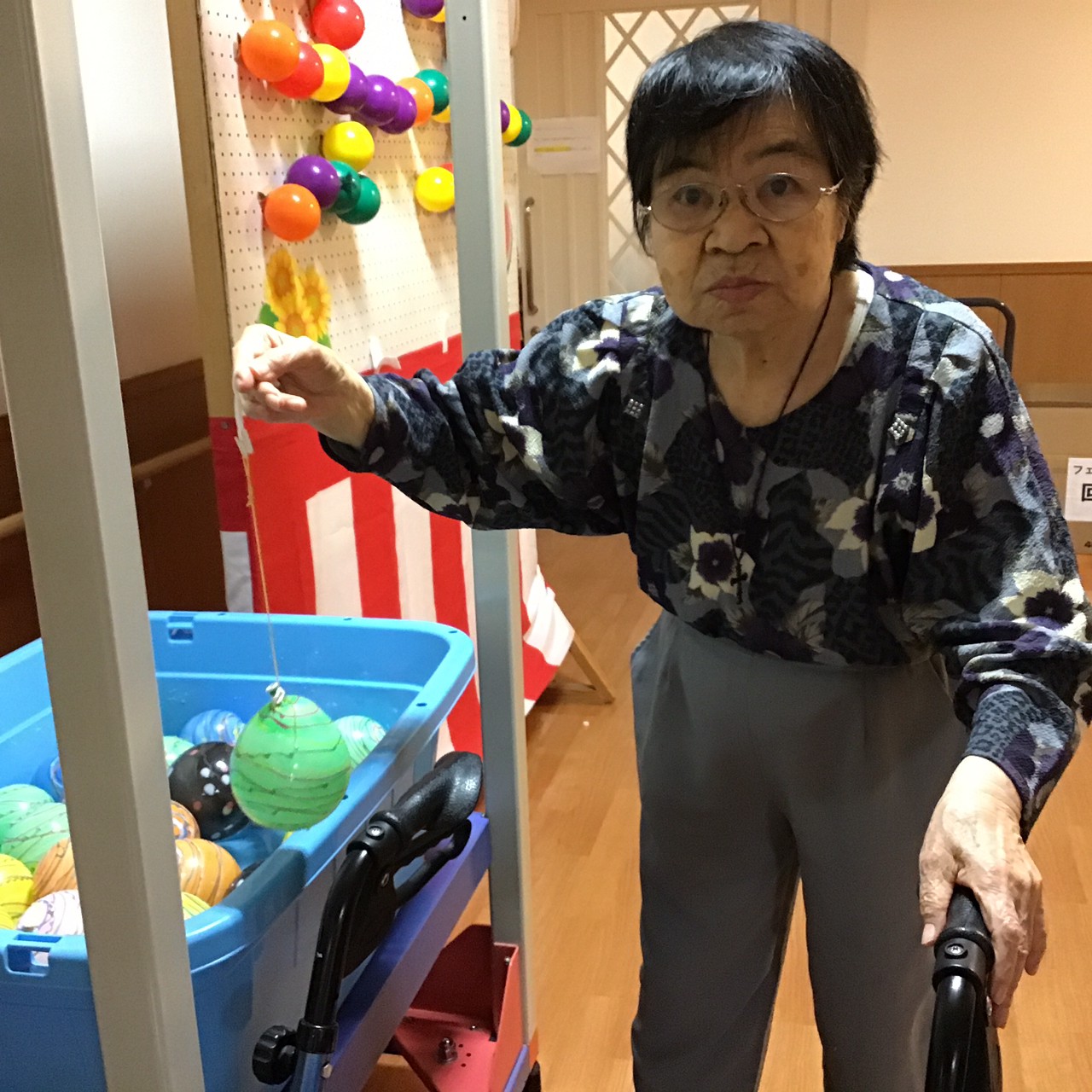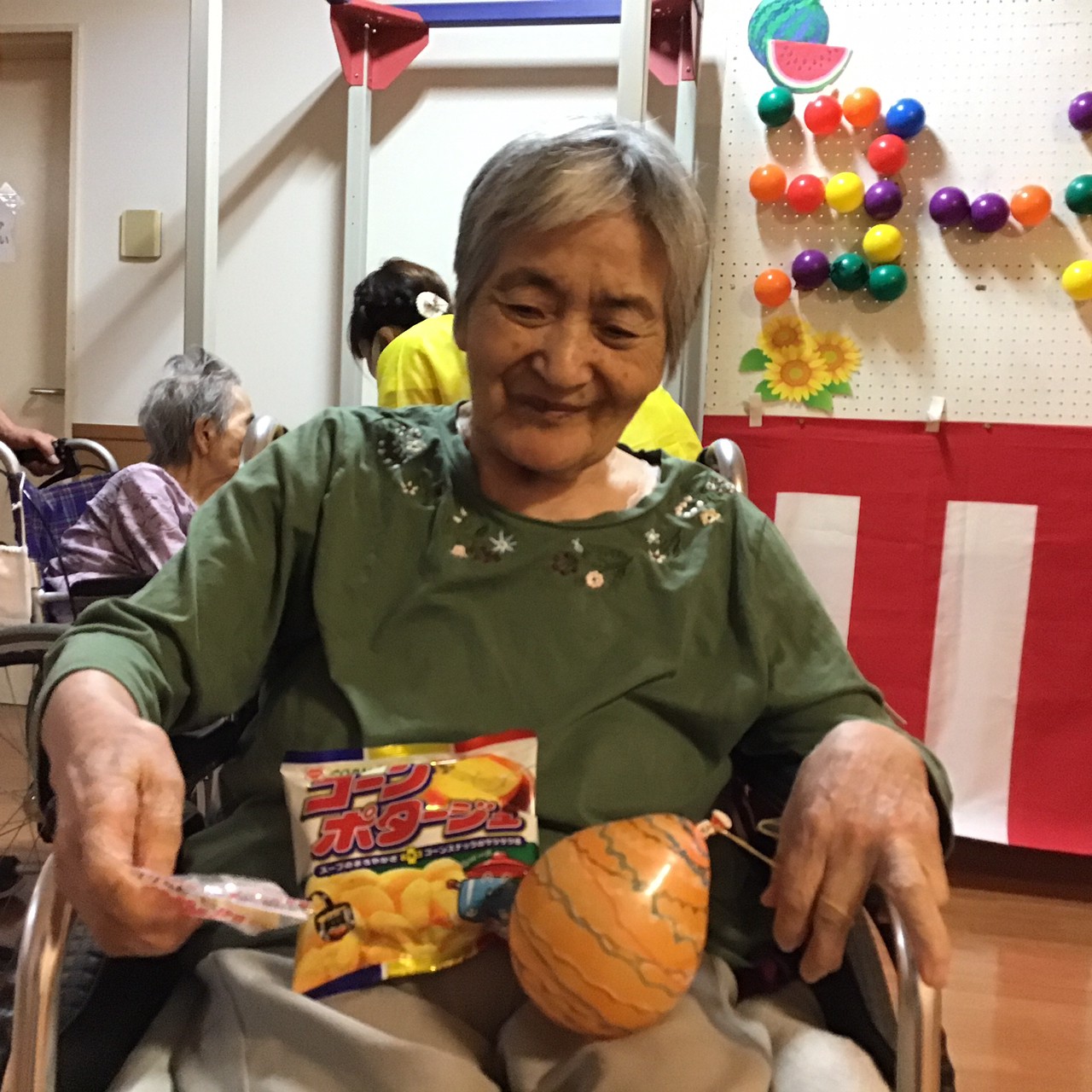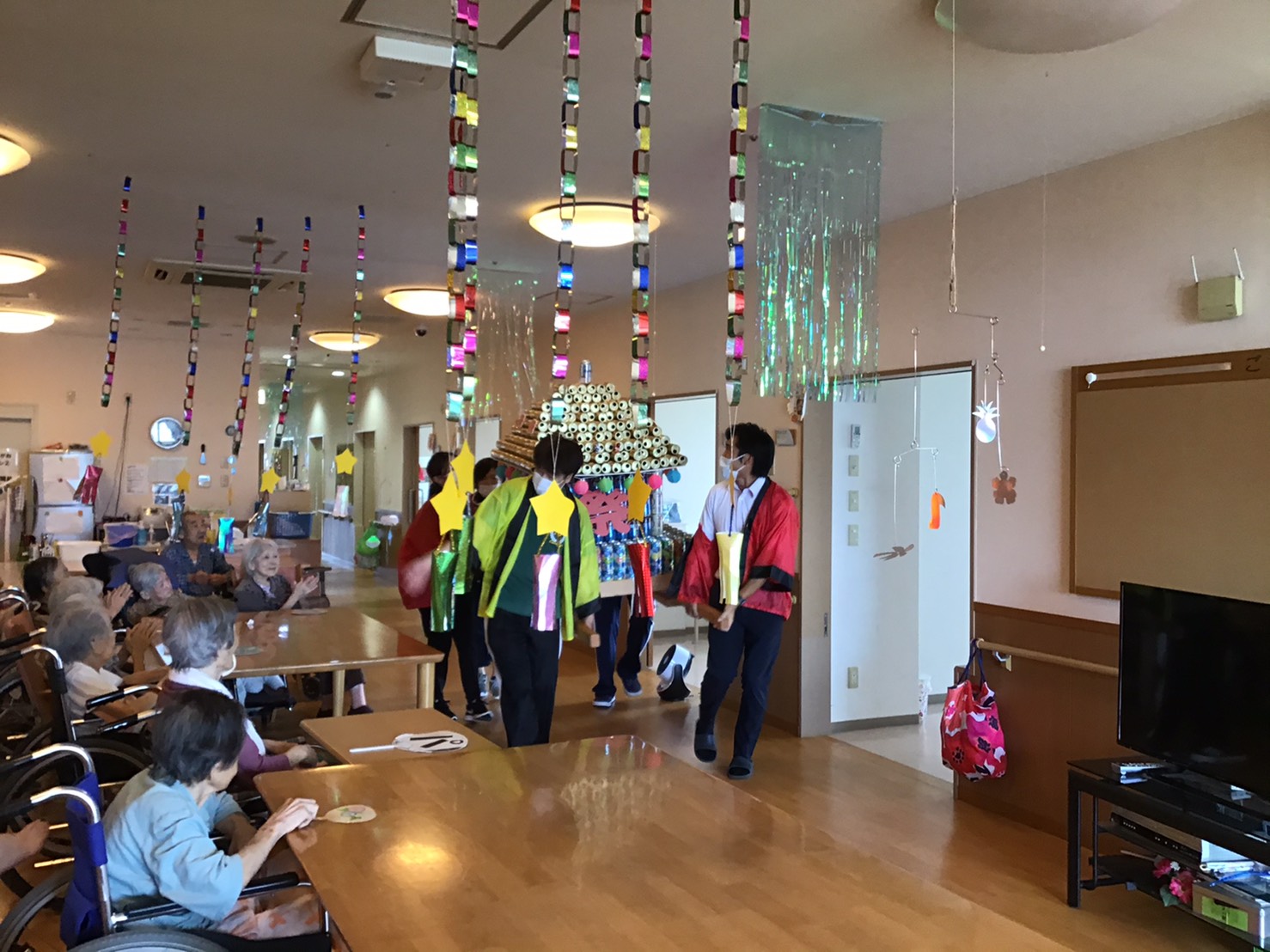今年は緊急事態宣言発令のため、感染対策を徹底し施設内で縁日(輪投げ・ヨーヨー釣り・落書きせんべい・空き缶倒し・千本引き)や職員によるお神輿などの催しで入居者さんに楽しんで頂きました (^_^)