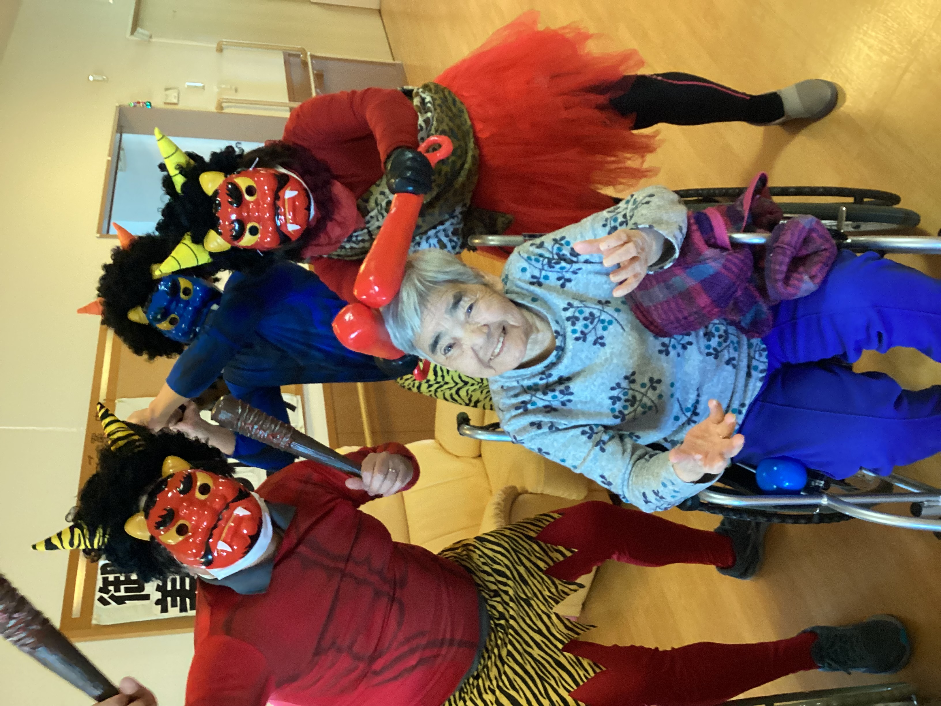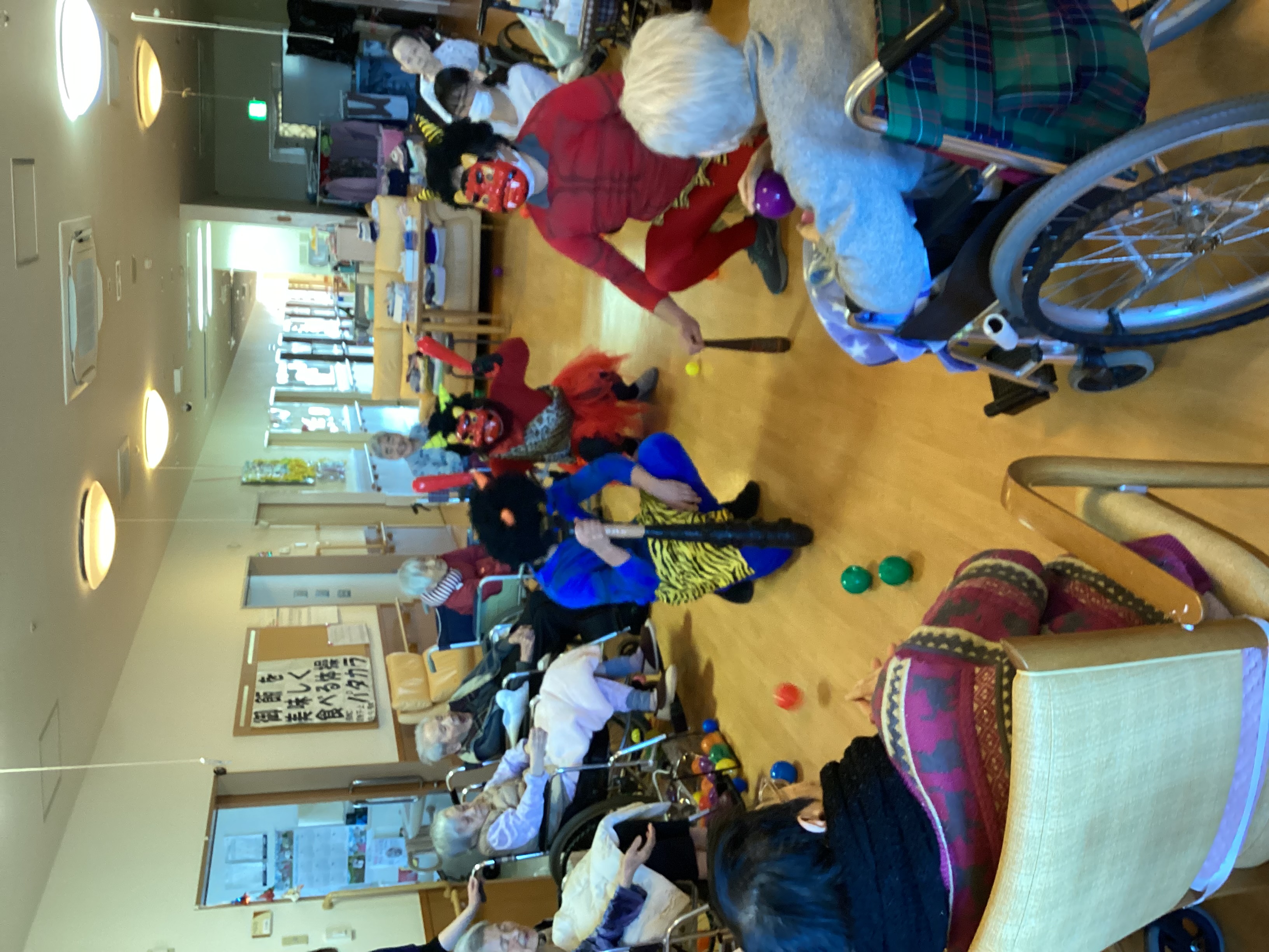 「鬼は外~福は内~」とかけ声! 豆にみたてたボールを鬼に扮した職員に投げつけて退治しました! 最後は心をいれかえた鬼と記念撮影です('ω')ノ 今年も一年皆様が健康で過ごせますように☆