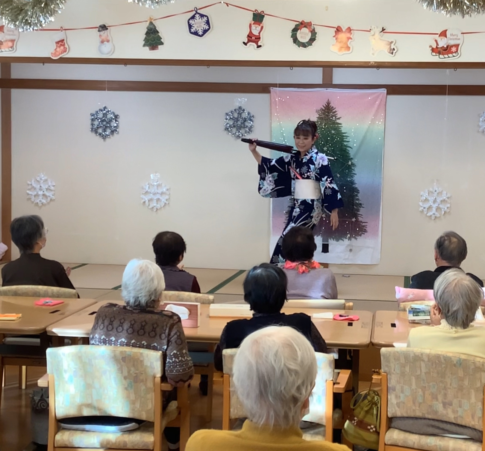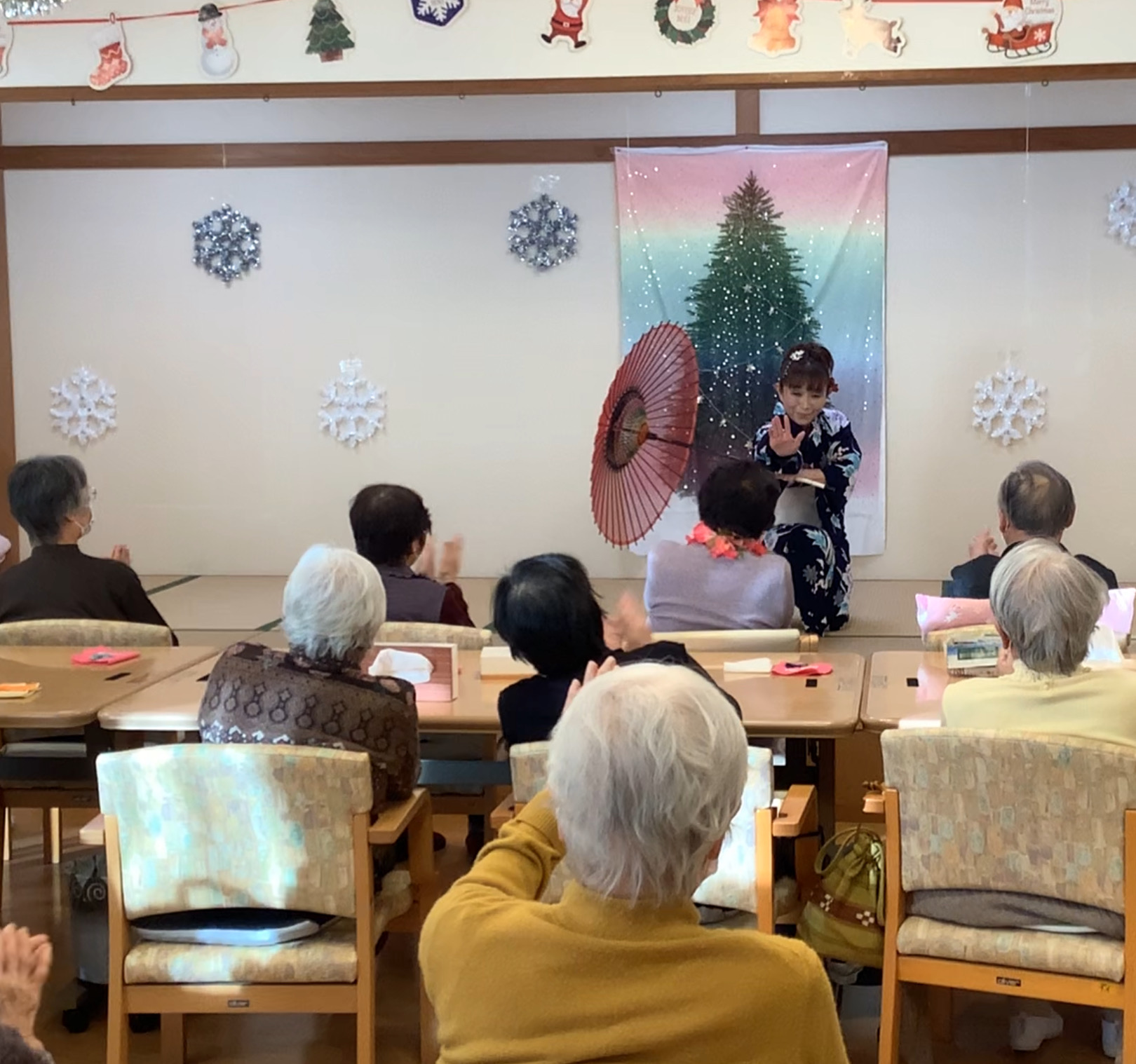 12月のお誕生日会で職員の出し物を行いました( *´艸`) 職員が新日本舞踊を「関東春雨傘」の曲に合わせて踊りました(^^♪