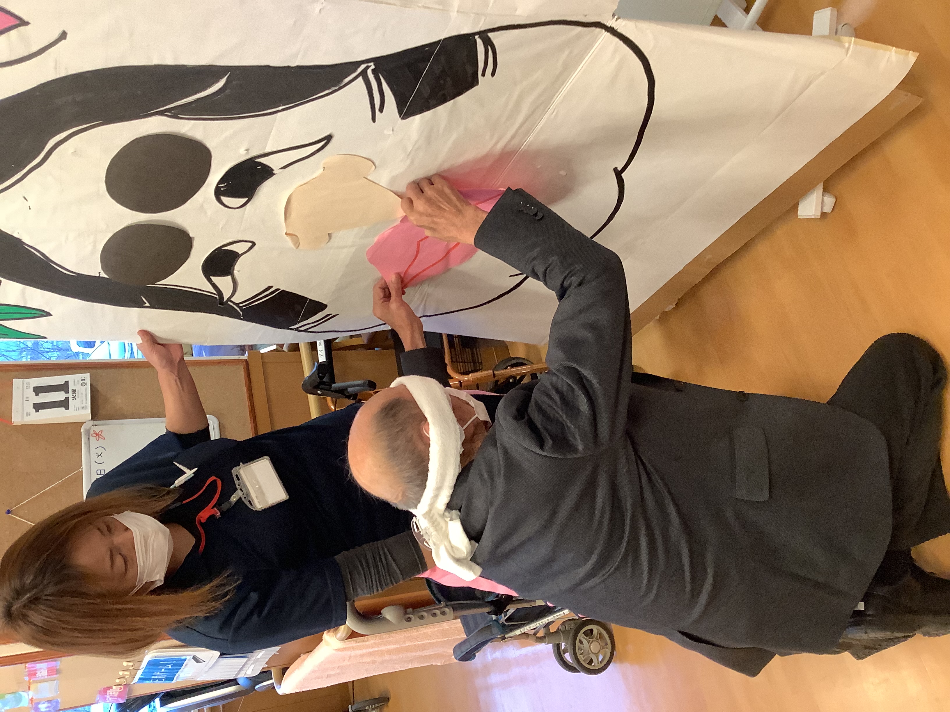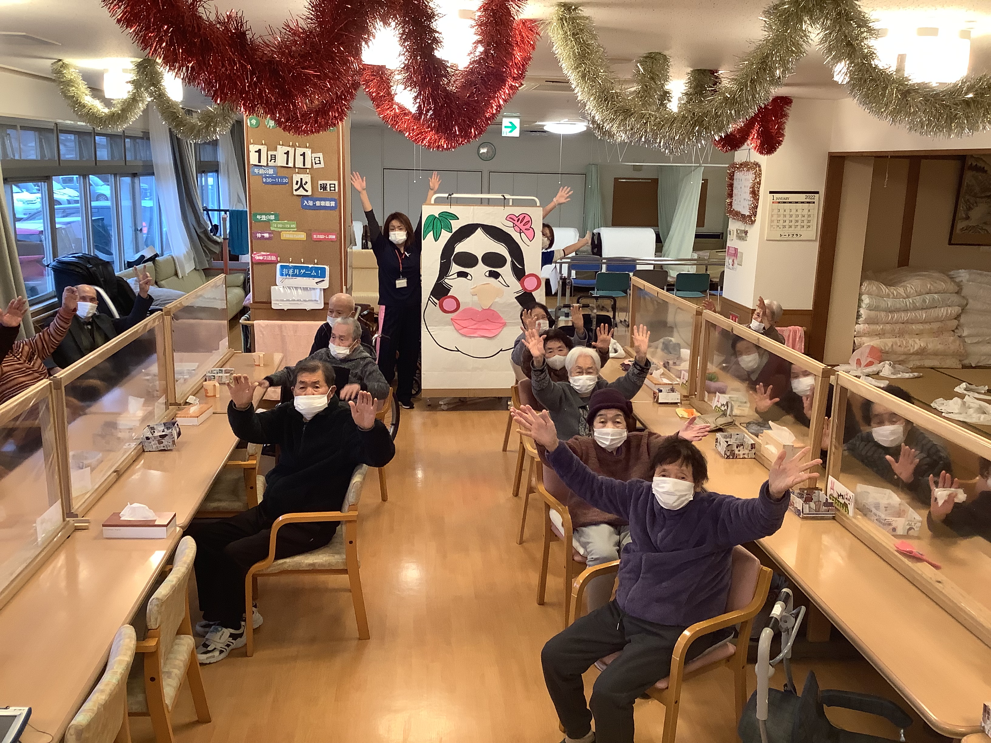 年明けのレクリエーションで福笑いを行いました(*^▽^*) 皆様で協力し声をかけあいながら最高の「おかめ」を完成させました♪笑いあり、大笑いありの楽しい時間でした☆彡