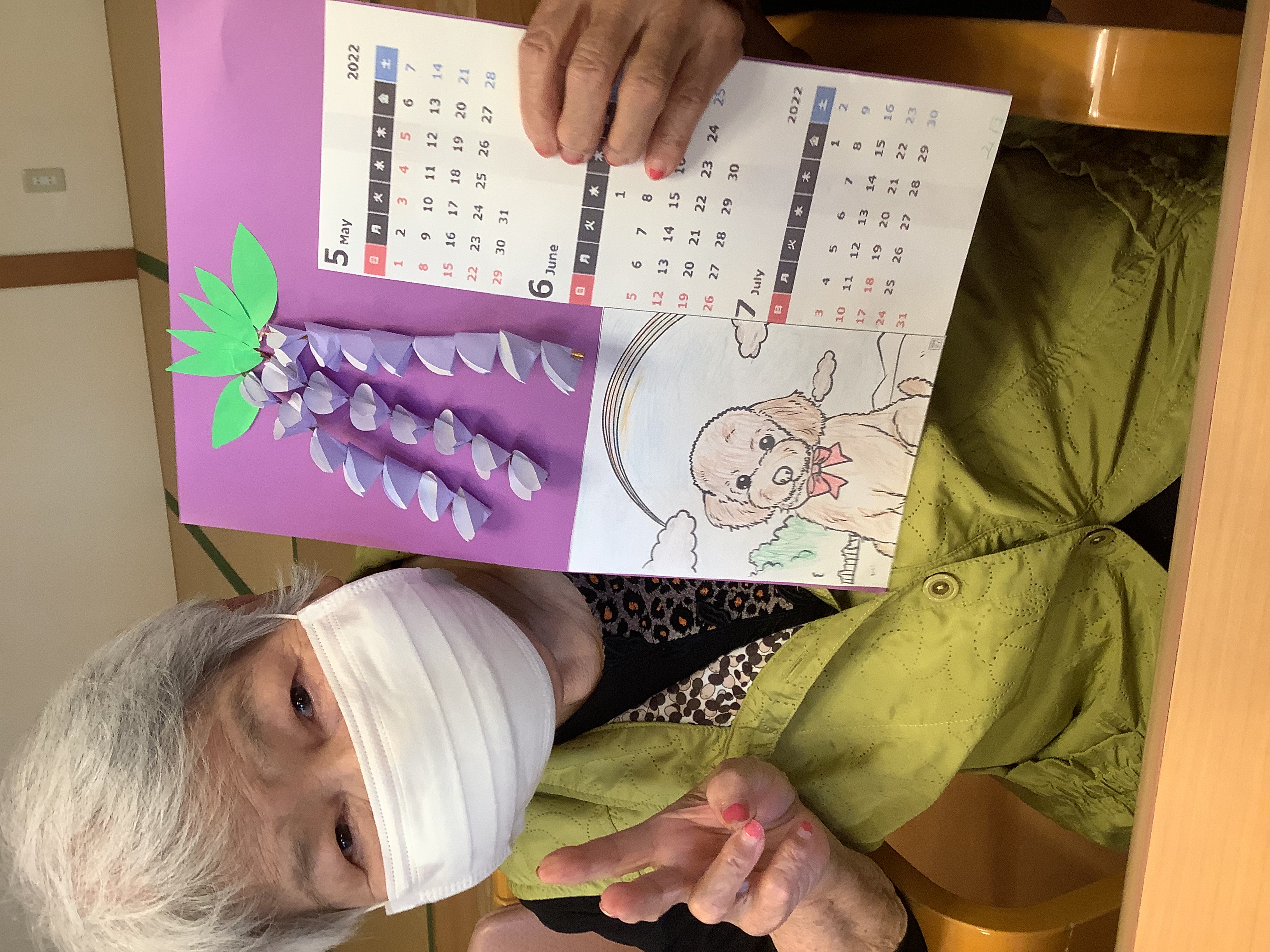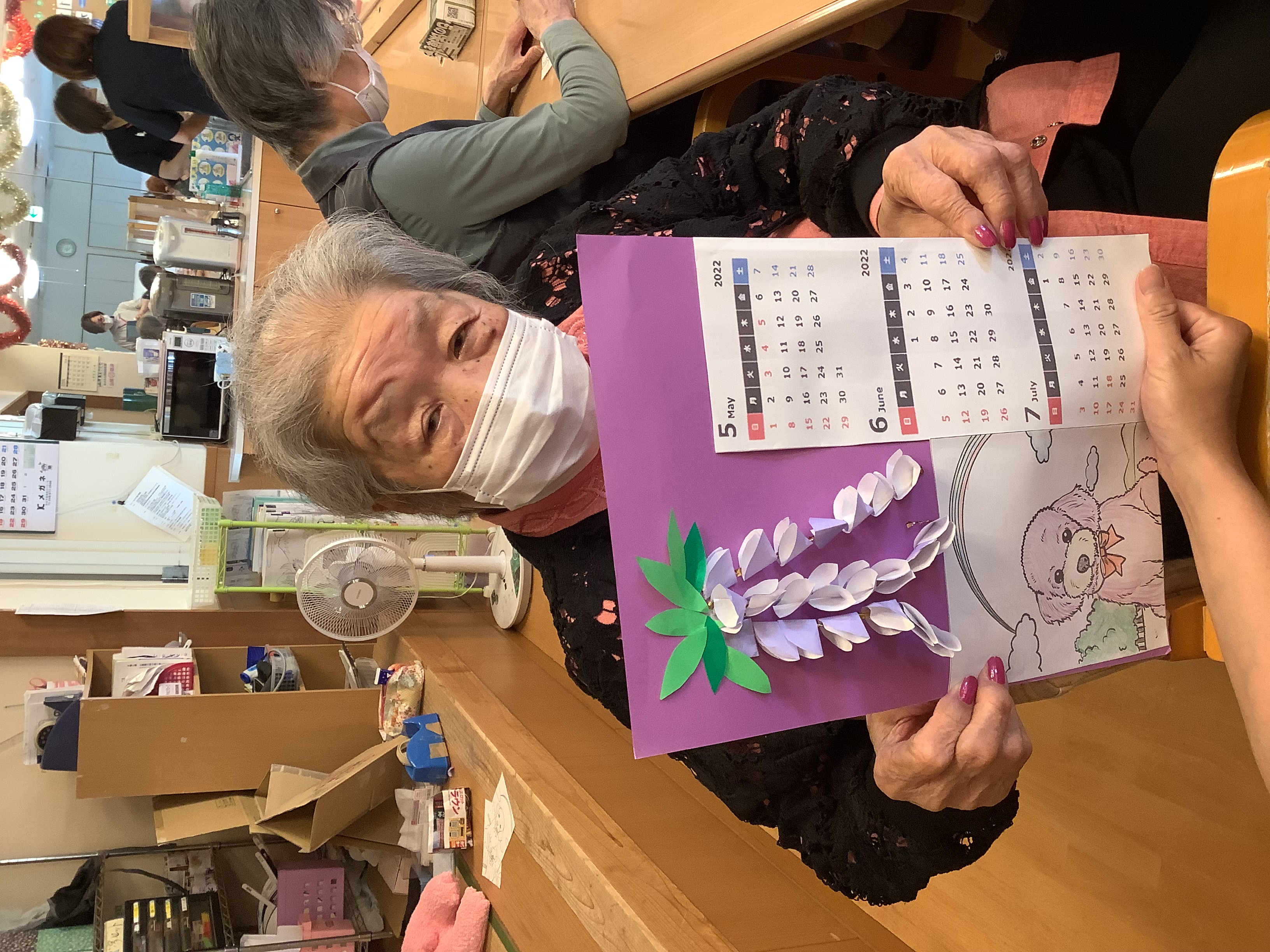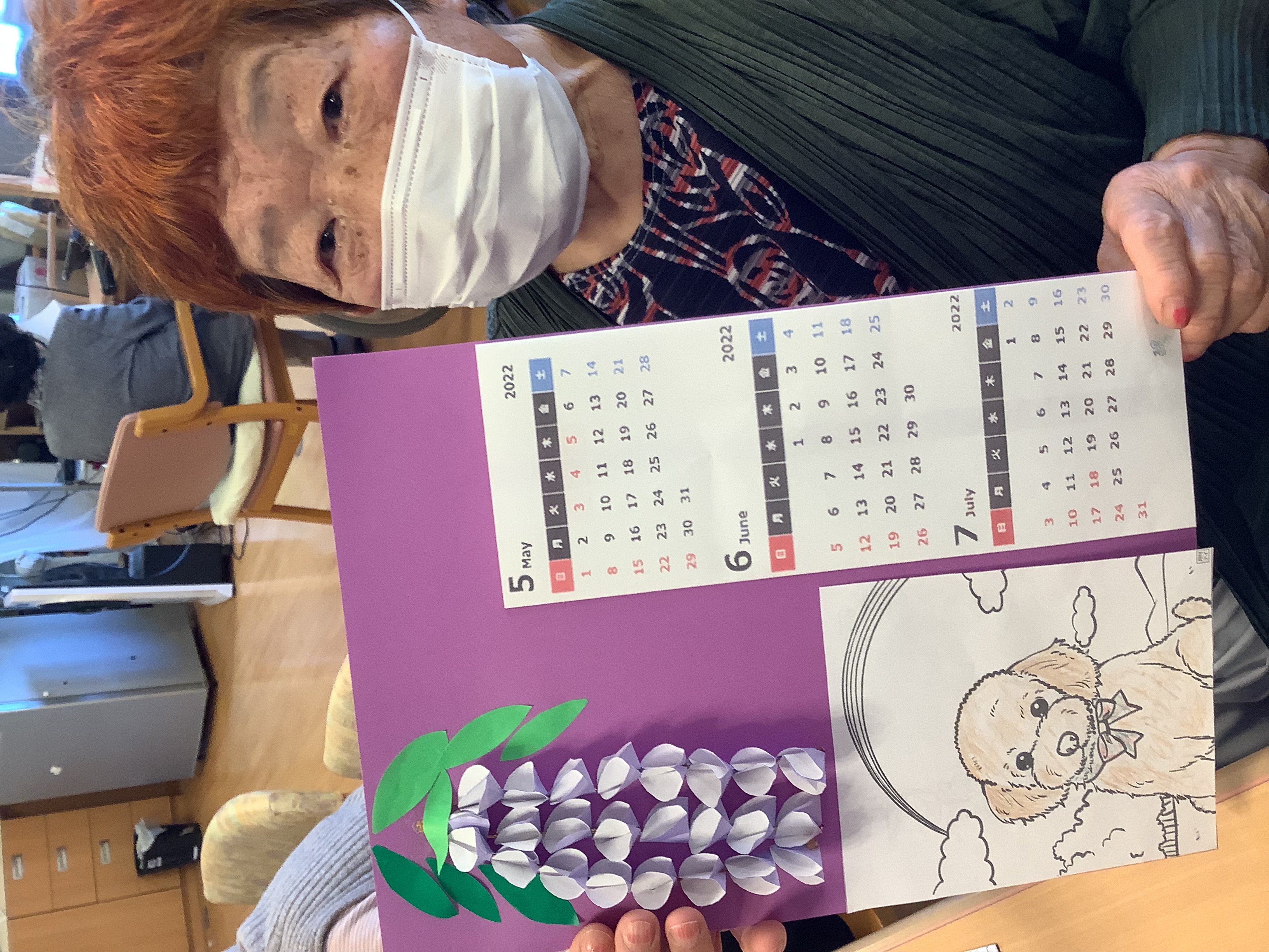 恒例のカレンダー作りを行いました!(^^)! 利用者様が楽しみにされている工作の一つです(*'ω'*)今回は折り紙で作った、藤の花をメインに作りました☆