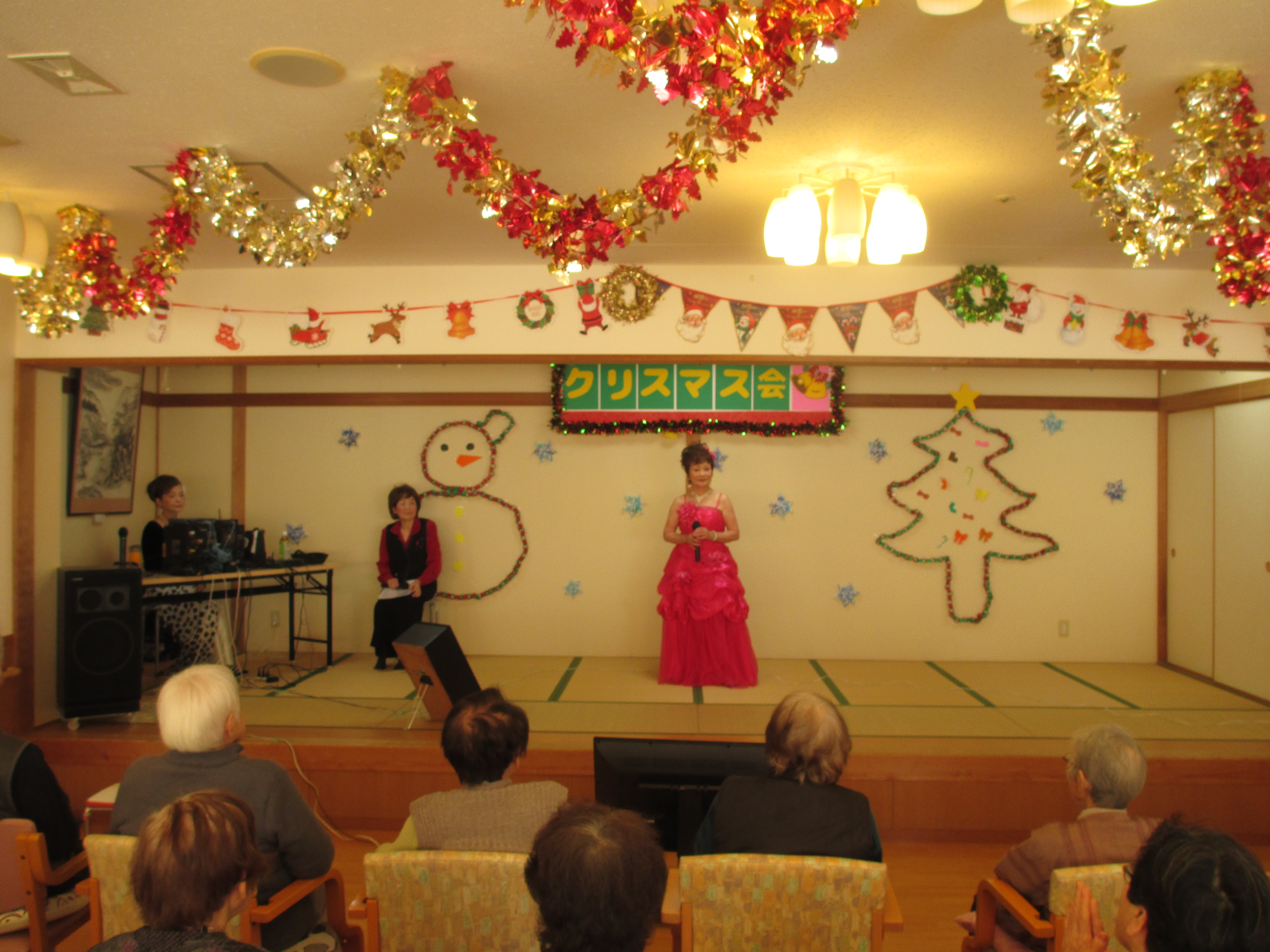 12月18日にデイサービスのクリスマス会を行いました☆昼食にはクリスマスランチ、おやつにケーキを召し上がって頂き、どちらも美味しいととても好評でした!(^^)!慰問では「スワンの会」の16名の皆様に素敵な歌を披露して頂きました♬理事長サンタからは1人1人に手渡しでプレゼントを渡していただき、職員の出し物も楽しんで頂きました(#^.^#)笑顔と笑い声があふれる1日になりました(^^♪