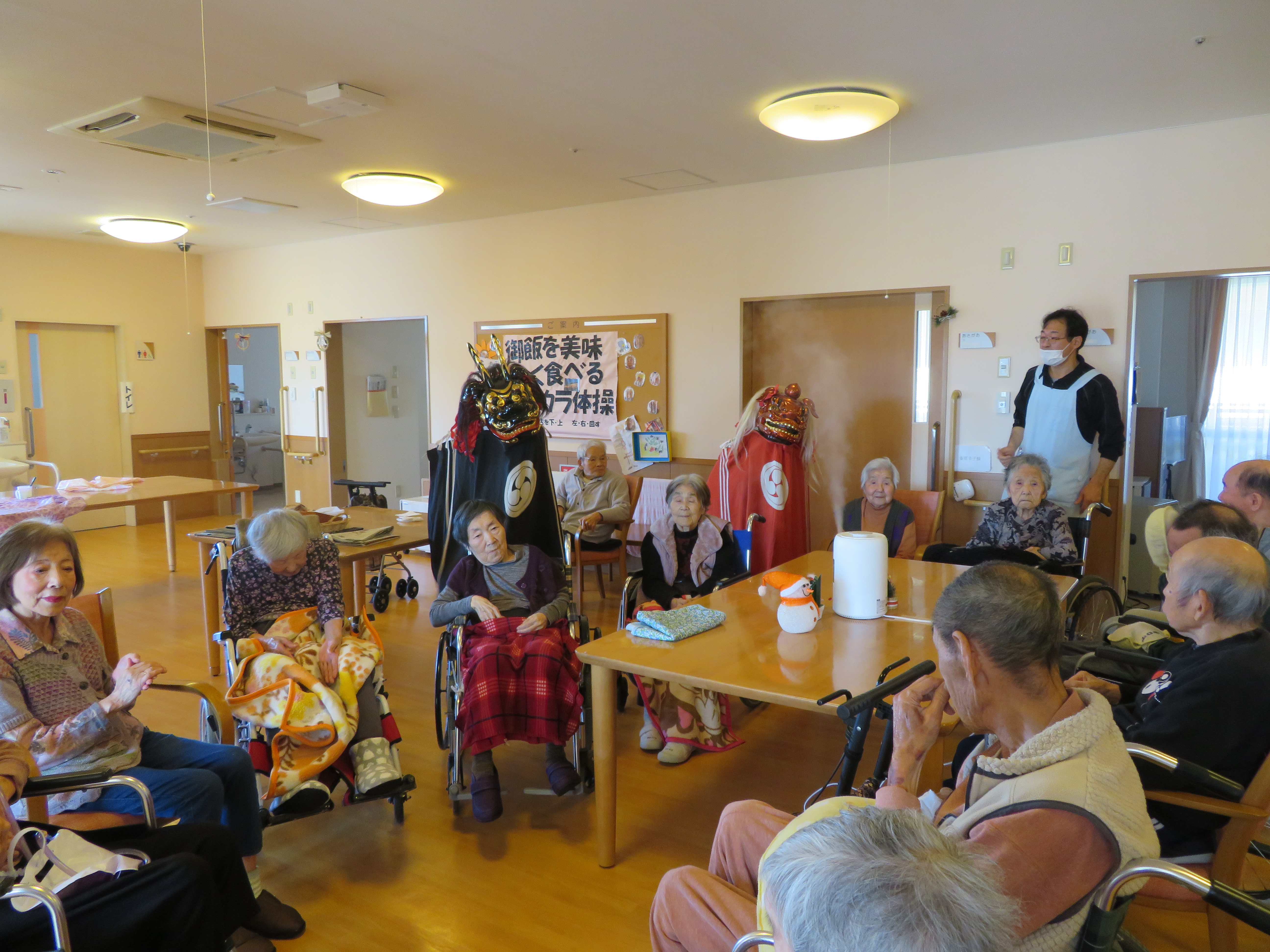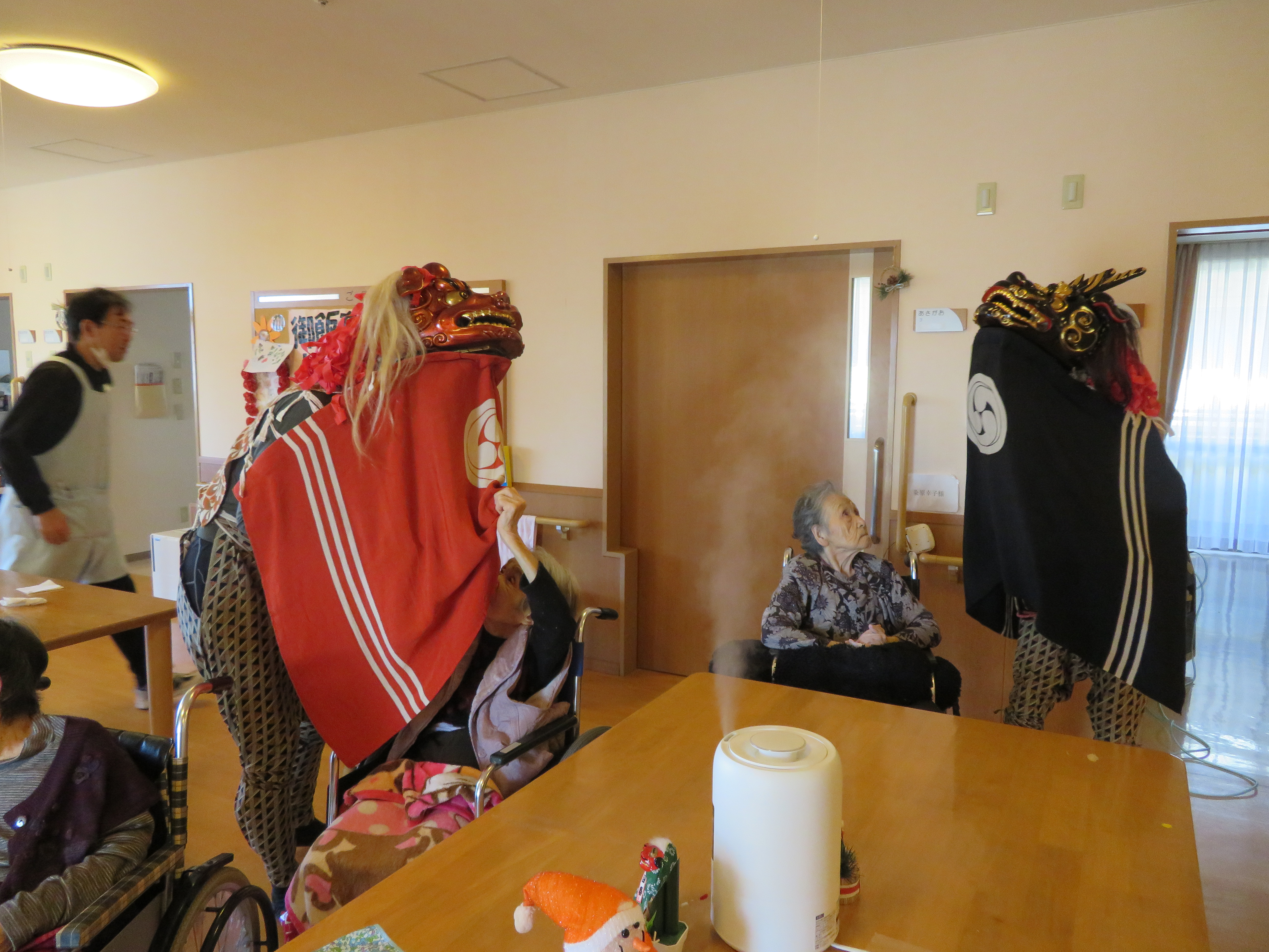 獅子の登場に、ご利用者様も笑顔で拍手したり、ビックリして驚いた顔をされる方もいらっしゃいました。