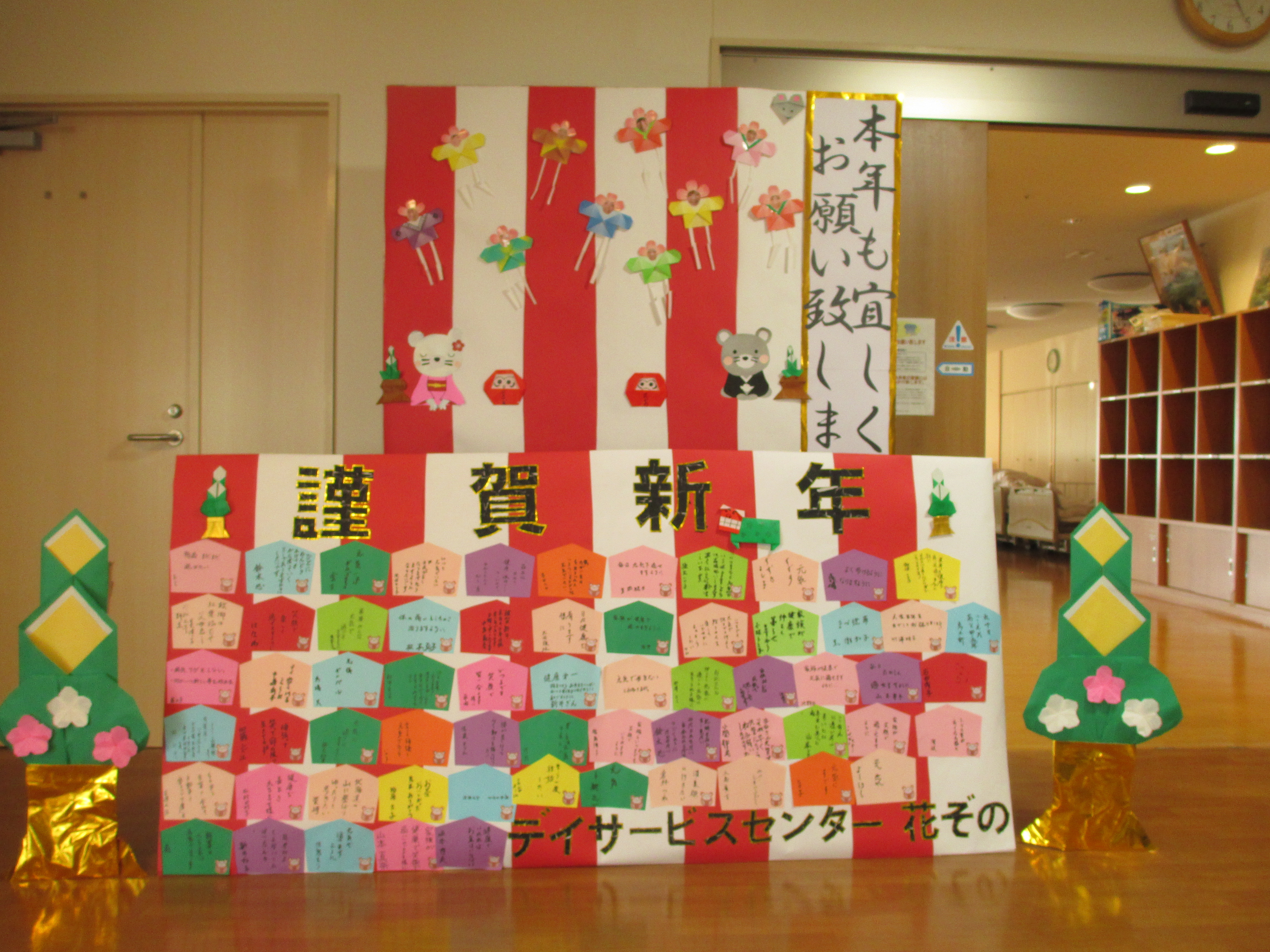 本年も宜しくお願い致します。2020年になりデイサービスでもお正月らしく福笑いや職員手作りのすごろくゲームなどを楽しんで頂きました(#^.^#)また、施設入り口には利用者様に新年の抱負を書いて頂いた絵馬を飾ってあります☆