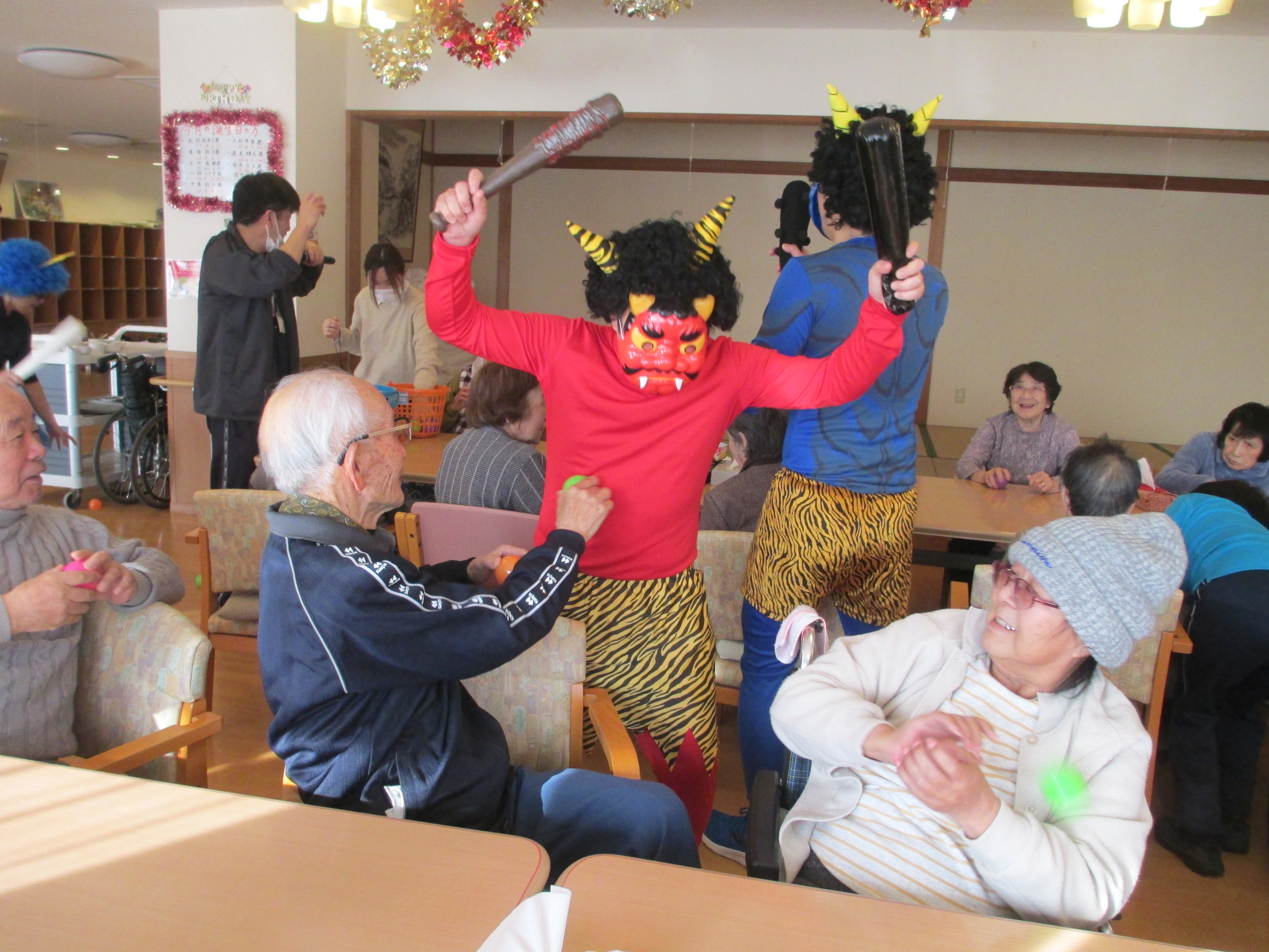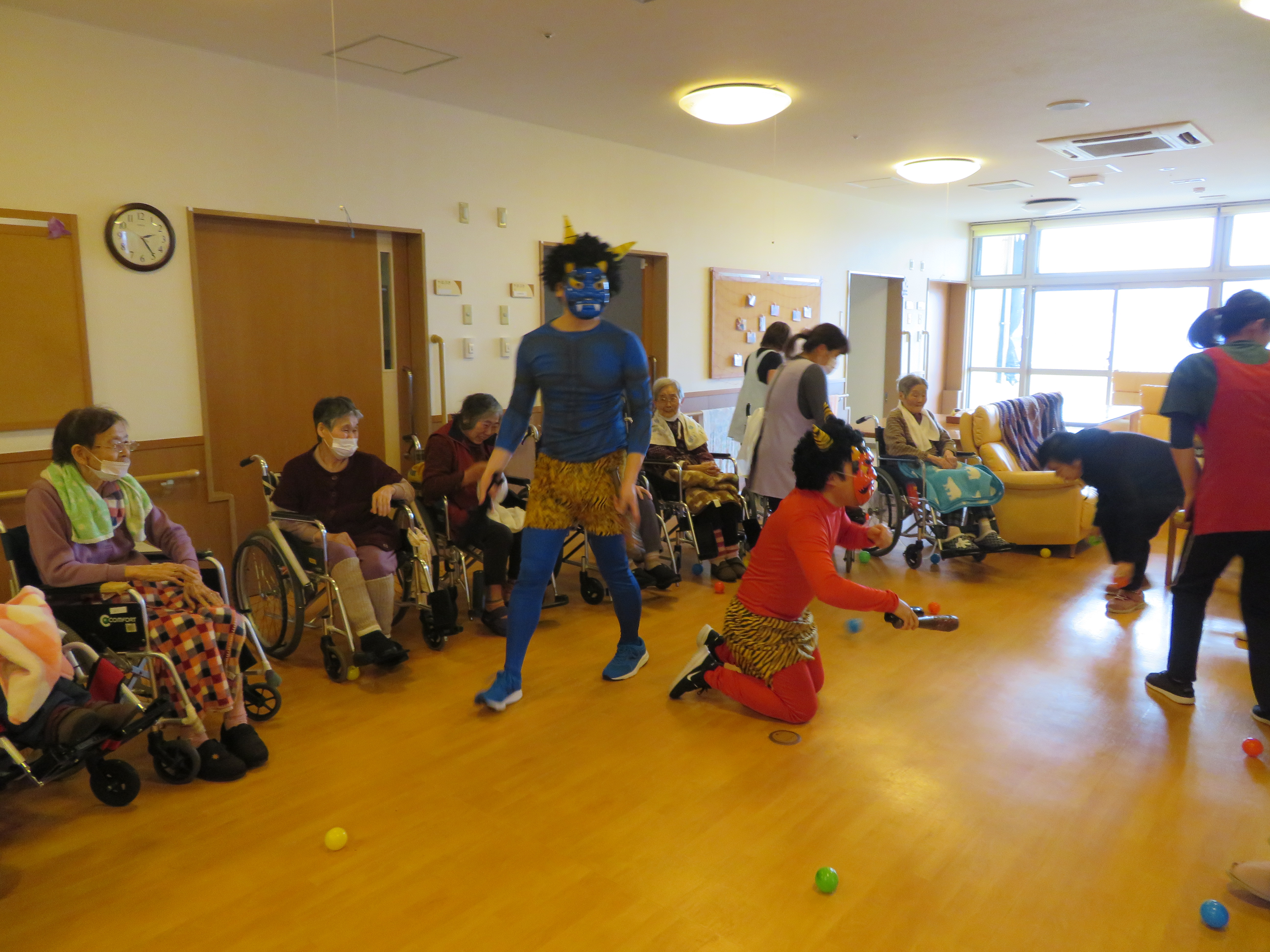 利用者様はカラーボールを投げ、鬼退治に奮闘されていました。