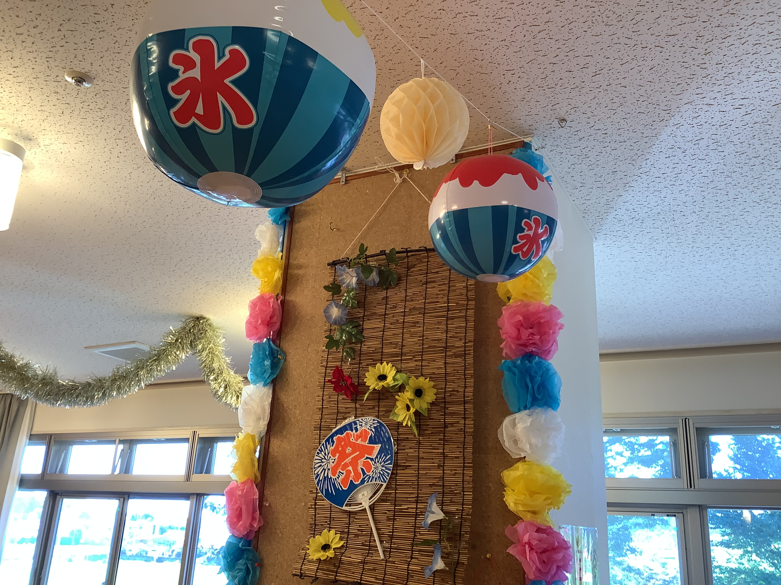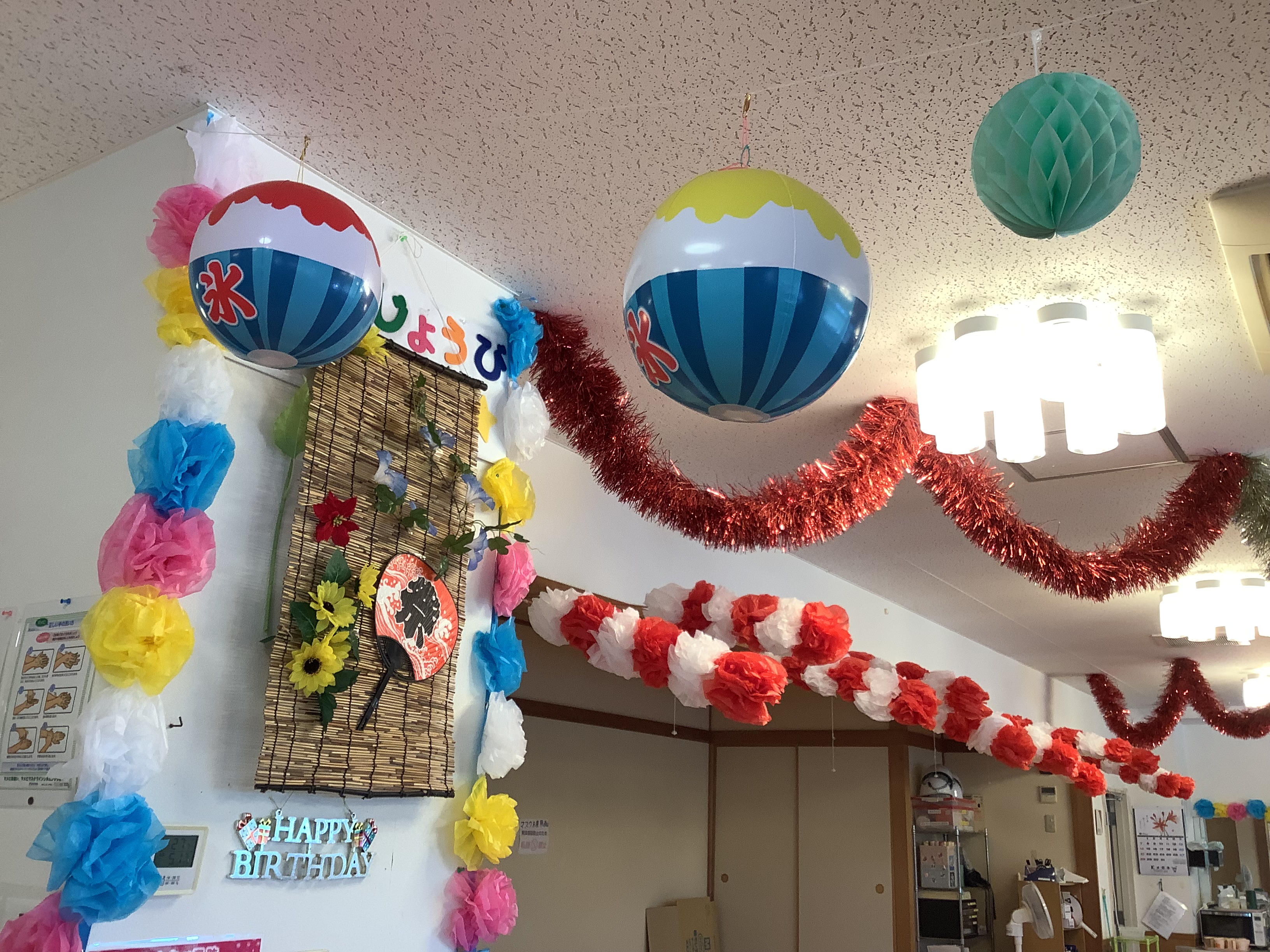 夏祭りに向け、デイルーム内の飾りつけをしました(^^♪ 明るくなった室内、利用者様からも好評です( *´艸`)