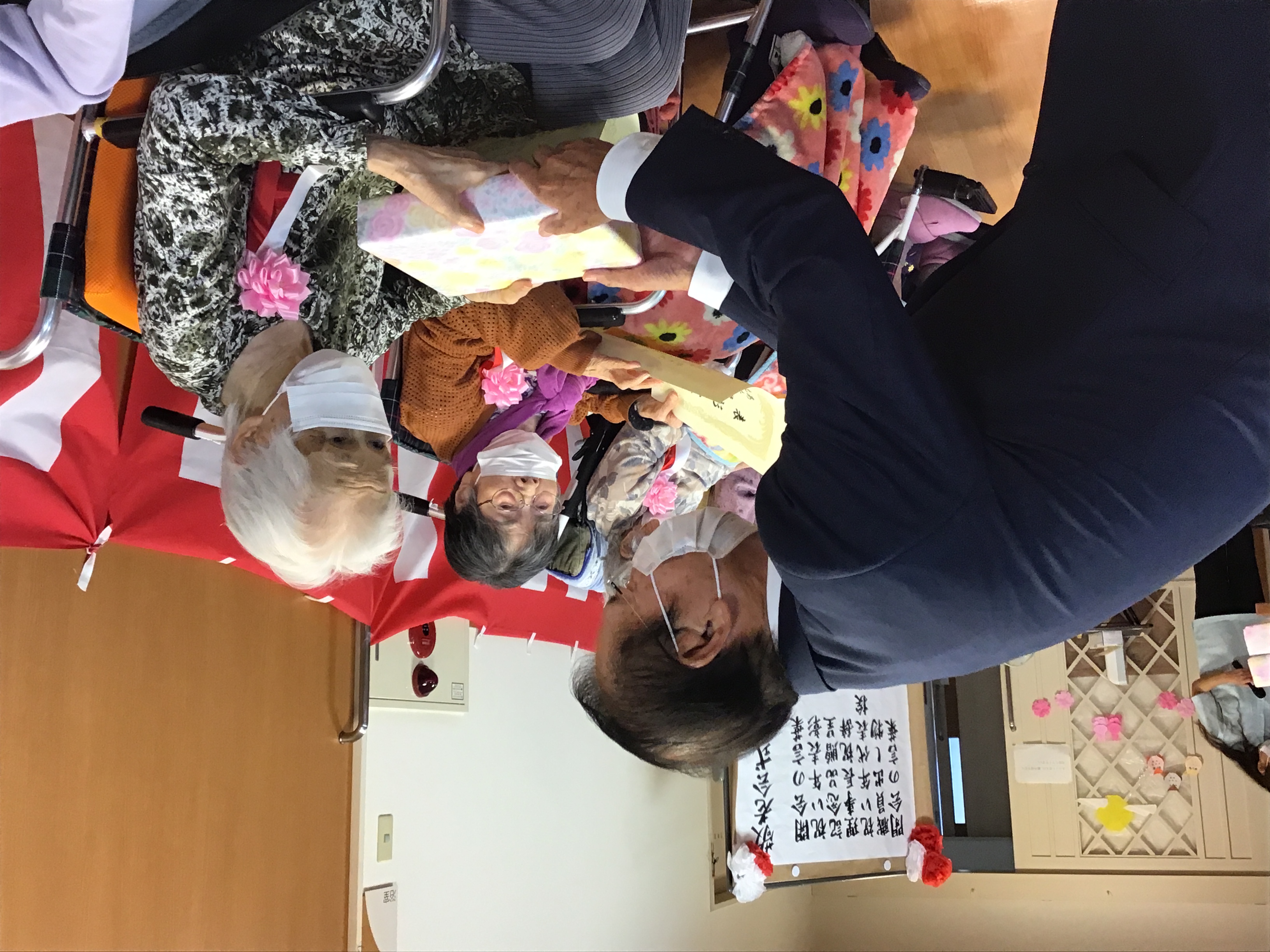 9月19日(月)の敬老の日に合わせて敬老会を行いました。今年は12名の長寿祝いのご利用者に理事長より表彰状の授与とご入居者様全員に記念品の贈呈を致しました。
