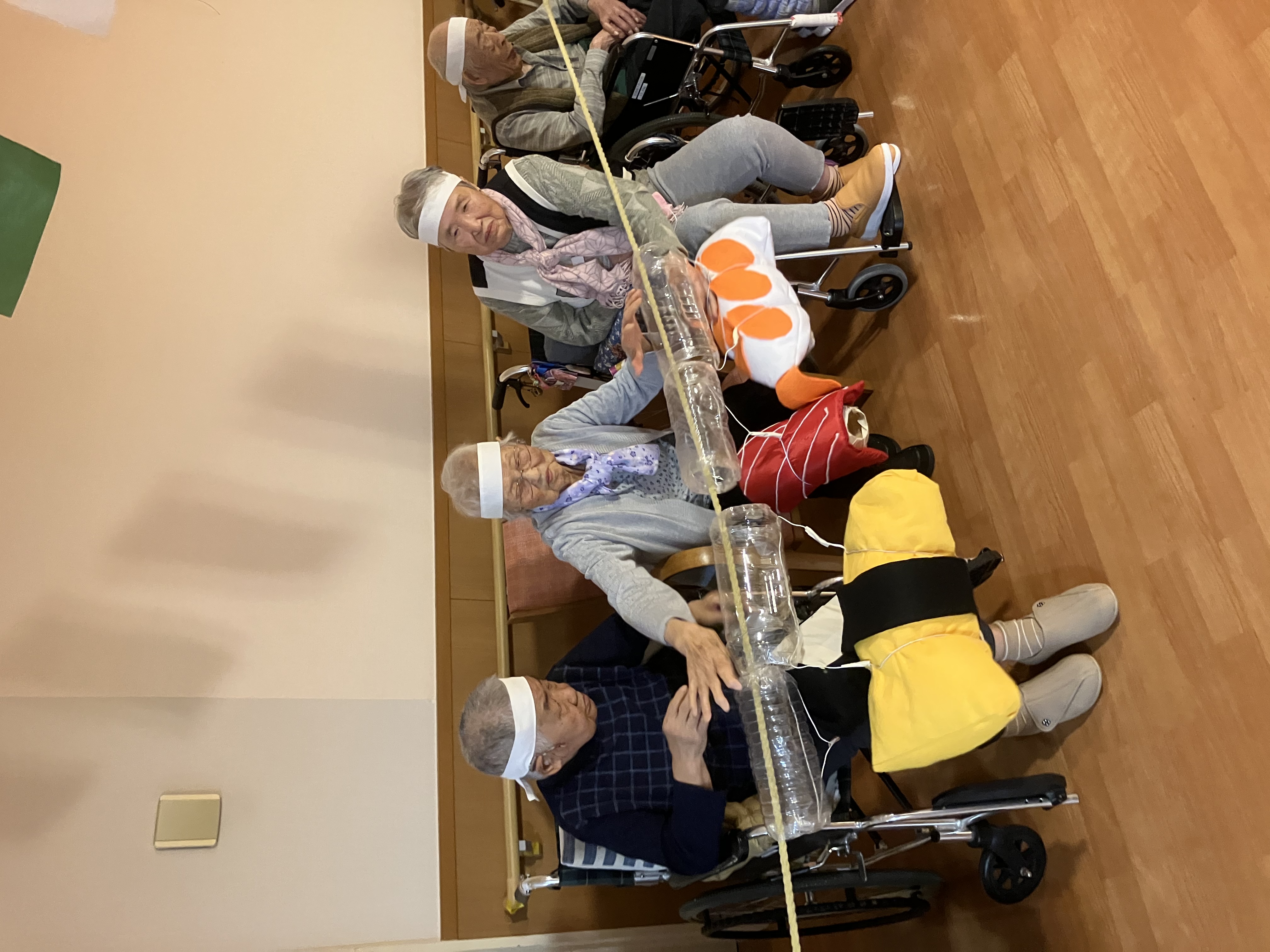 ユニット対抗戦でパン食い競争、玉入れ、寿司送りリレーの3つのプログラムを行いました。