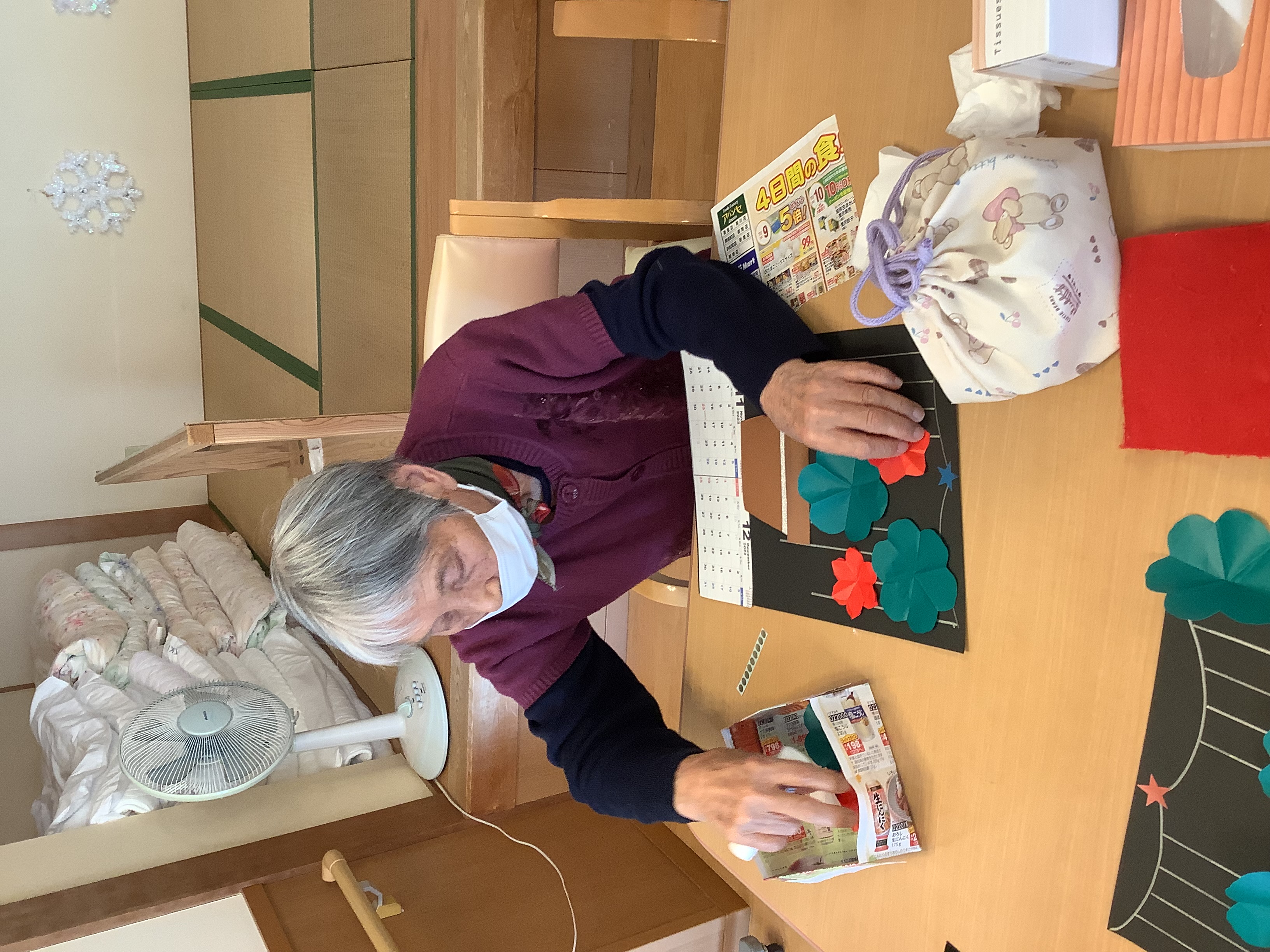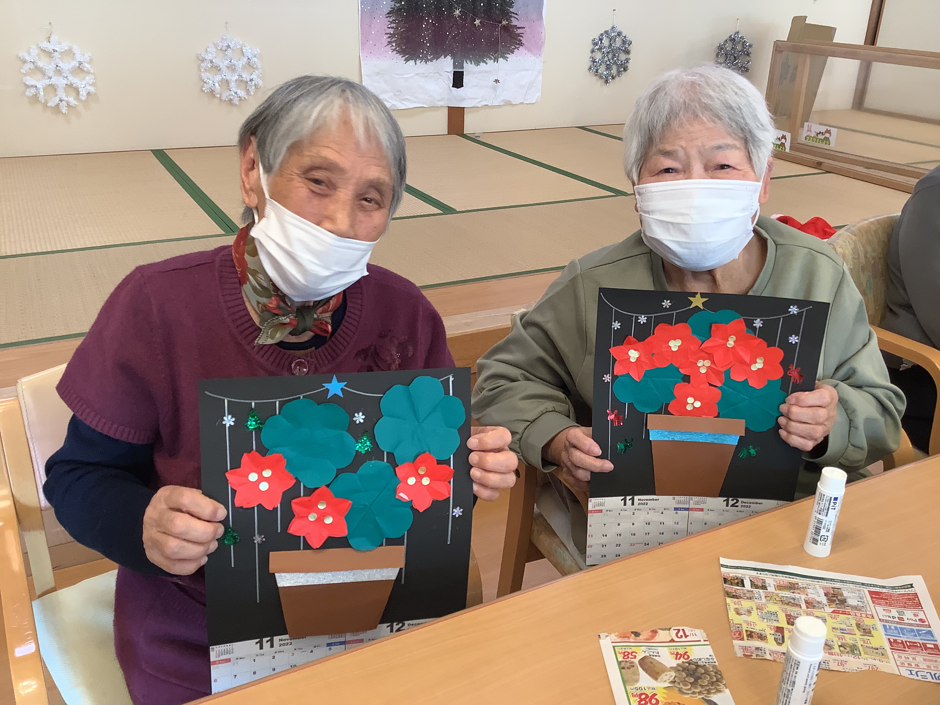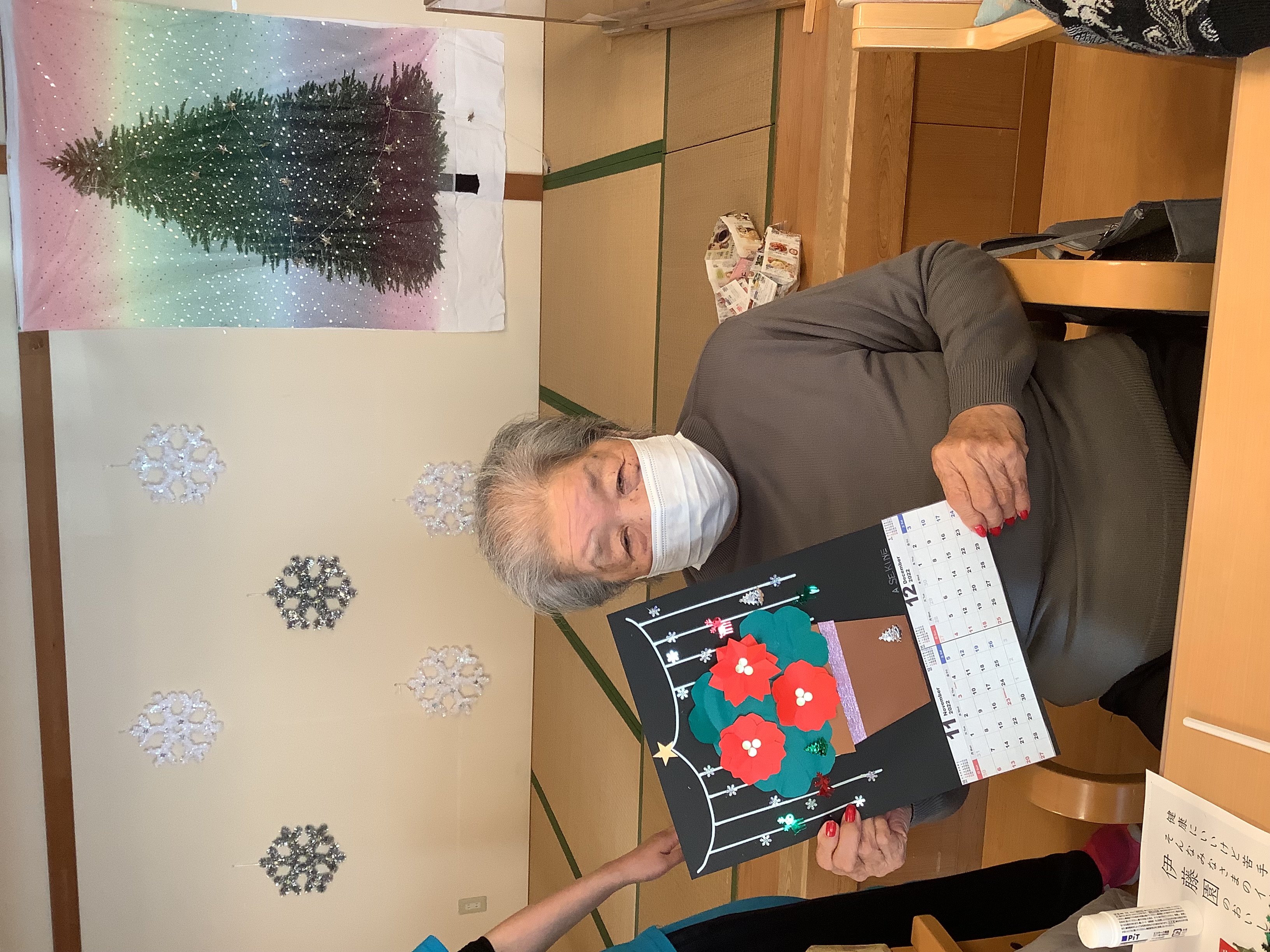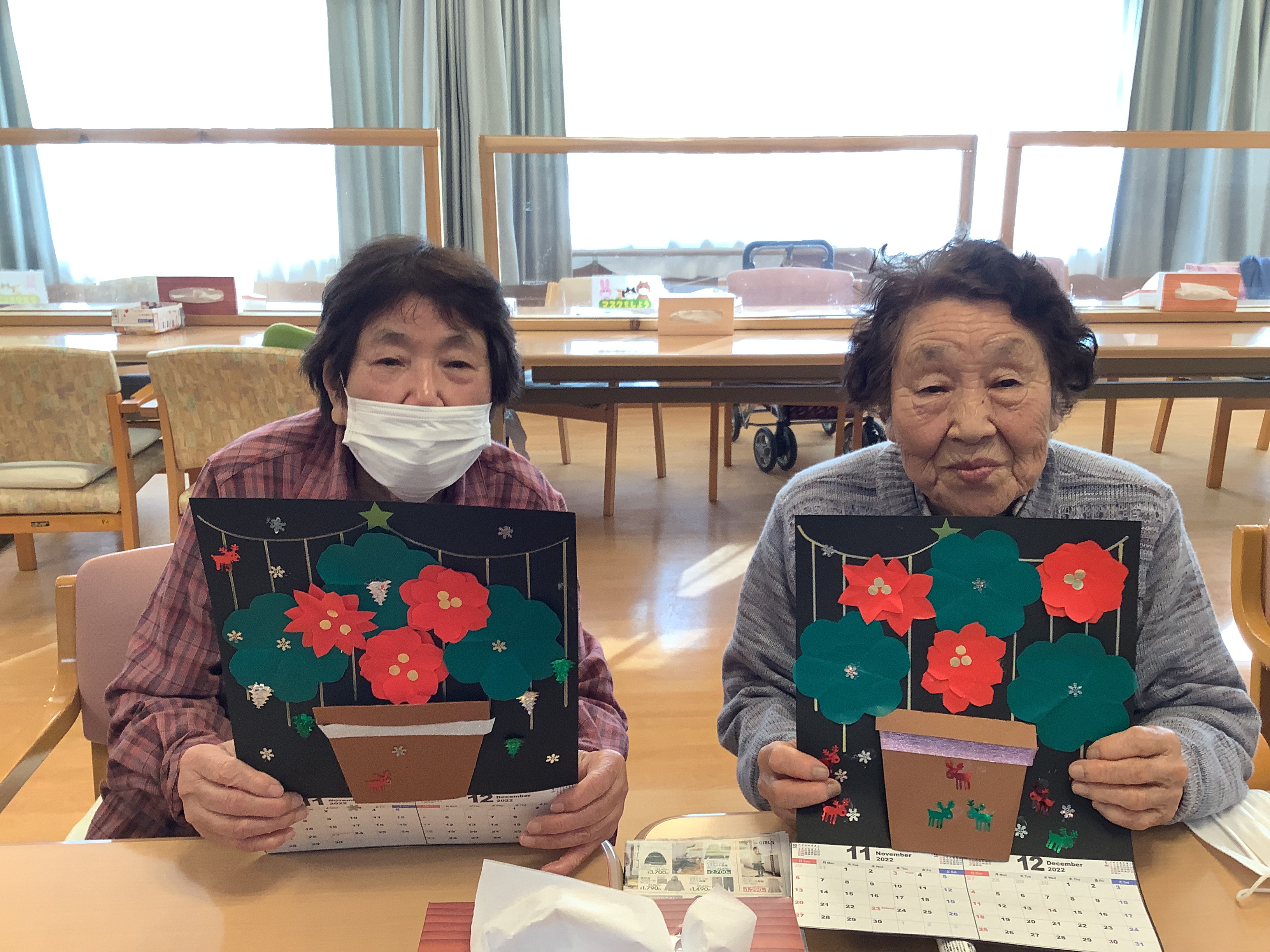 11月12月のカレンダー作りを行いました(*´▽`*) ポインセチアが綺麗なクリスマスらしいカレンダーが出来上がりました☆皆様喜ばれ、自宅に持ち帰りました(*'▽')