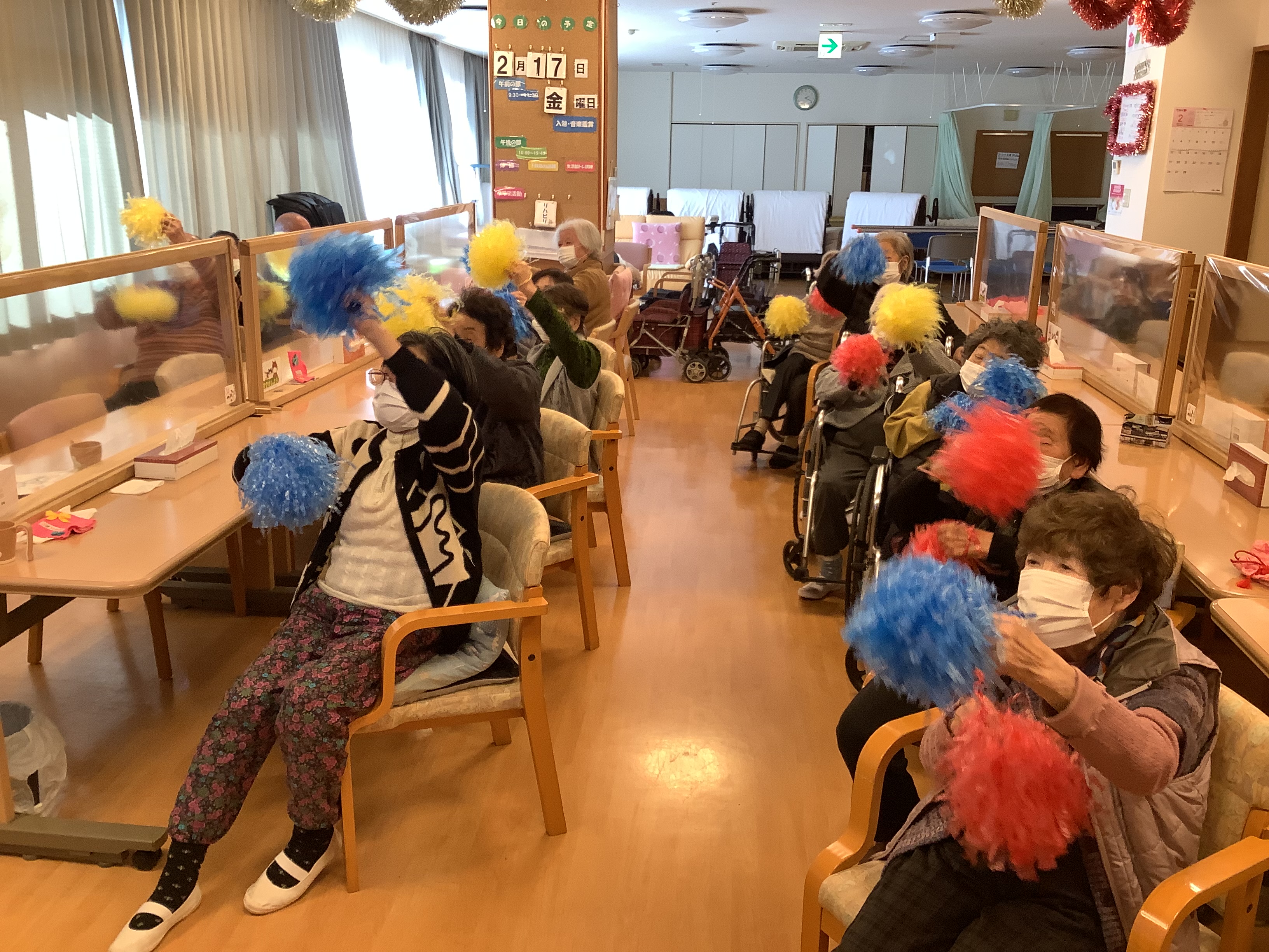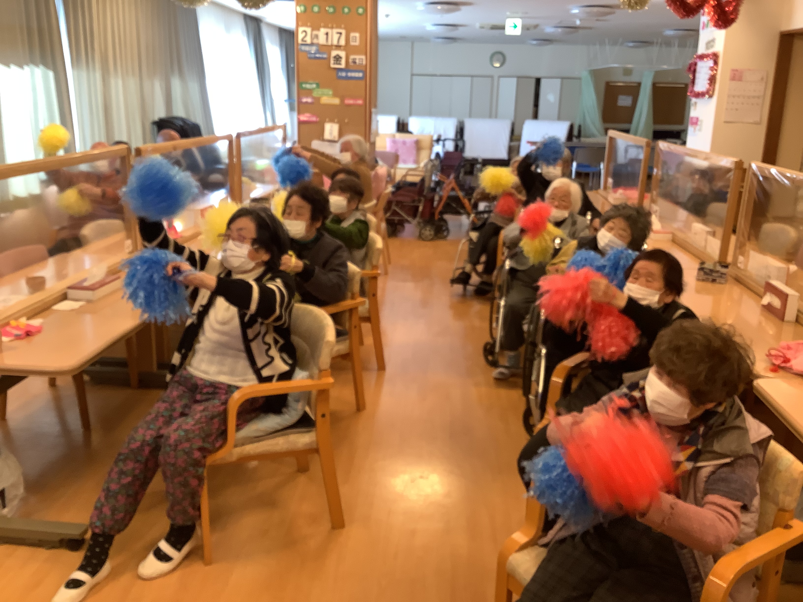 手作りのポンポンを使い、音楽に合わせ体操を行っています( *´艸`) ポンポンを持つだけで気分も変わり華やかになります♪
