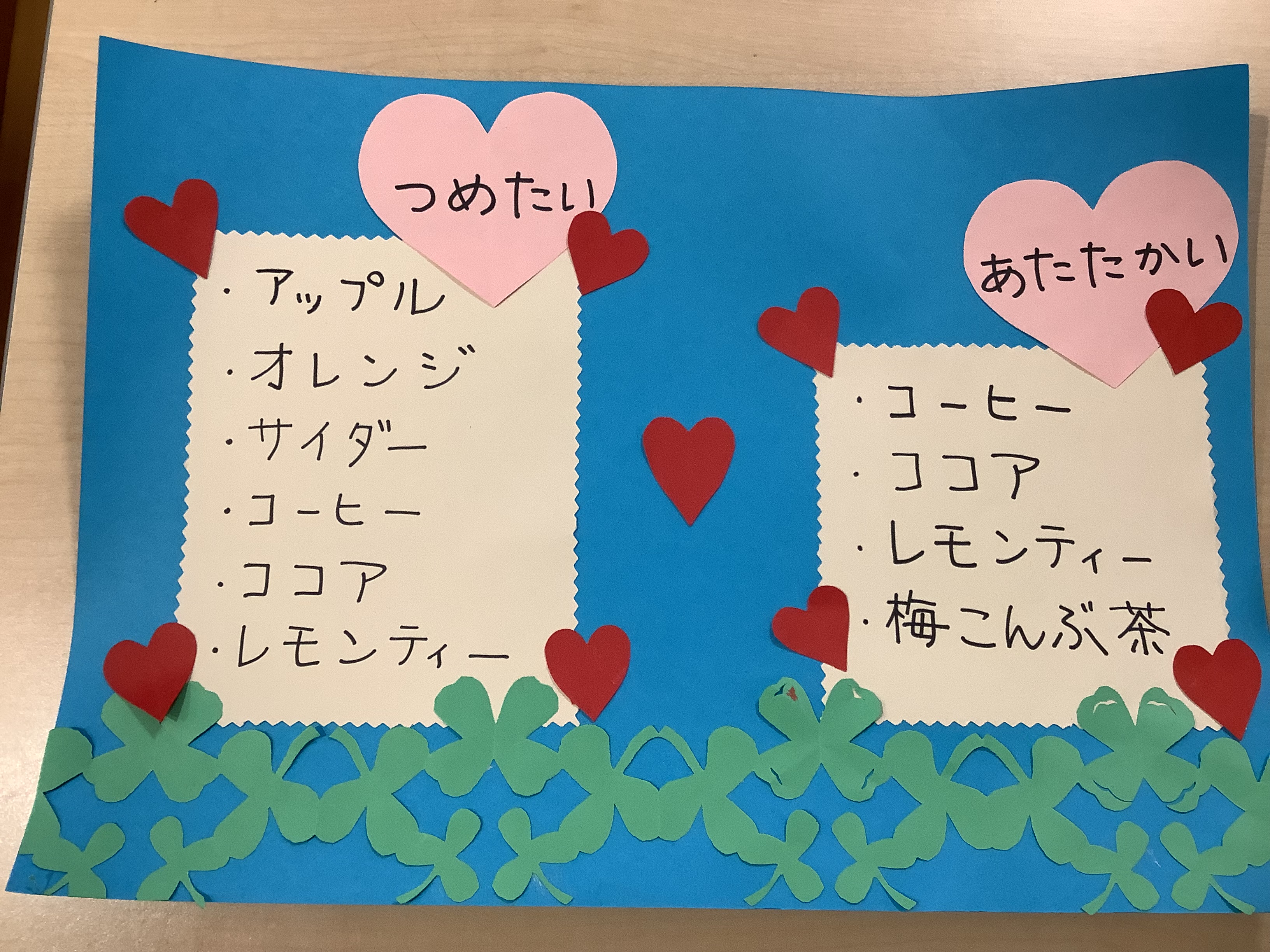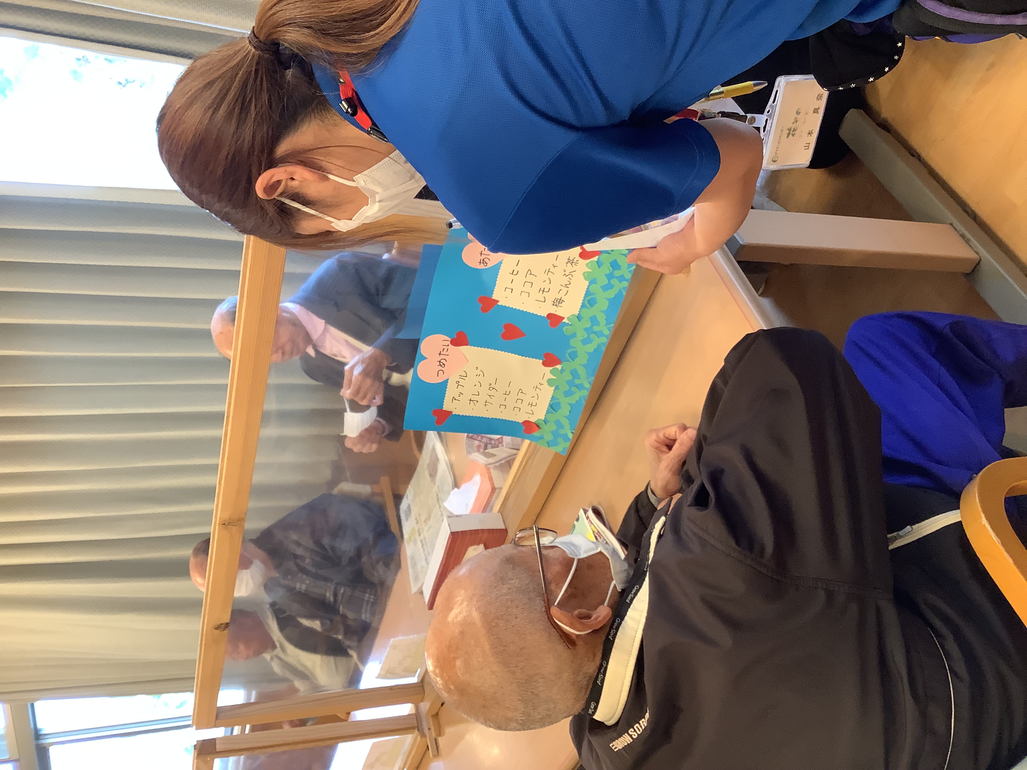 デイサービスのおやつに時間に飲み物レクを行いました♪ メニューの中からお好きな飲み物を選んで頂き提供させて頂きました!(^^)!一番人気は・ホットコーヒー・リンゴジュースでした♪ サイダーやココアも人気でした♪