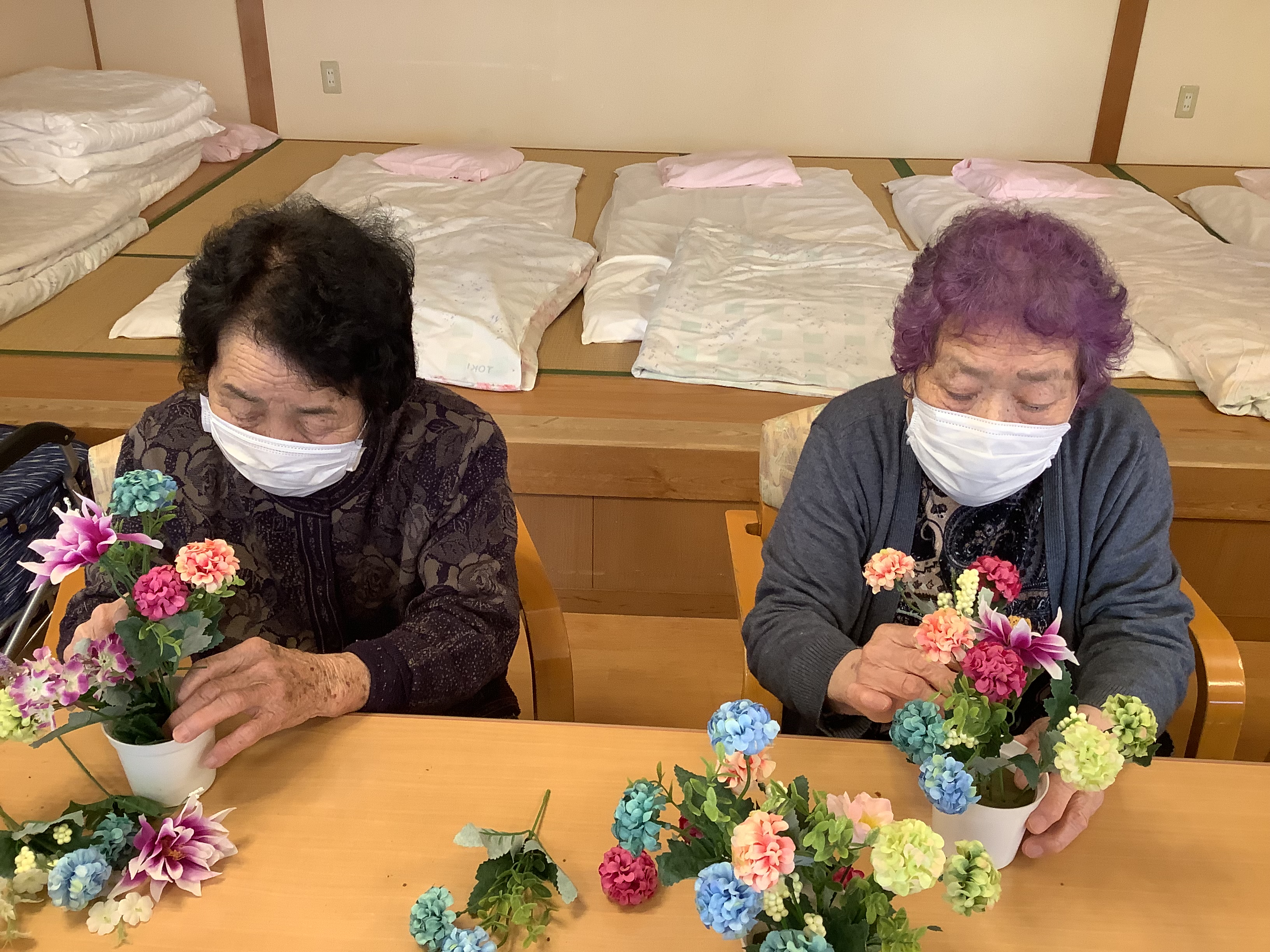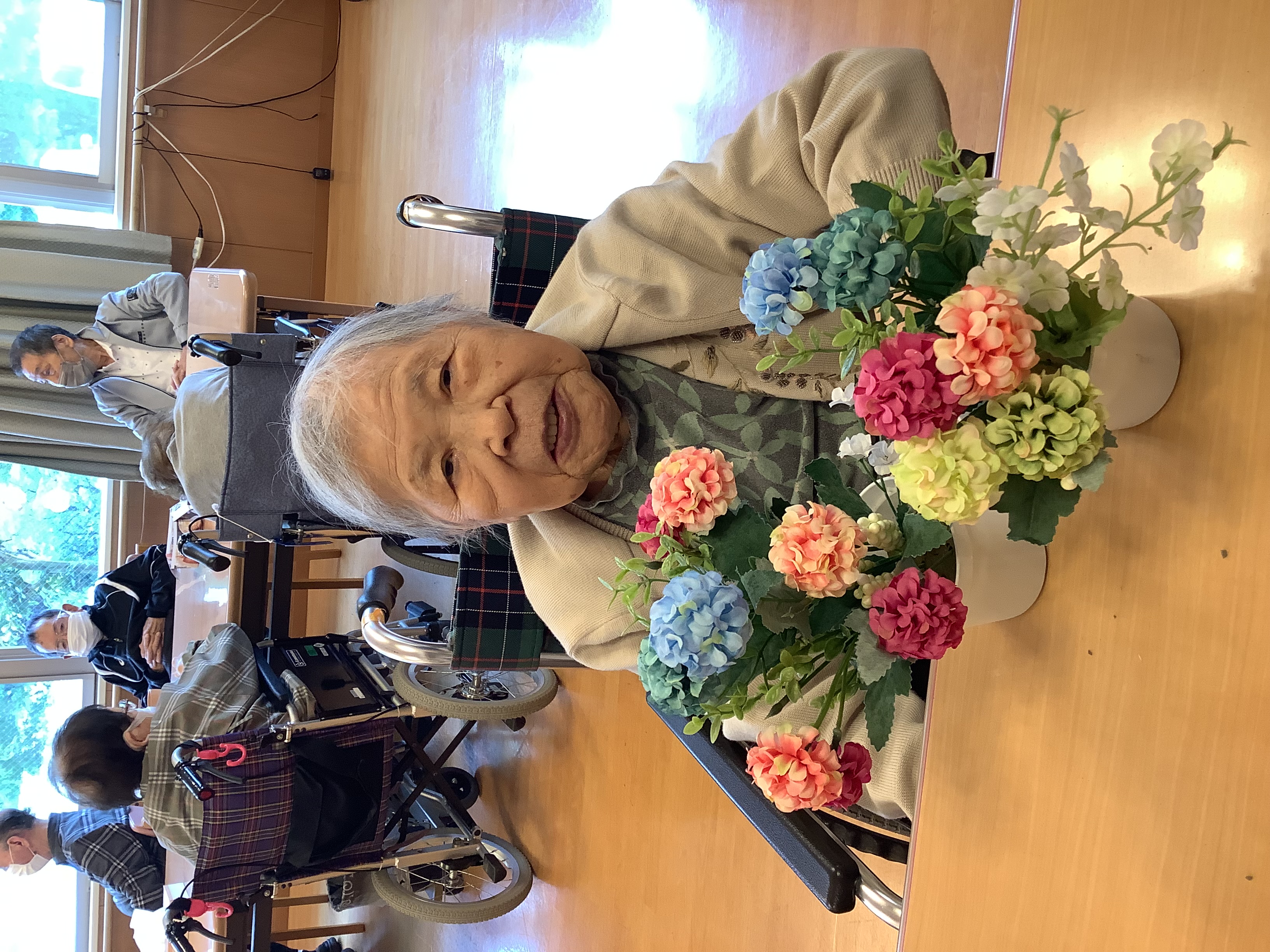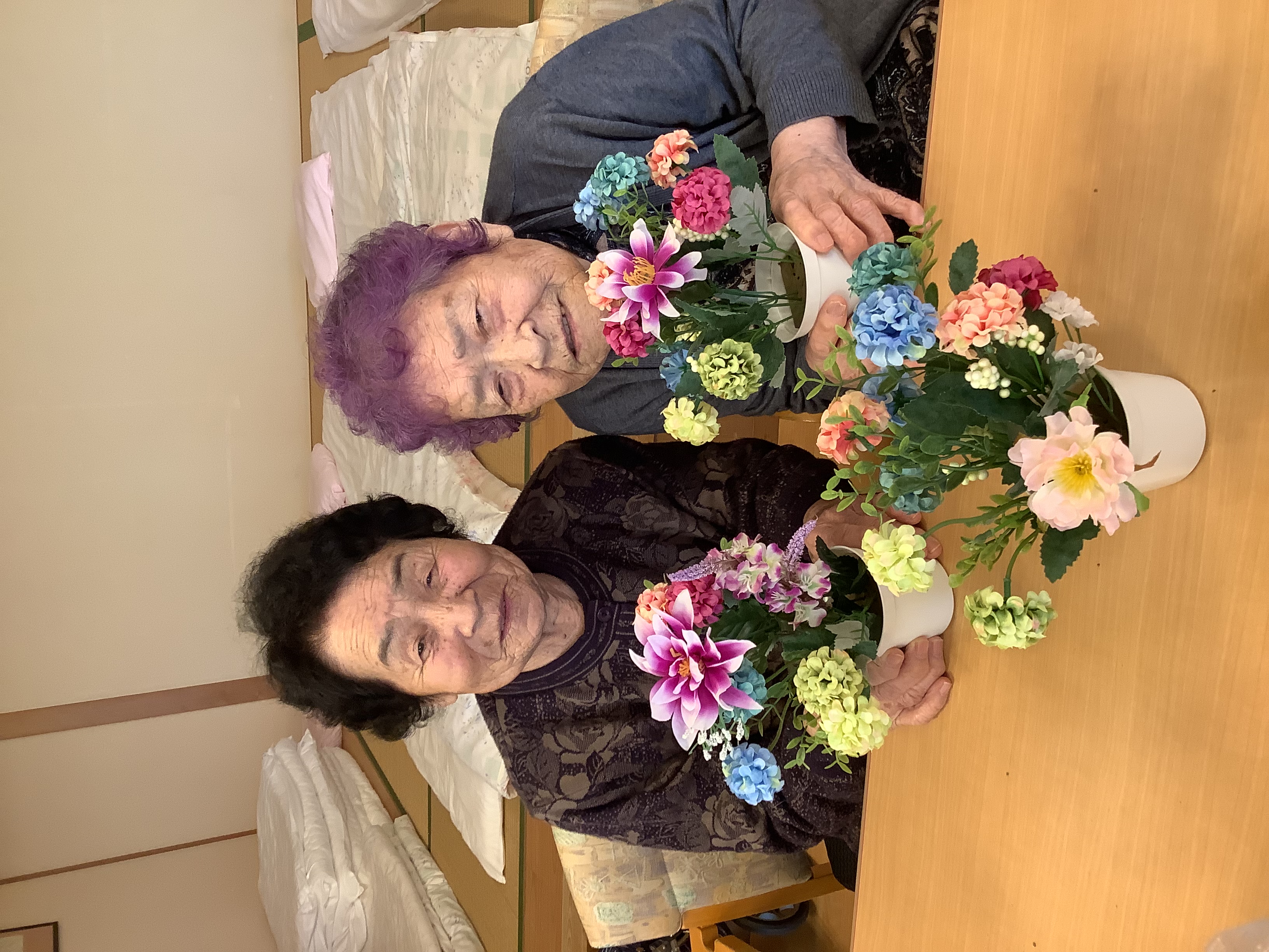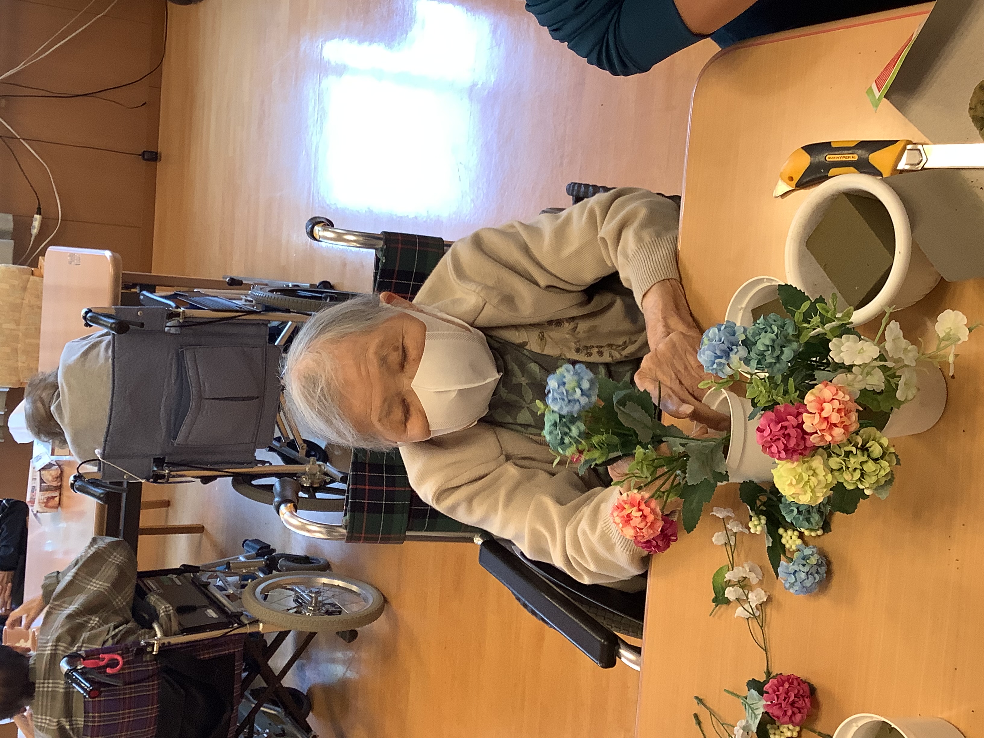 季節のお花を使いフラワーアレンジメントを行いました♪ デイサービスセンター入り口に飾ってあります(^^)/