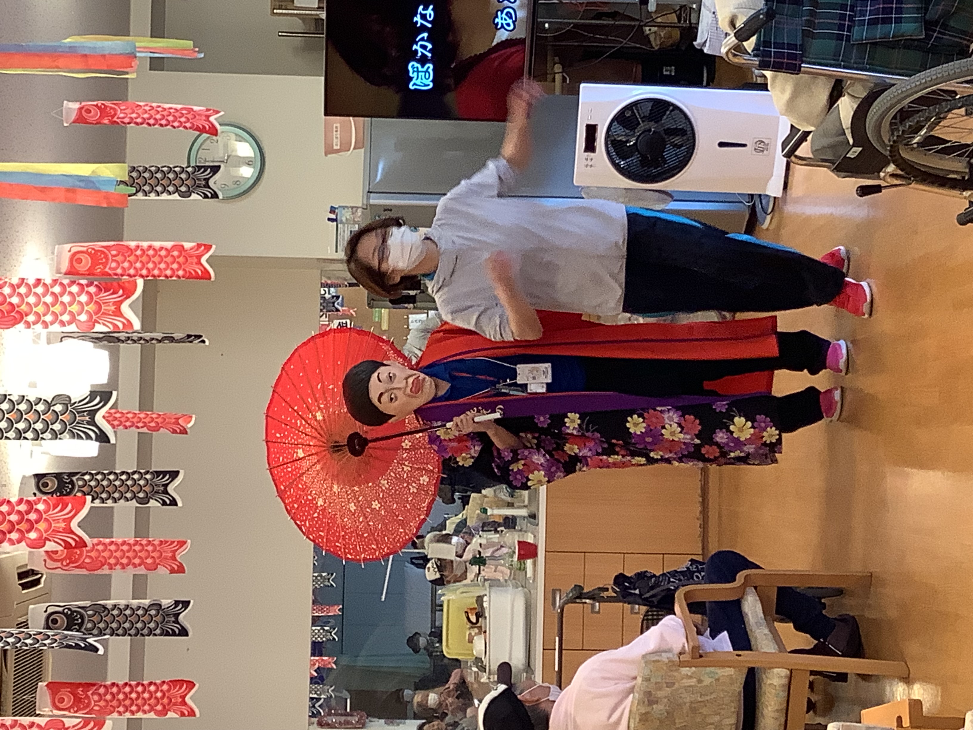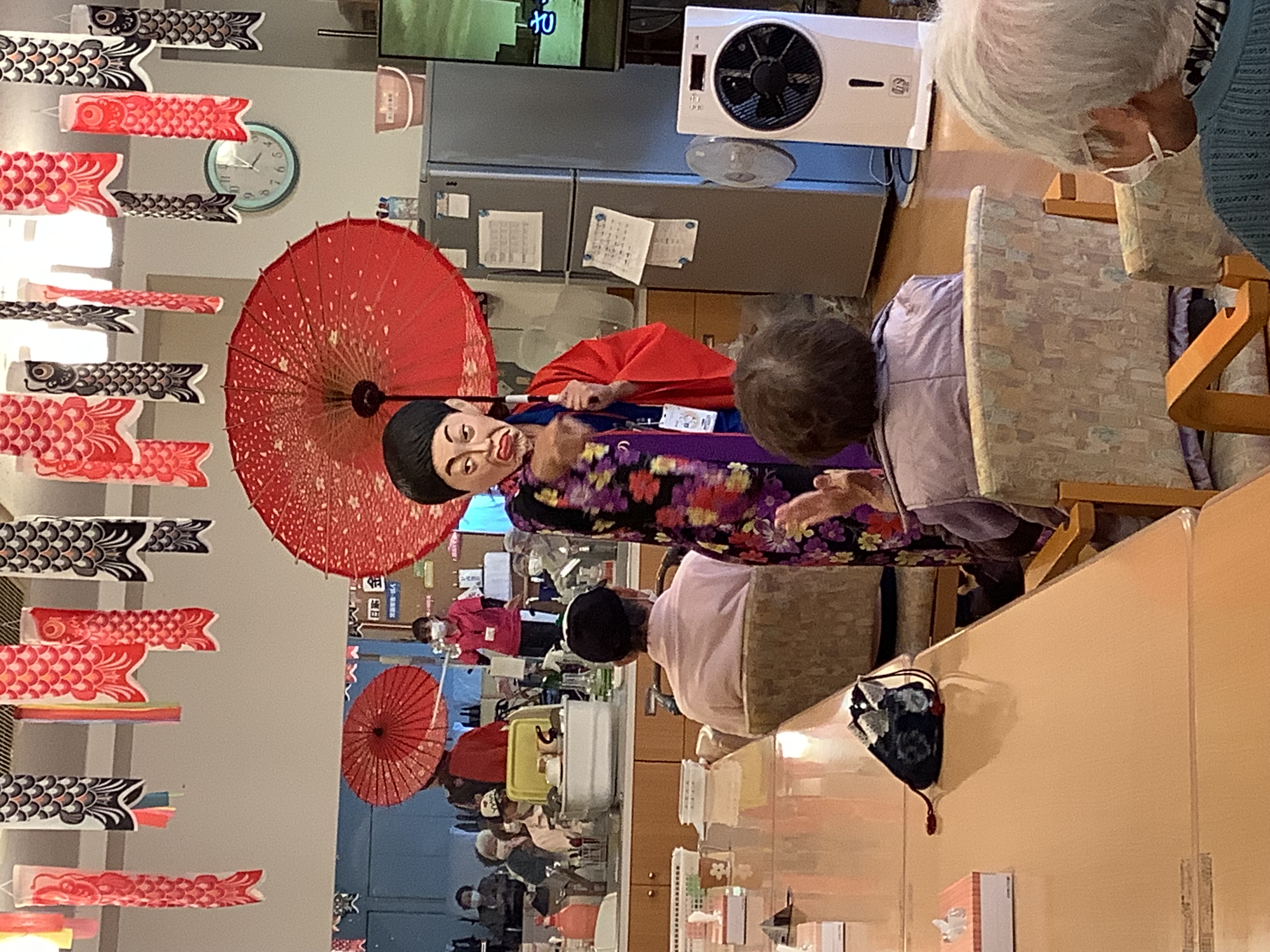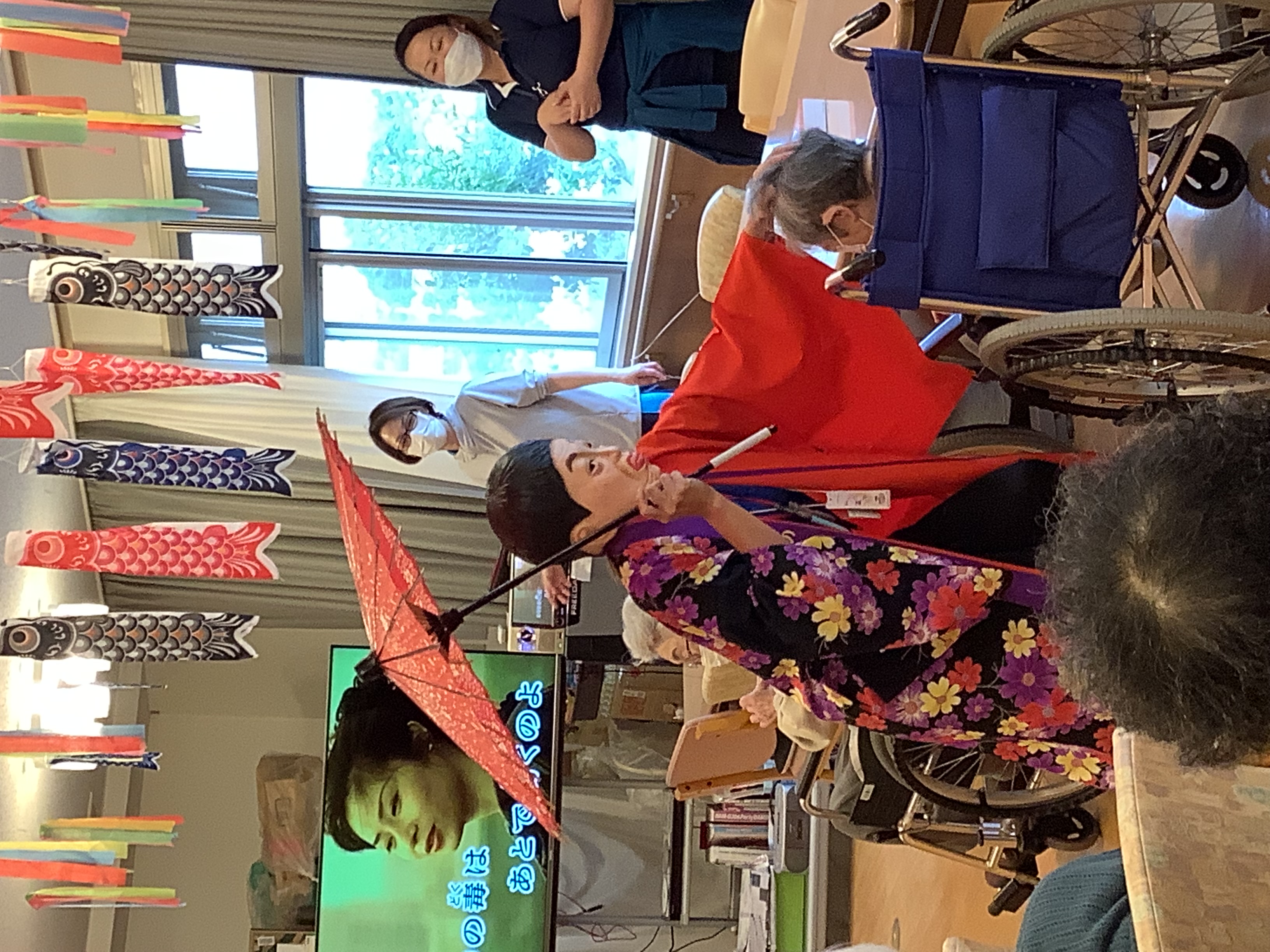 夕方のカラオケの時間に突如現れた美川憲一に利用者様方は大笑い♪ 「誰なんだい、あれは」「本物なの?」と盛り上がっていました。正体は秘密にしてあります( *´艸`)