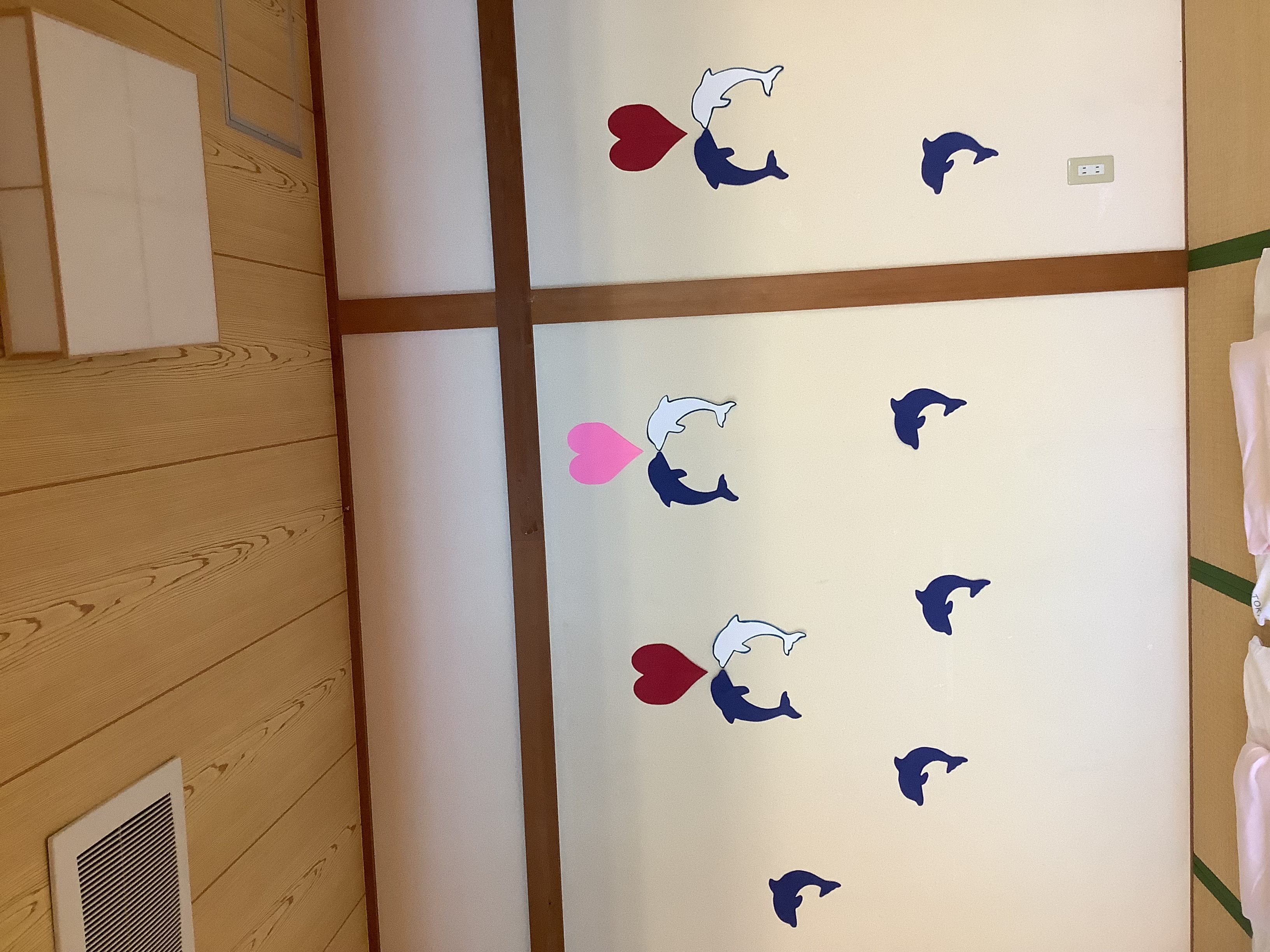 デイルーム内が段々夏らしくなってきています(*'▽')まずは涼しげなイルカの壁面で♪