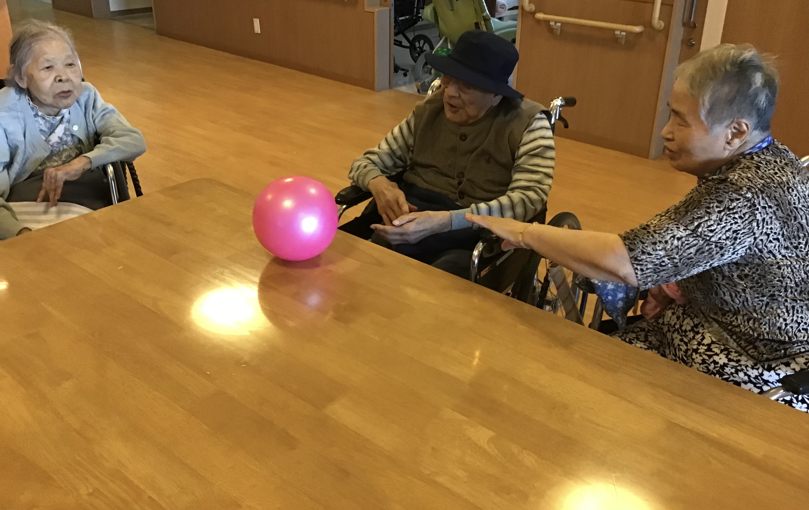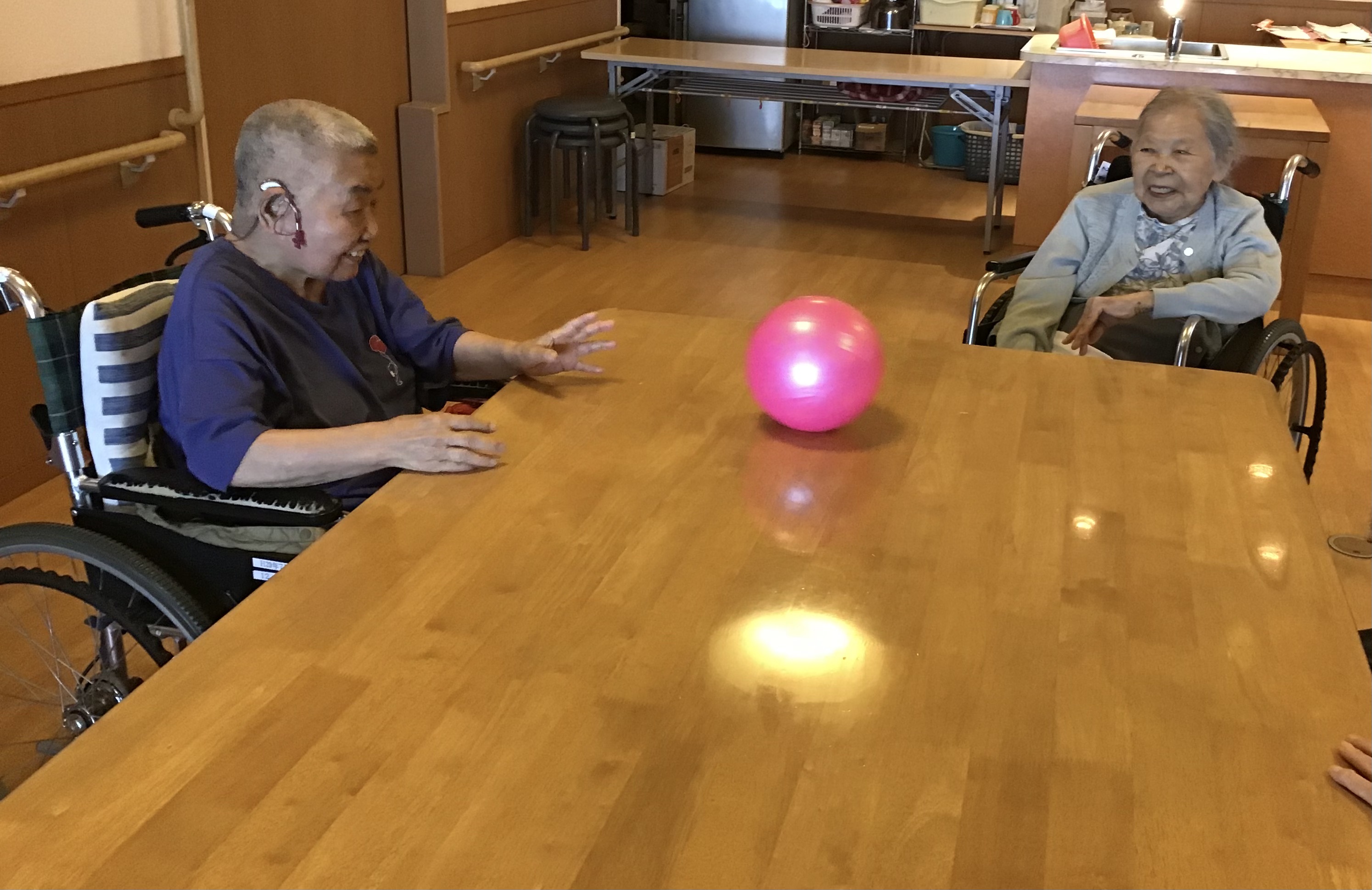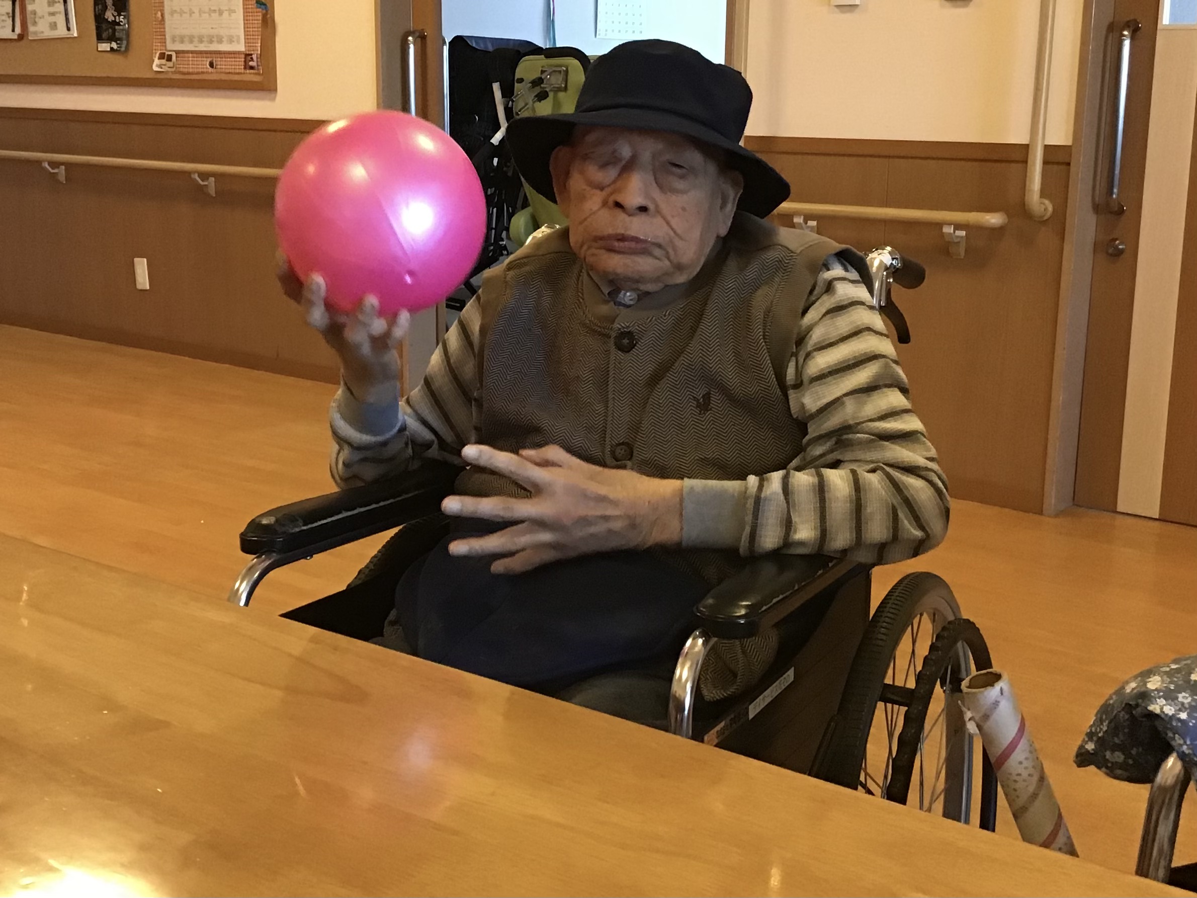 テーブルの上でボールを転がすだけですが、皆さん落とすまいと目でボールを追いかけ、自分の近くにボールが来ると手を伸ばしていました(*^-^*)