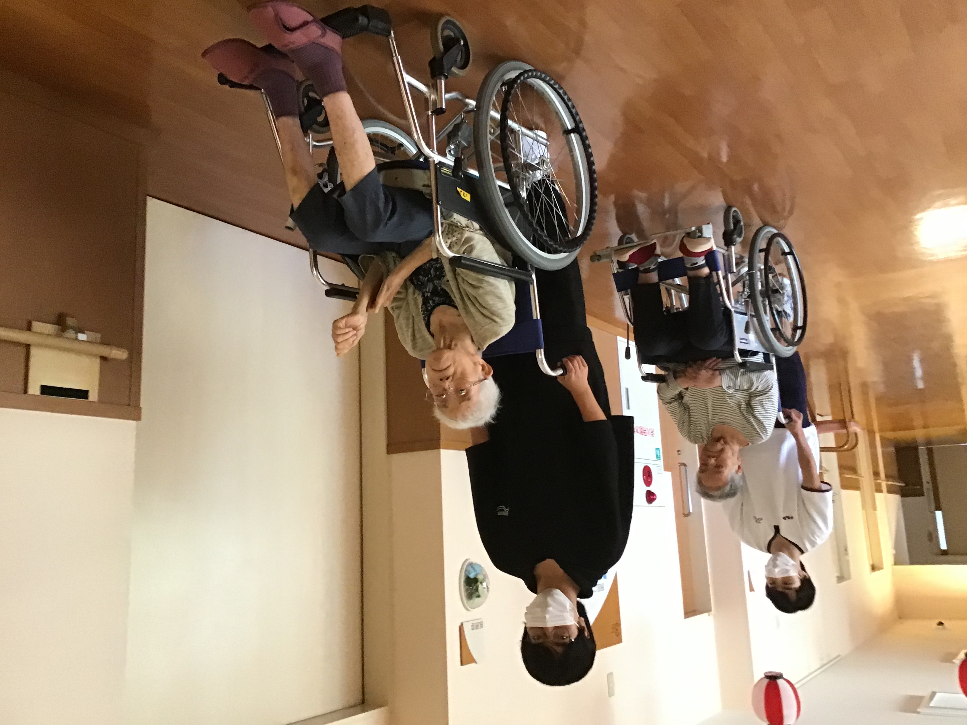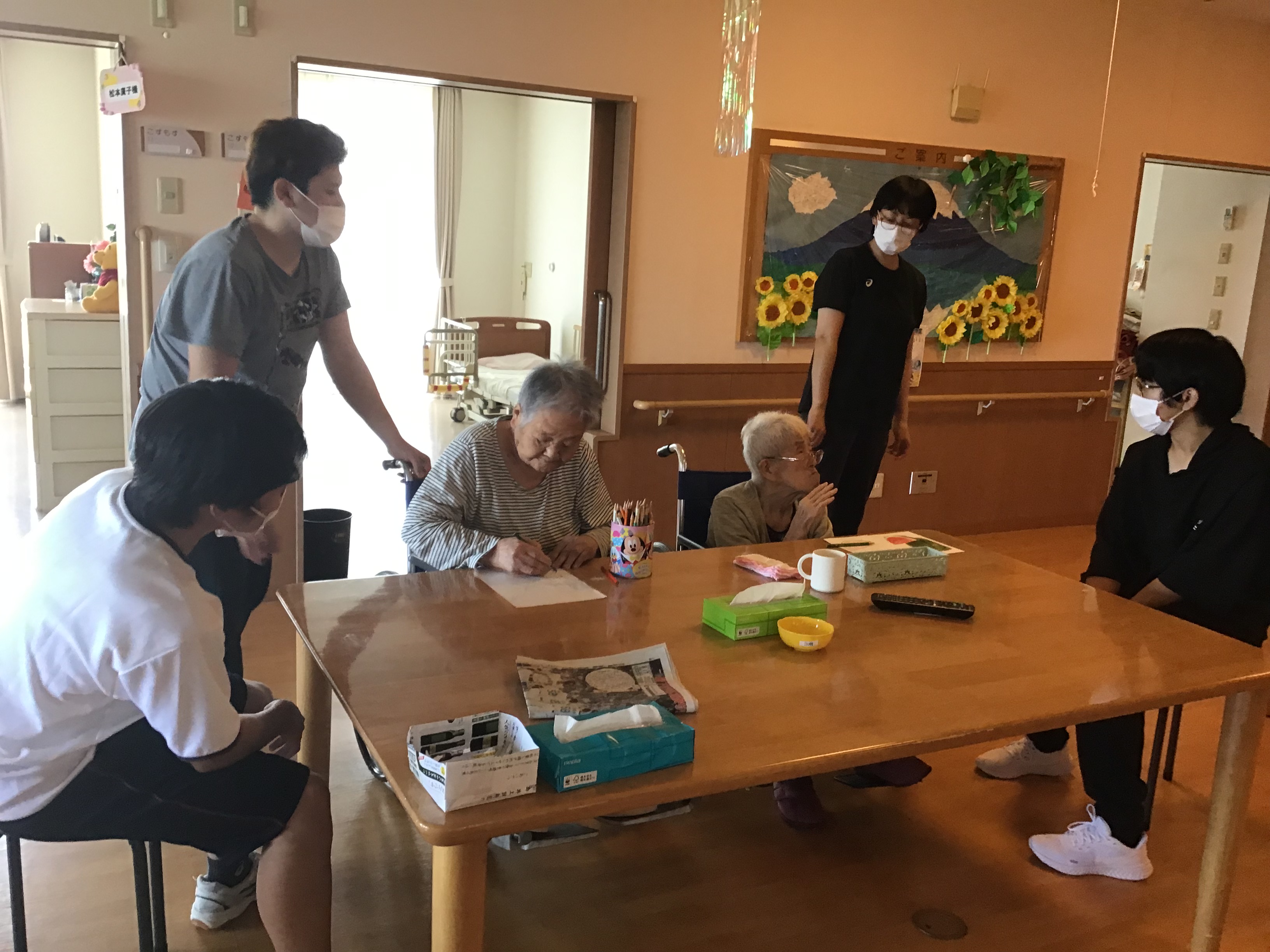 一緒にゲームしたり車椅子を押して頂き施設内ツアーをしたりコンテストへ出す塗り絵をしたり・・・