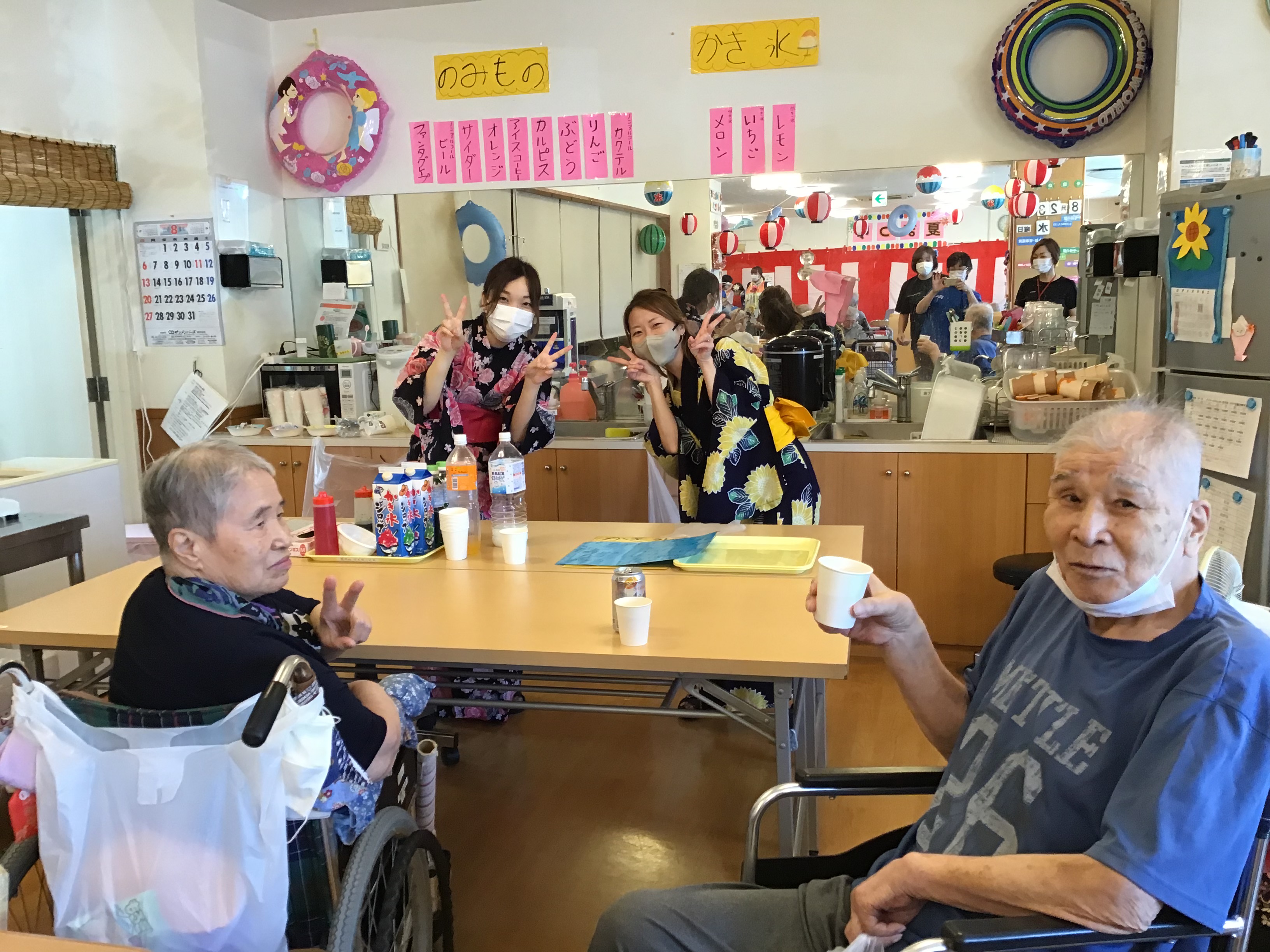 ヨーヨー釣りや缶倒しゲーム、落書きせんべいと色々体験していただき夏祭り気分を味わっていただきました!