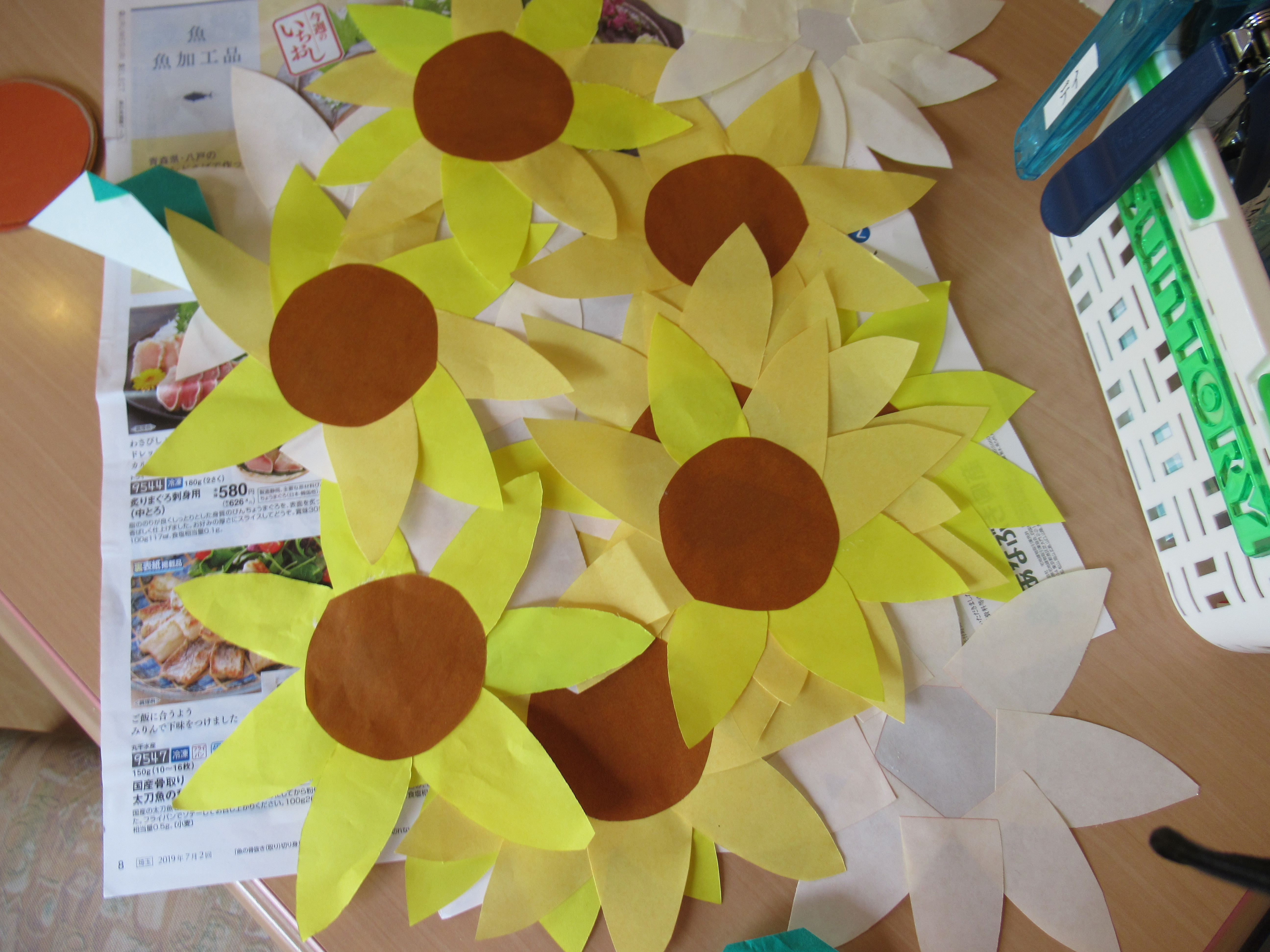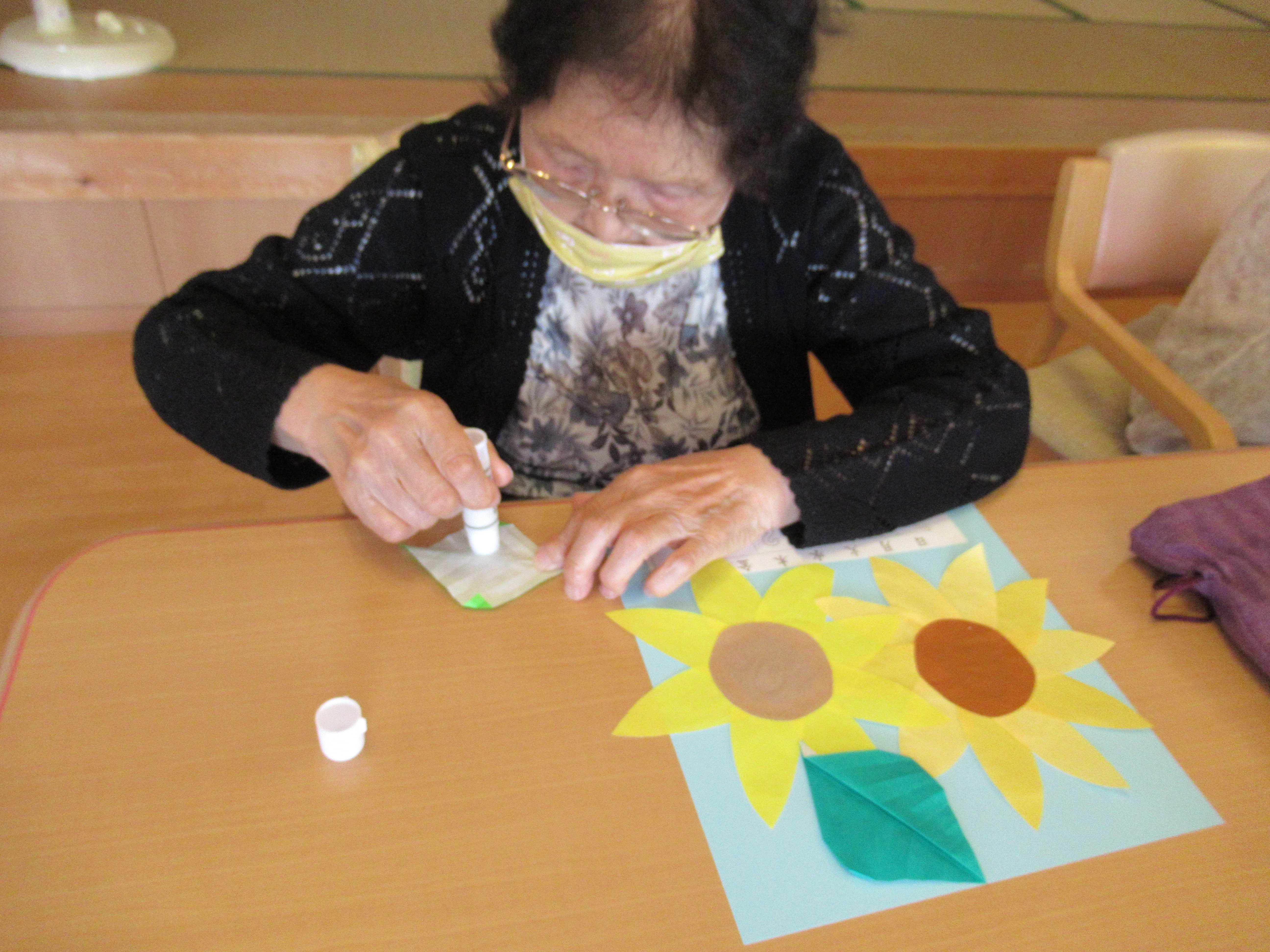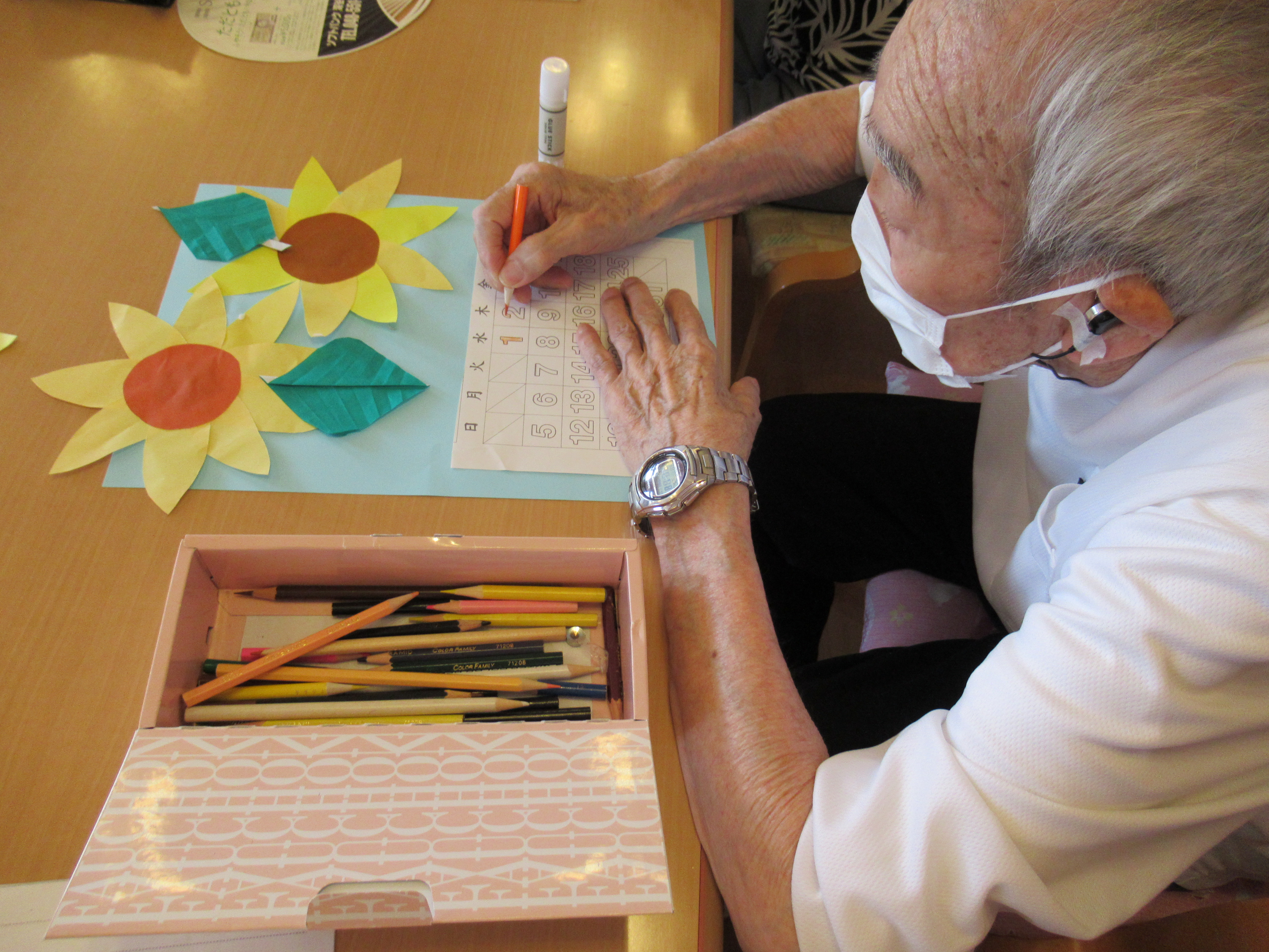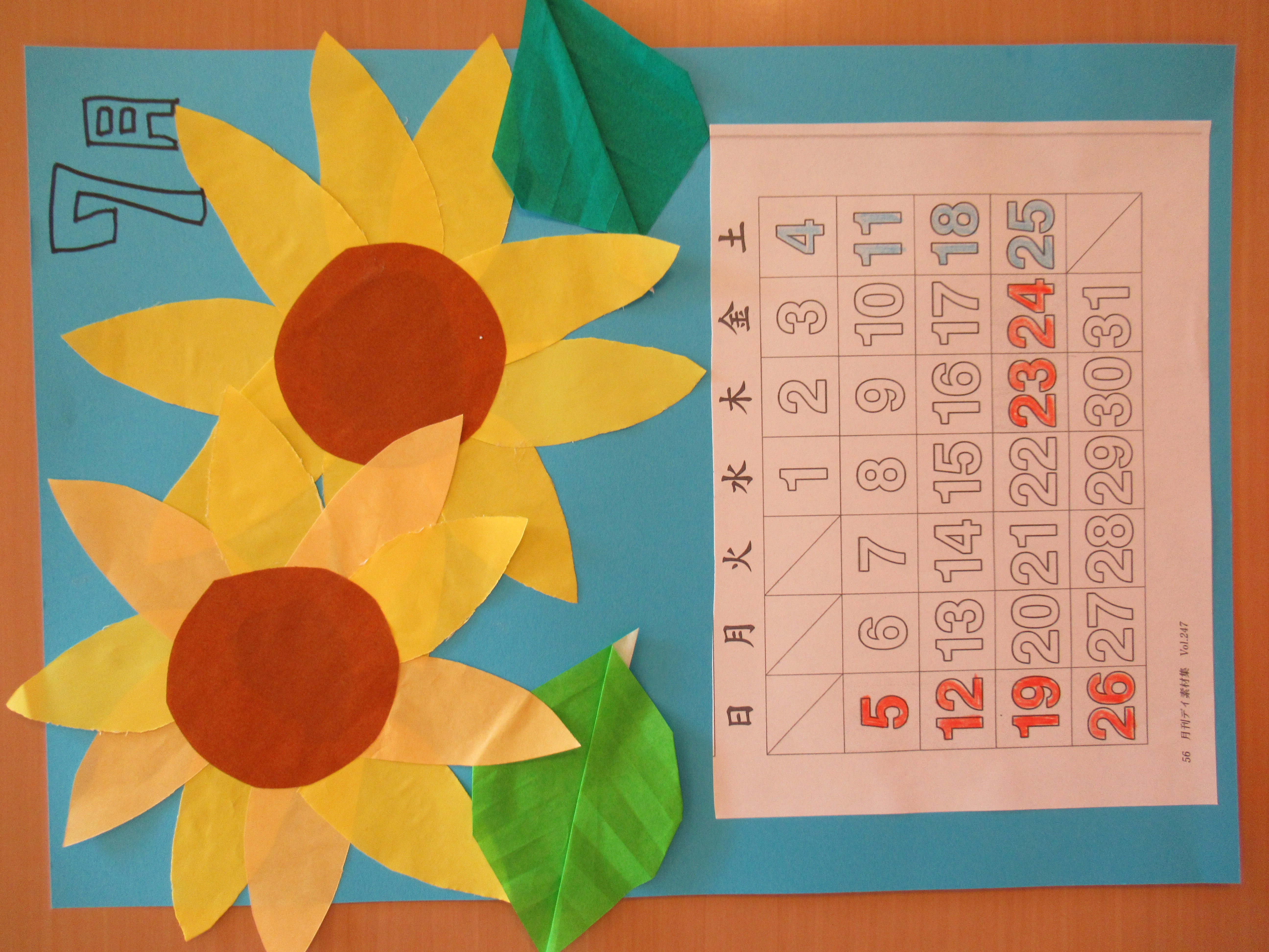 デイサービス毎月恒例のカレンダー作りを行いました(^^)/ 折り紙で作ったヒマワリと葉っぱを空のような青い画用紙に貼って、夏らしい7月カレンダーが出来上がりました♪