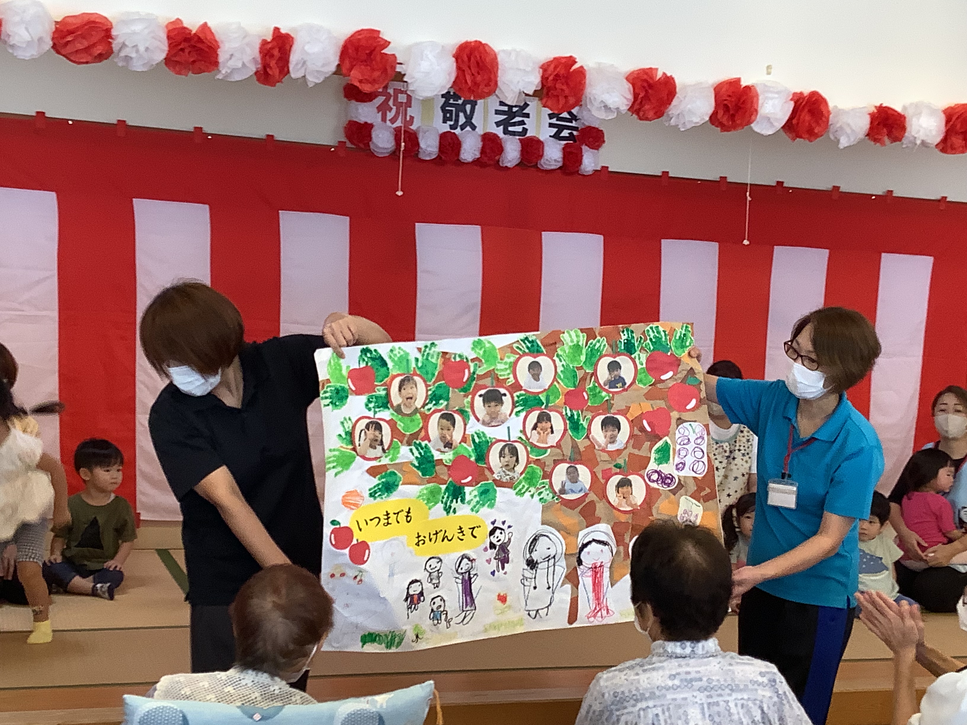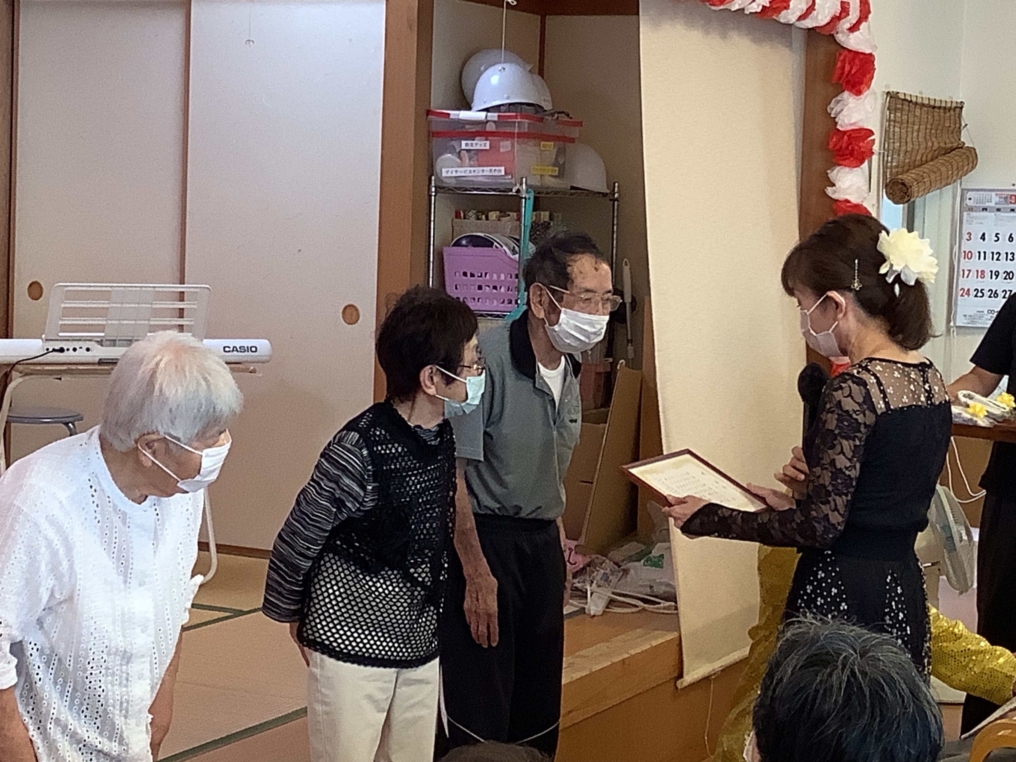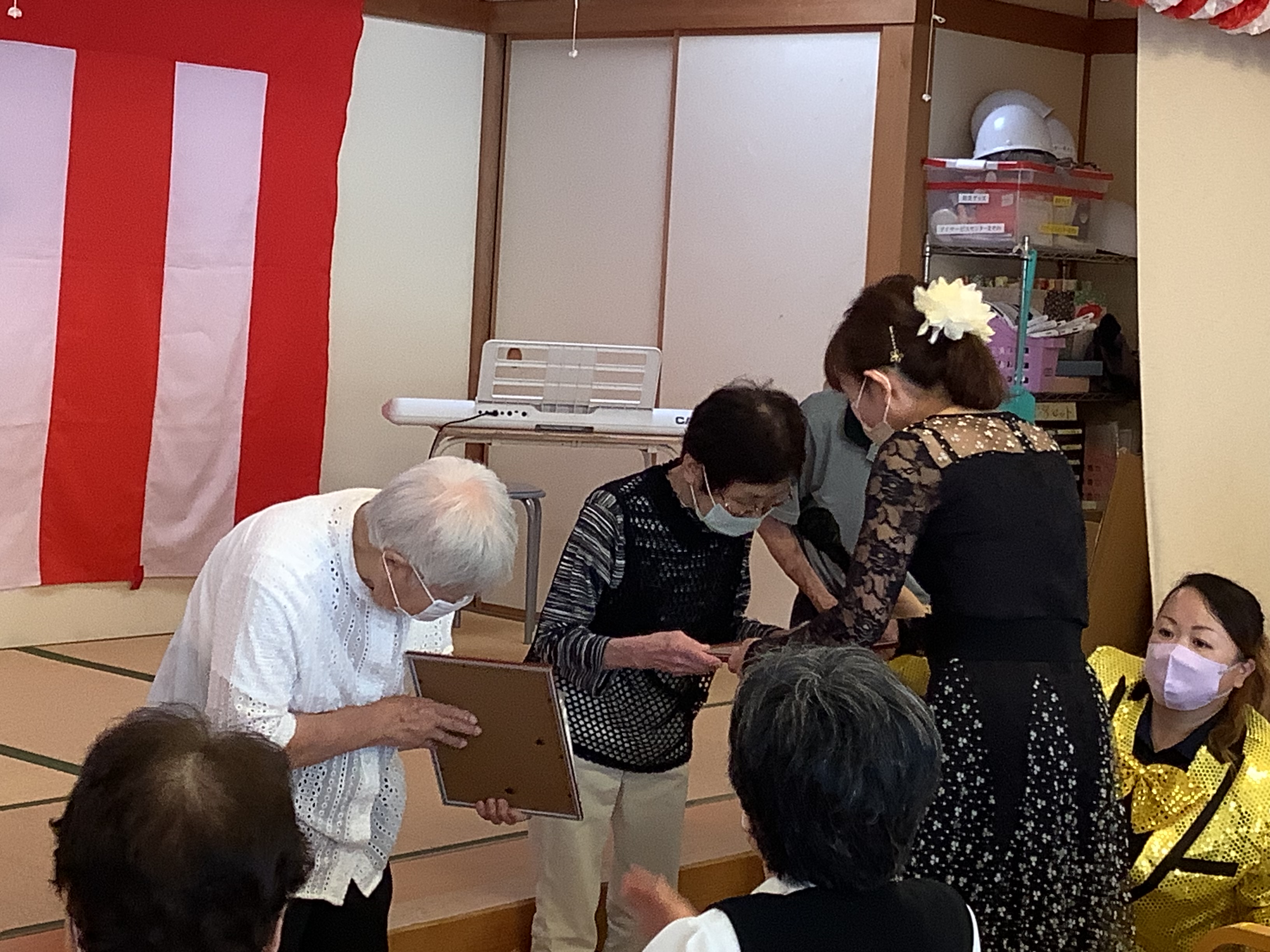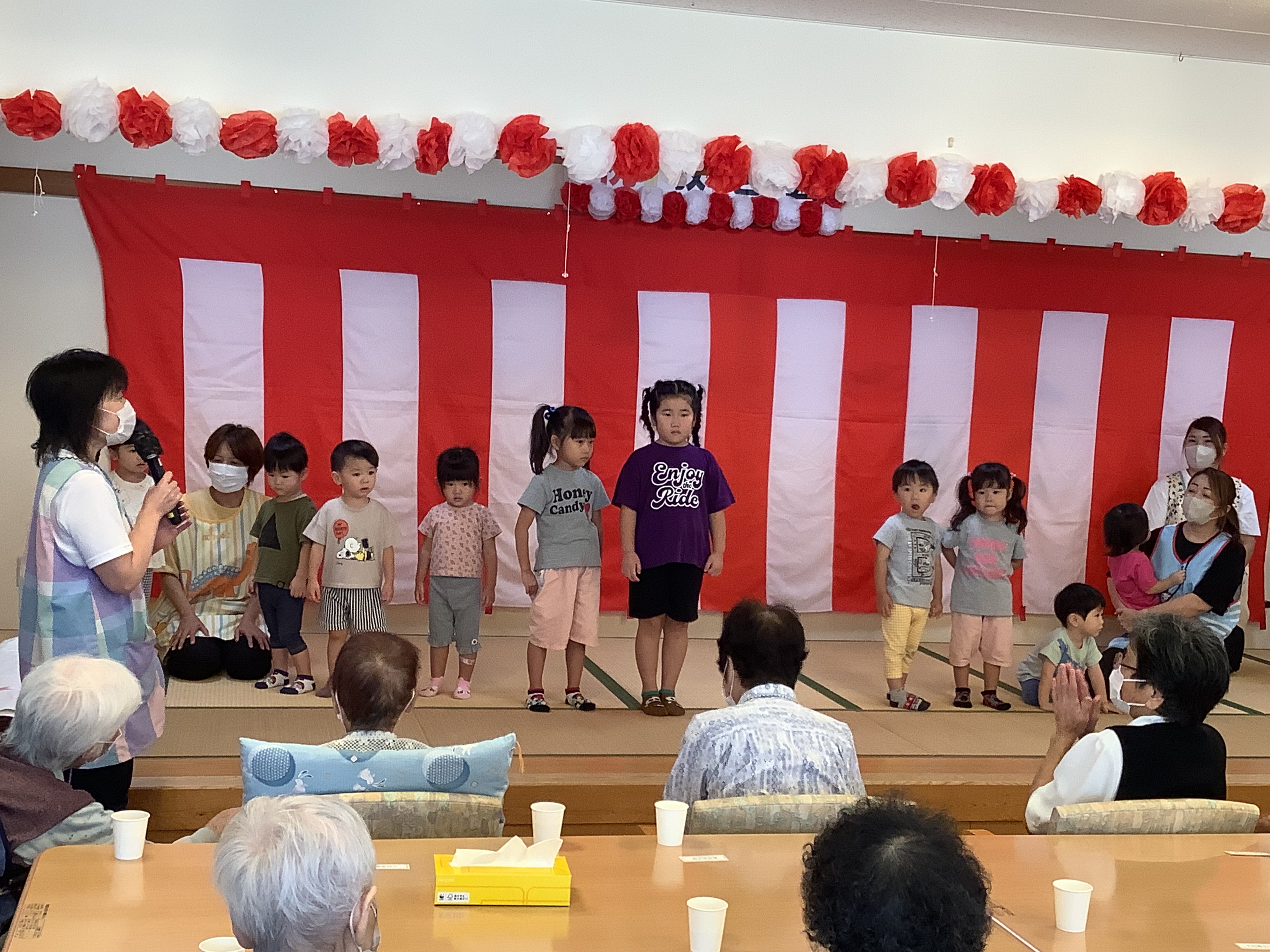 9/15に敬老会を行いました。なないろ保育園の園児も歌やプレゼントを用意し遊びに来てくれました。米寿、卒寿の方のお祝い、表彰もさせて頂きました(^^♪