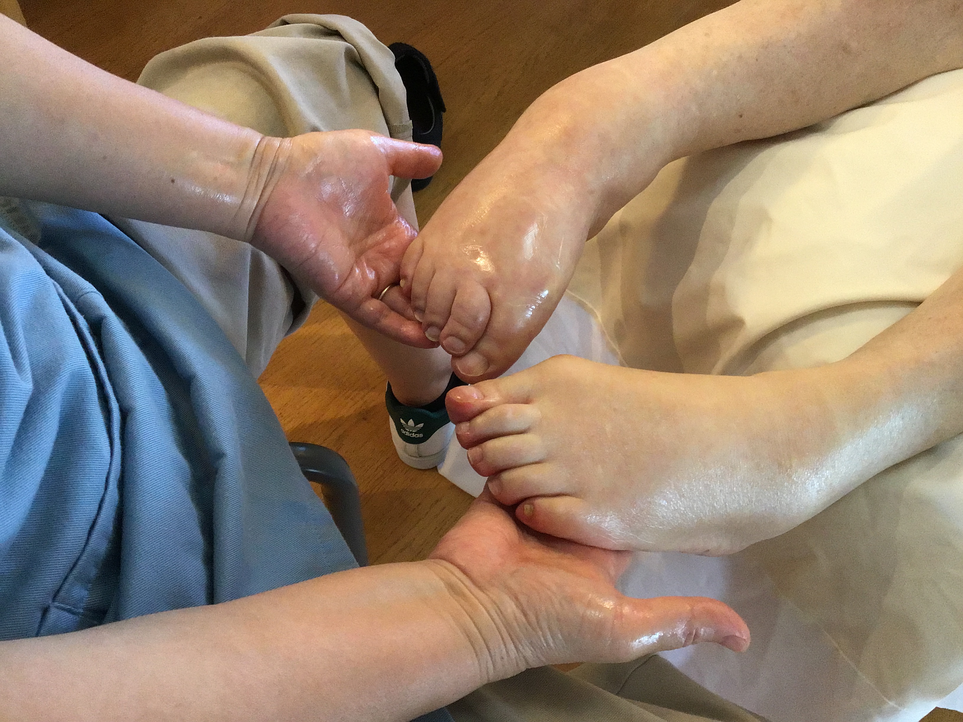 足が浮腫んでしまっている利用者様にオイルでリンパマッサージを行いました。