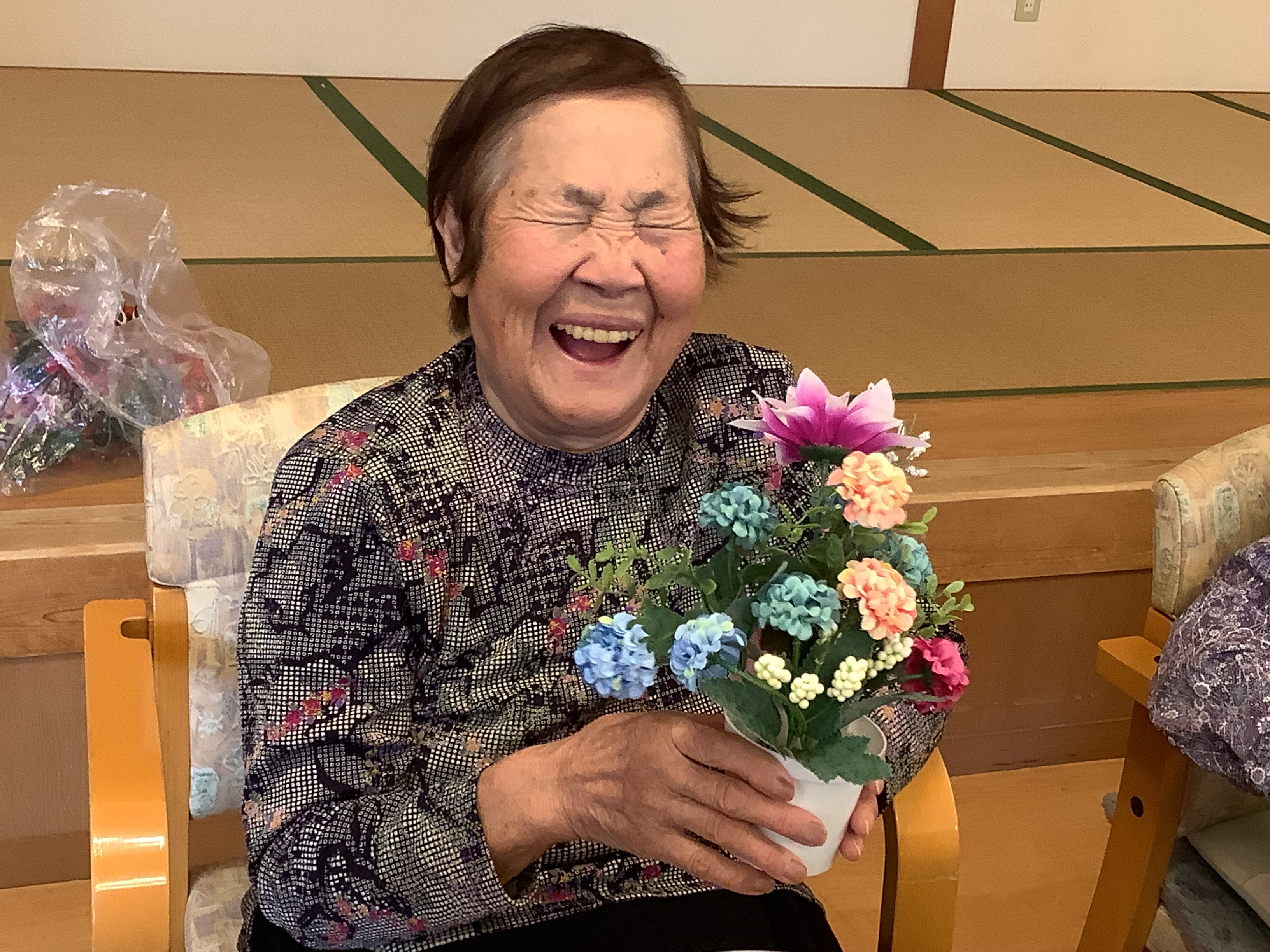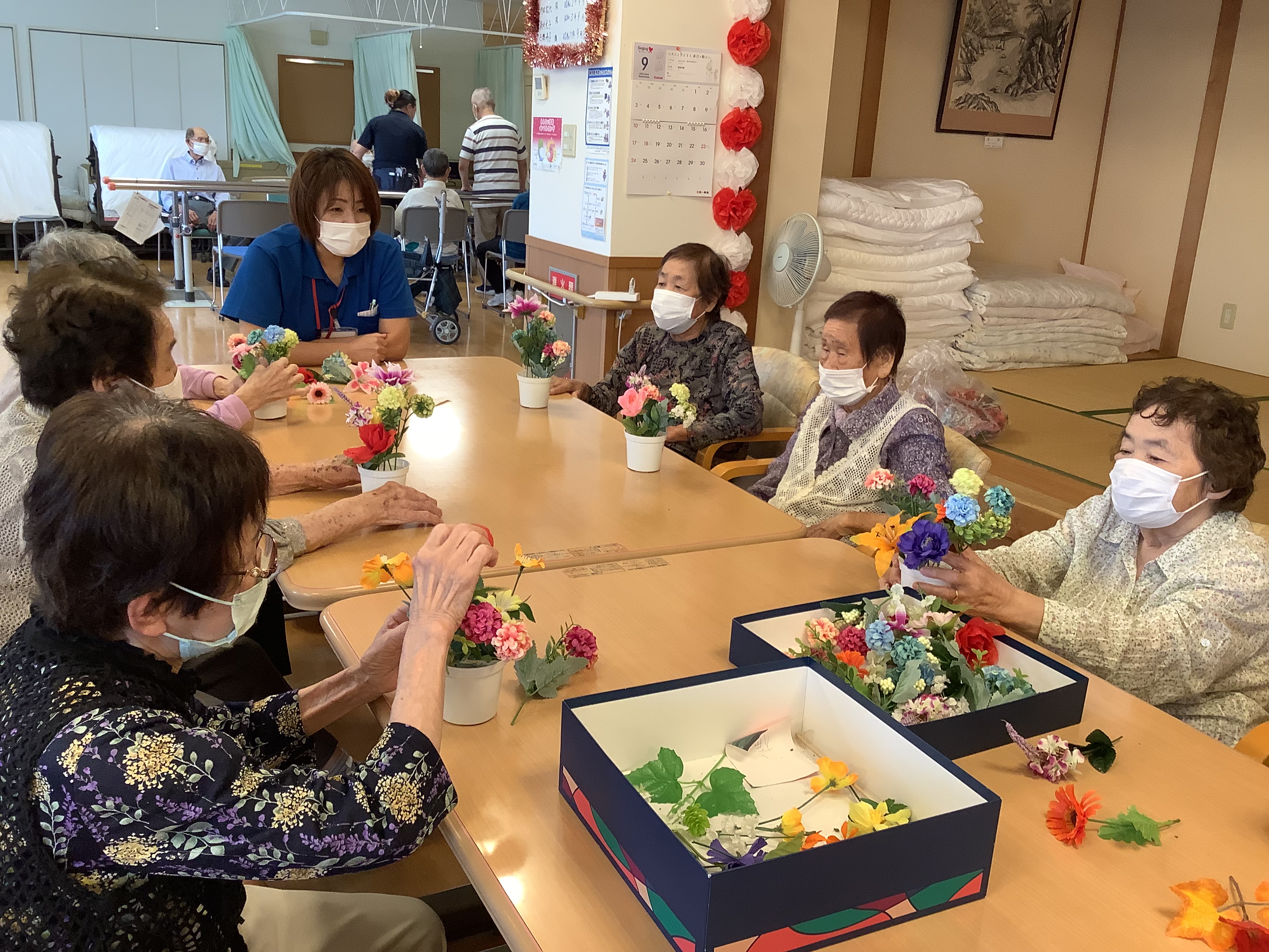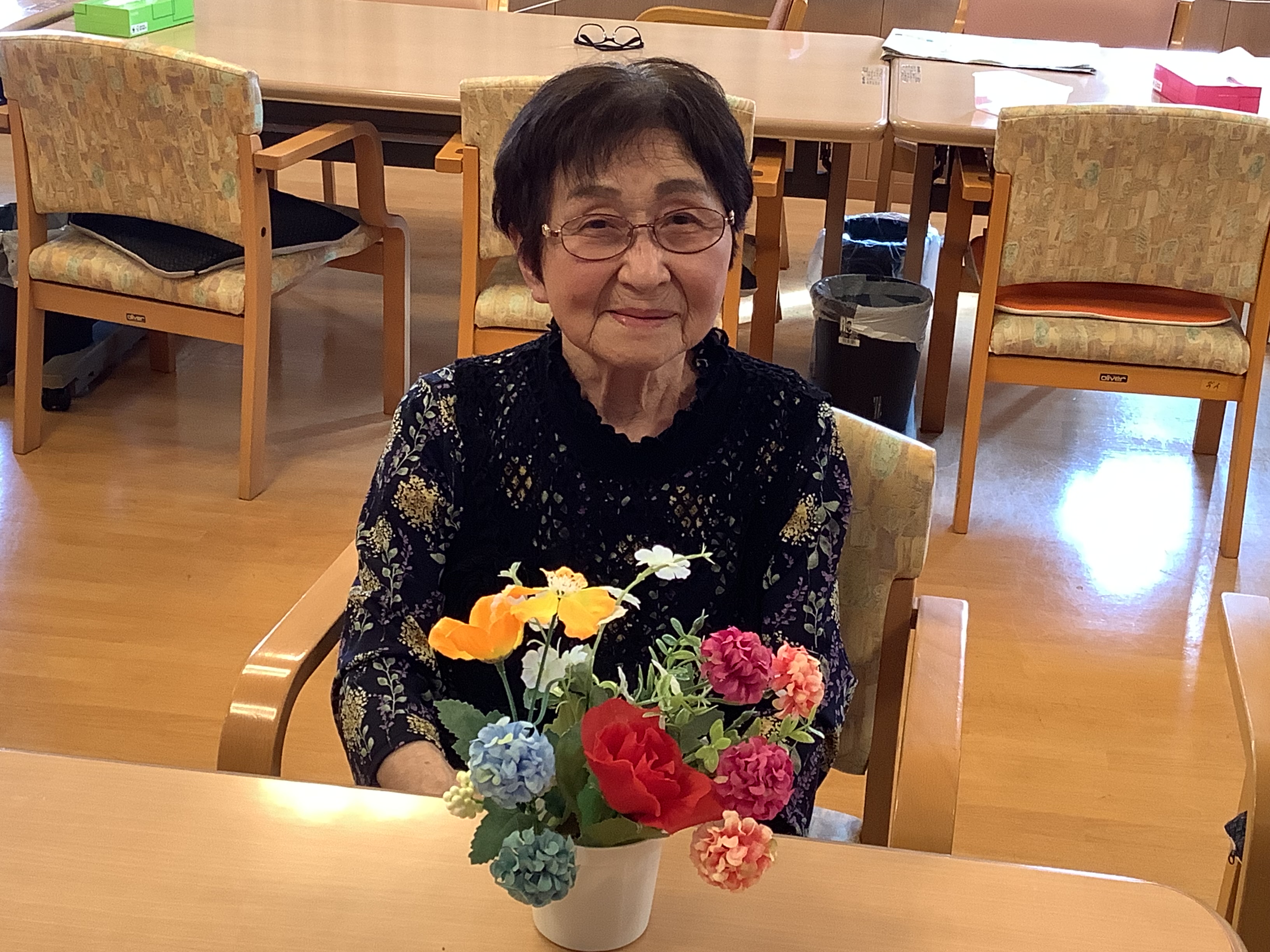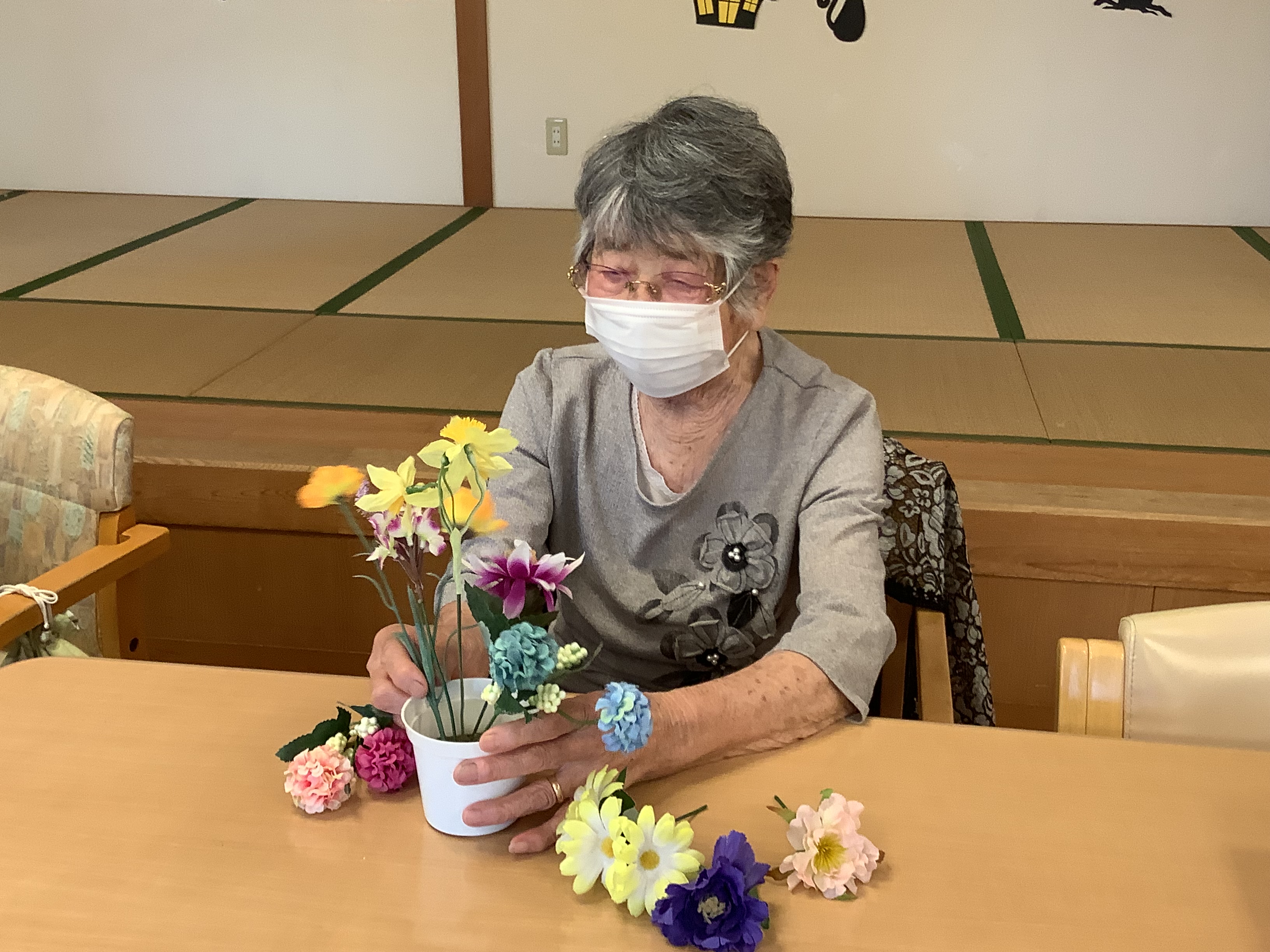 レクリエーションの時間にフラワーアレンジメントを行いました。皆様色とりどりのお花を手に取り考えながら楽しまれていました♪素敵なアレジメントが出来上がりました!(^^)!