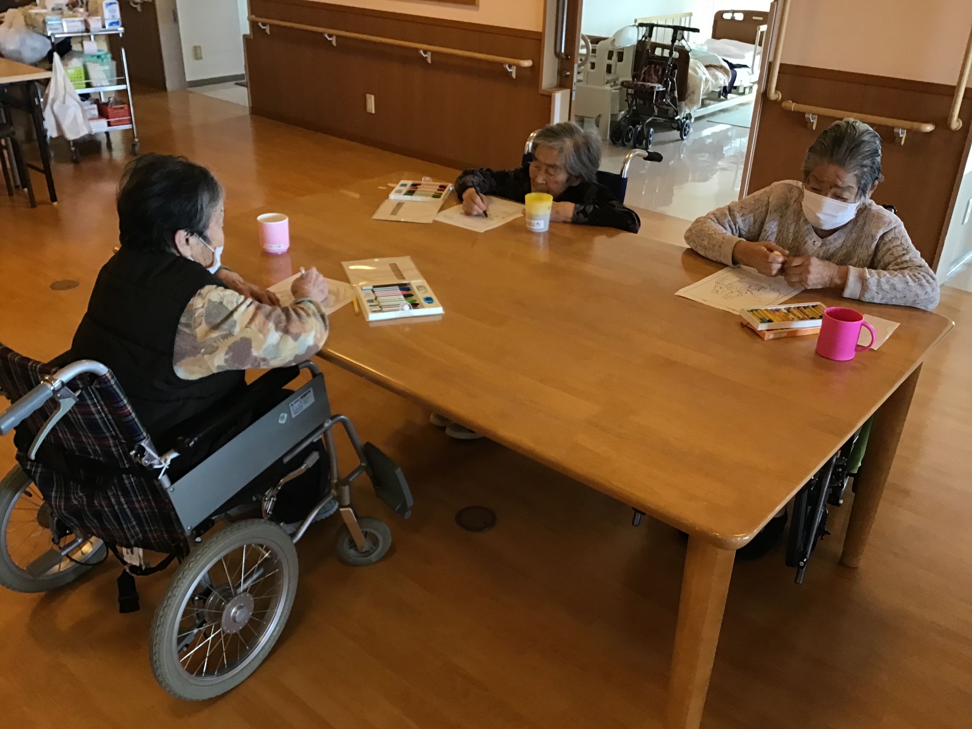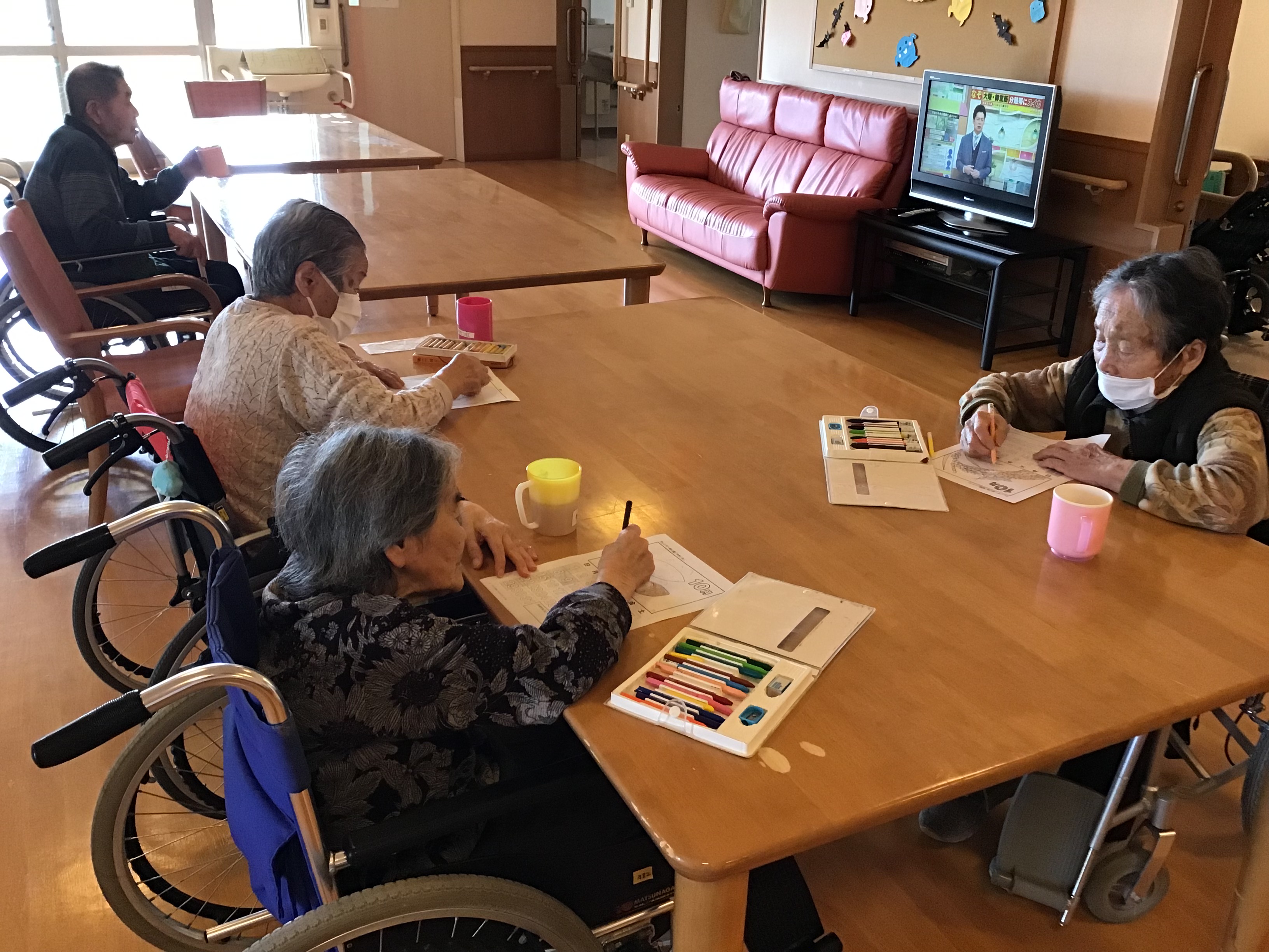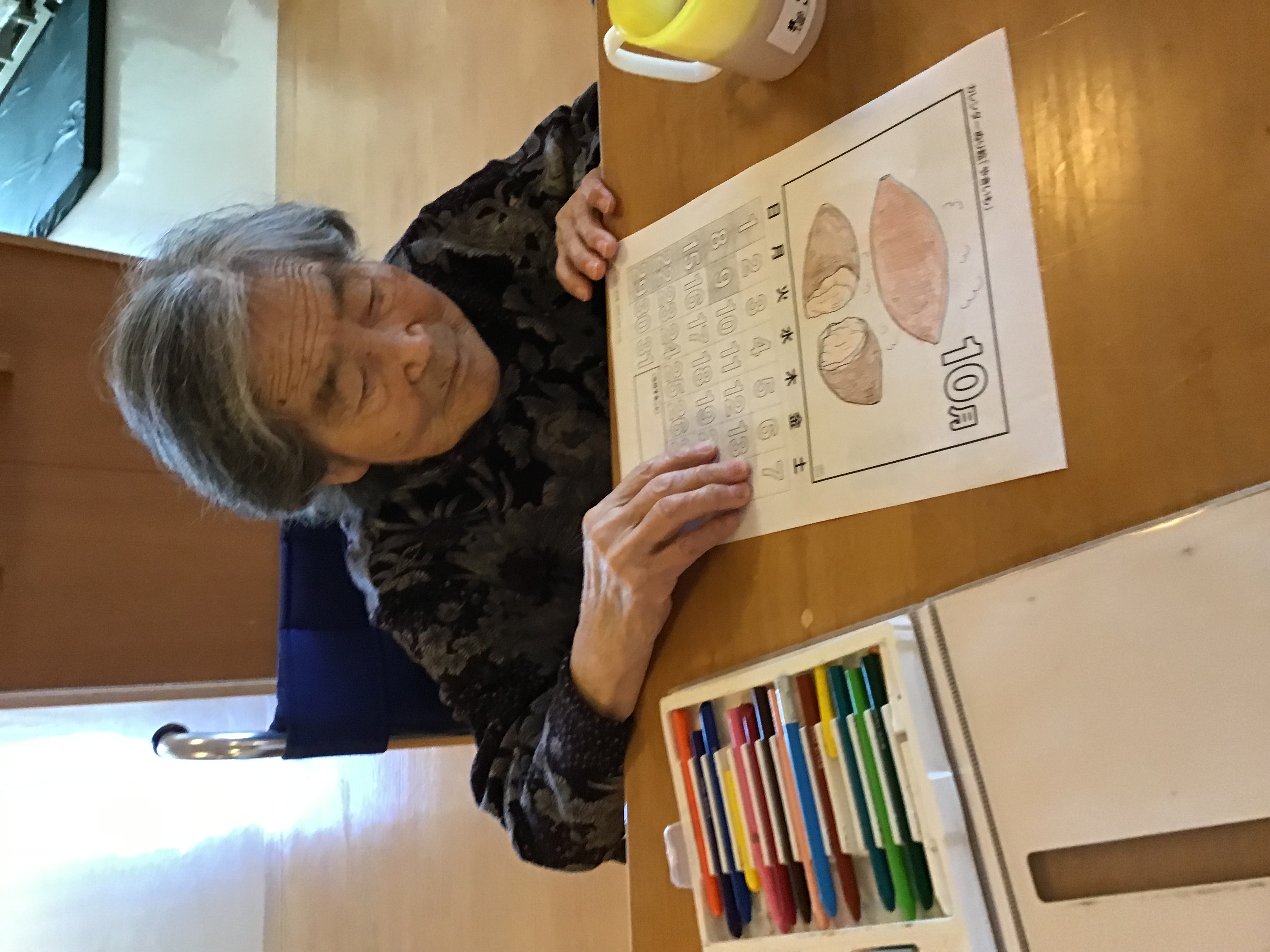 季節の塗り絵ではイナゴのイラストを見てイナゴの佃煮の話で盛り上がったり焼き芋がおいしそうだと話したり・・・