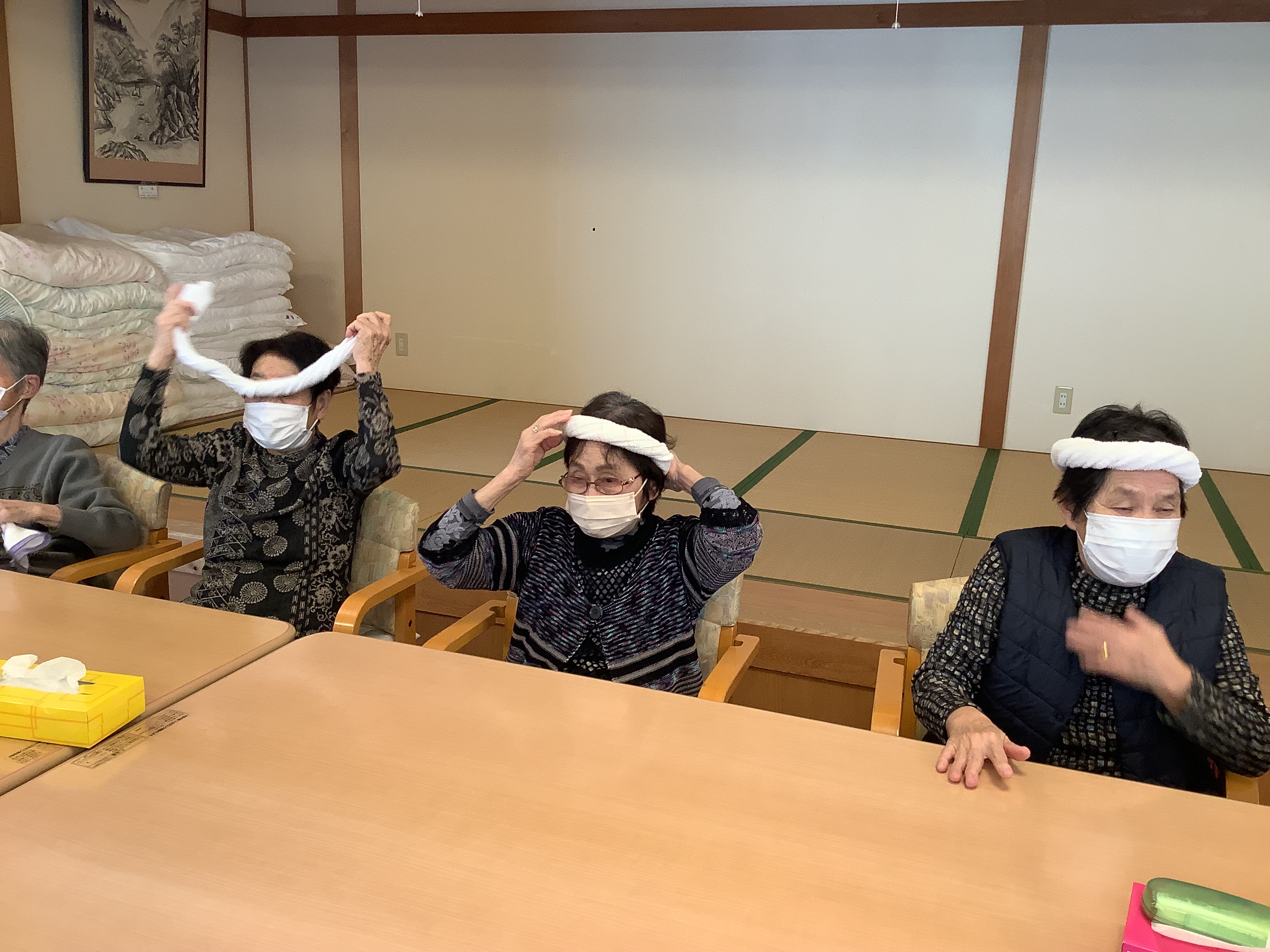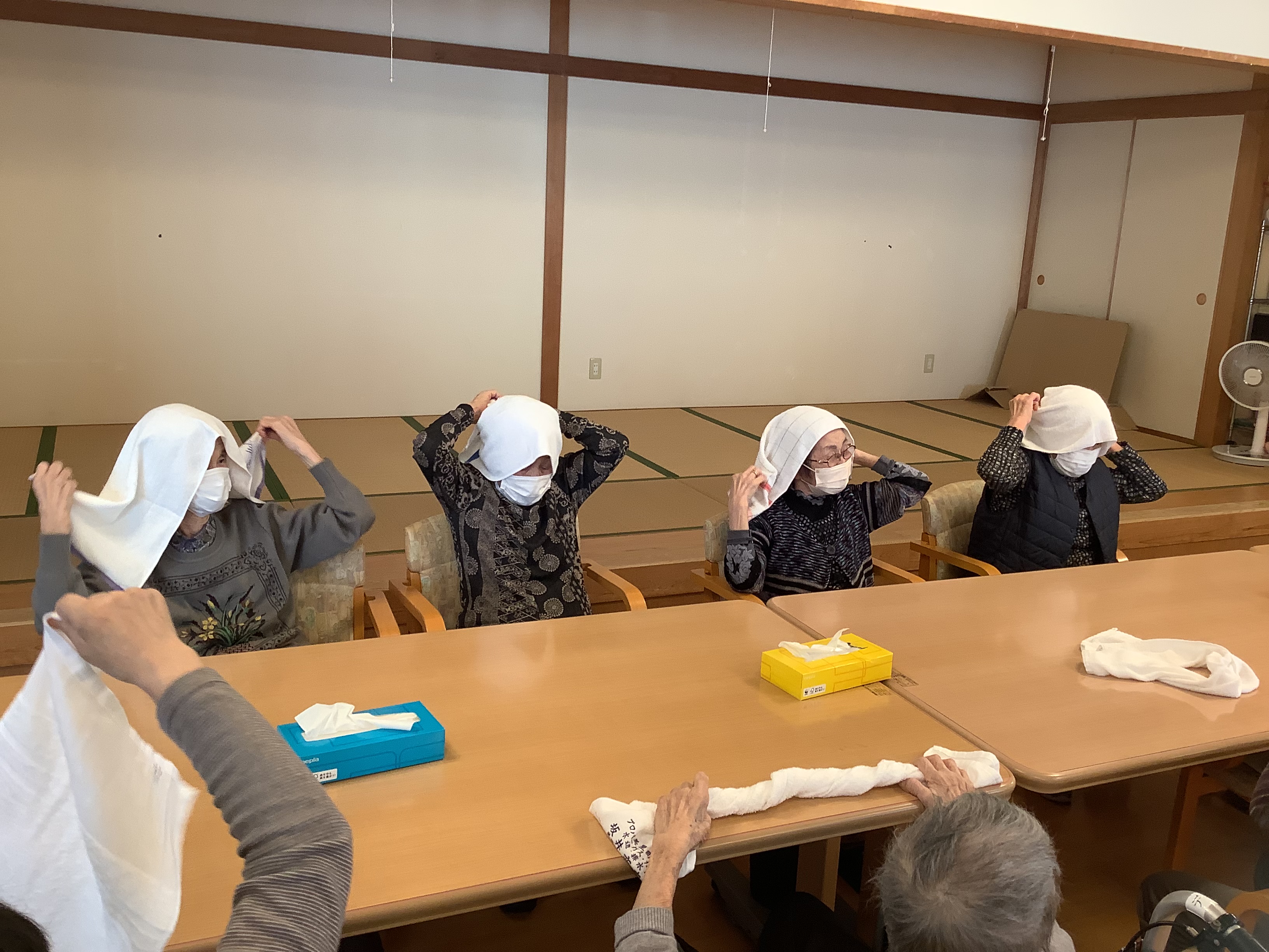 クラブ活動の時間にタオルを使った体操も行っています!(^^)!頭にかぶってみたり、楽しまれていました♪