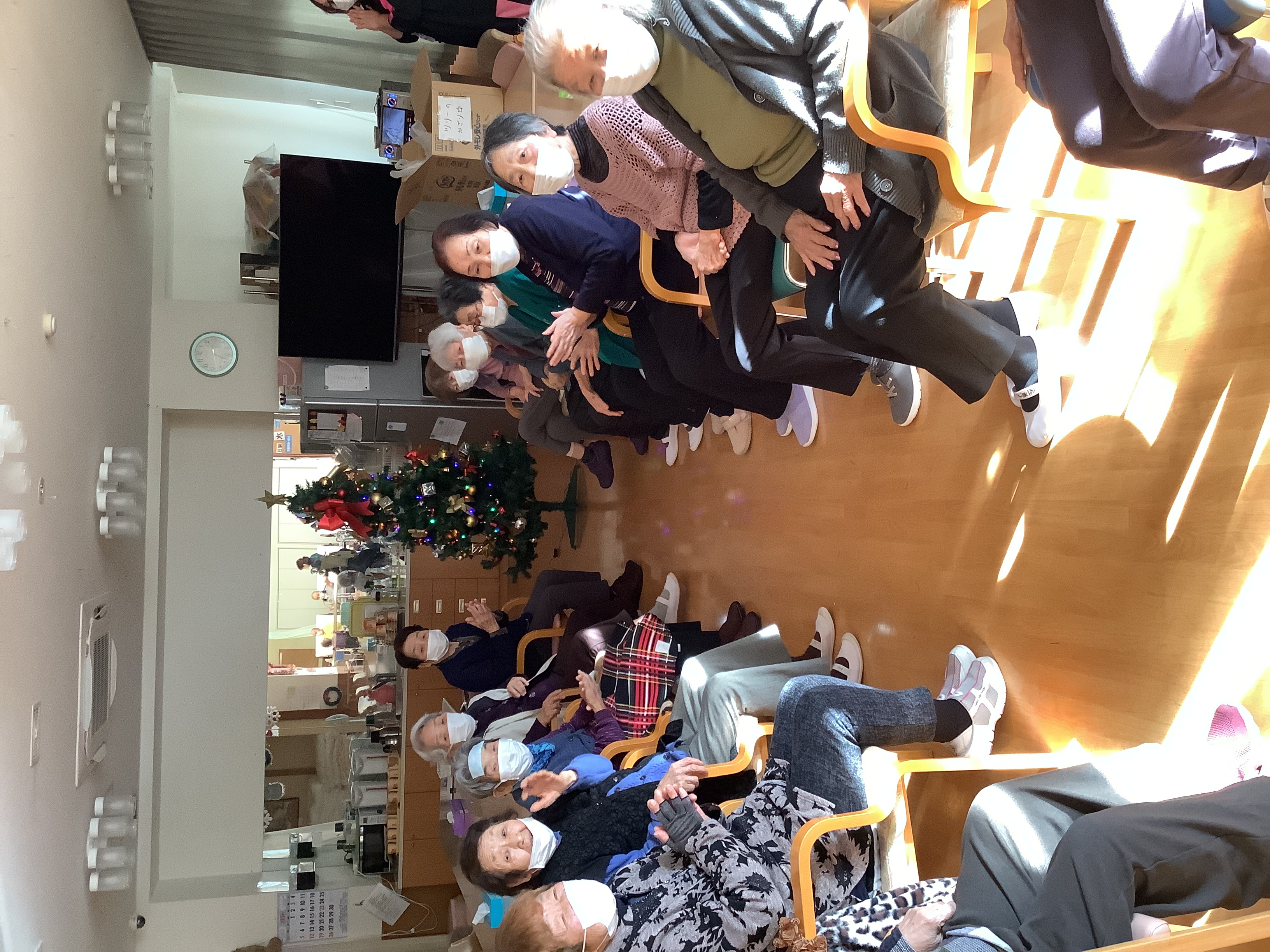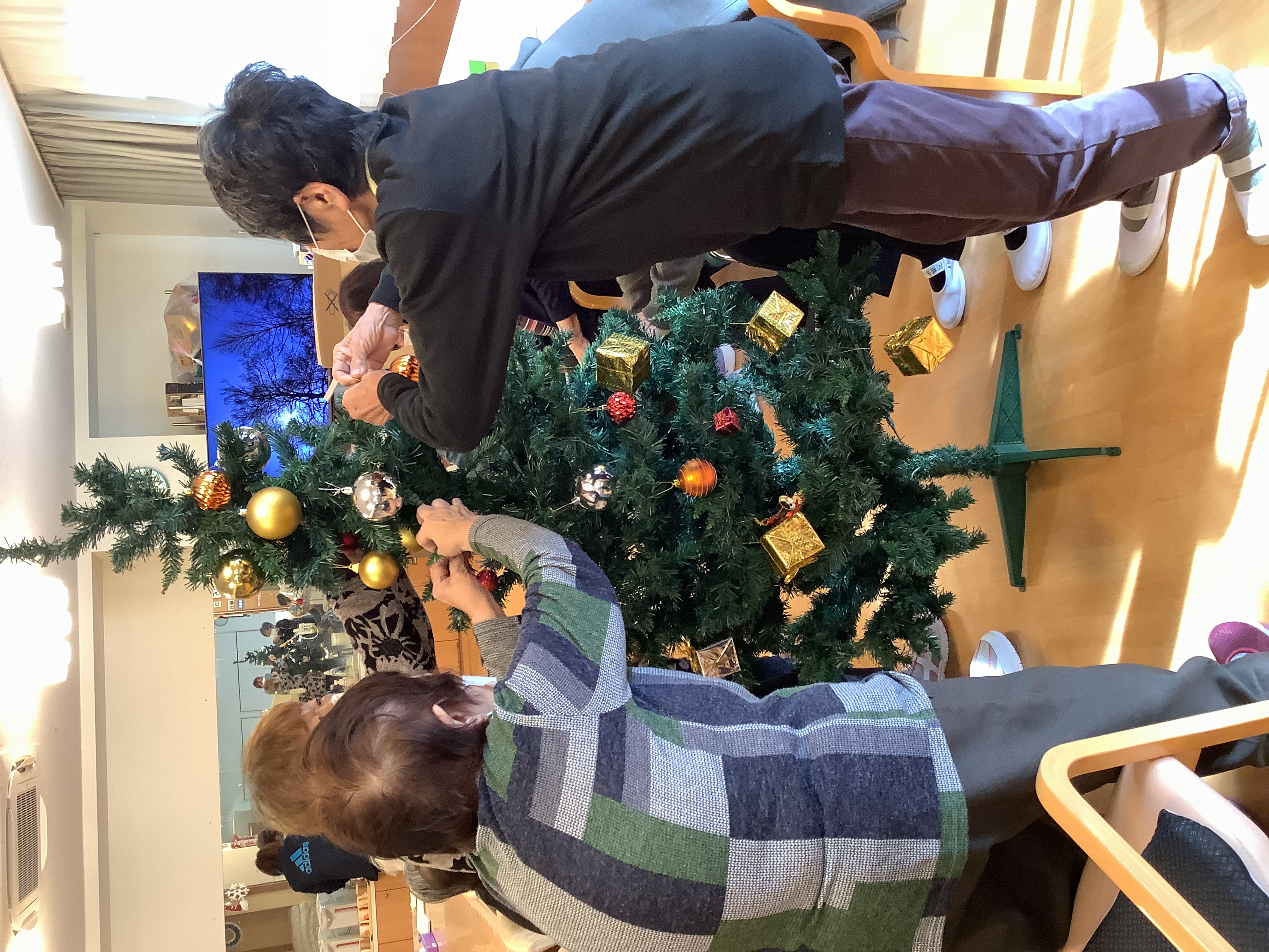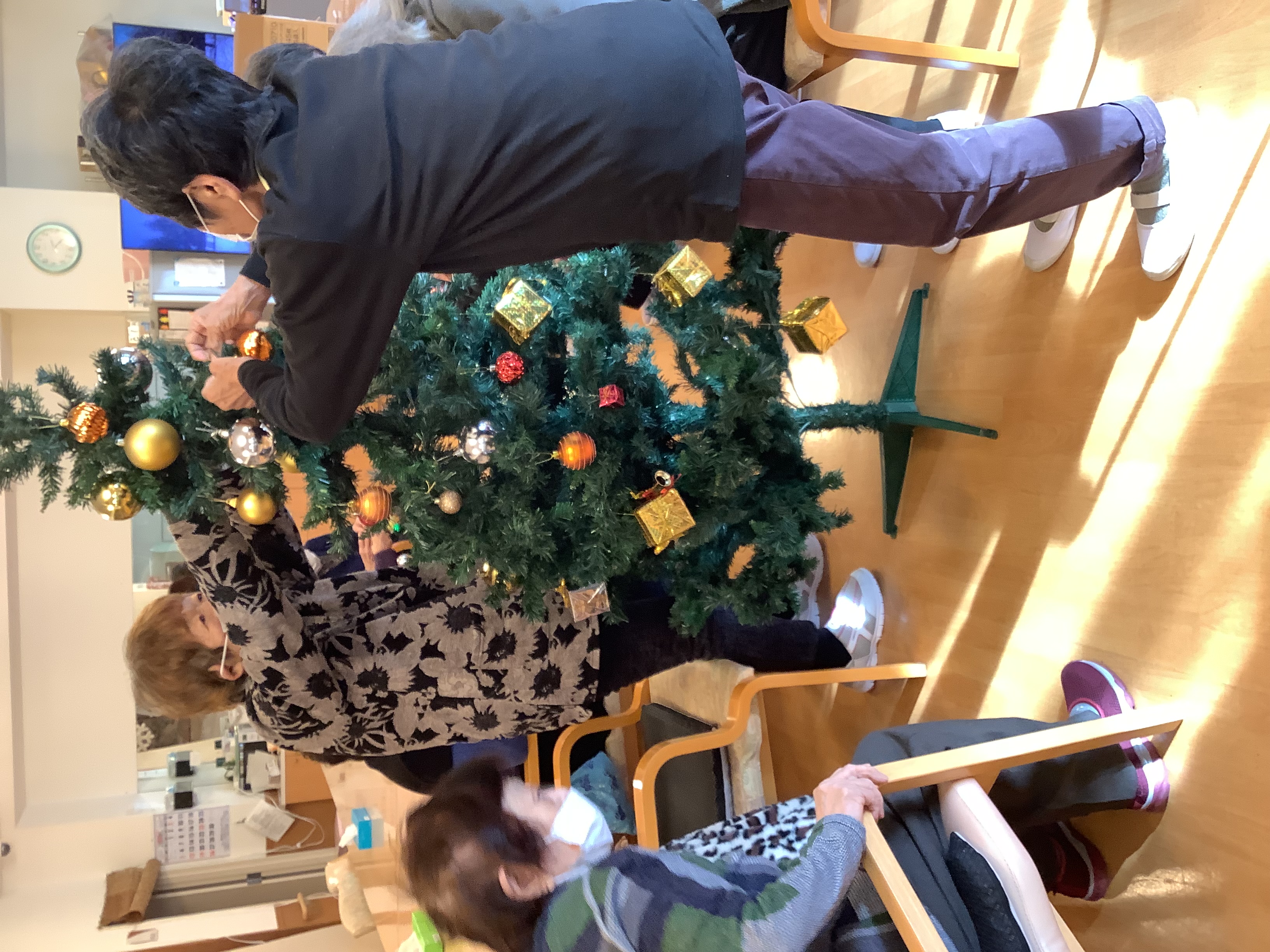 利用者様方が綺麗に飾りつけをして下さり、素敵なクリスマスツリーが完成しました(^^♪デイサービス入り口に飾っています(*´▽`*)