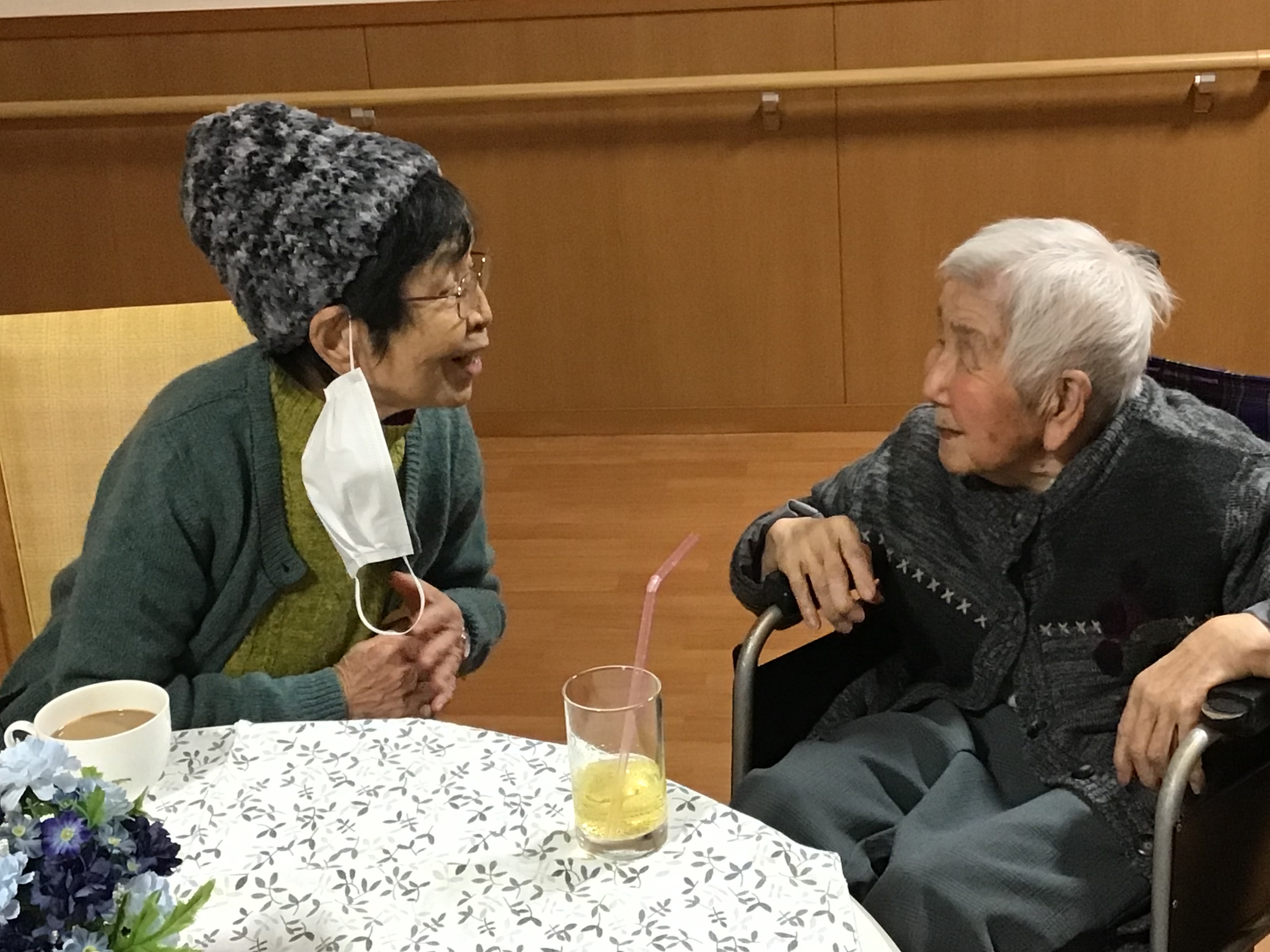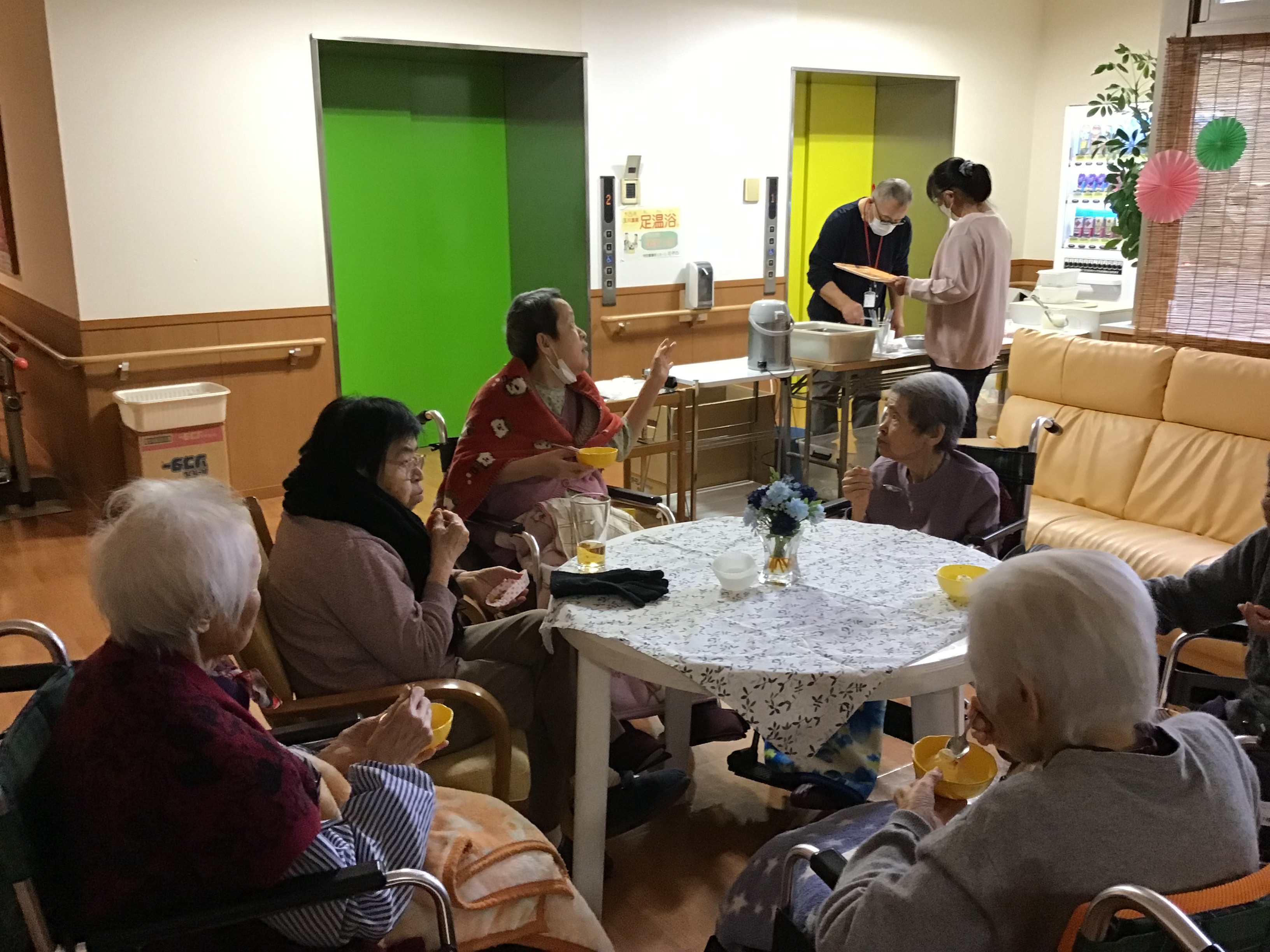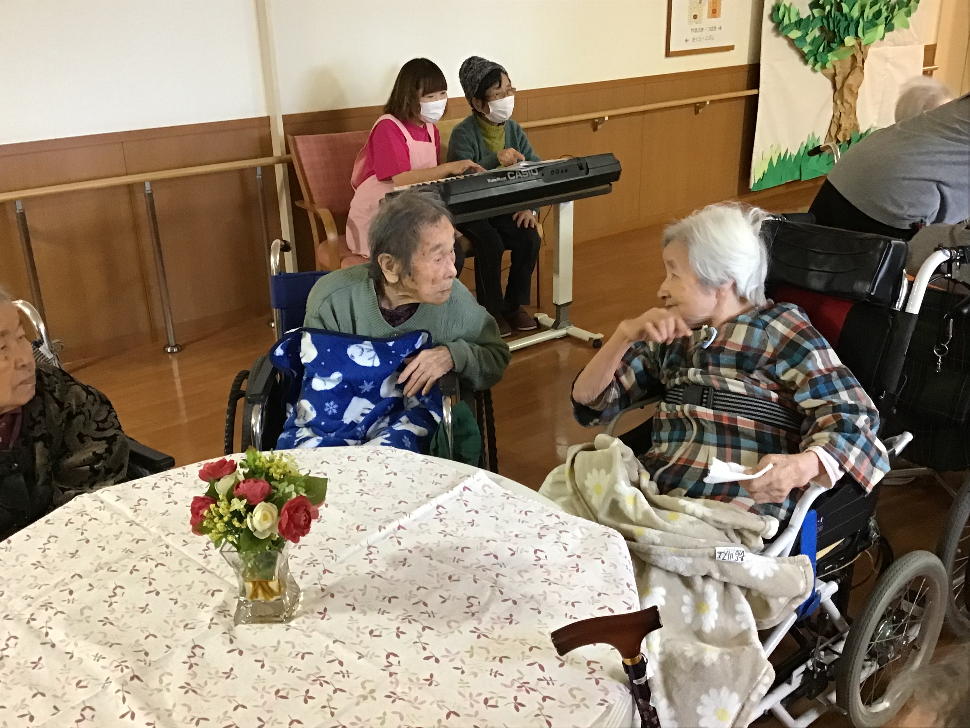 月に1回各階ホールにて喫茶店を行っています。ドリンクやアイスクリームなど、入居者の皆さまがメニューから選び、提供しています。今月からはリニューアルし、より楽しんでいただけるよう手作りおやつやレクなど行っていきたいと思います。今月は選べるトッピングのクラッカーとピアノ演奏。入居者の方と一緒にピアノを弾いて楽しみました。